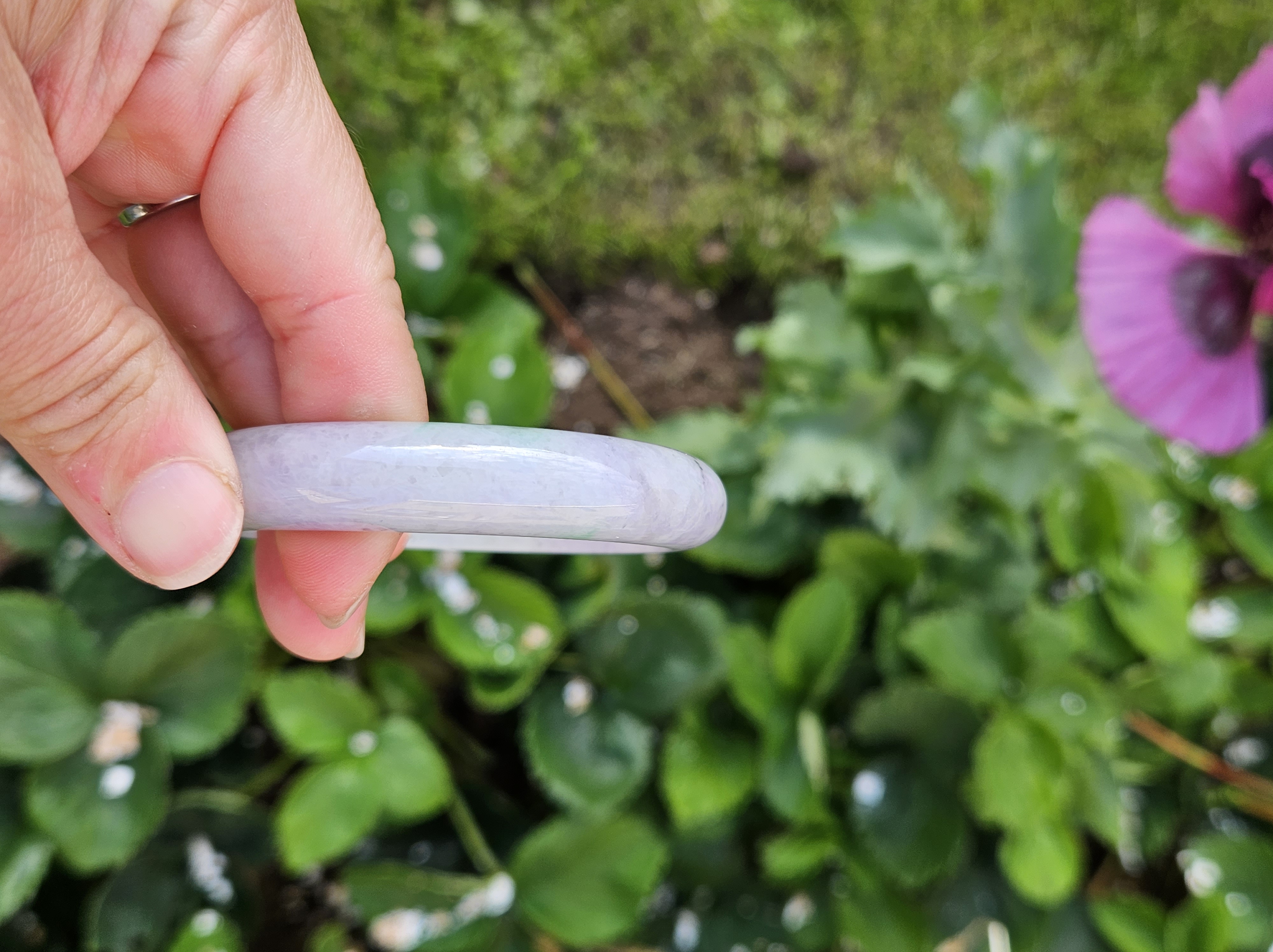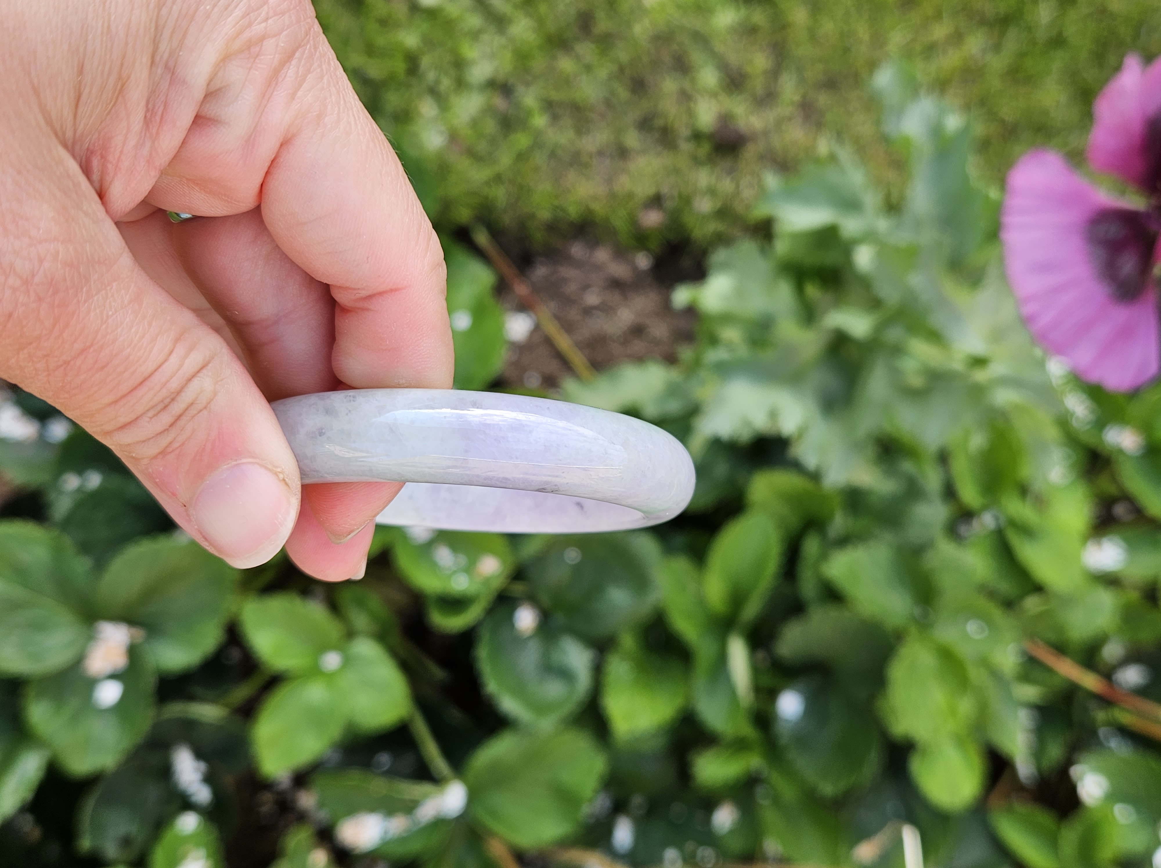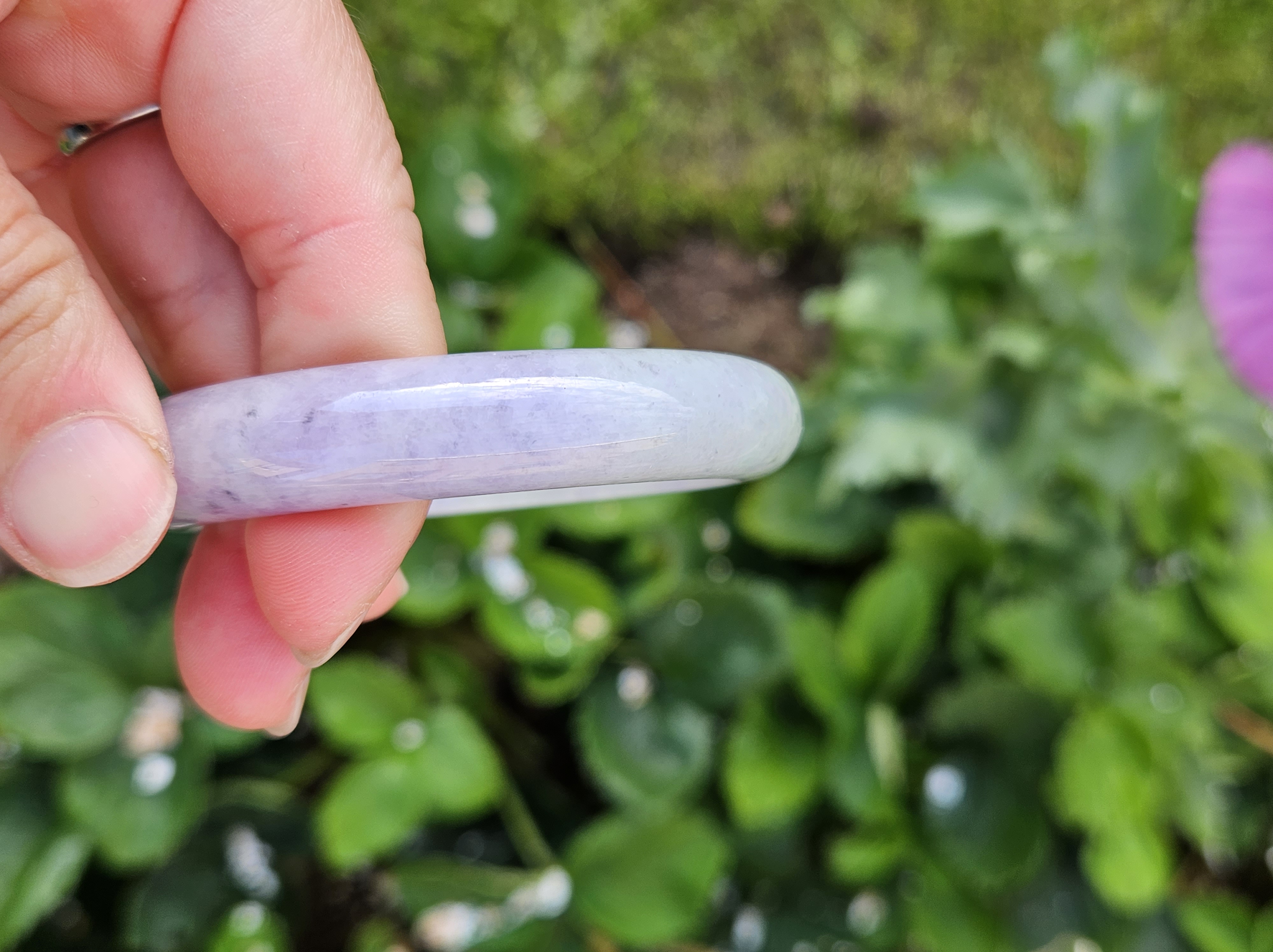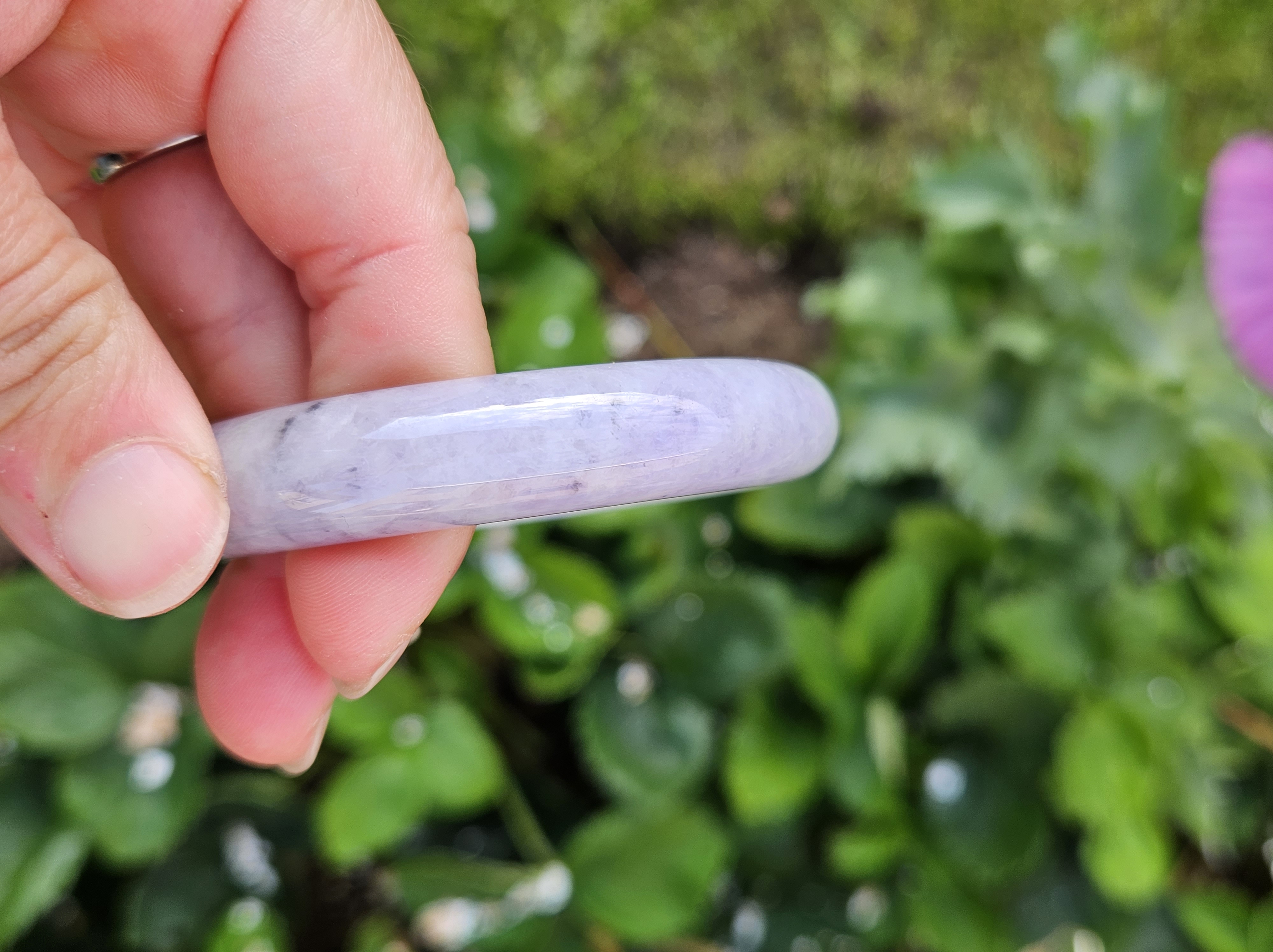 Translucent Burmese jadeite bangle in a gorgeous green and purple colour with smoky grey sesame seeds sprinkled in places. Measures 56.8 x 12.3 x 8.9mm, weighs 56.36g, comes with a certificate of authenticity £488