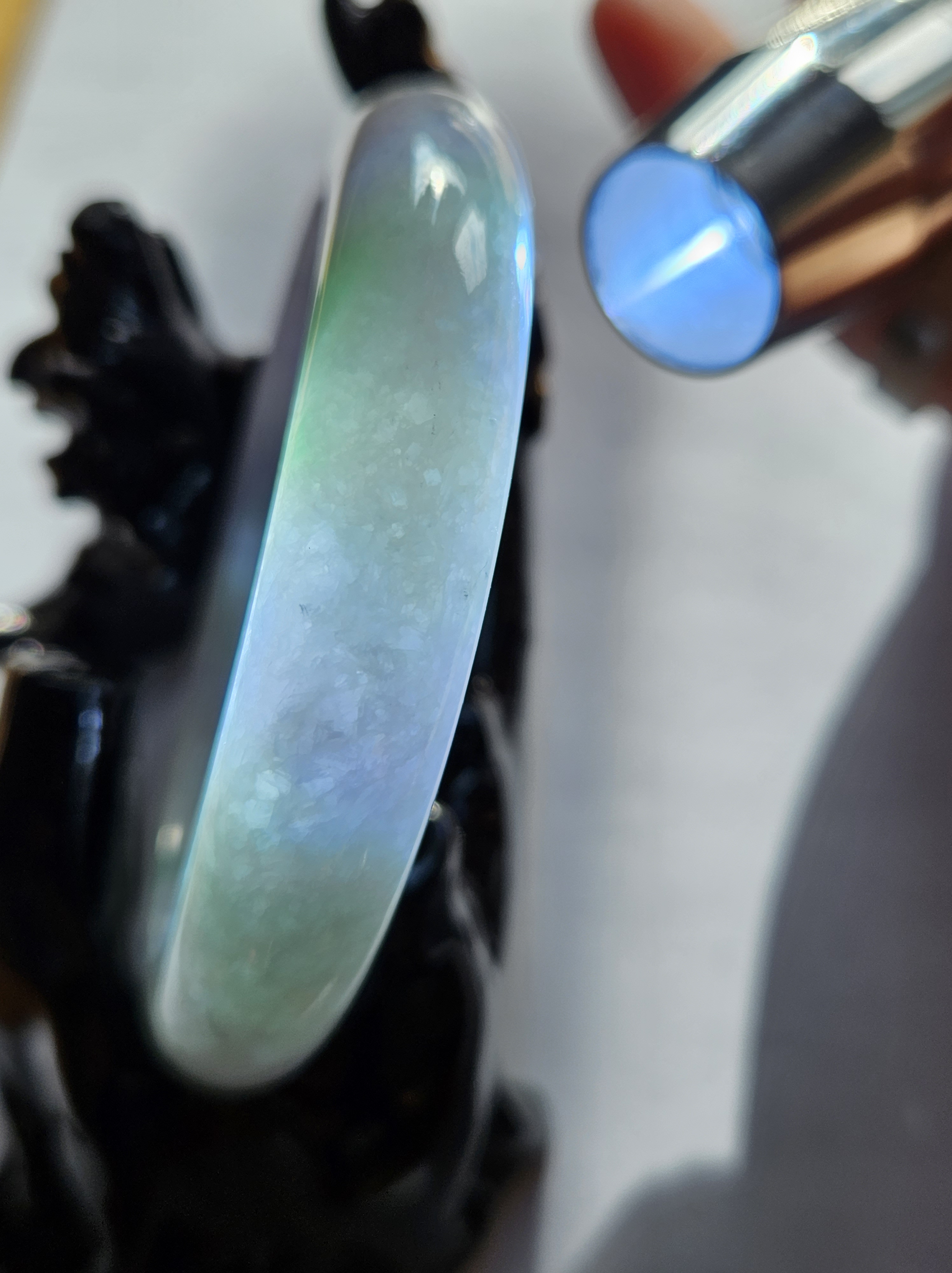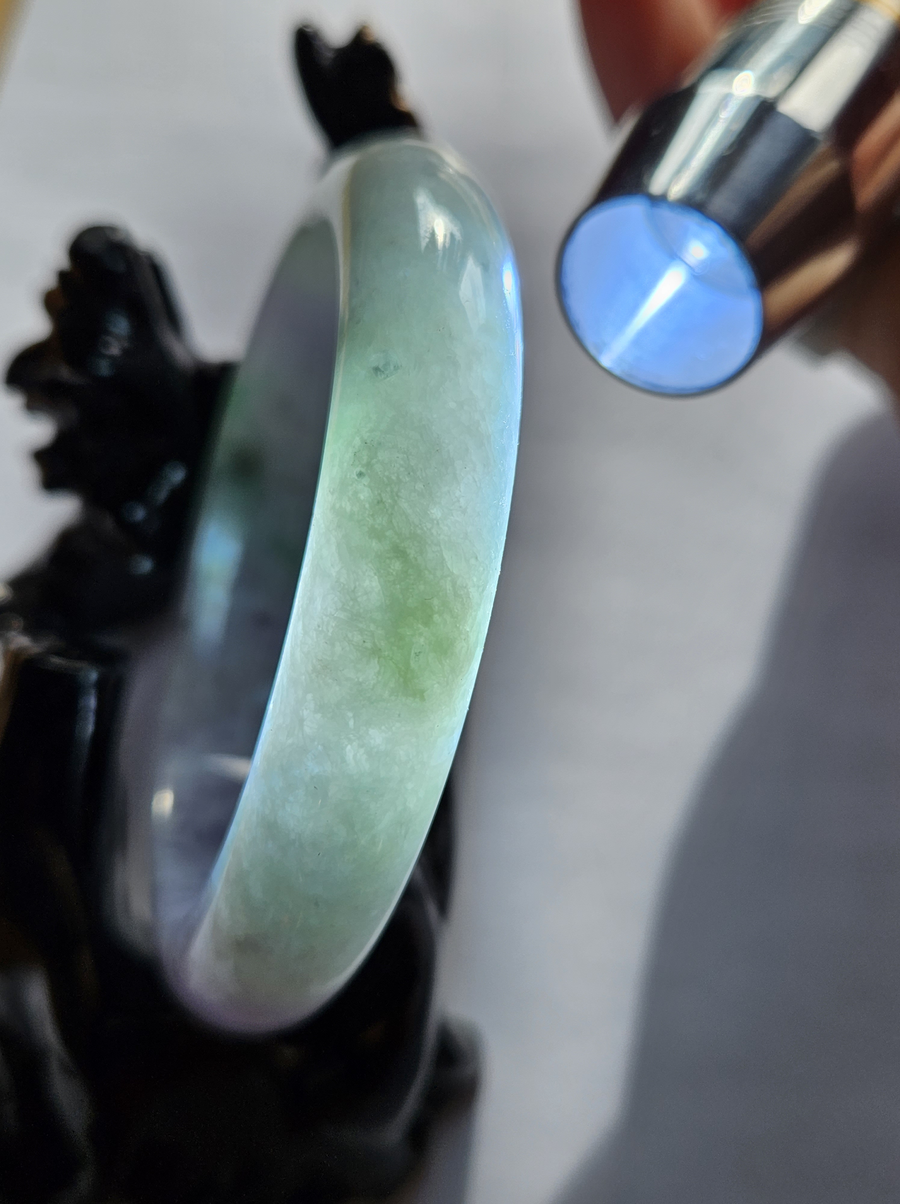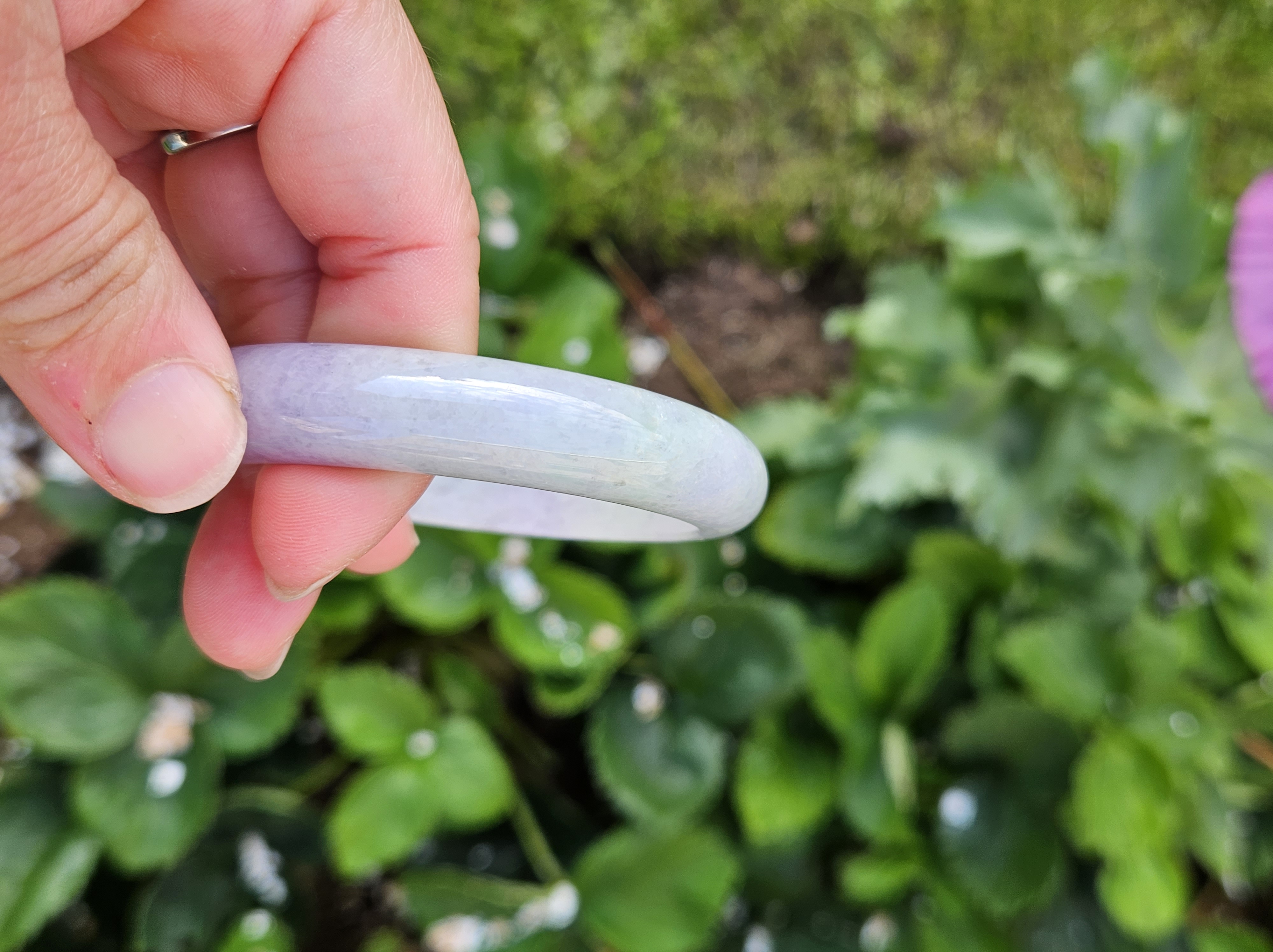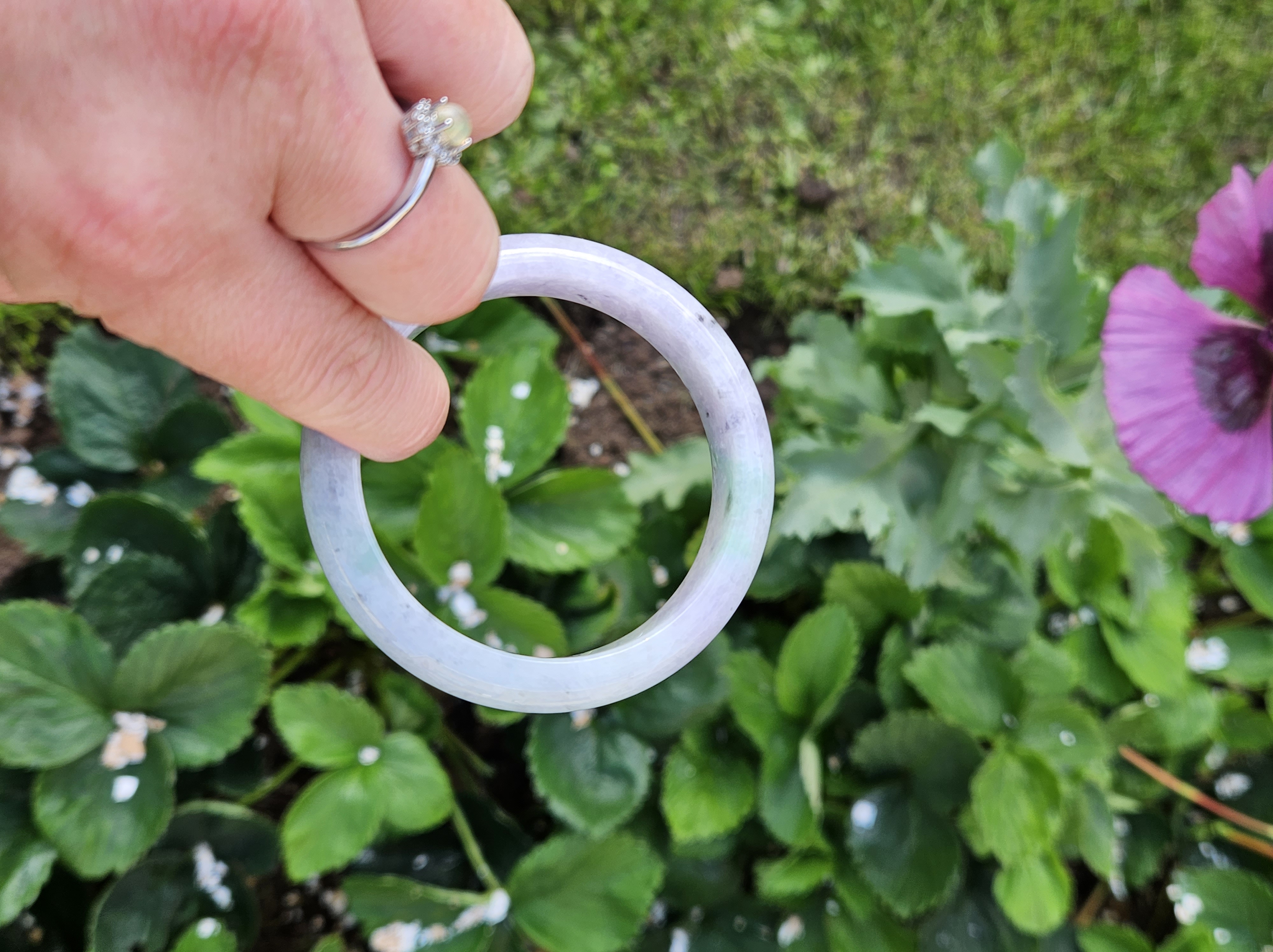 Translucent Burmese jadeite bangle in a gorgeous green and purple colour with smoky grey sesame seeds sprinkled in places. Measures 56.8 x 12.3 x 8.9mm, weighs 56.36g, comes with a certificate of authenticity £488