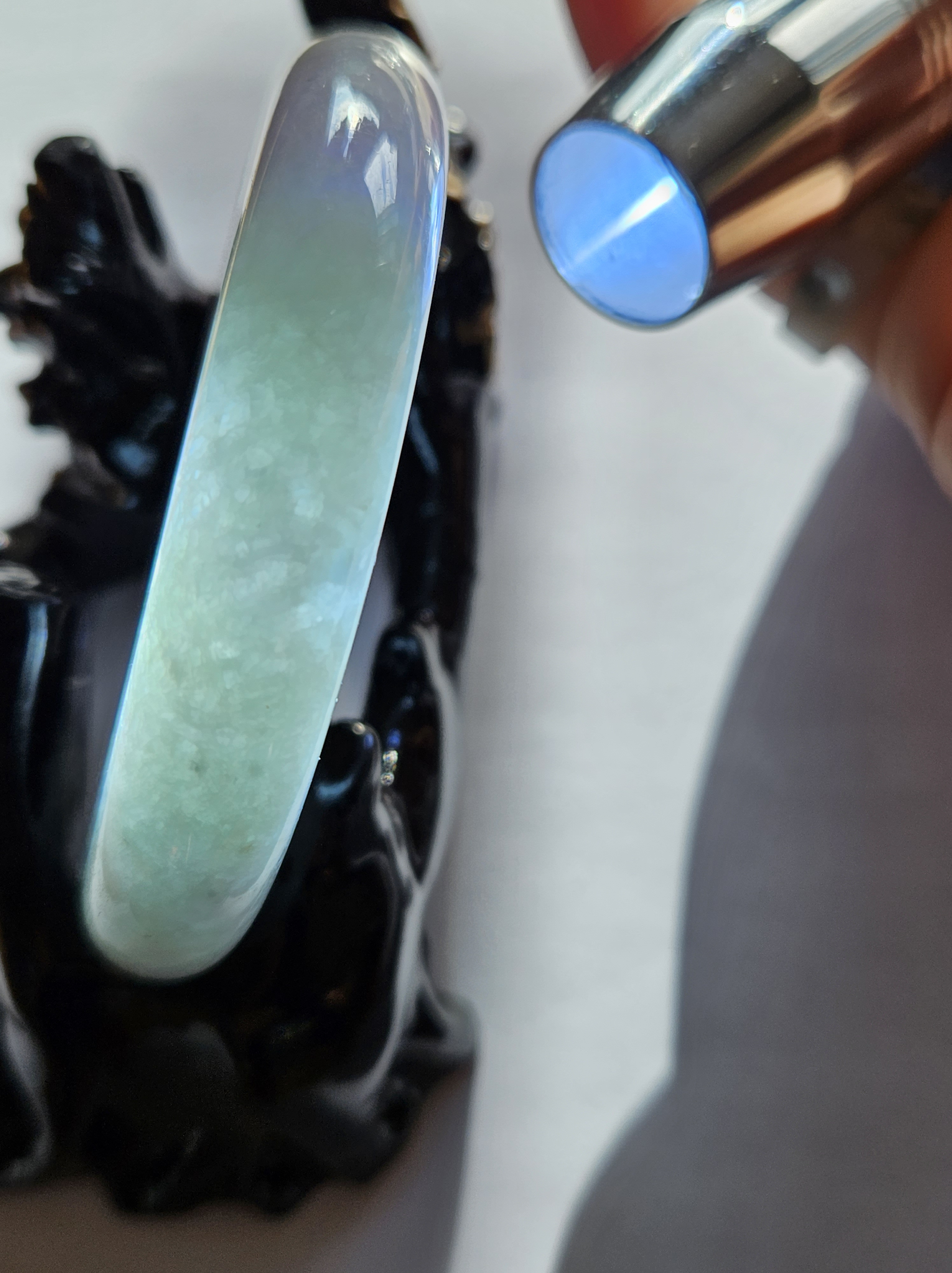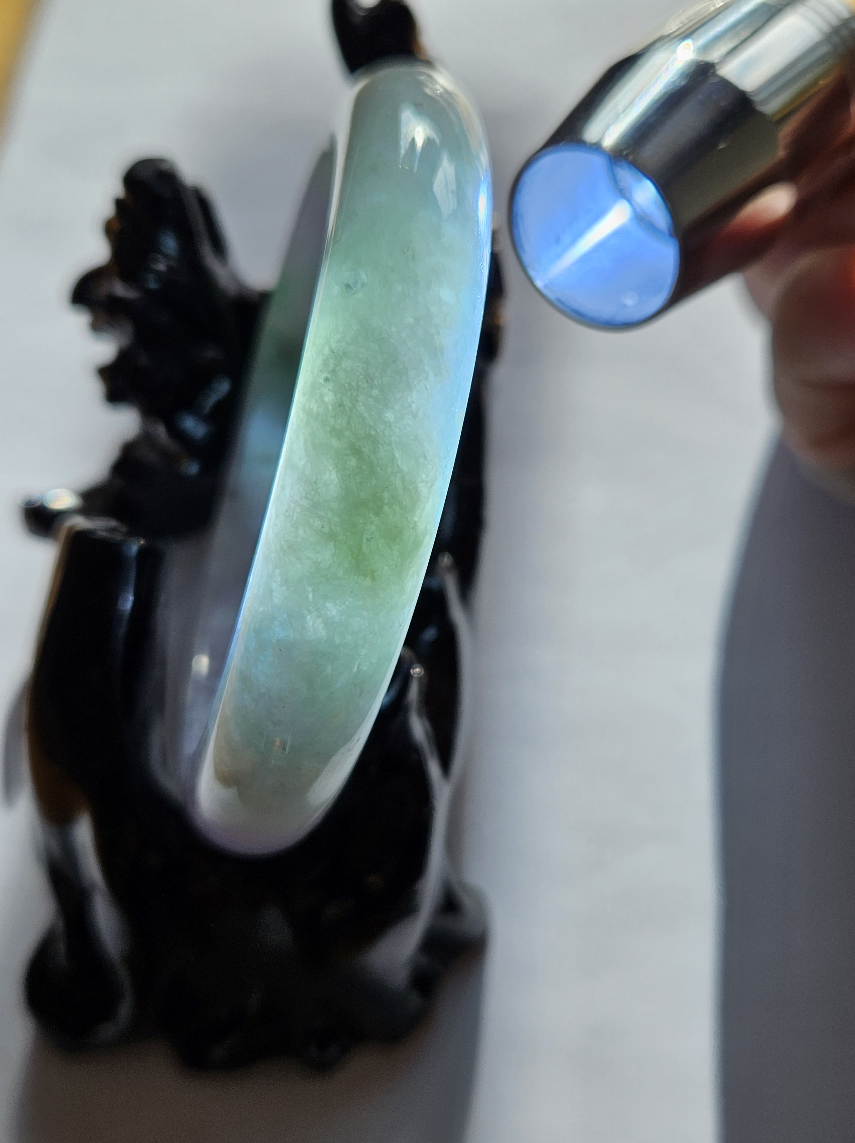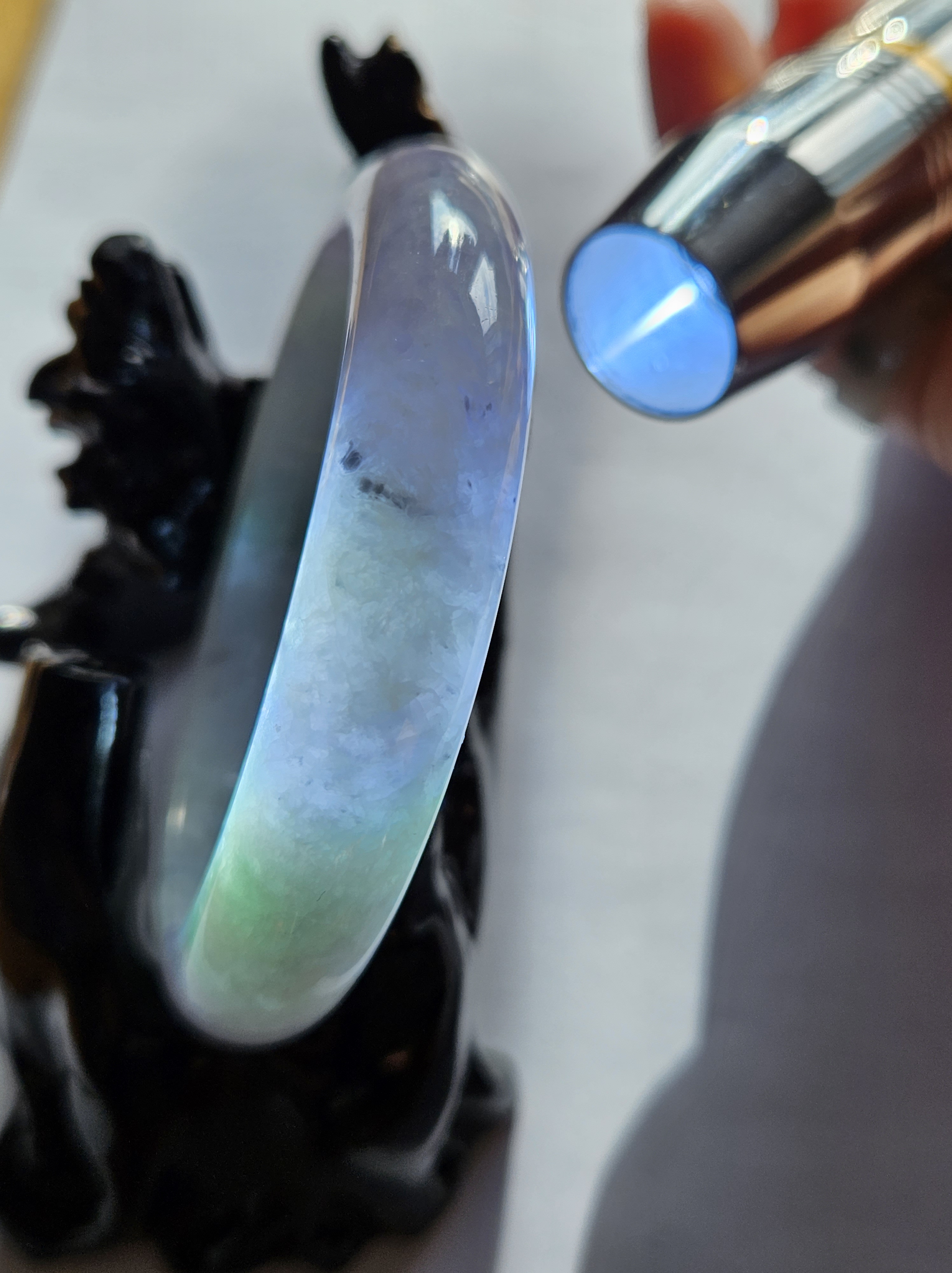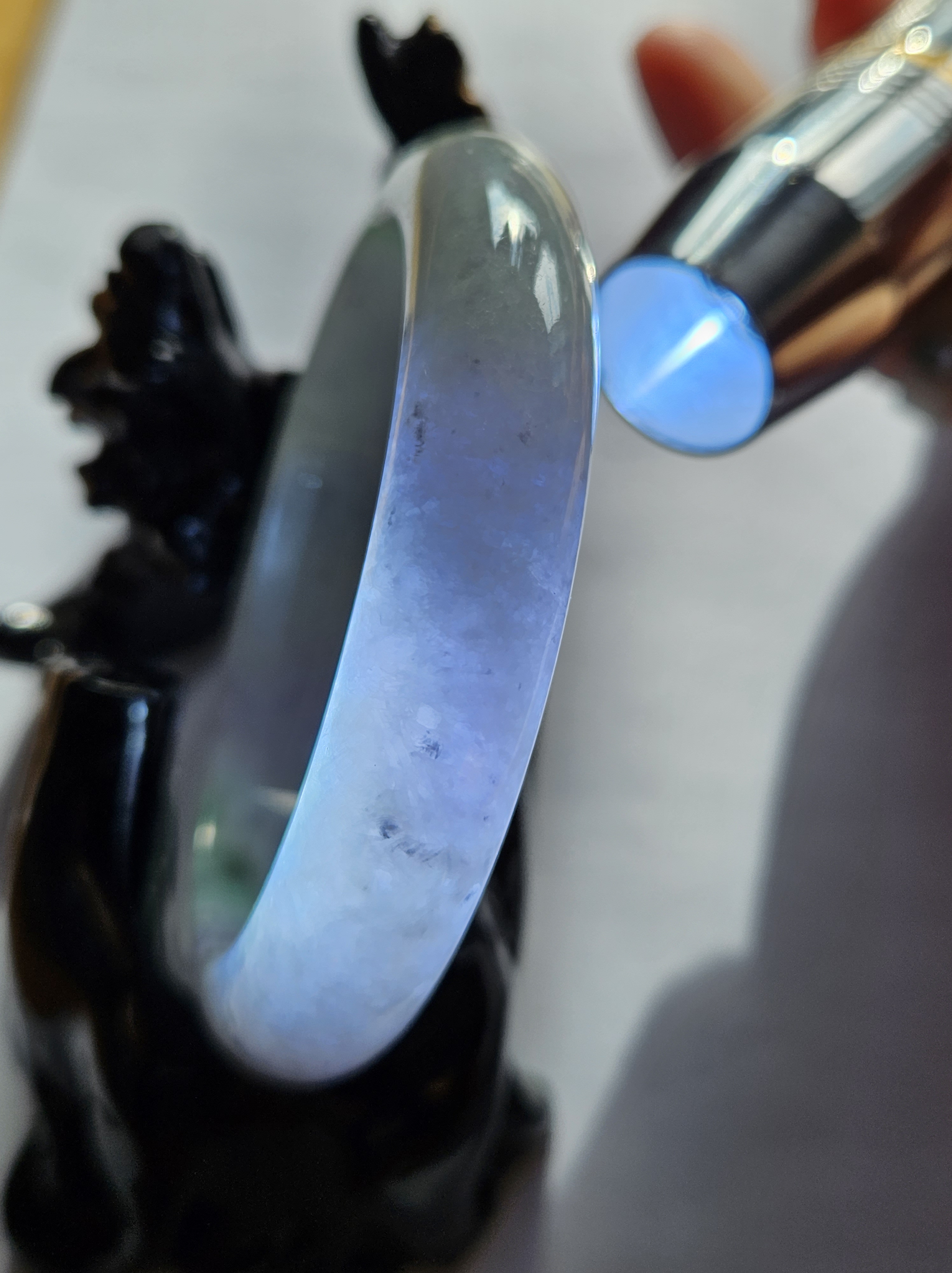 Translucent Burmese jadeite bangle in a gorgeous green and purple colour with smoky grey sesame seeds sprinkled in places. Measures 56.8 x 12.3 x 8.9mm, weighs 56.36g, comes with a certificate of authenticity £488