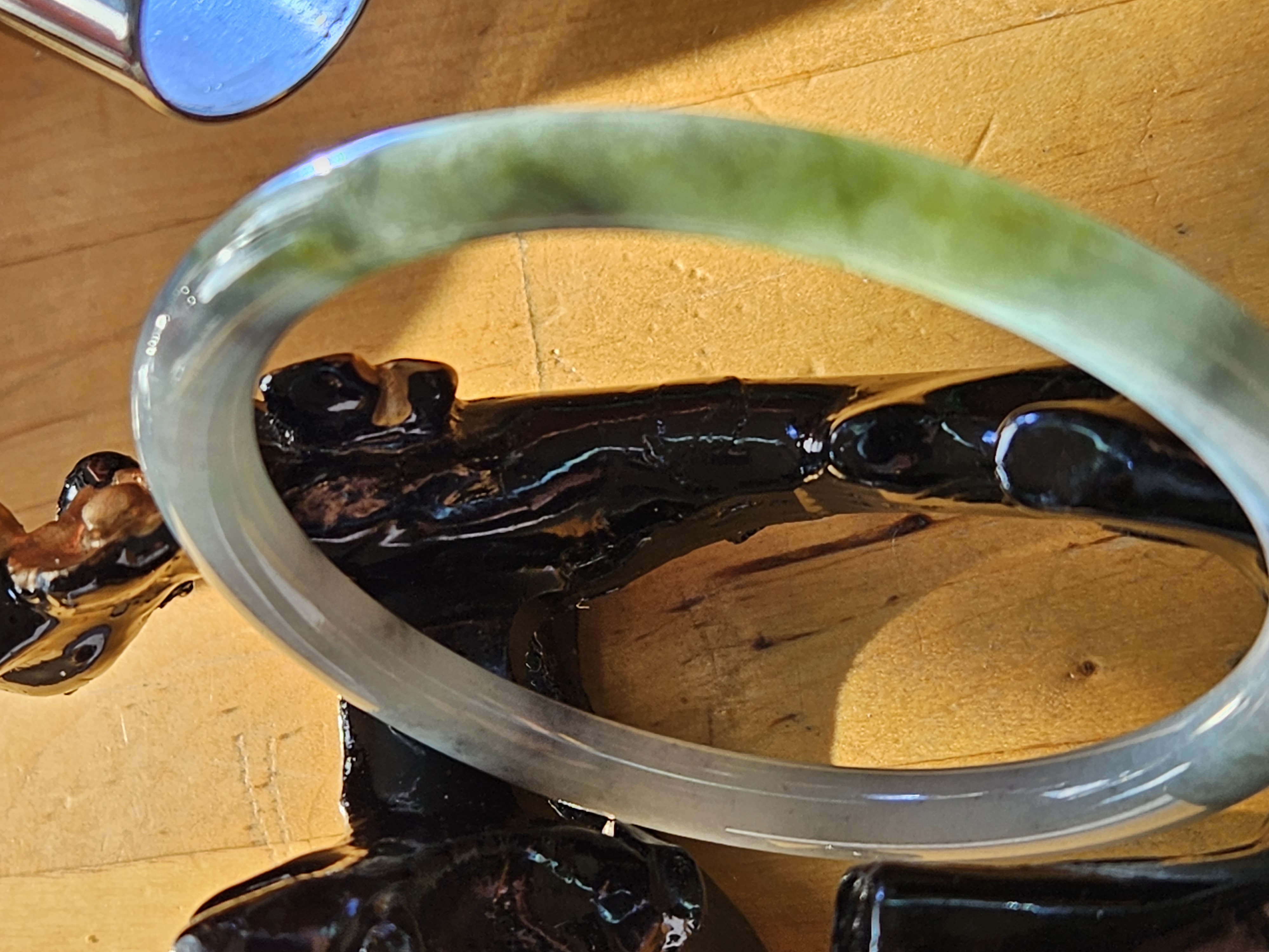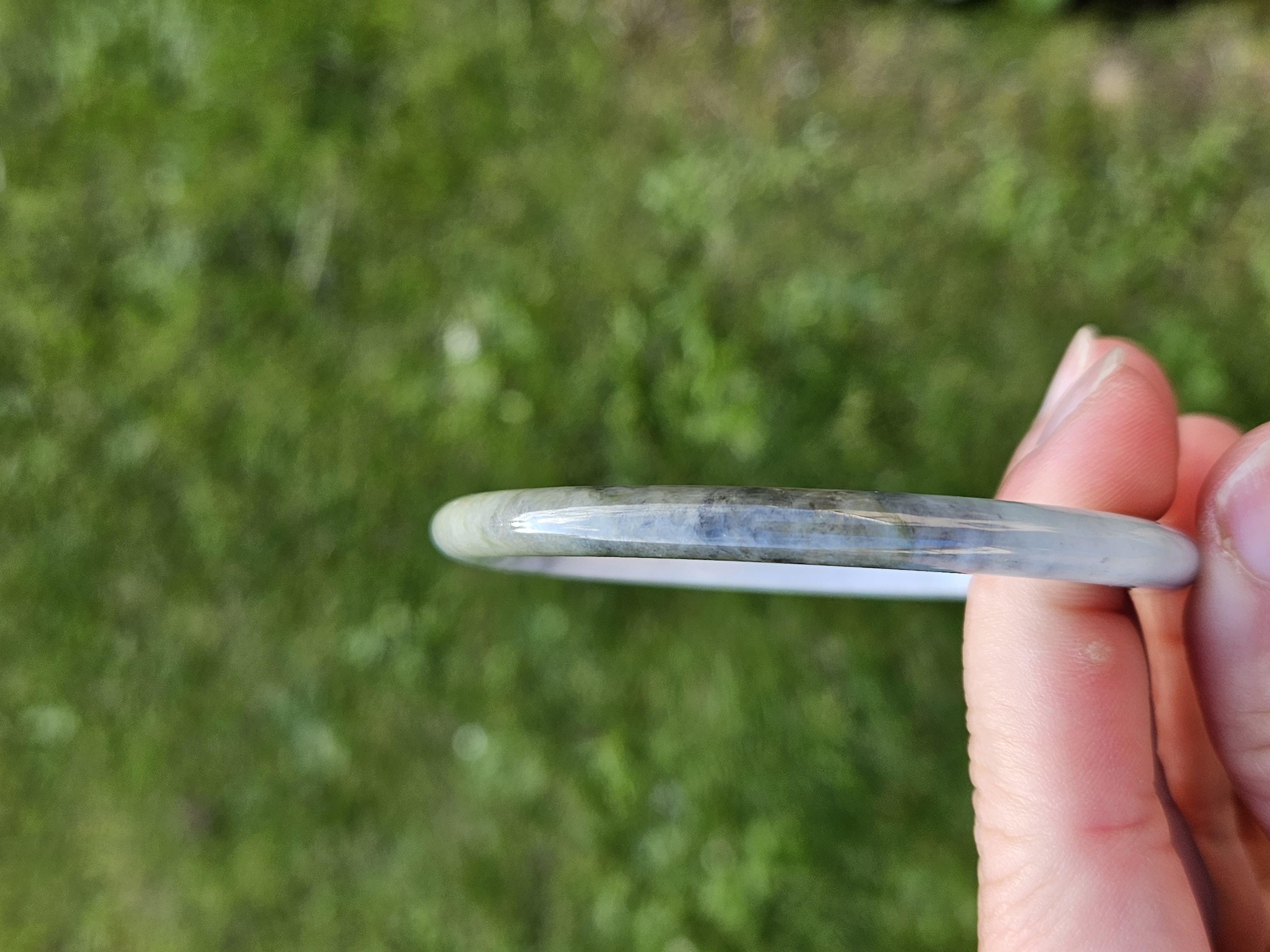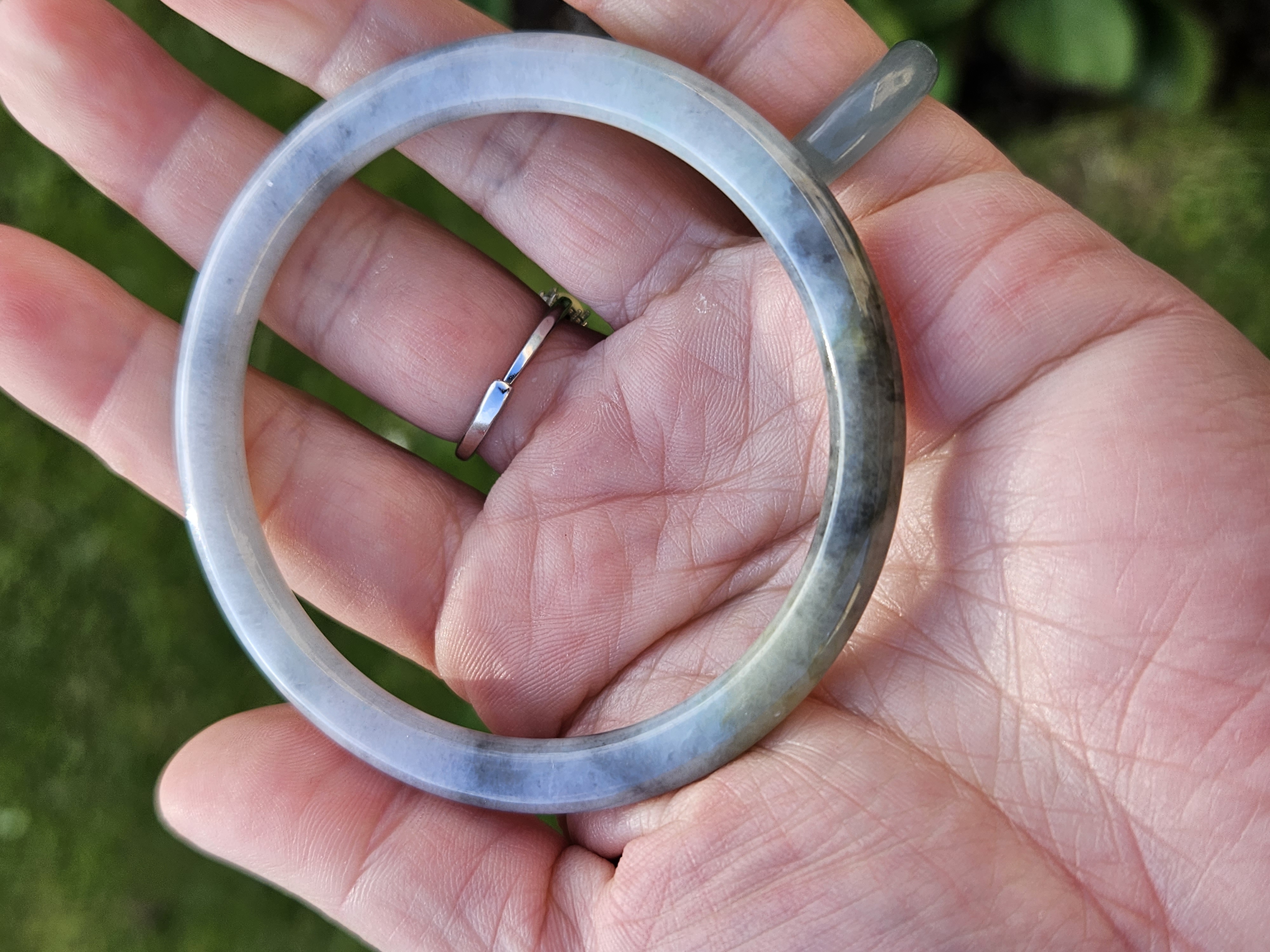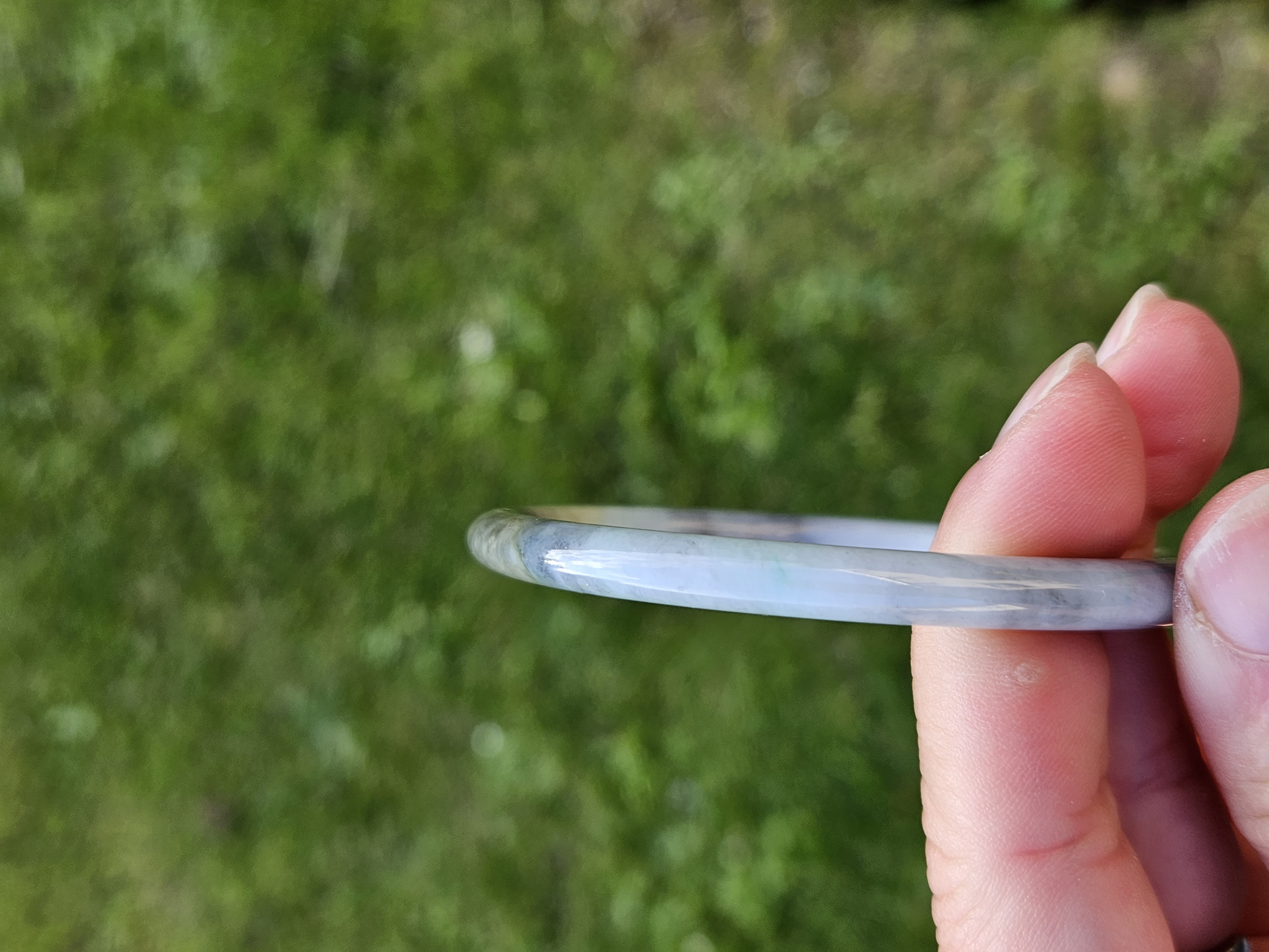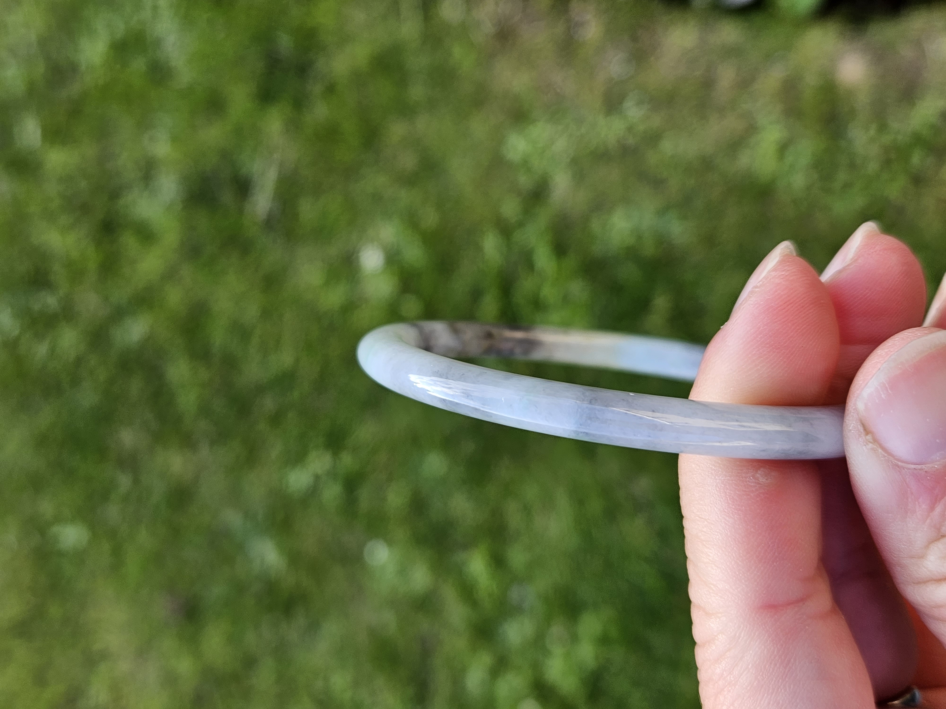 Round Burmese jadeite bangle in a lovely light green and yellow colour with smoky grey patches, measures 57.1 x 5.7 x 7.6mm, fits up to 59mm, weighs 20.42g, comes with a certificate of authenticity £99