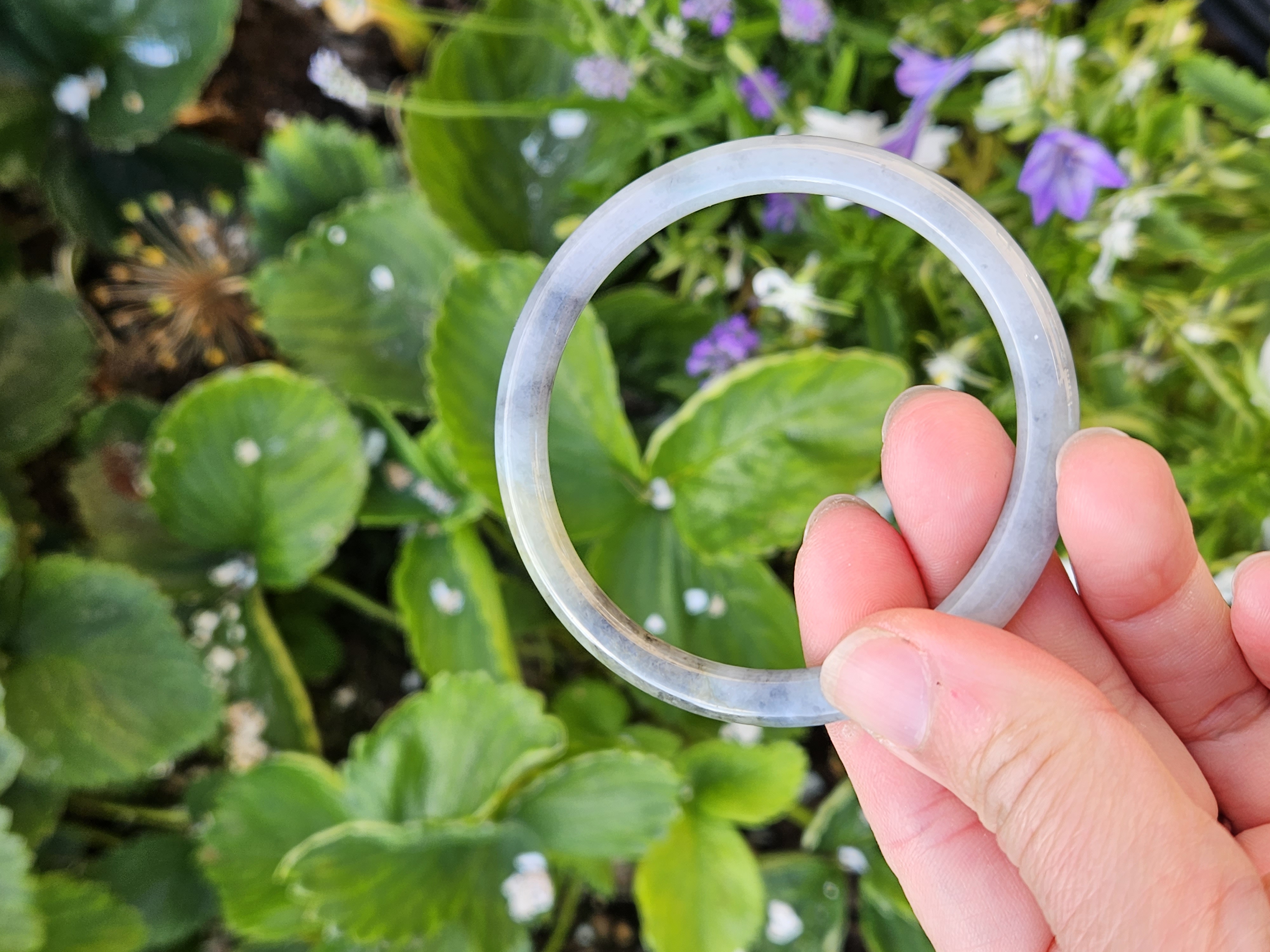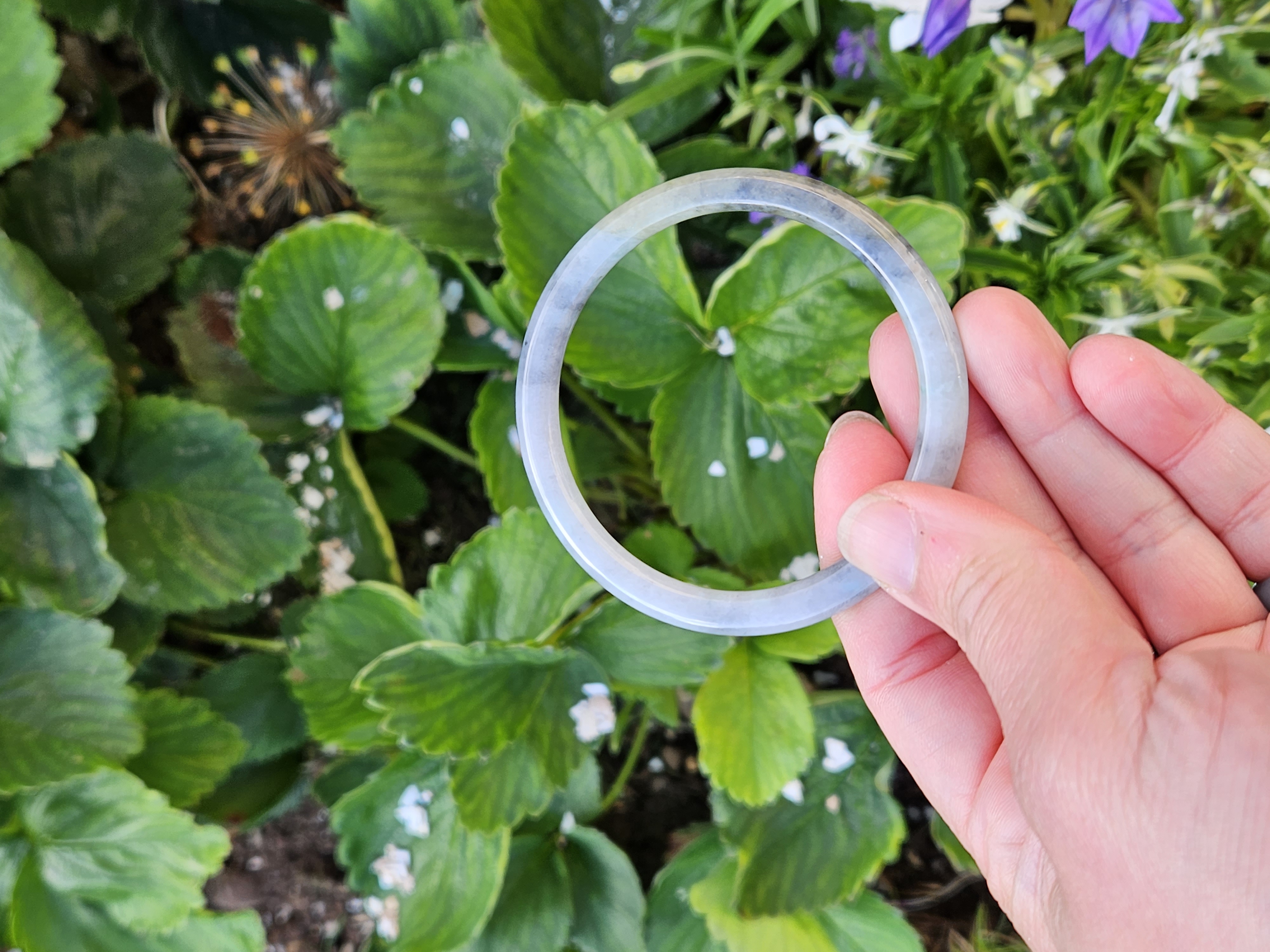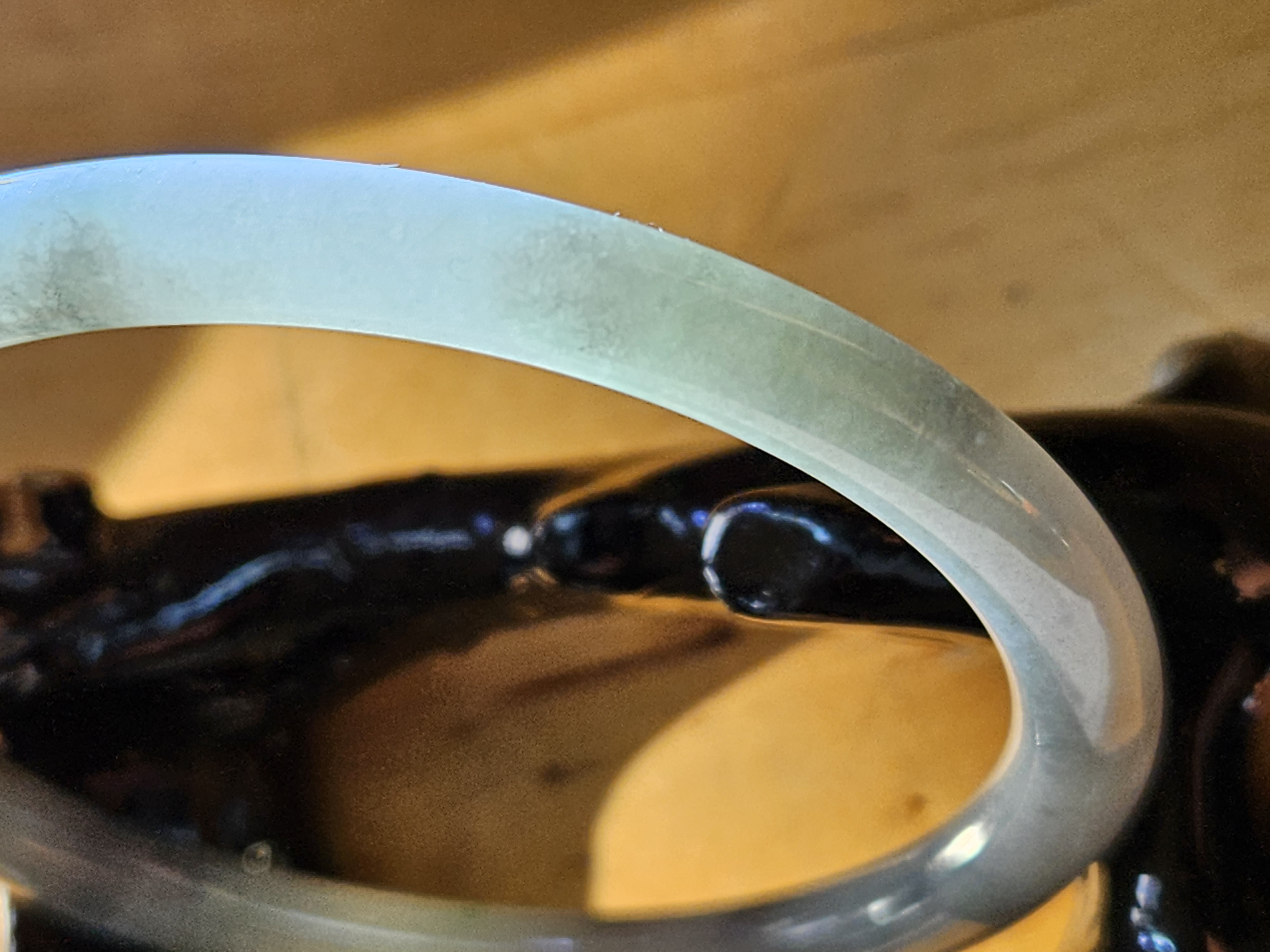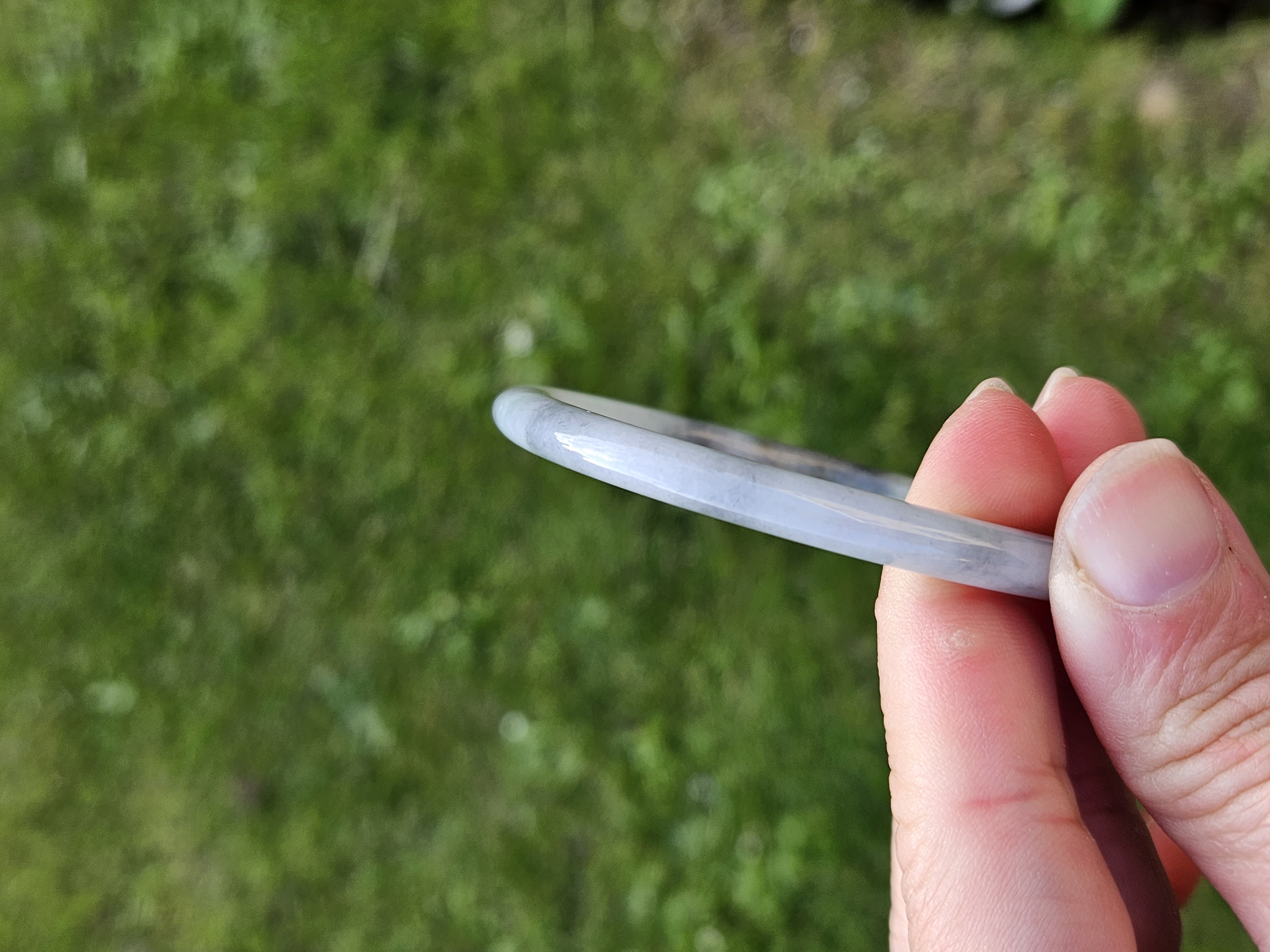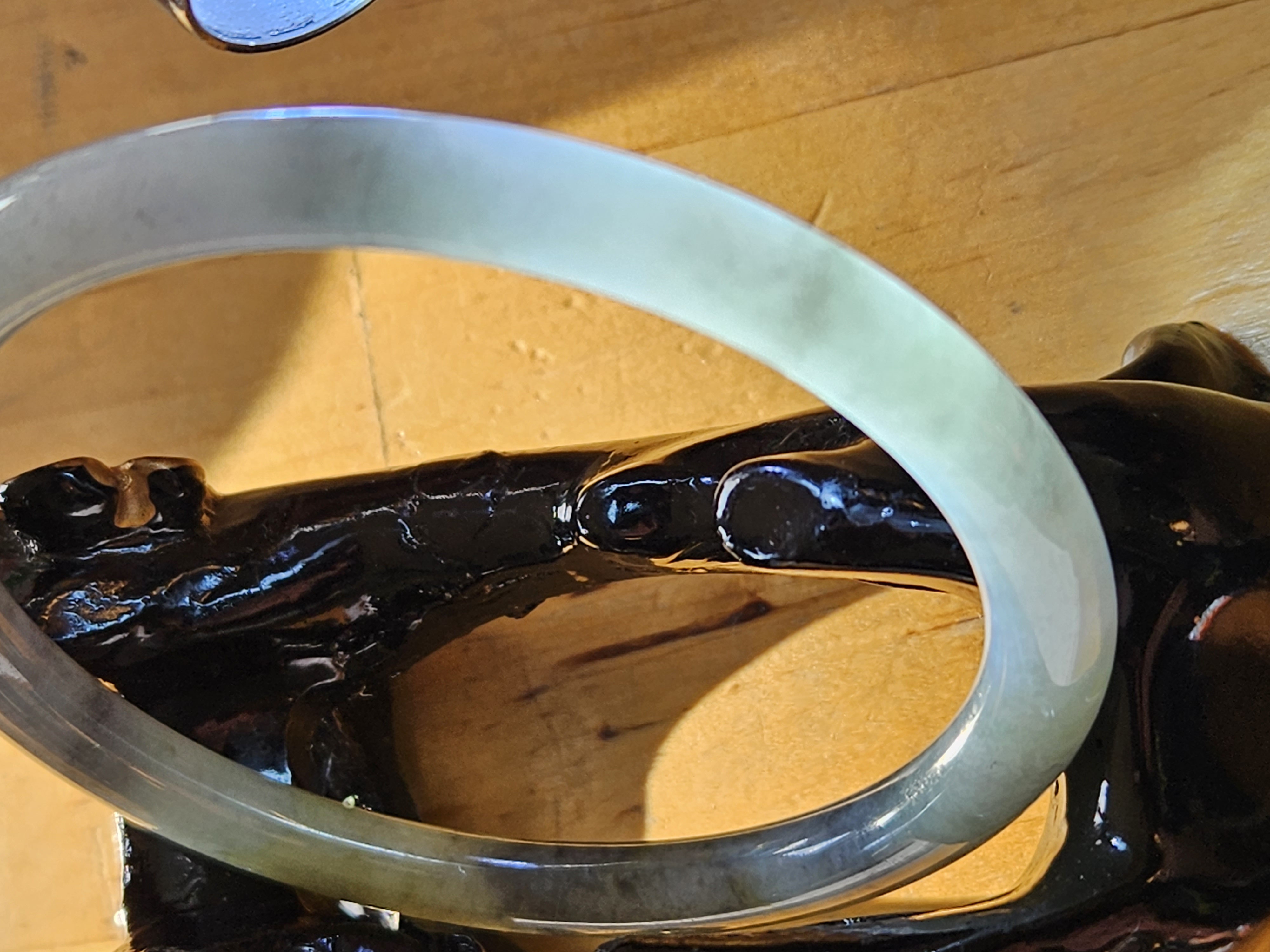 Round Burmese jadeite bangle in a lovely light green and yellow colour with smoky grey patches, measures 57.1 x 5.7 x 7.6mm, fits up to 59mm, weighs 20.42g, comes with a certificate of authenticity £99