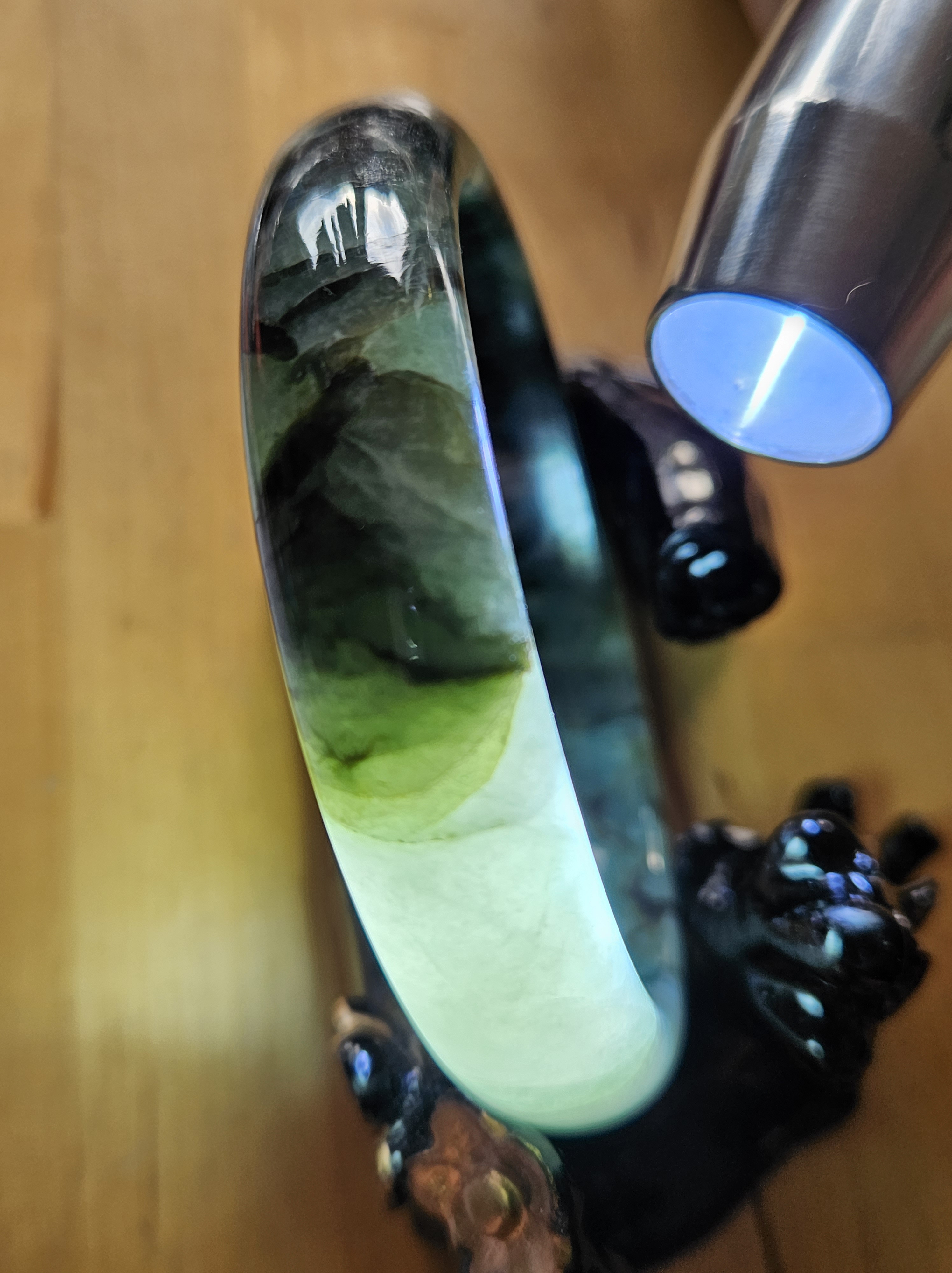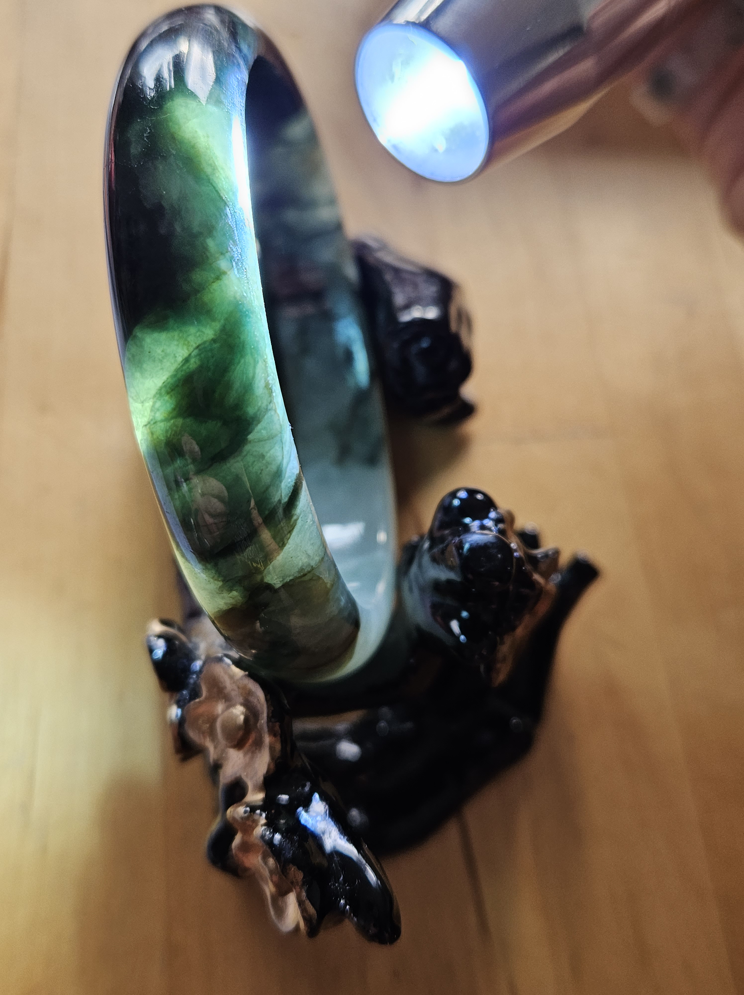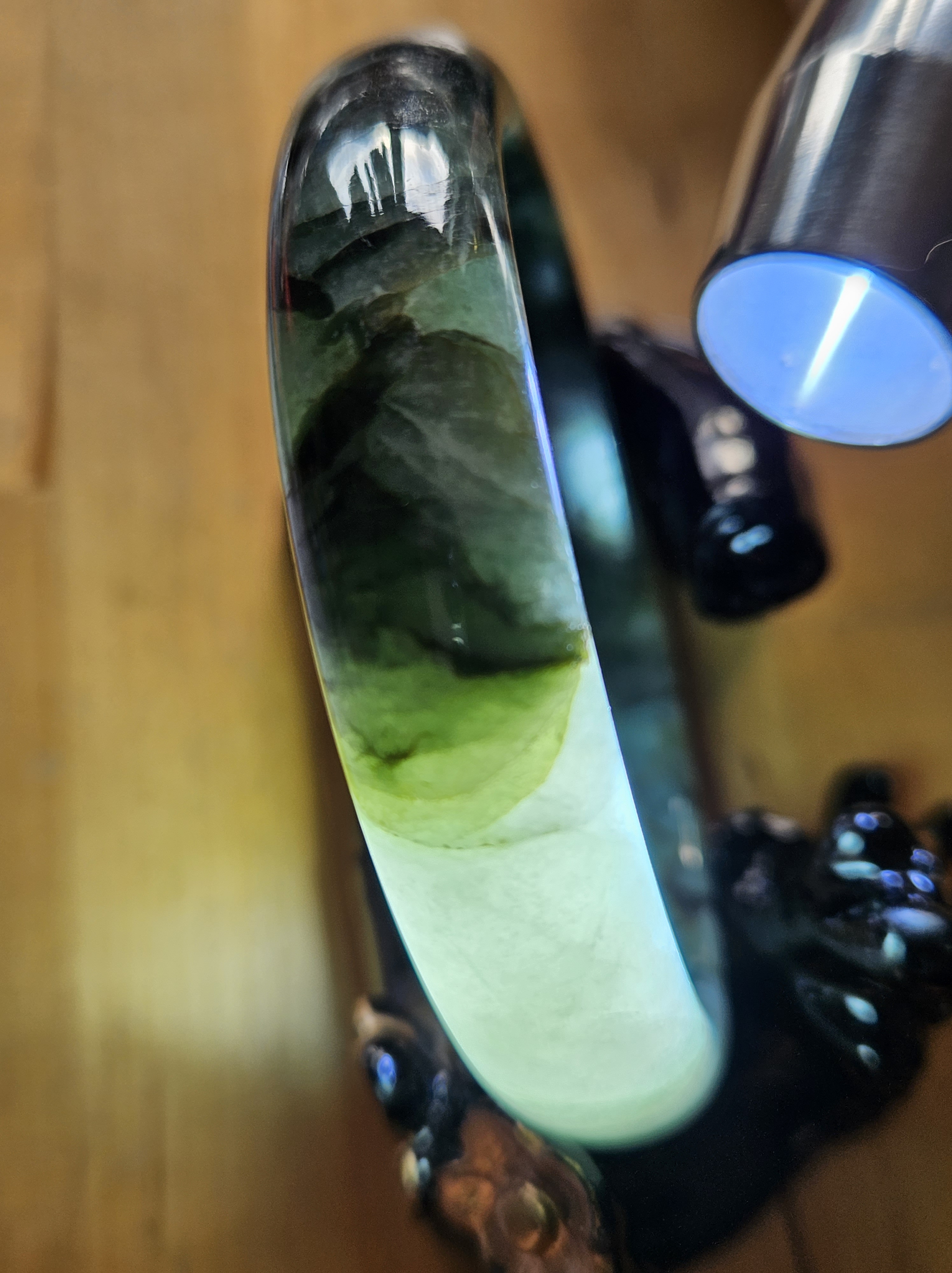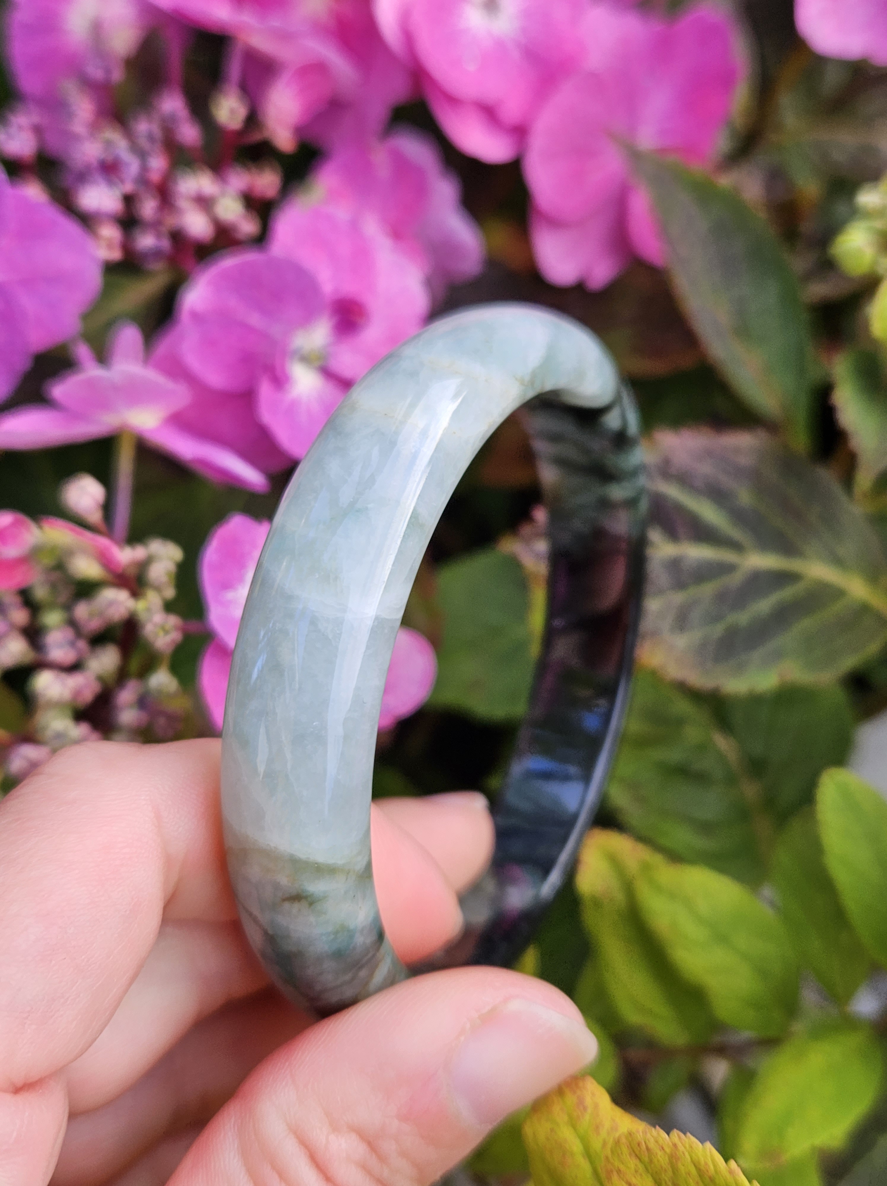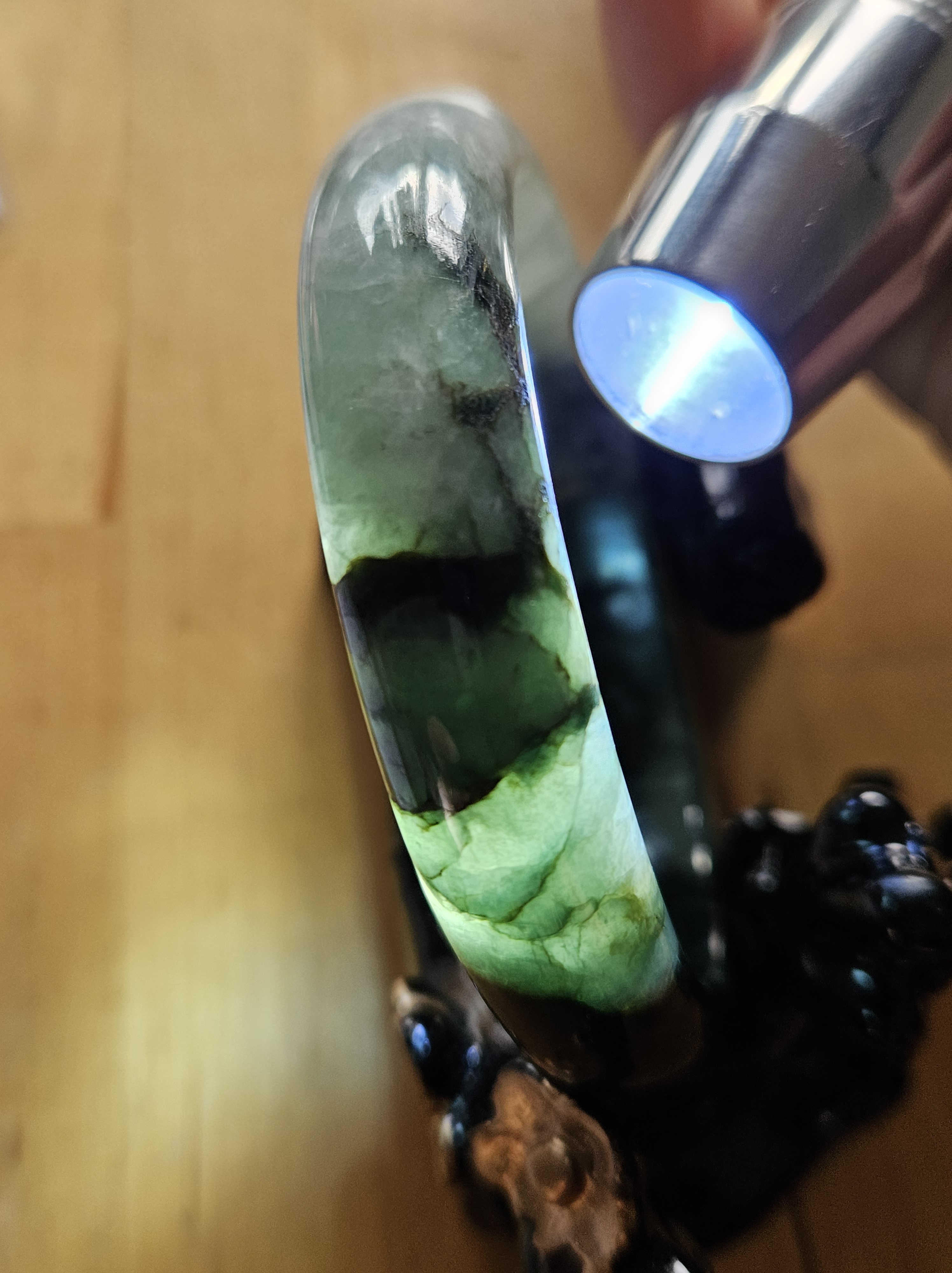 Lovely green bangle, dark green on some parts, and translucent light green in other parts. Consist of internal lines, cracks and formations that does not affect usage. Measures 60.6 x 13.4 x 7.9mm, weighs 54.46g, comes with a certificate of authenticity £119