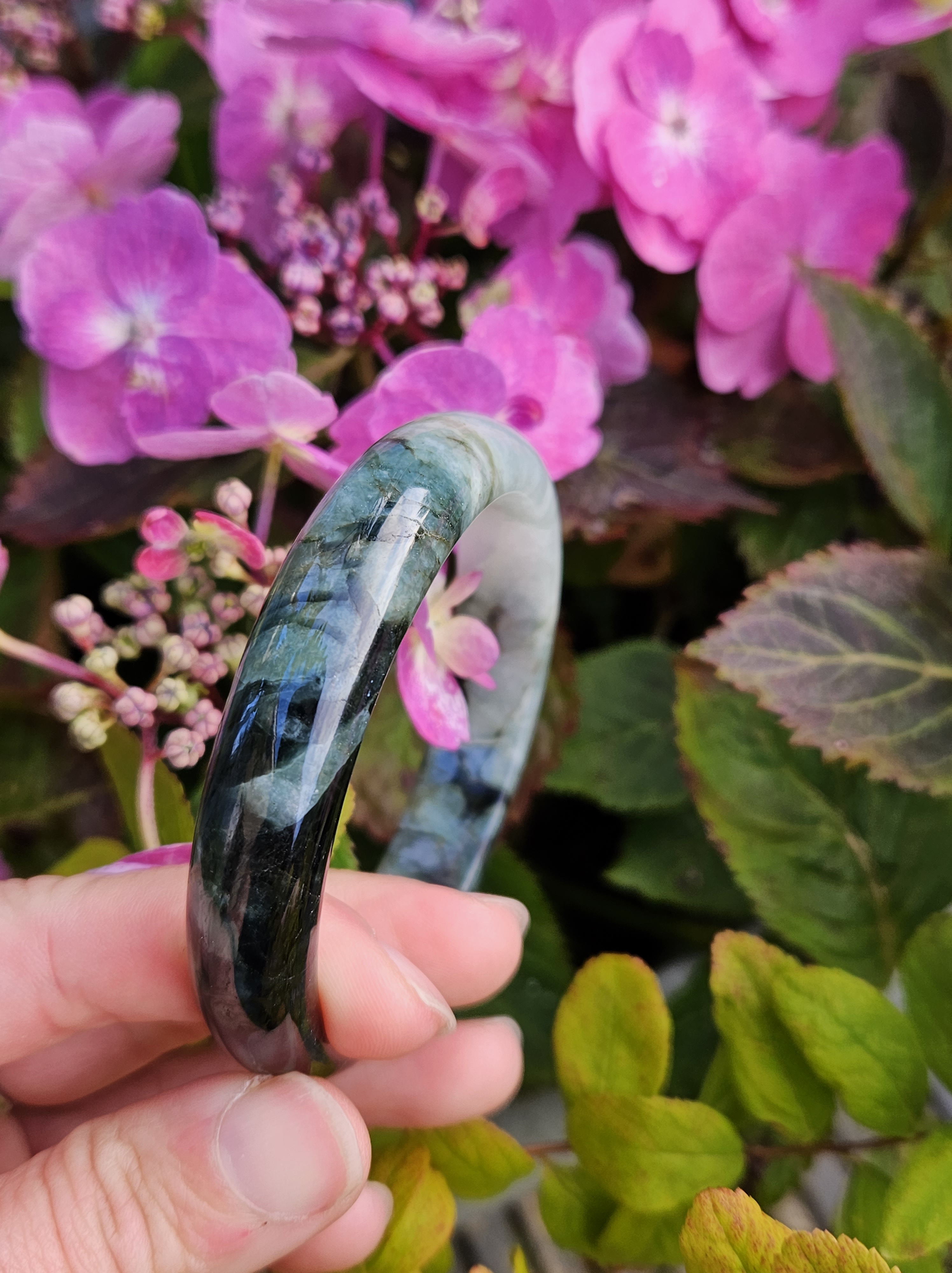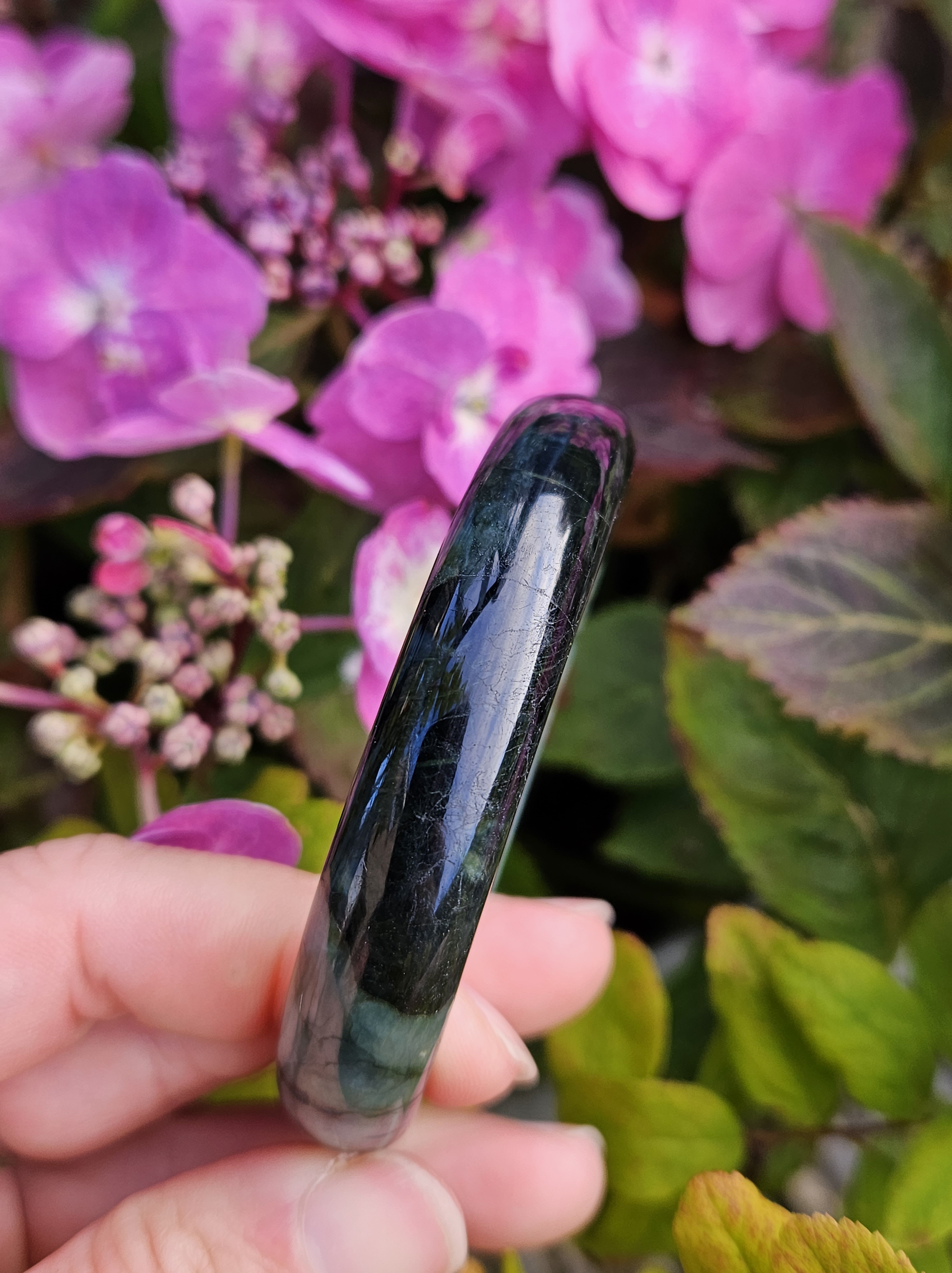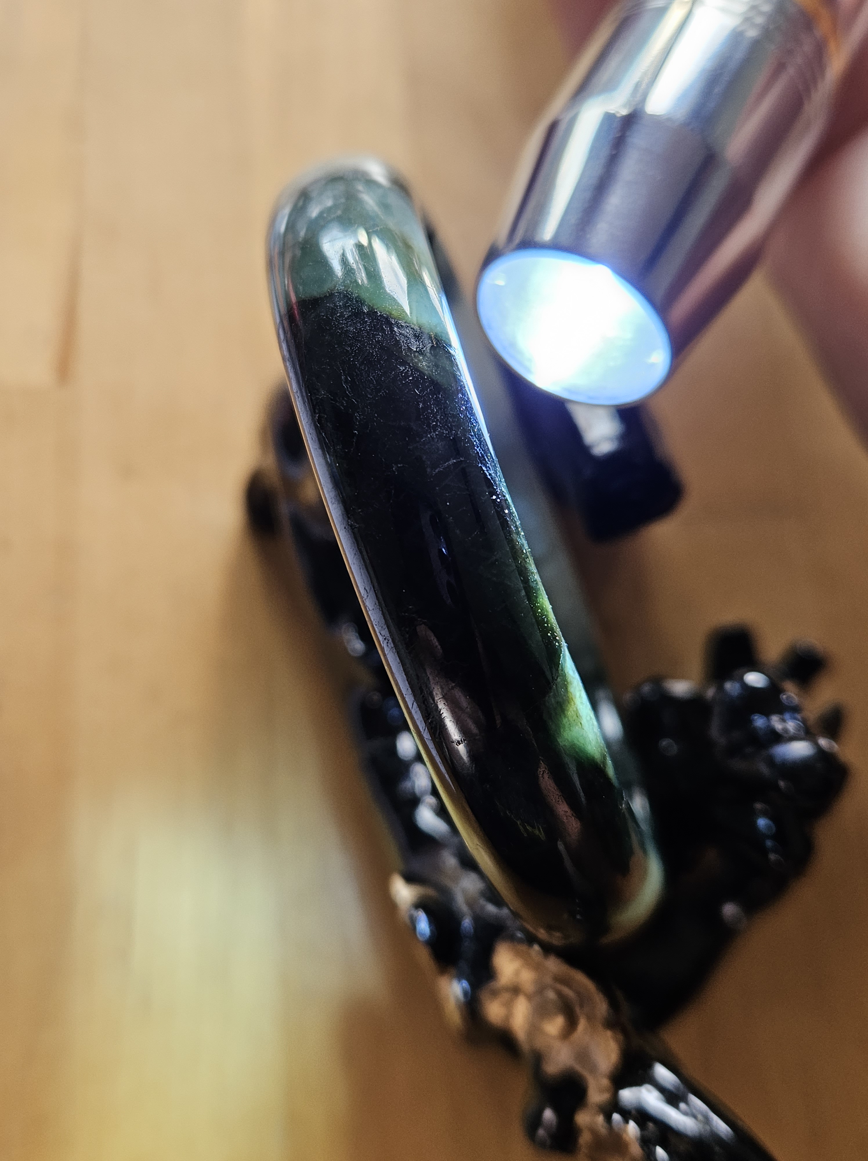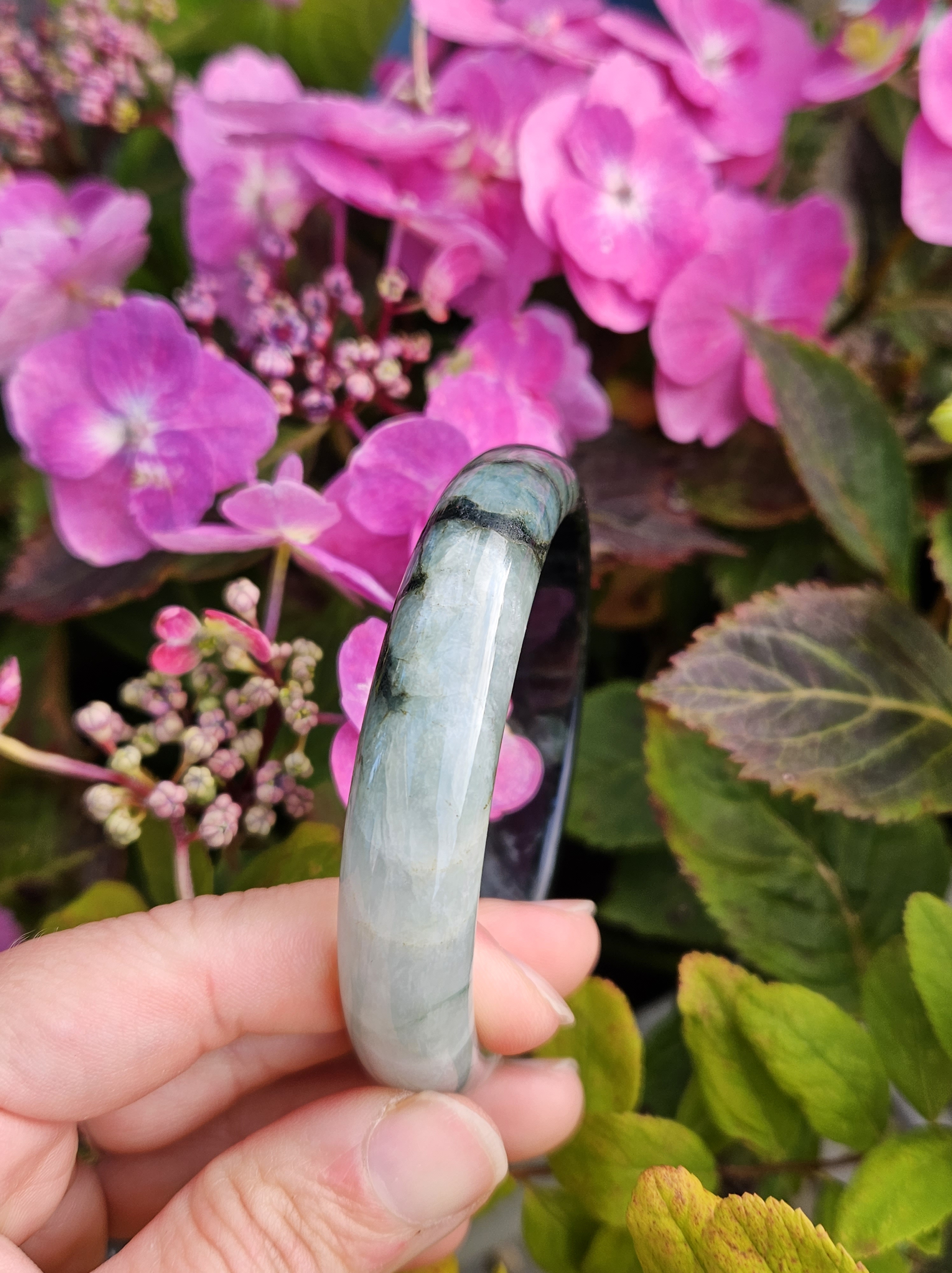 Lovely green bangle, dark green on some parts, and translucent light green in other parts. Consist of internal lines, cracks and formations that does not affect usage. Measures 60.6 x 13.4 x 7.9mm, weighs 54.46g, comes with a certificate of authenticity £119