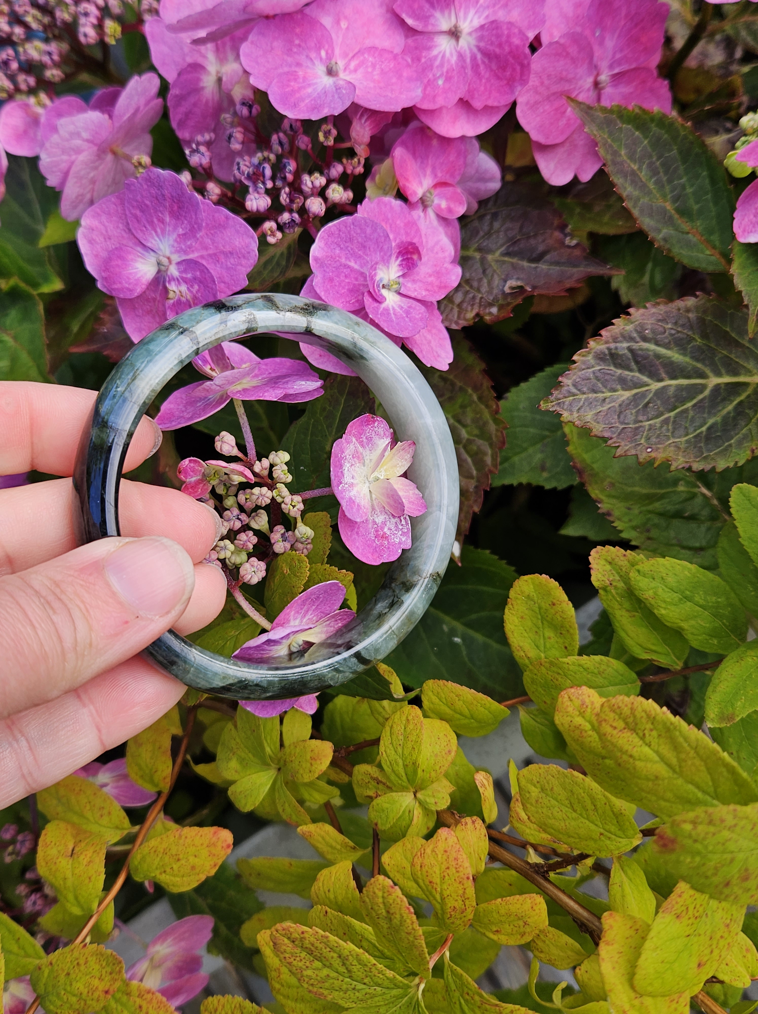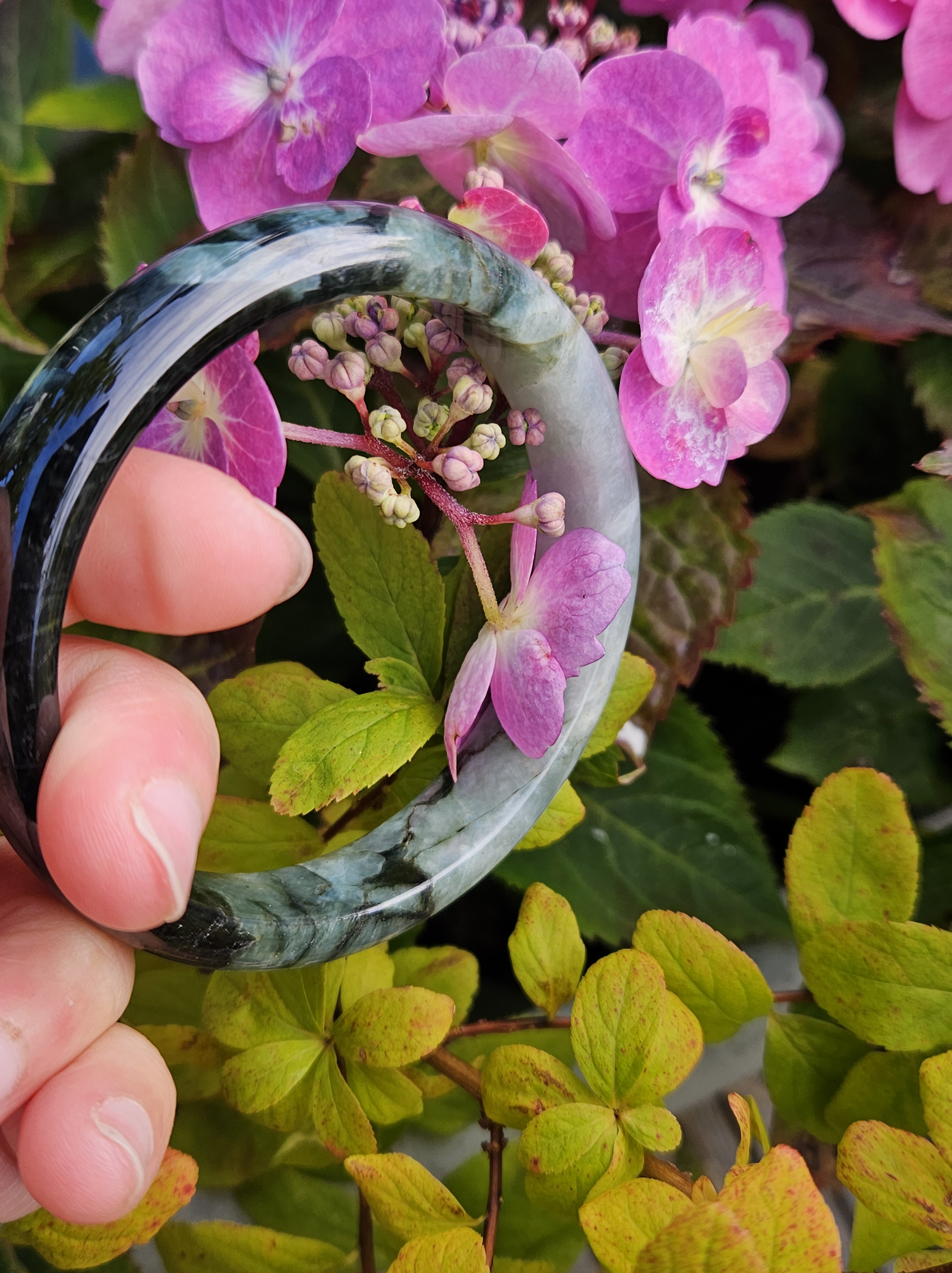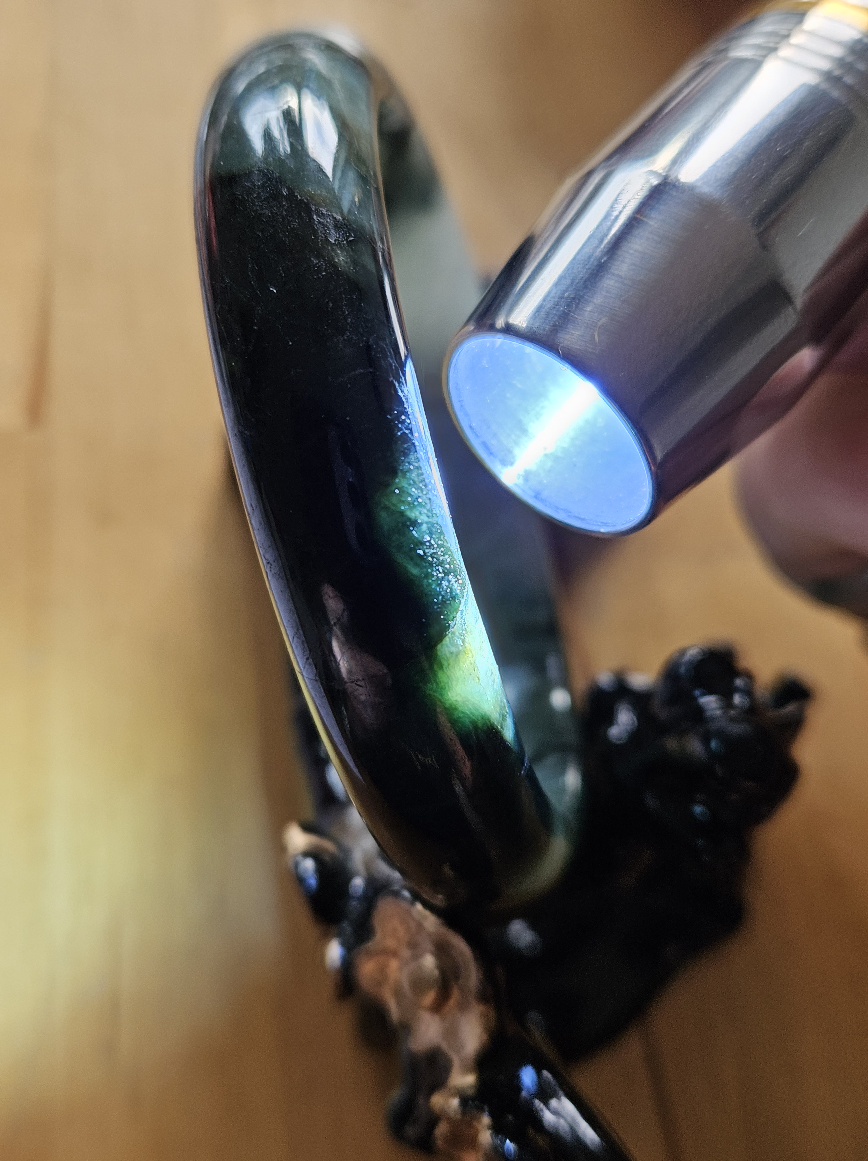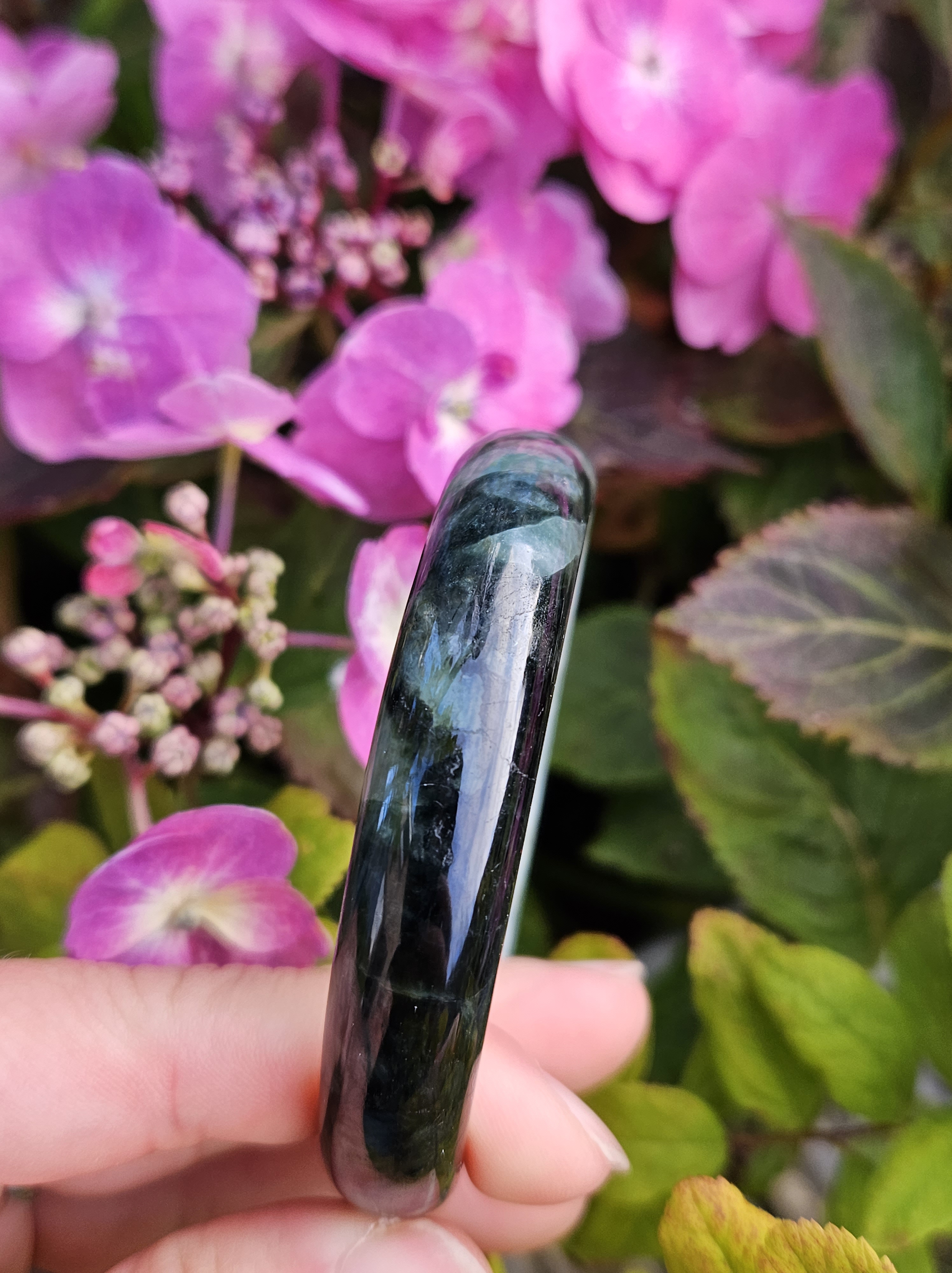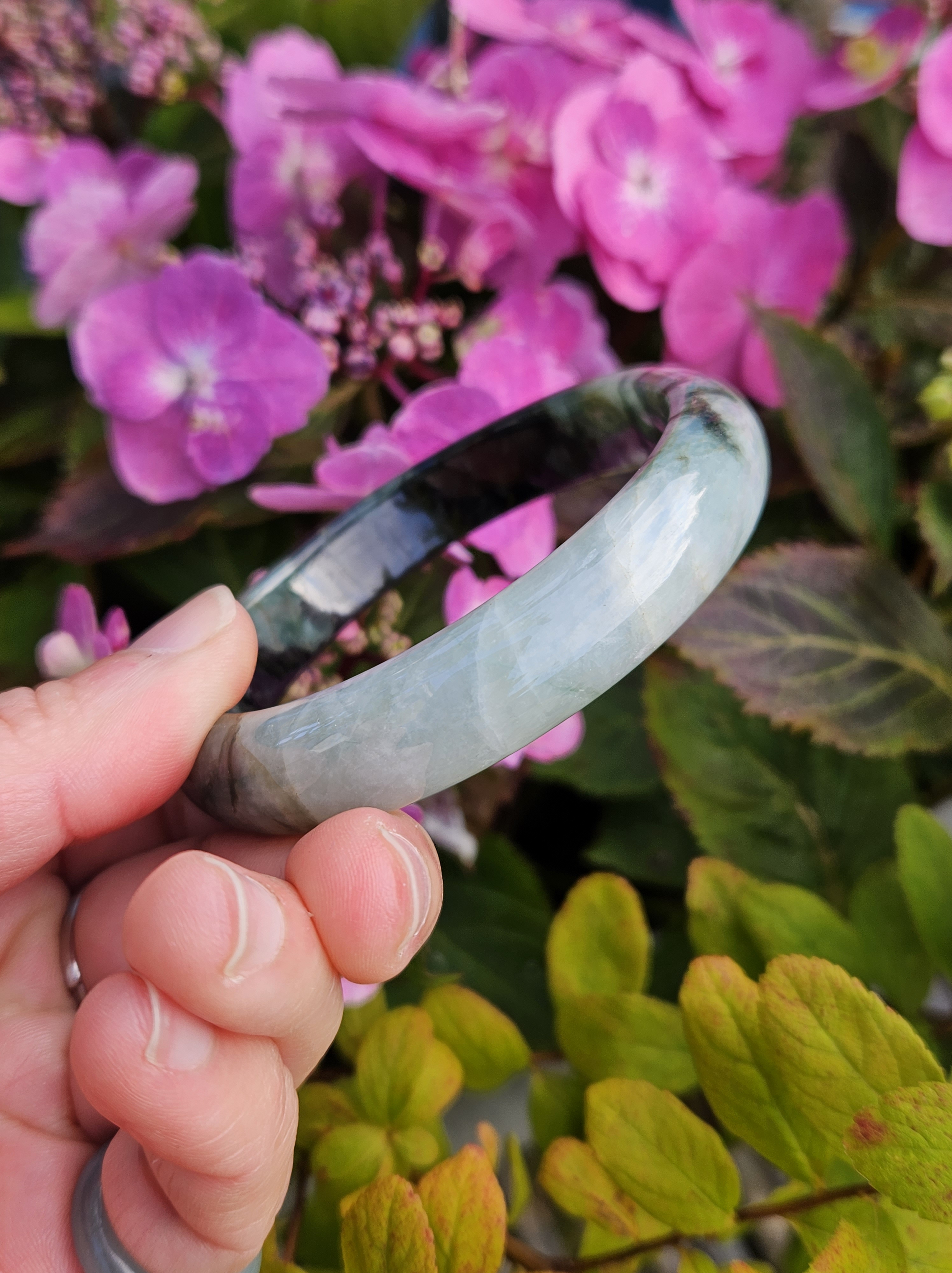Lovely green bangle, dark green on some parts, and translucent light green in other parts. Consist of internal lines, cracks and formations that does not affect usage. Measures 60.6 x 13.4 x 7.9mm, weighs 54.46g, comes with a certificate of authenticity £119