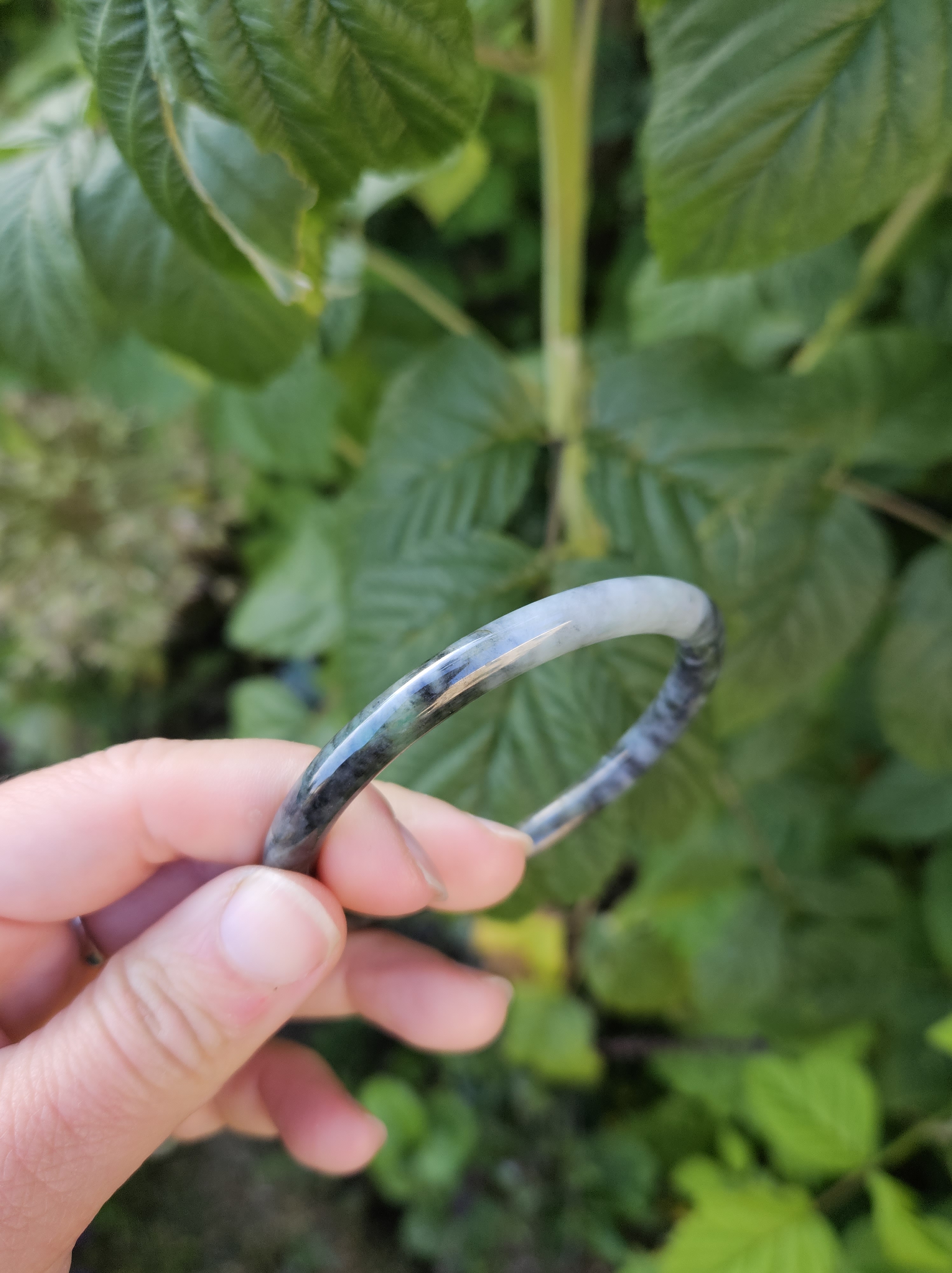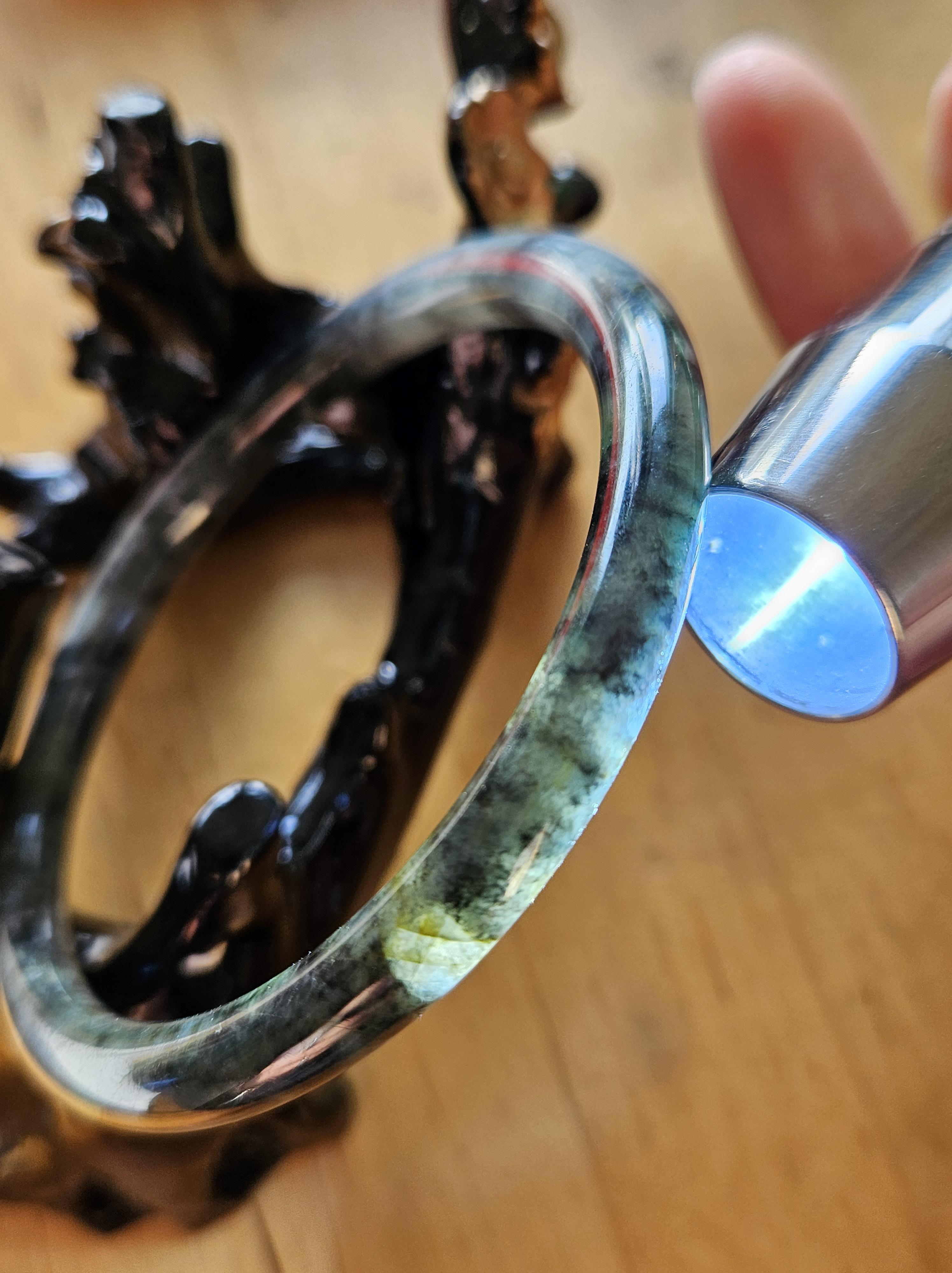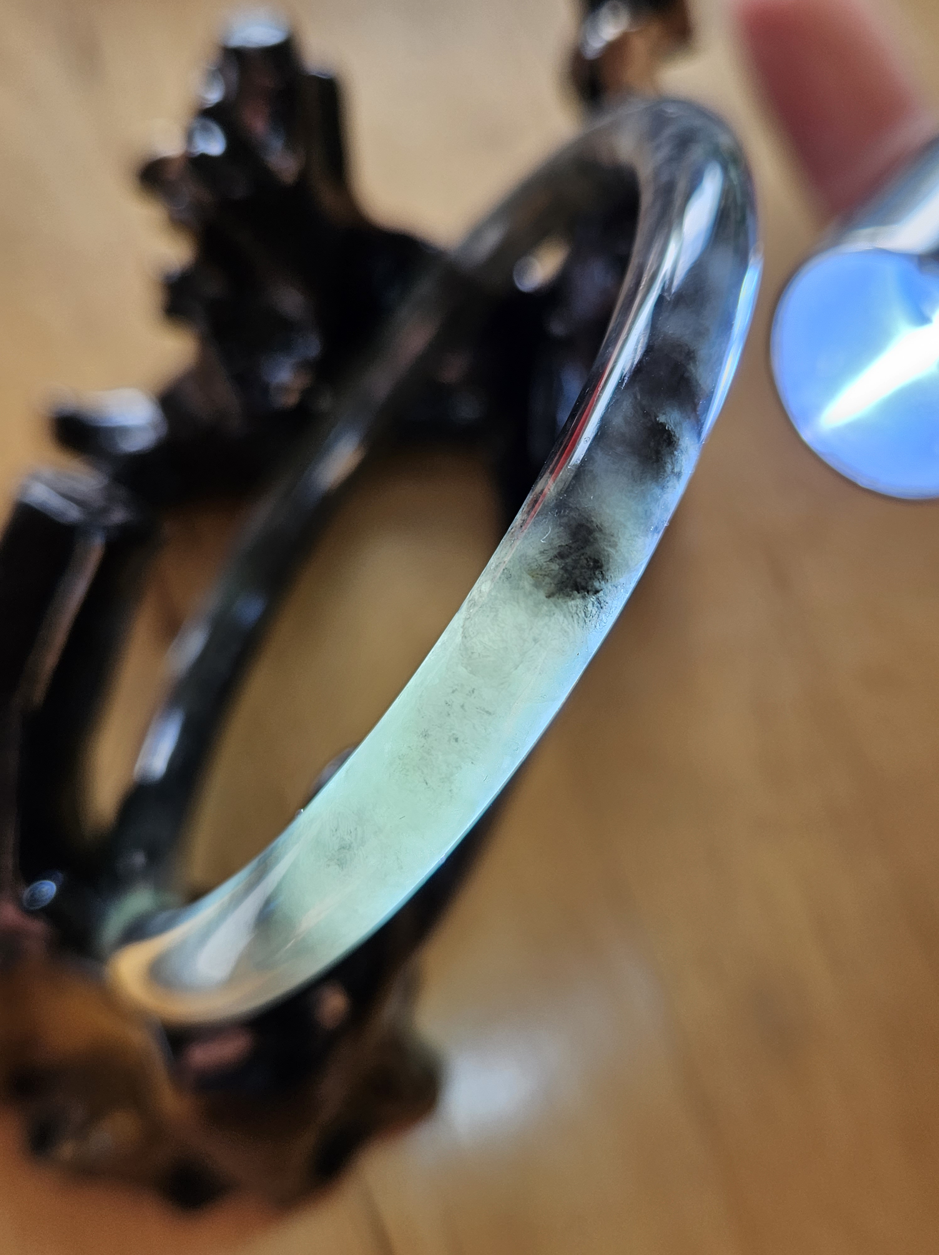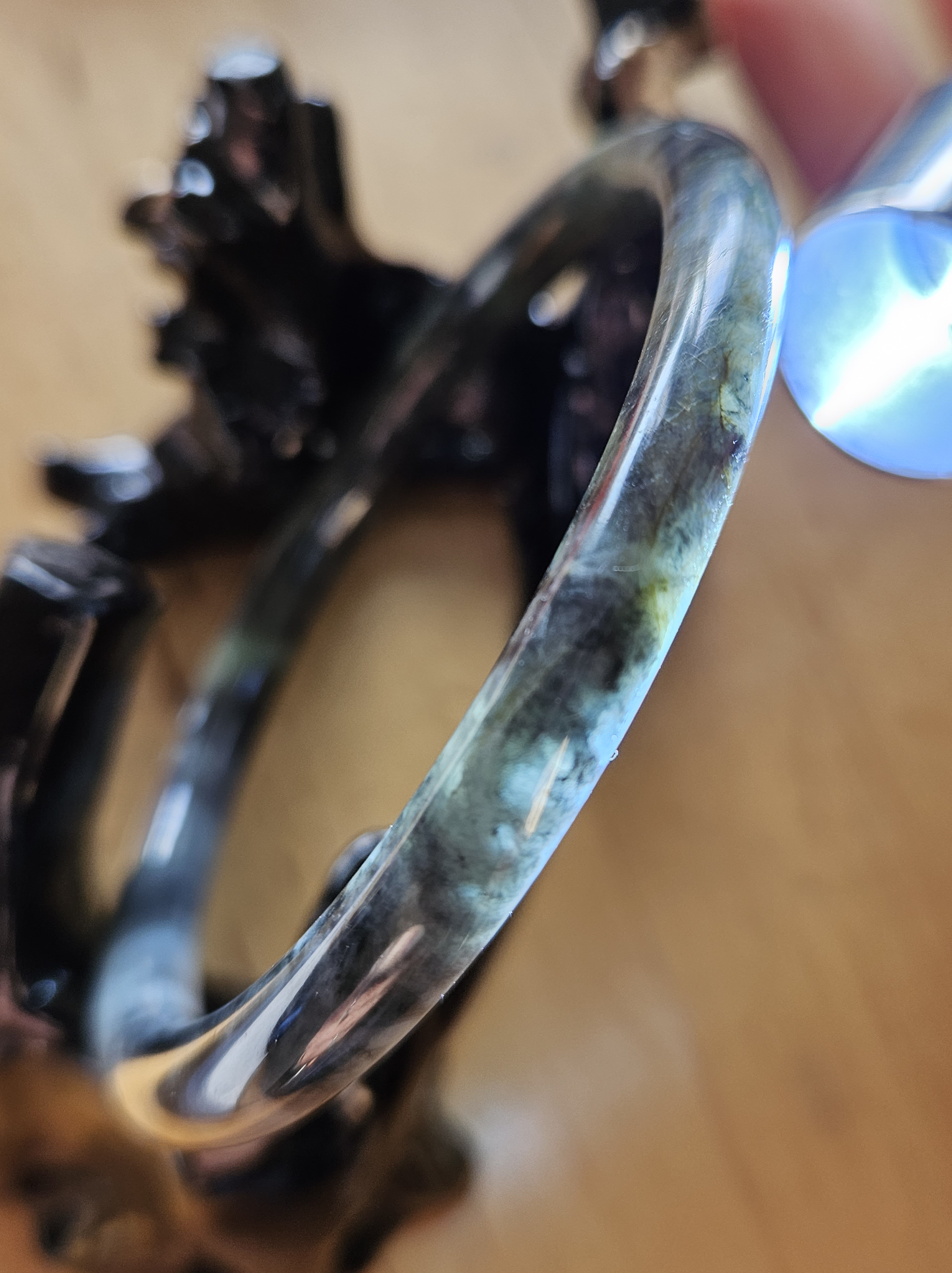 Fits up to 59mm, smoky grey Burmese jadeite bangle with vibrant green and yellow in places. Measures 57 x 6.4 x 6.5mm, weighs 23.09g, comes with a certificate of authenticity £119