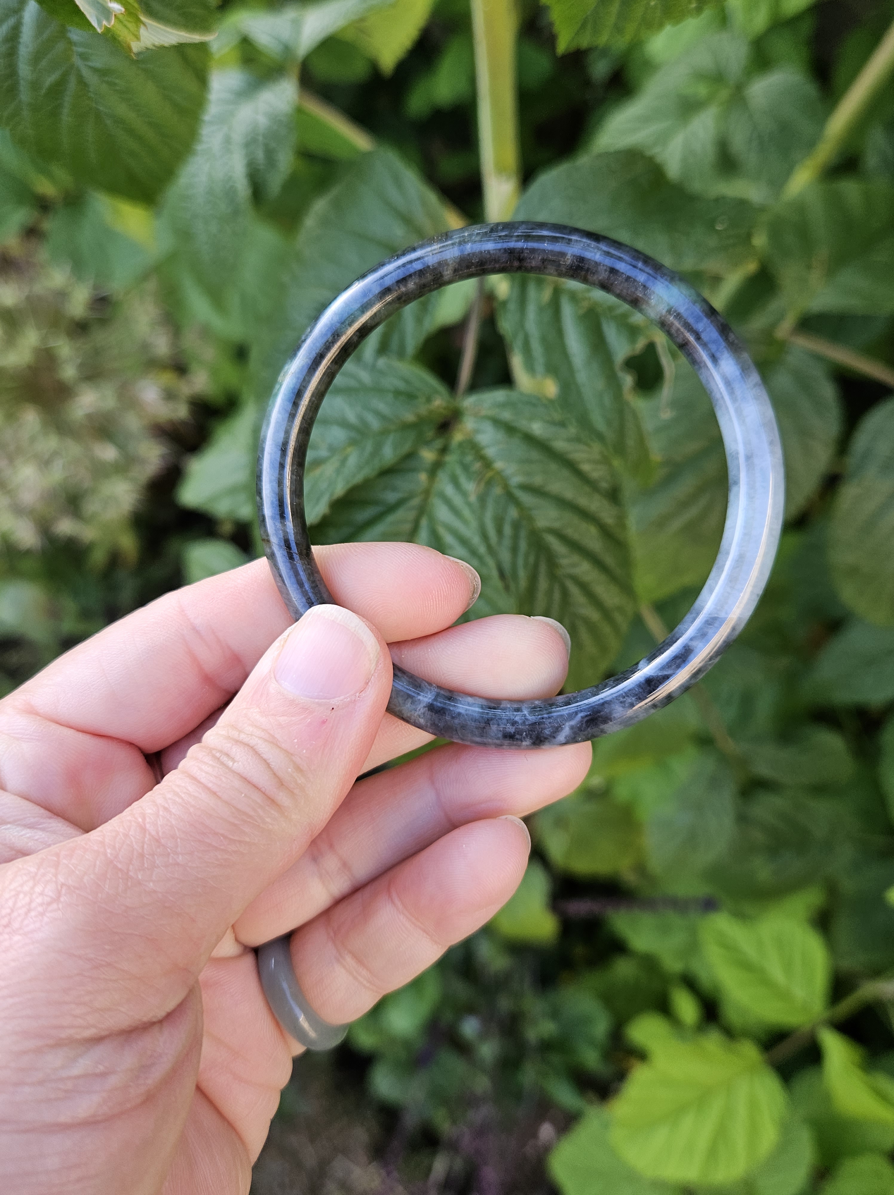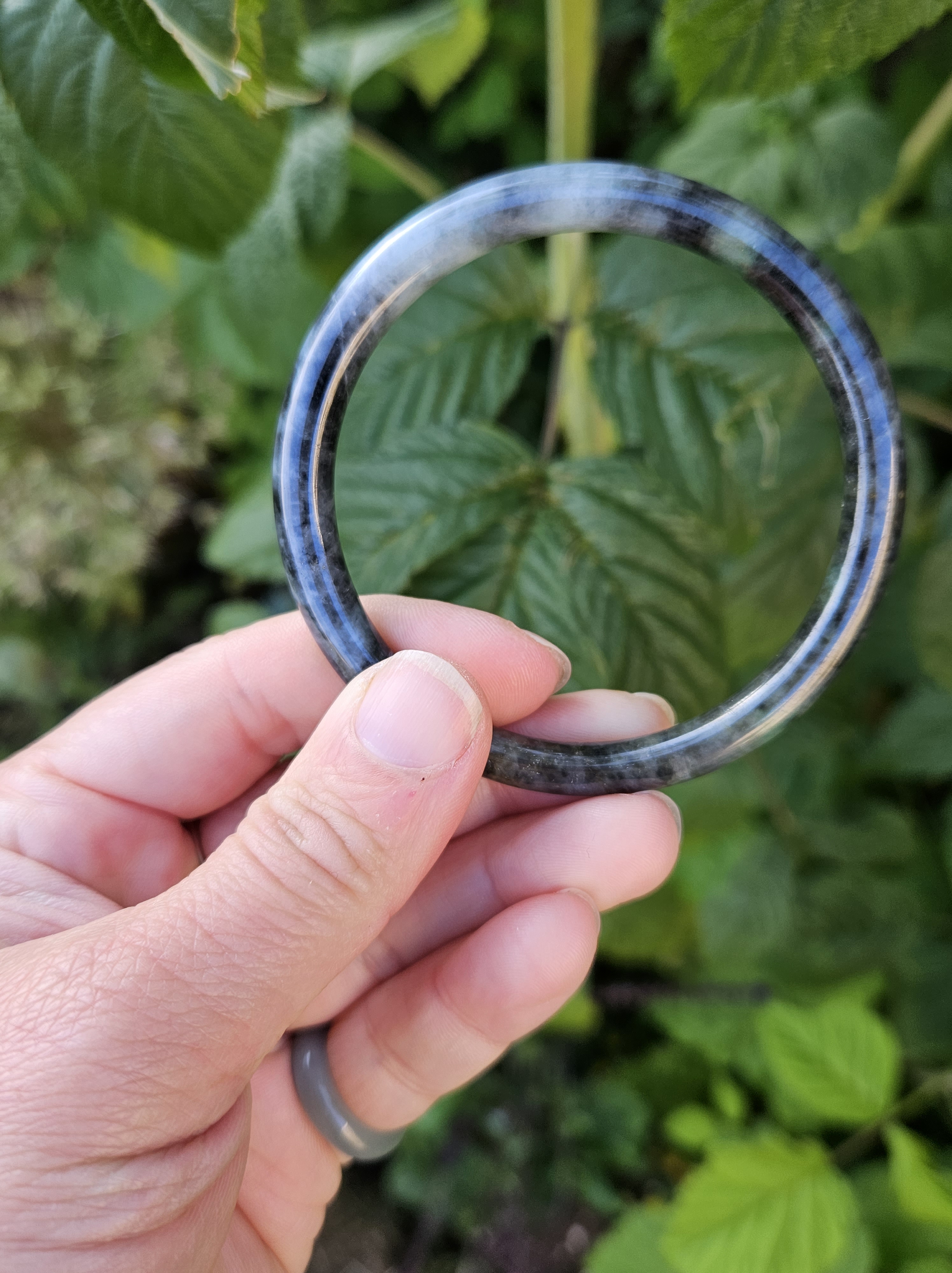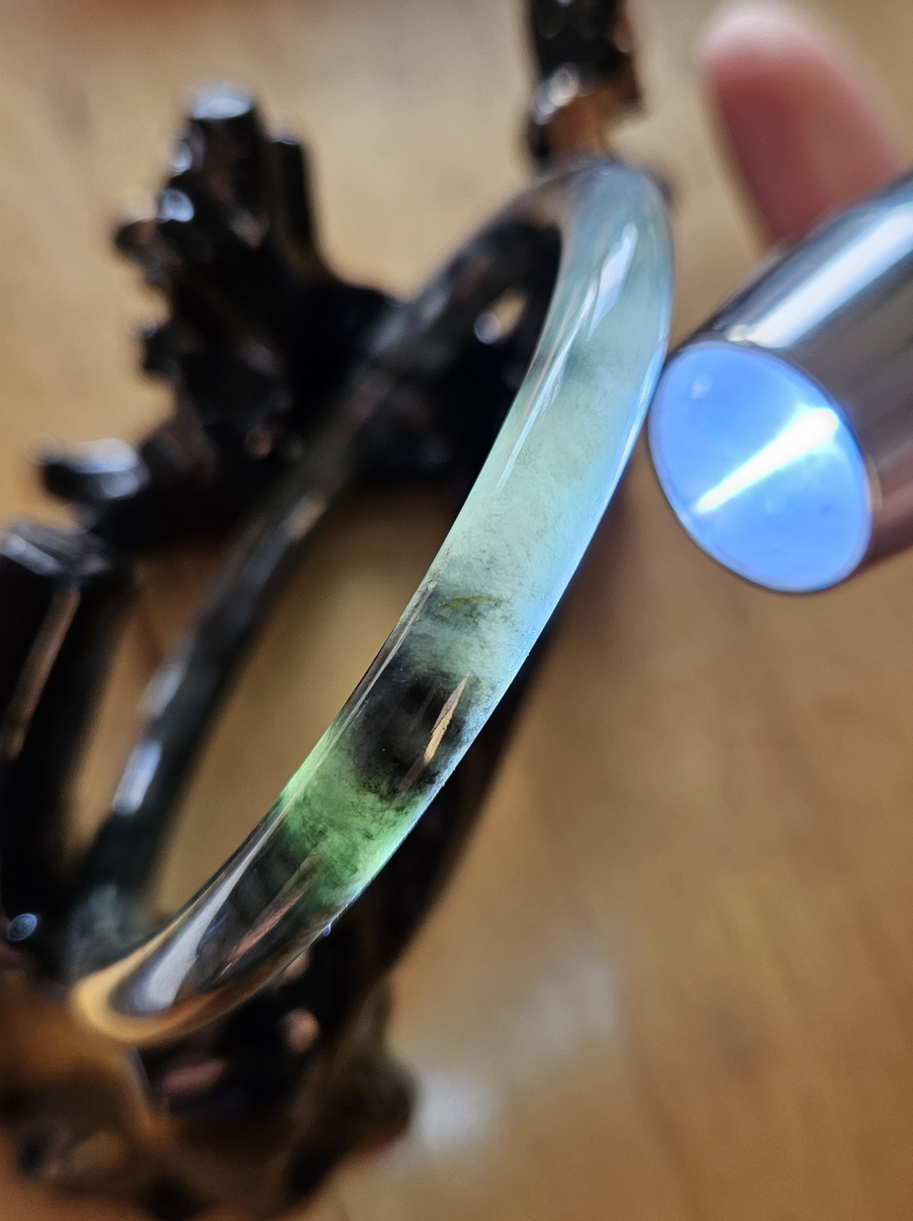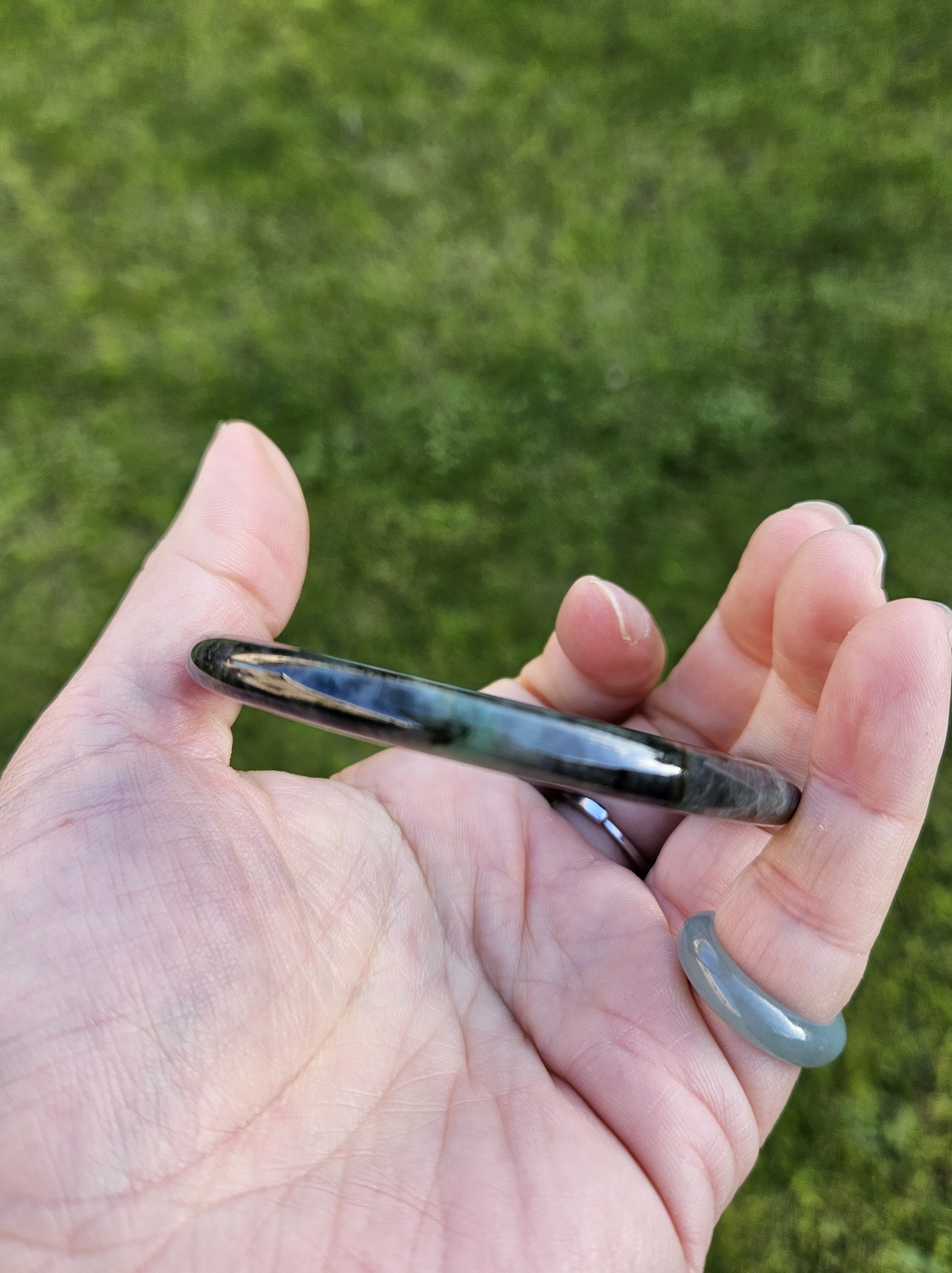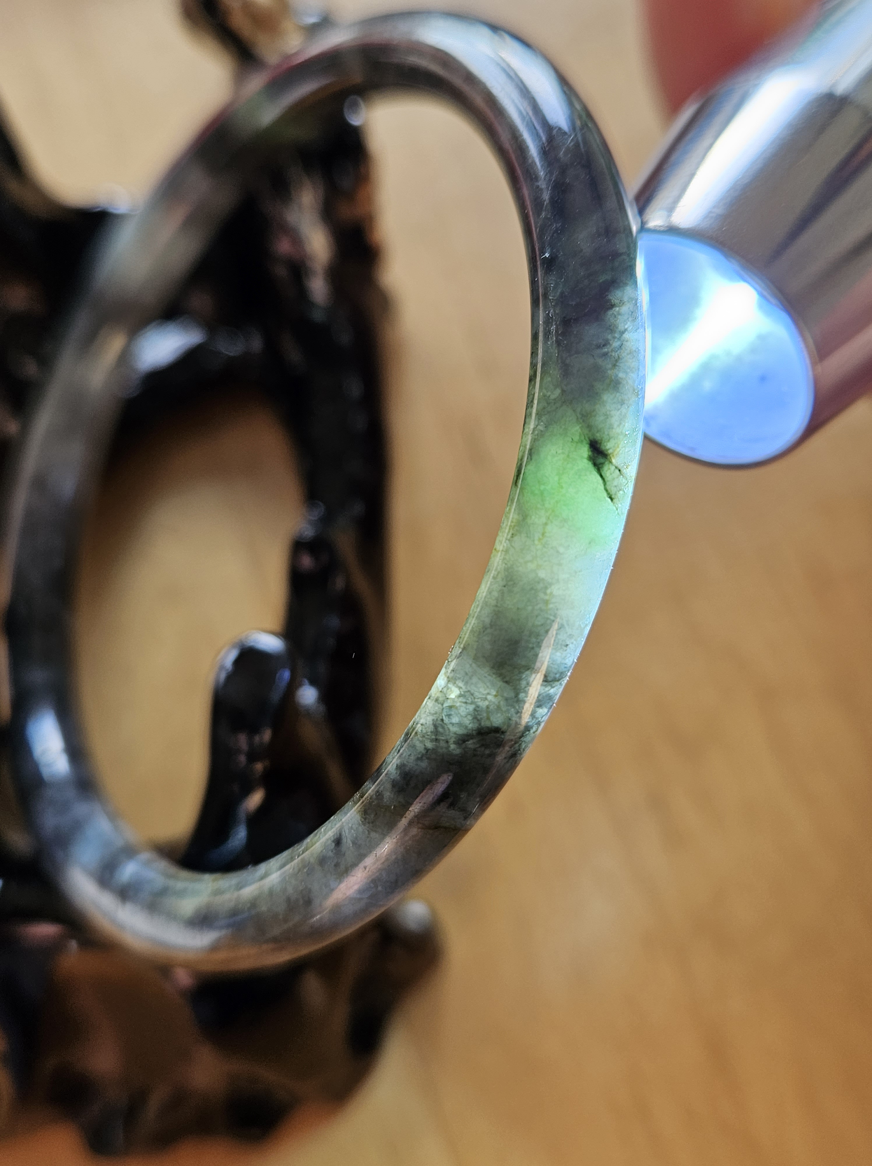 Fits up to 59mm, smoky grey Burmese jadeite bangle with vibrant green and yellow in places. Measures 57 x 6.4 x 6.5mm, weighs 23.09g, comes with a certificate of authenticity £119