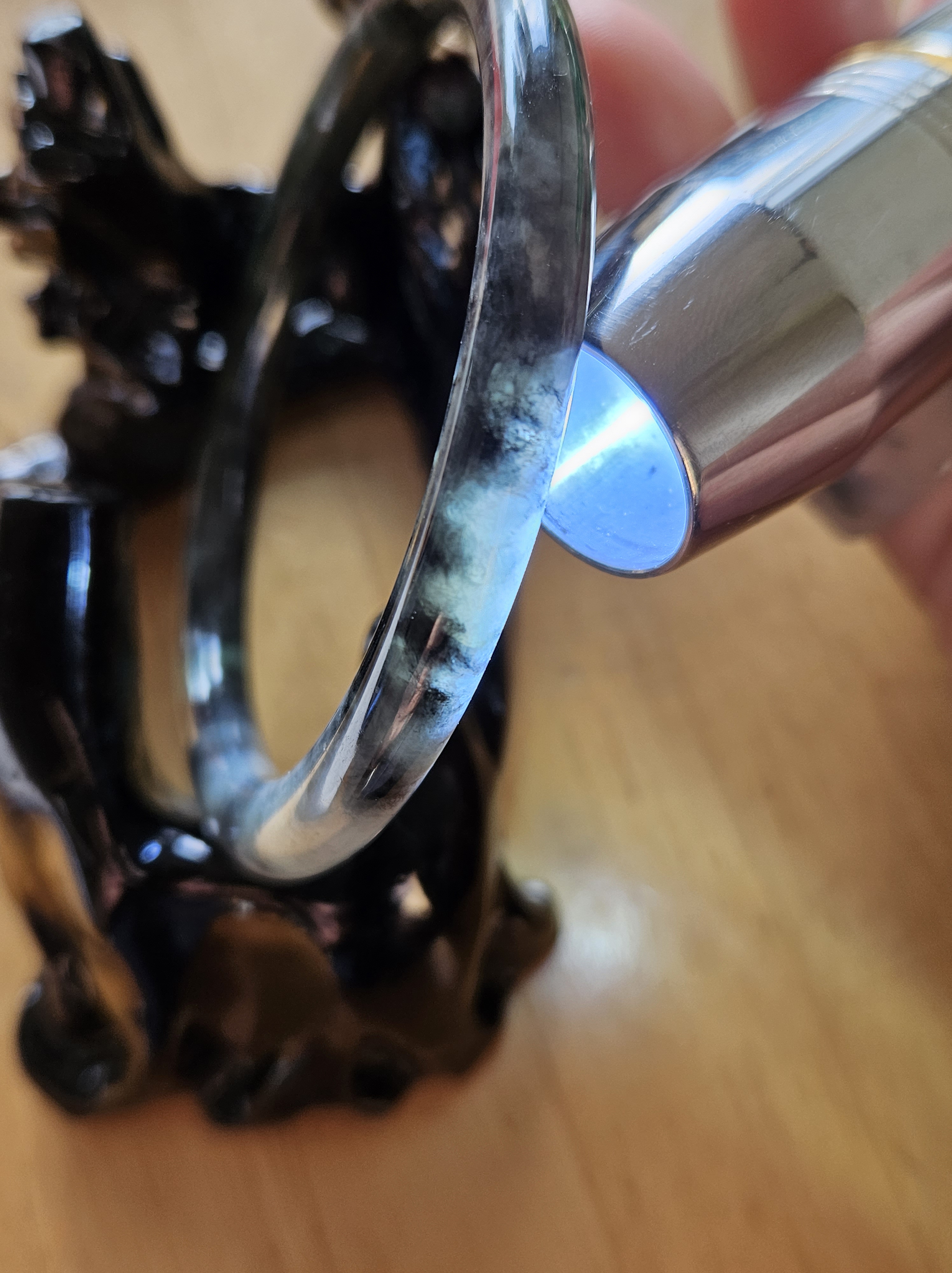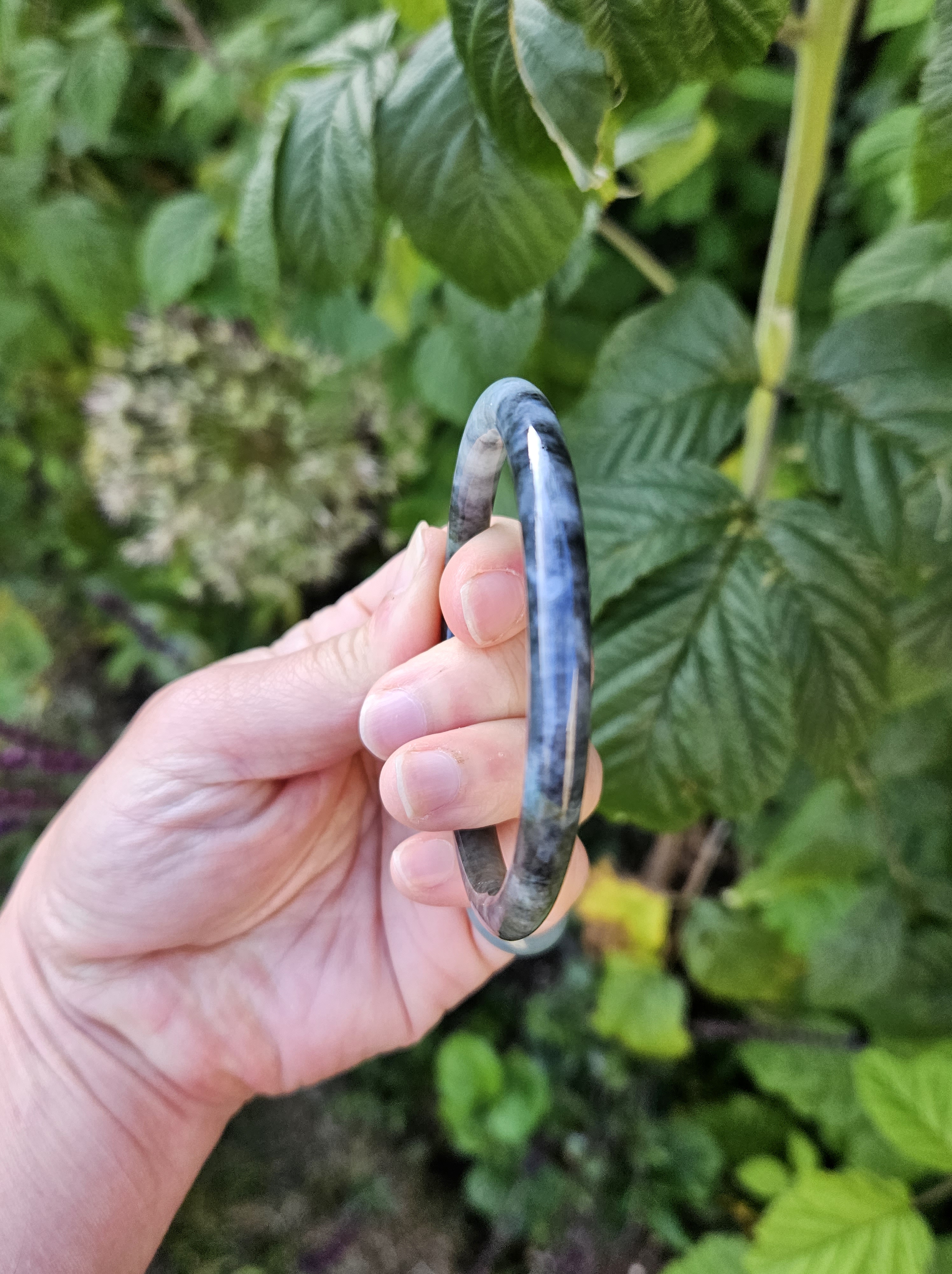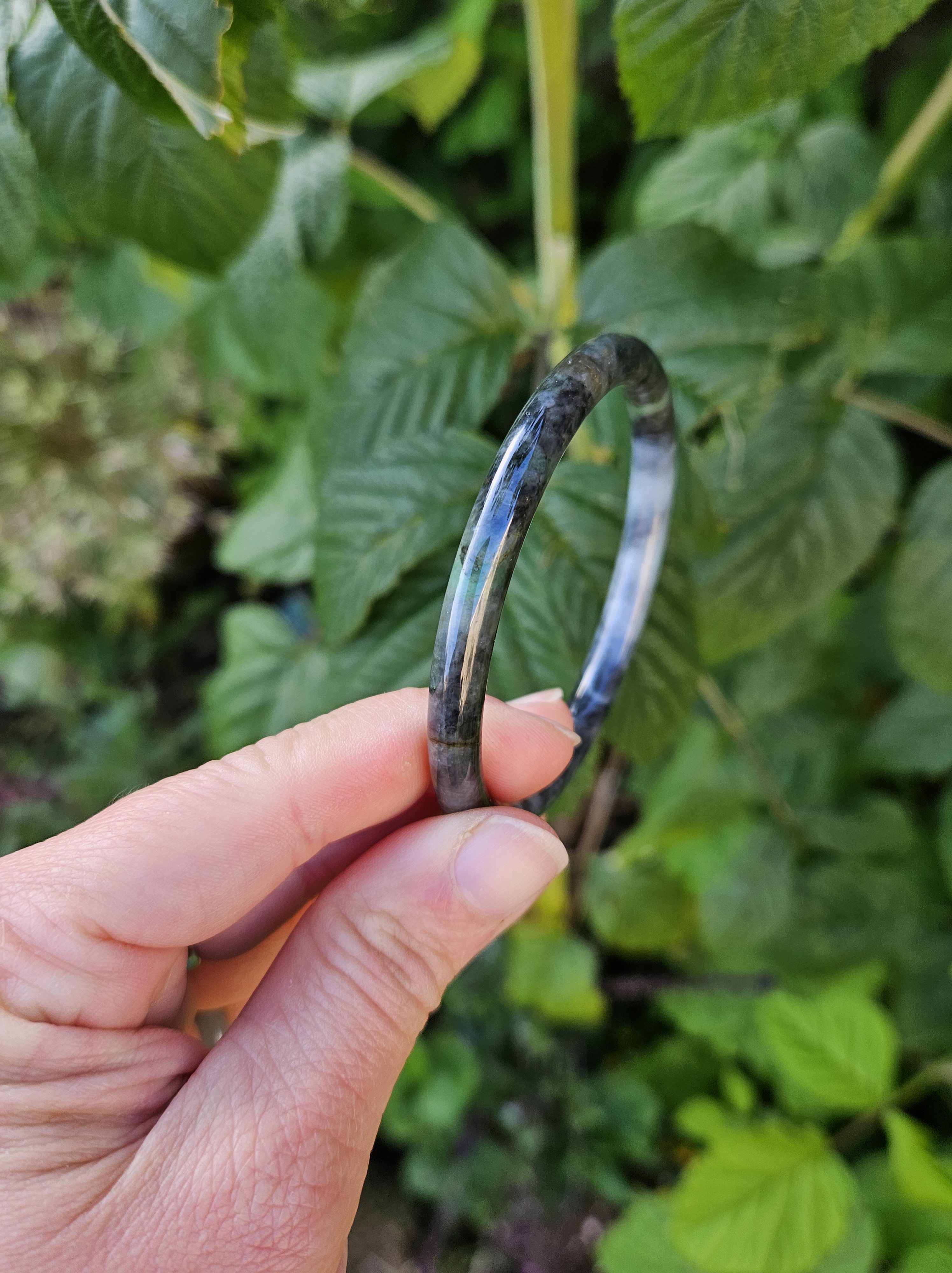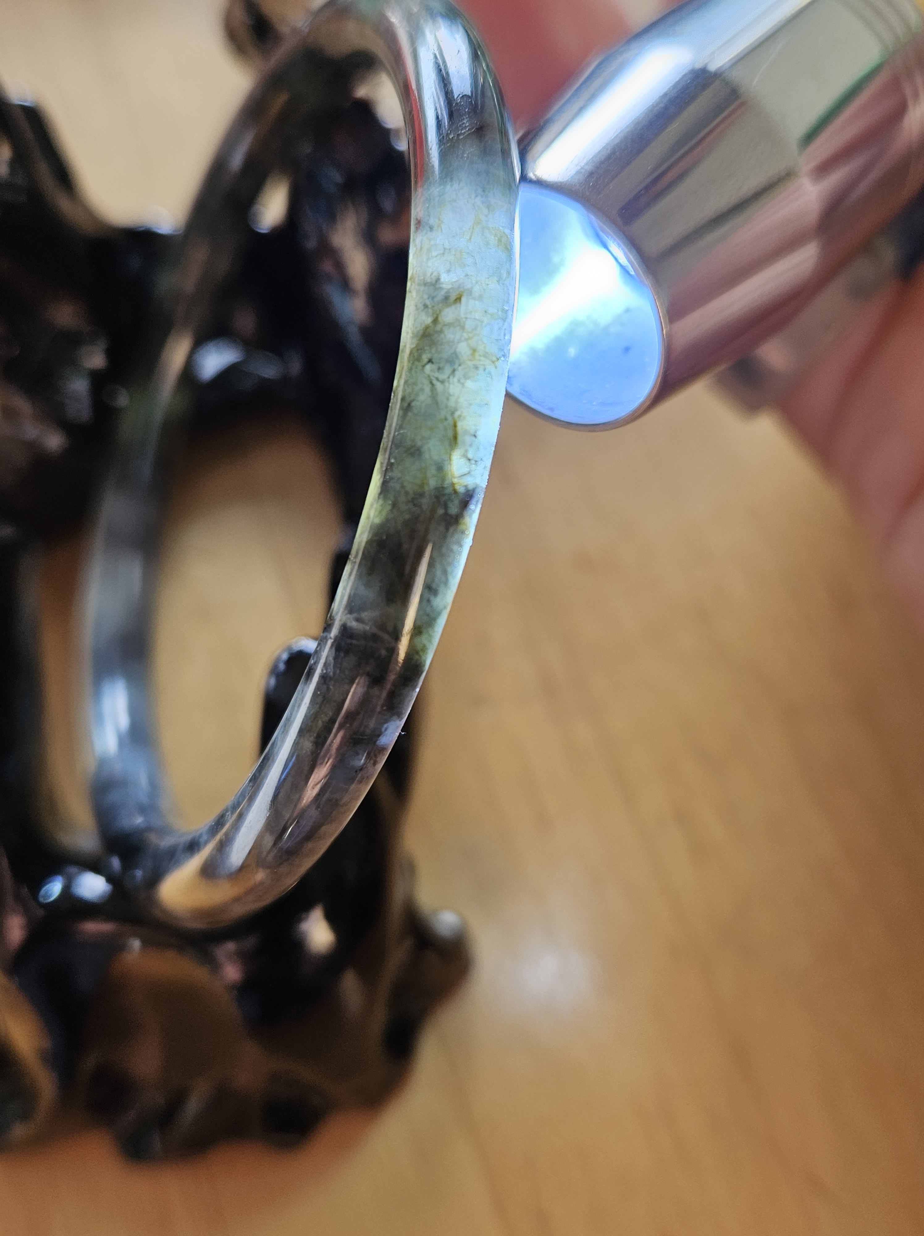 Fits up to 59mm, smoky grey Burmese jadeite bangle with vibrant green and yellow in places. Measures 57 x 6.4 x 6.5mm, weighs 23.09g, comes with a certificate of authenticity £119