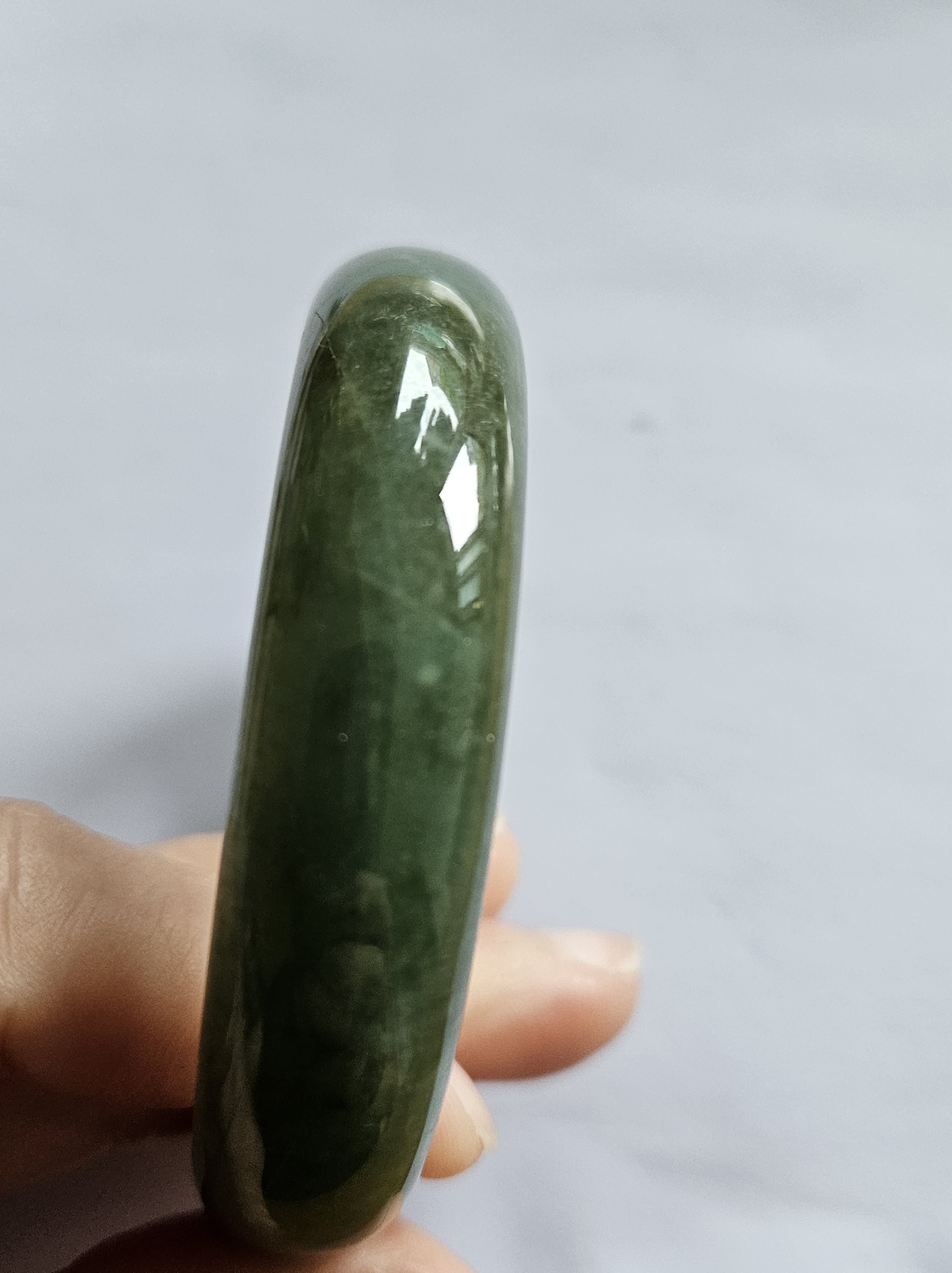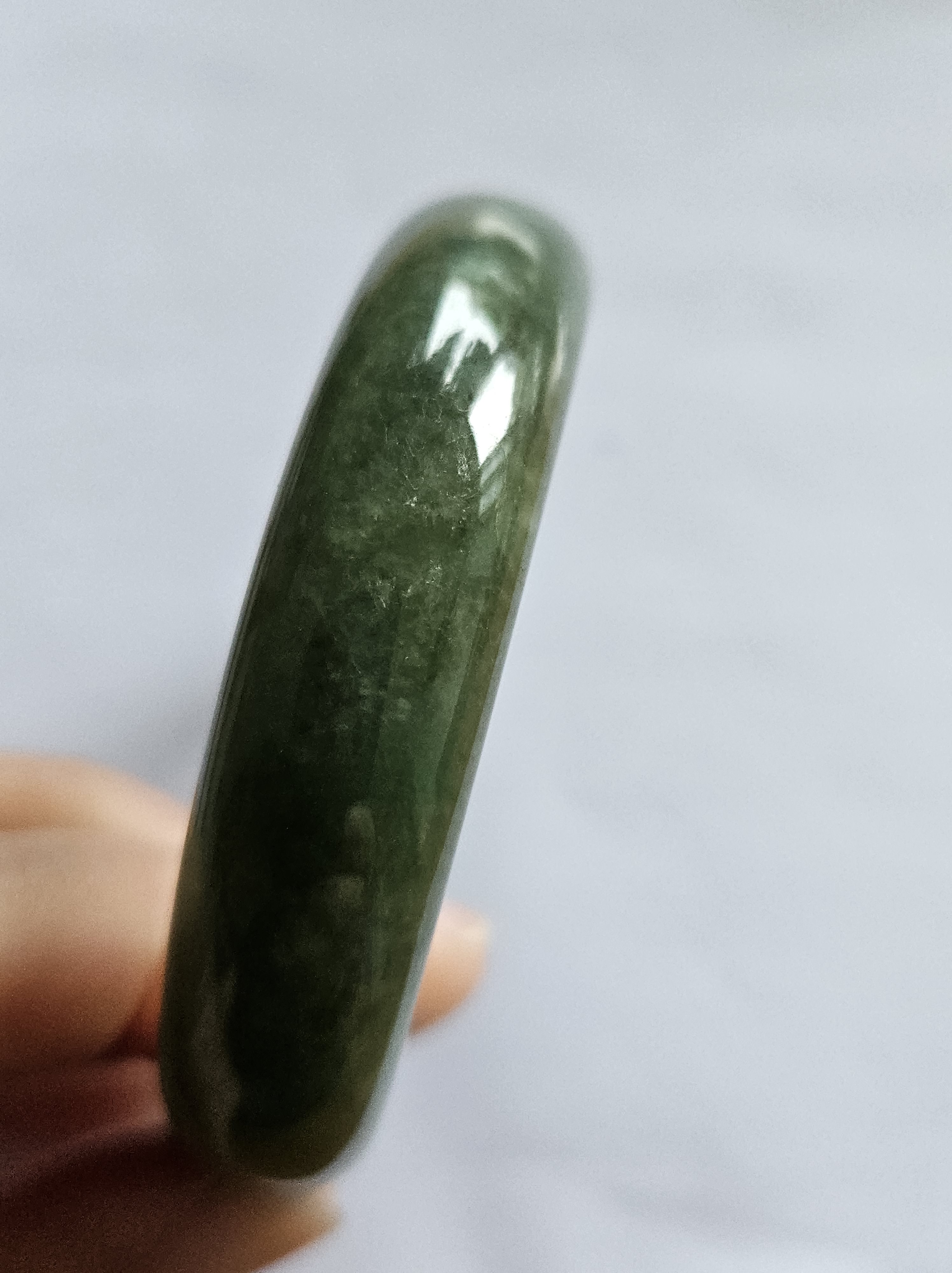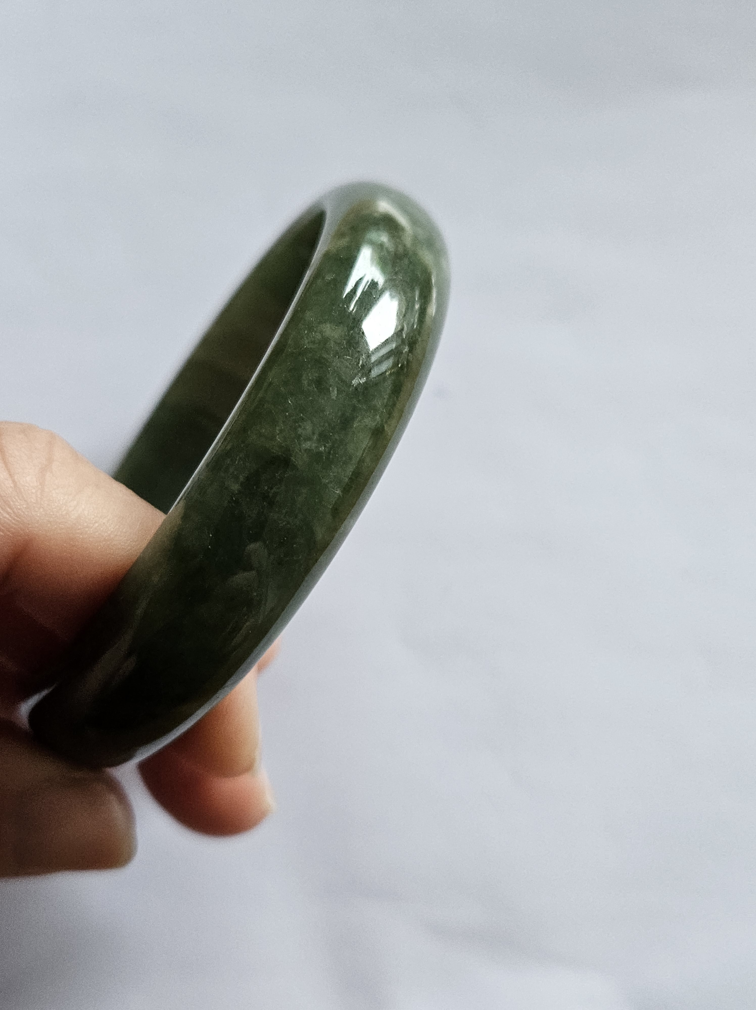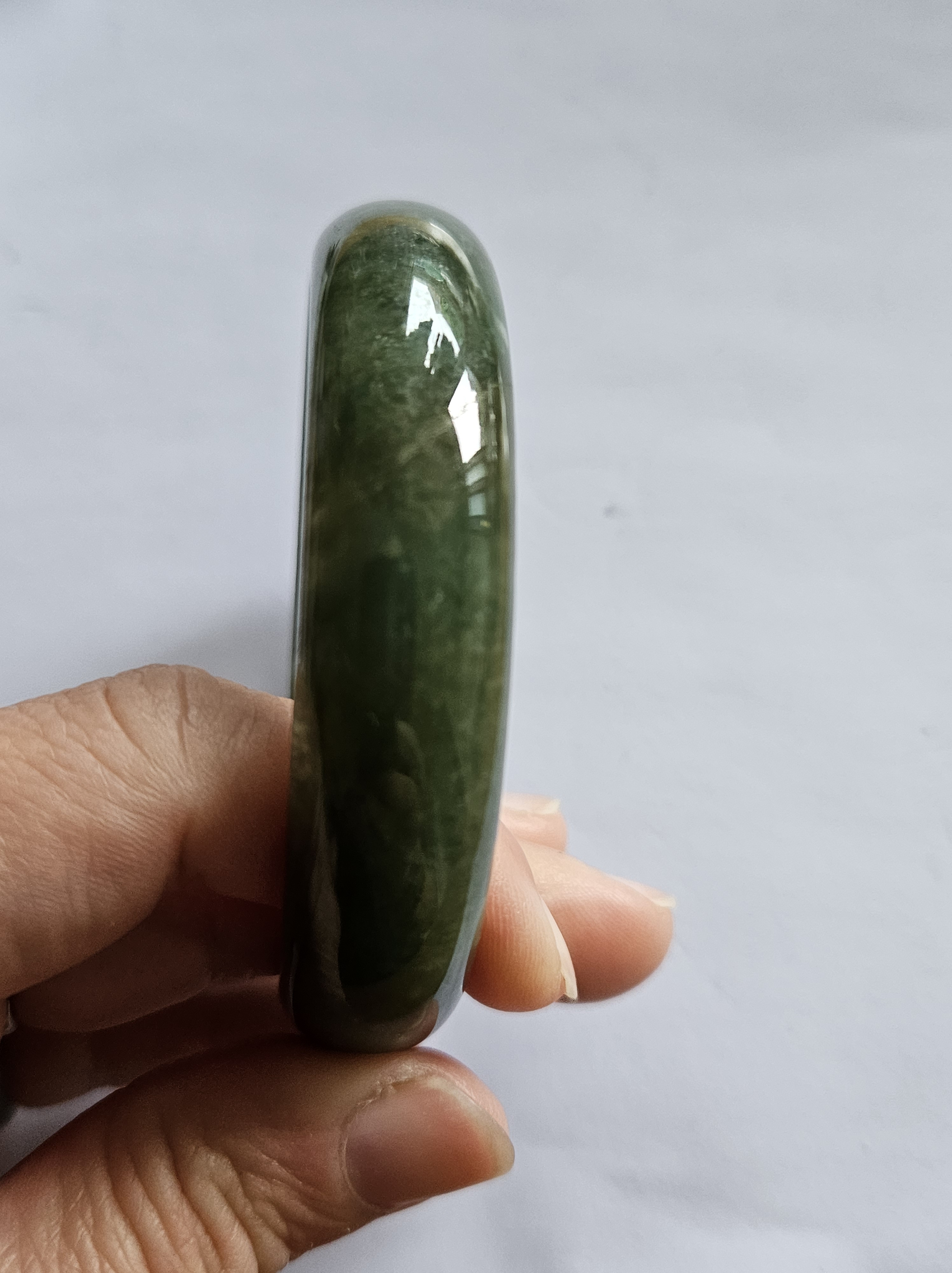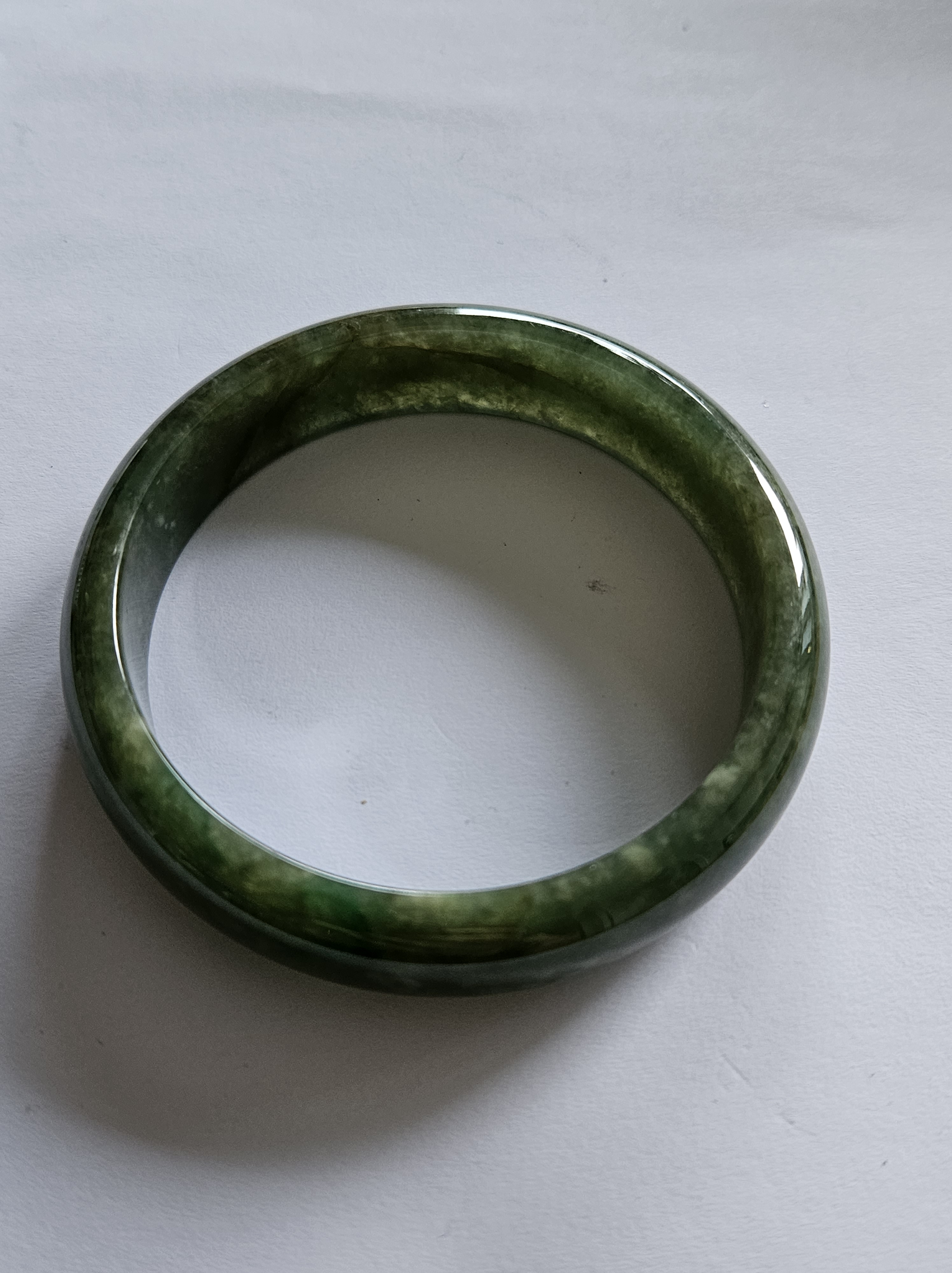 Beautiful full green Burmese jadeite bangle, has a small patch of vibrant green, consists of internal cracks and lines but does not affect usage. Measures 59.4 x 13.5 x 8mm, weighs 56.55g, comes with a certificate of authenticity £ 129