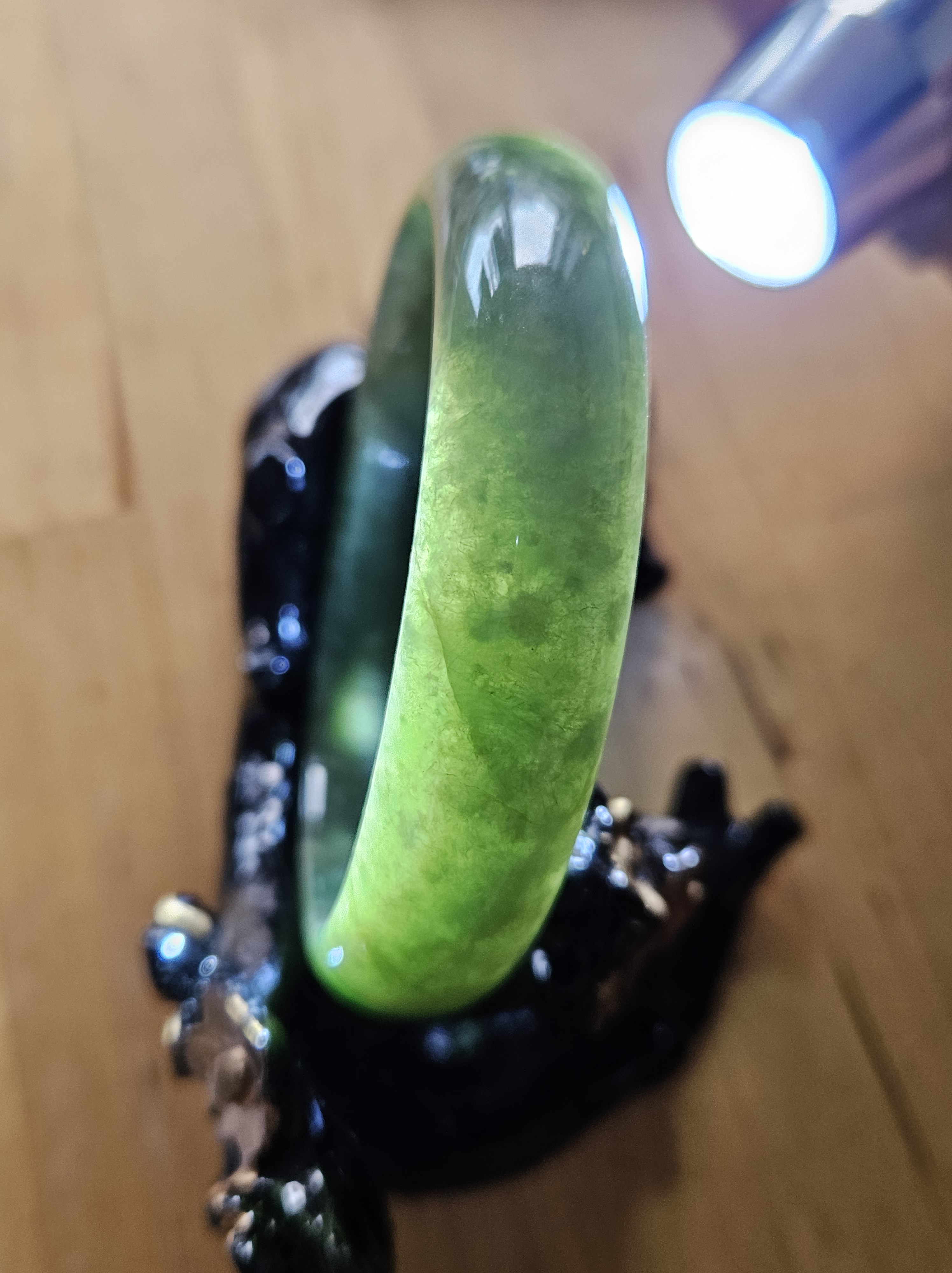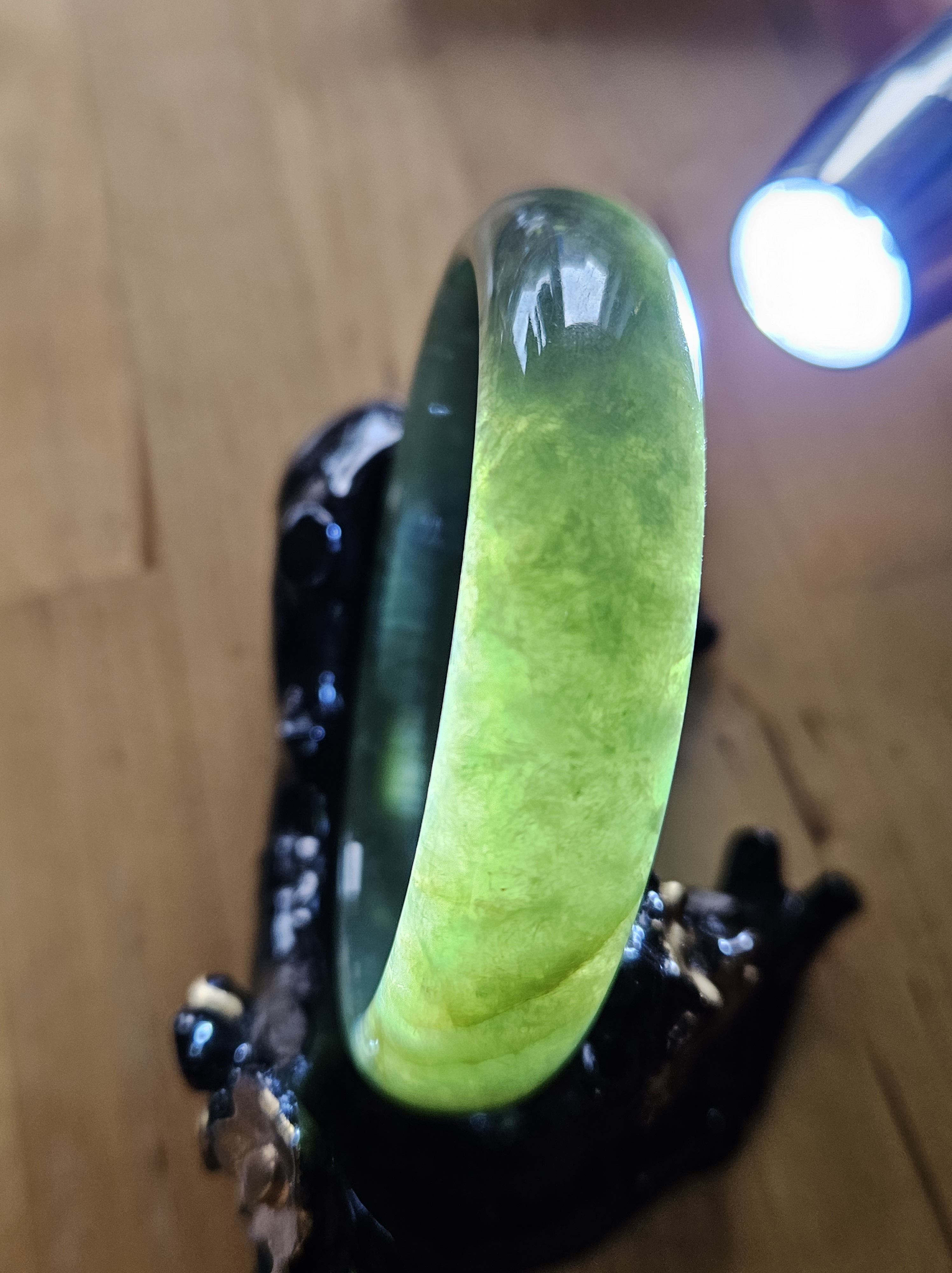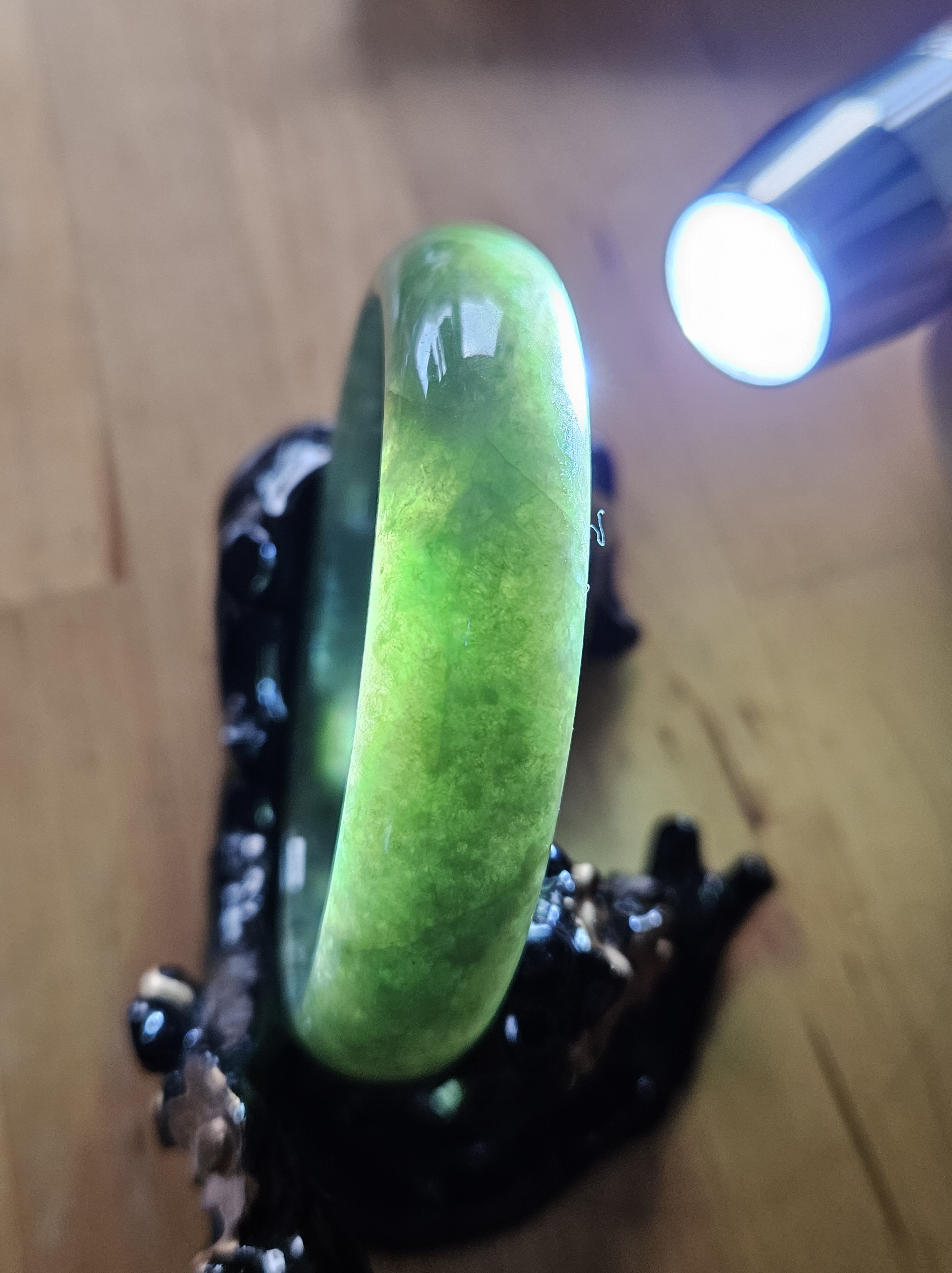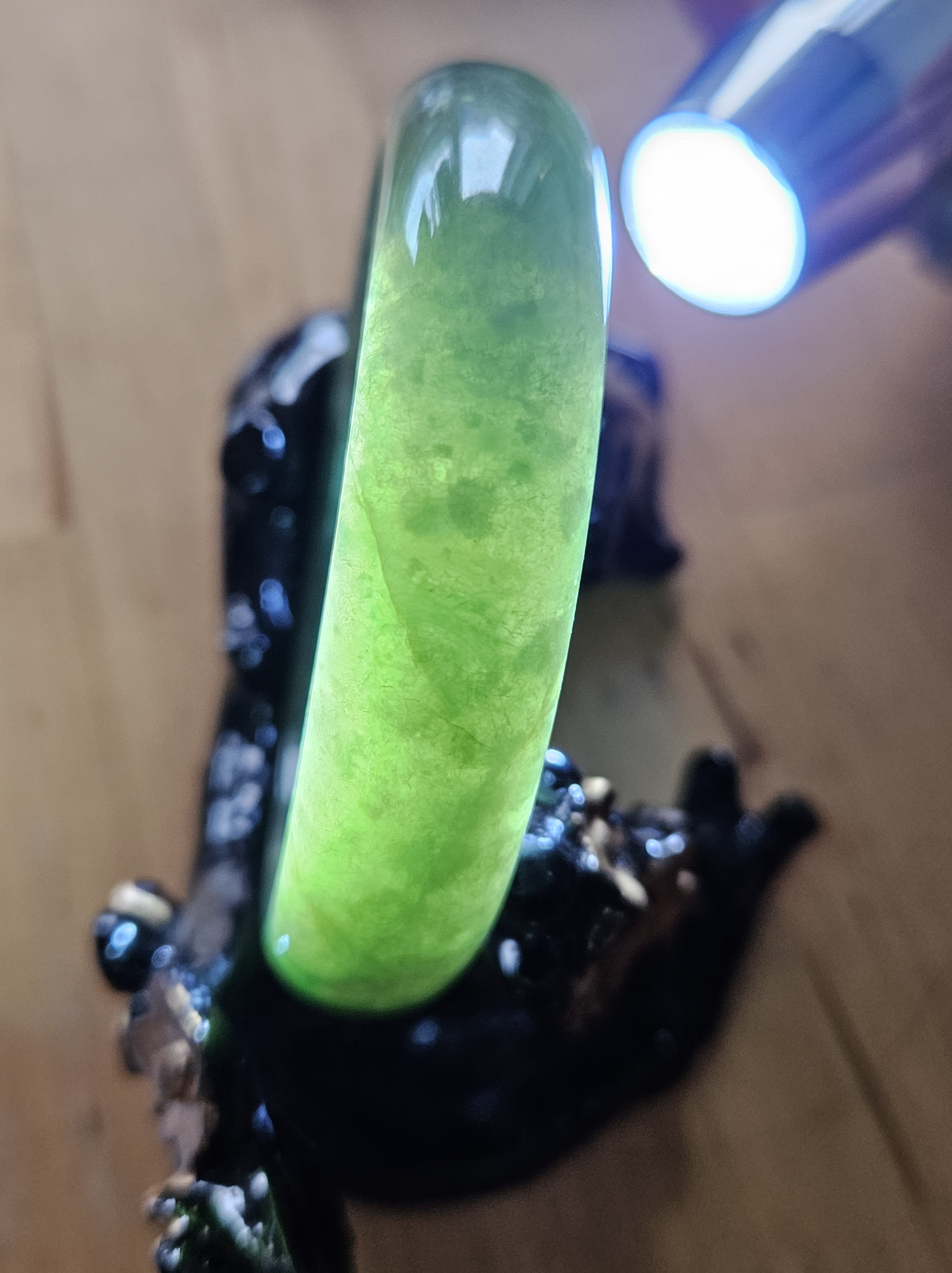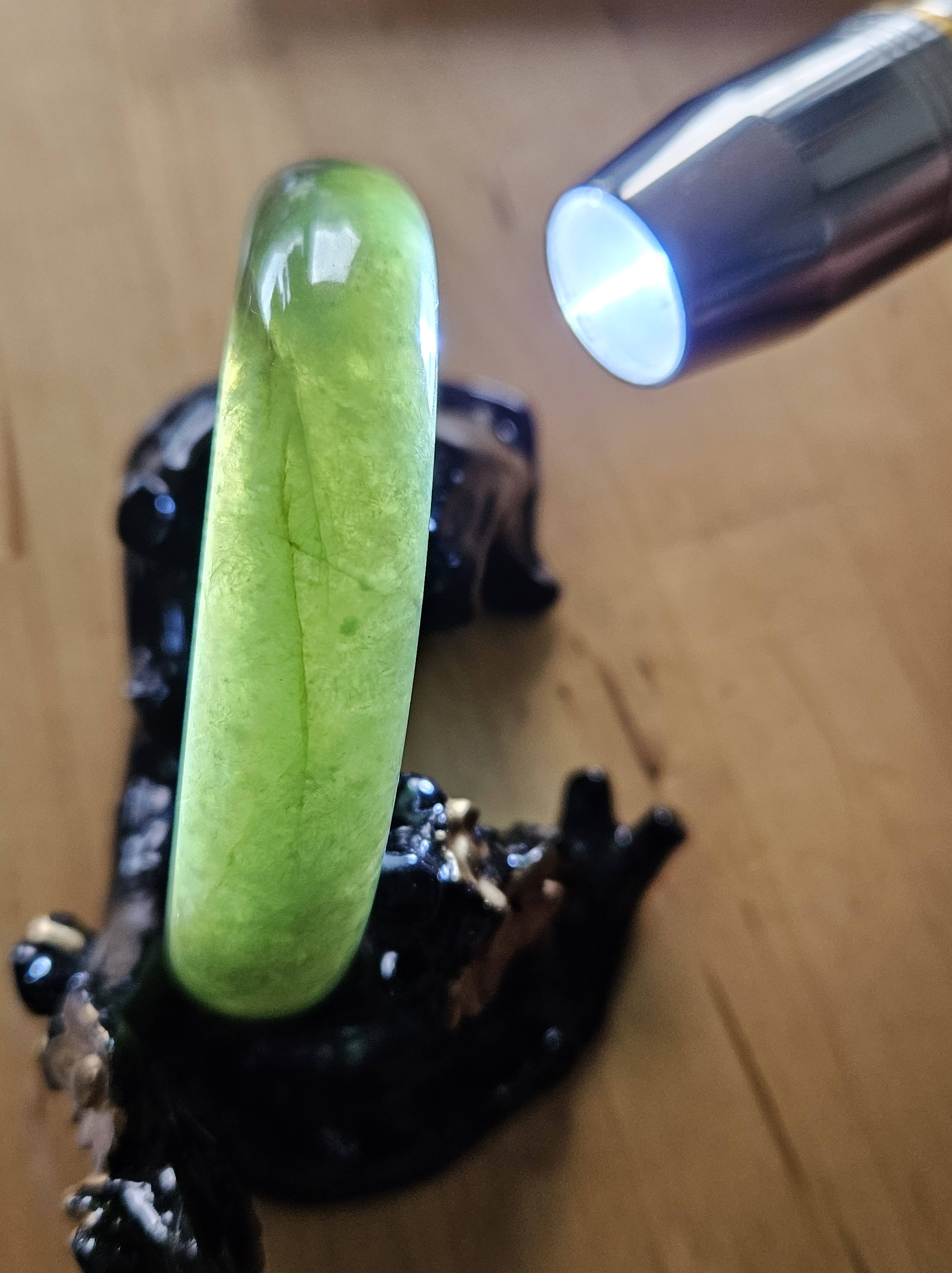 Beautiful full green Burmese jadeite bangle, has a small patch of vibrant green, consists of internal cracks and lines but does not affect usage. Measures 59.4 x 13.5 x 8mm, weighs 56.55g, comes with a certificate of authenticity £ 129