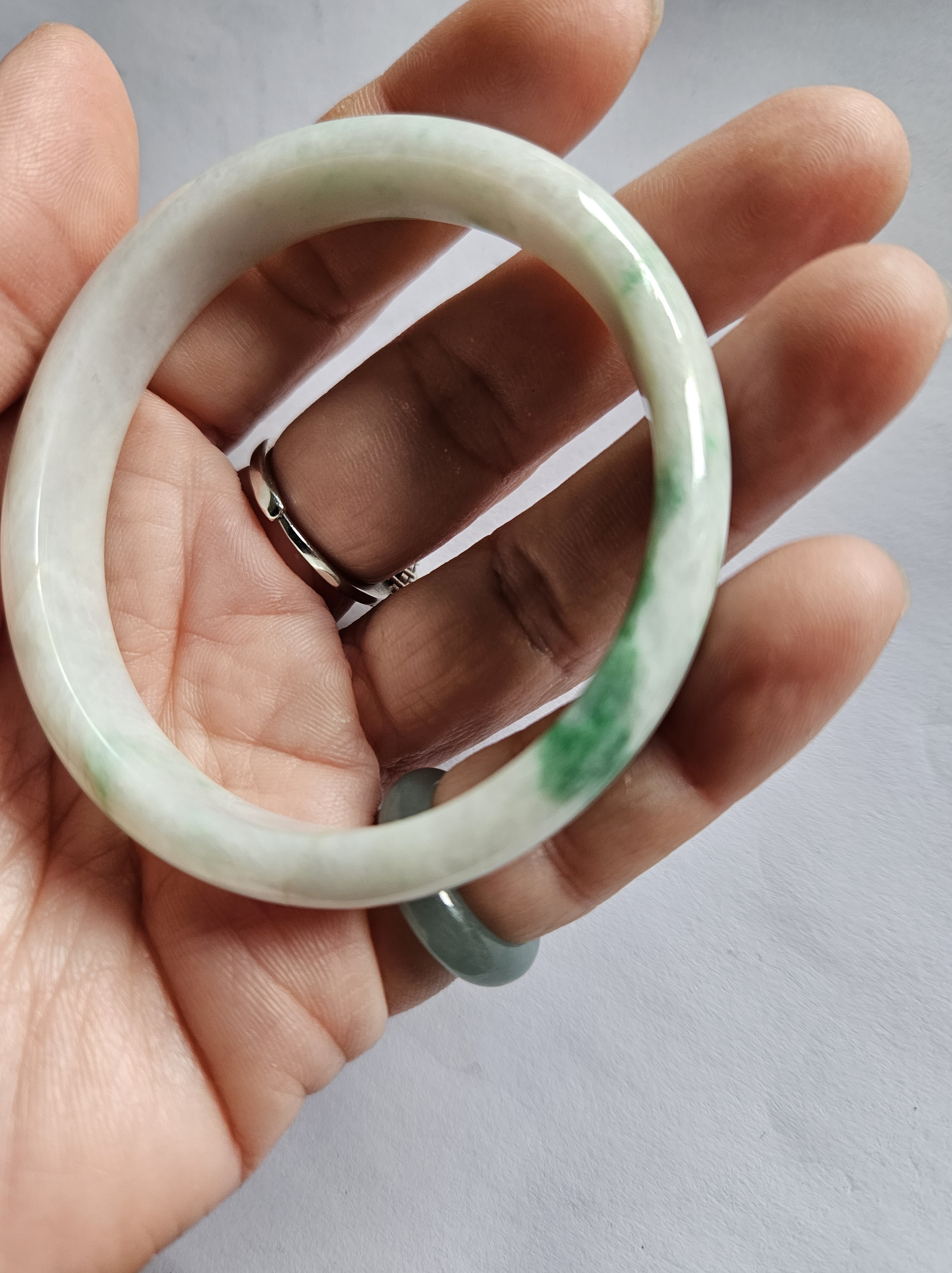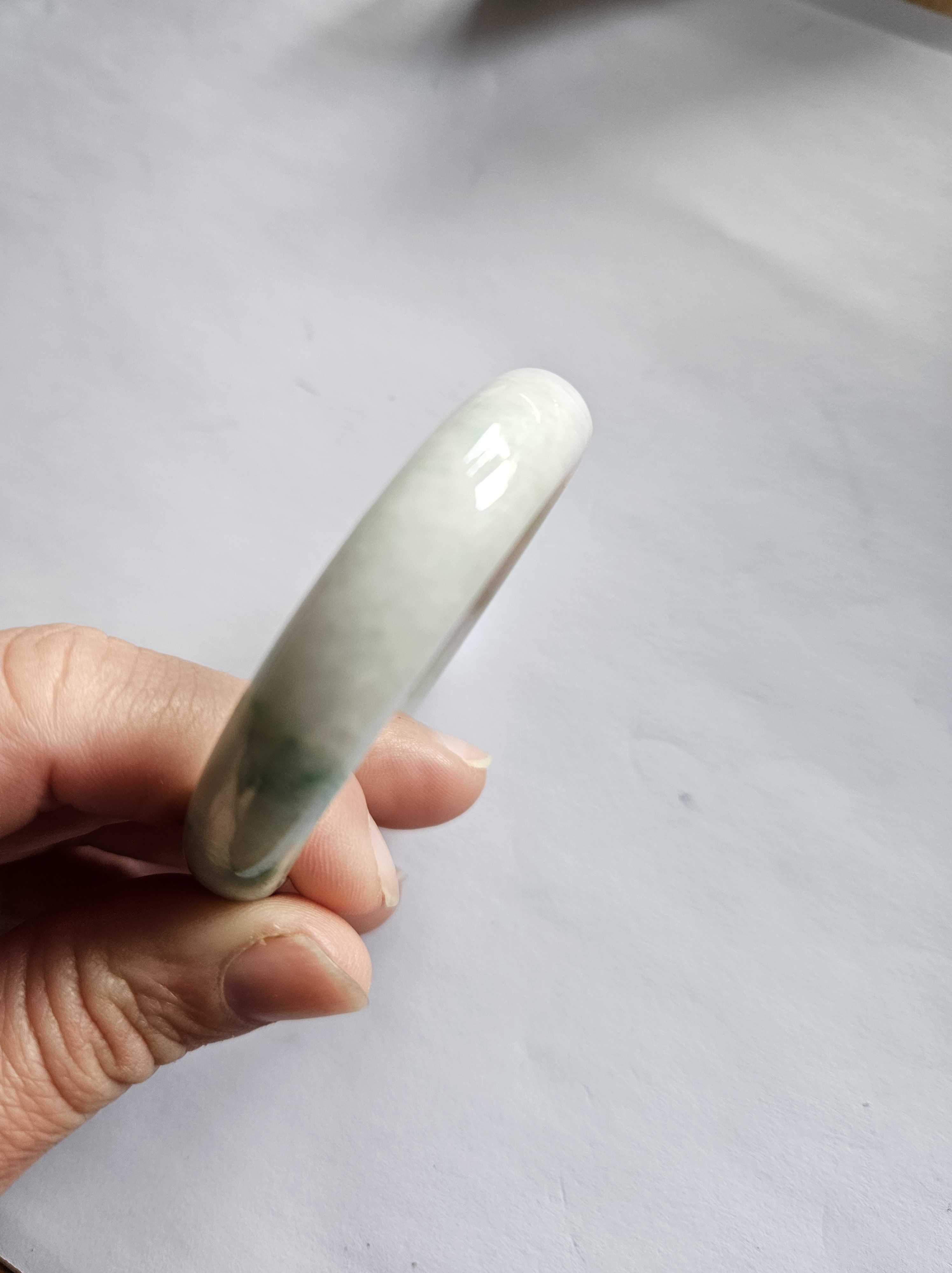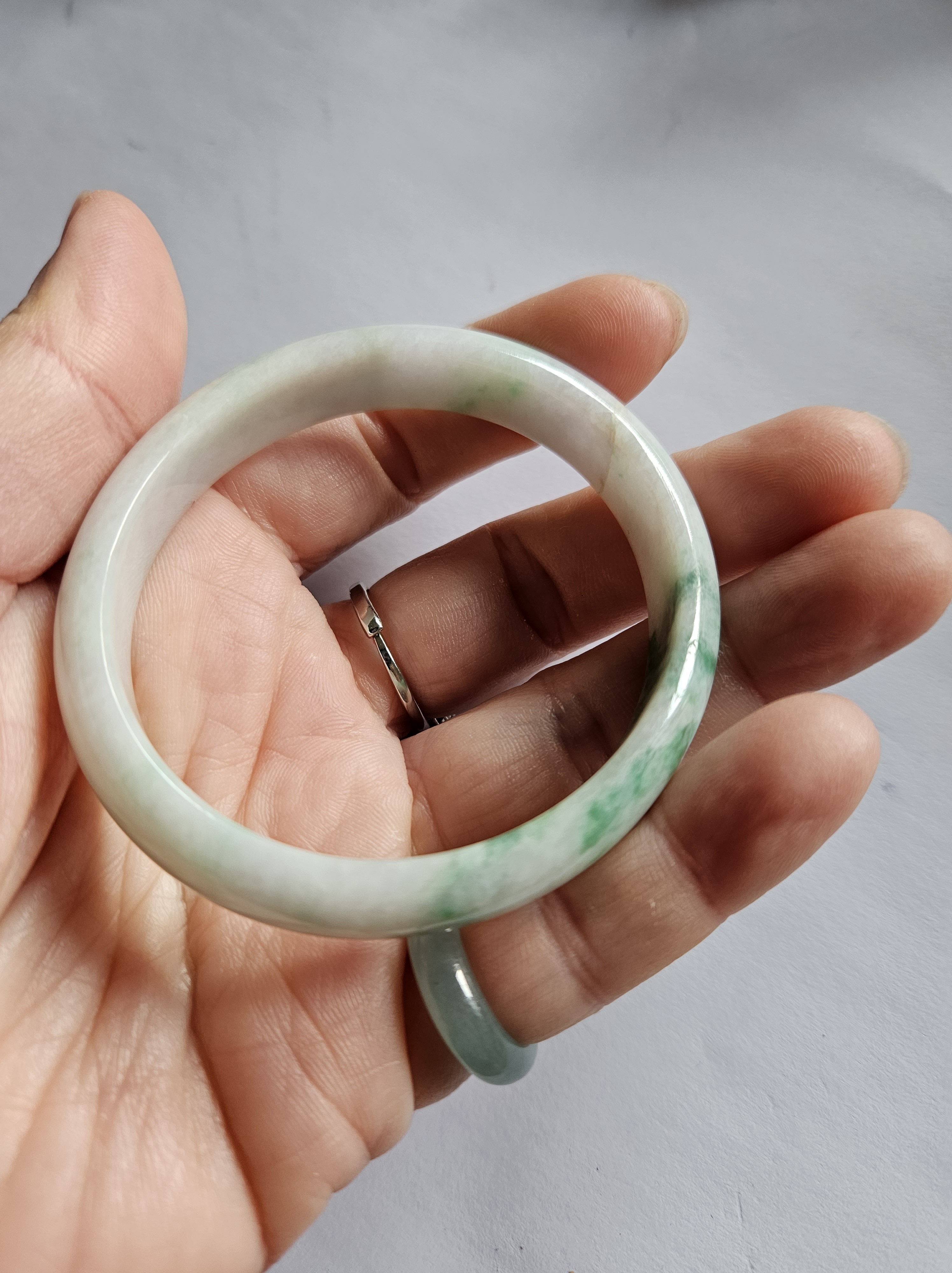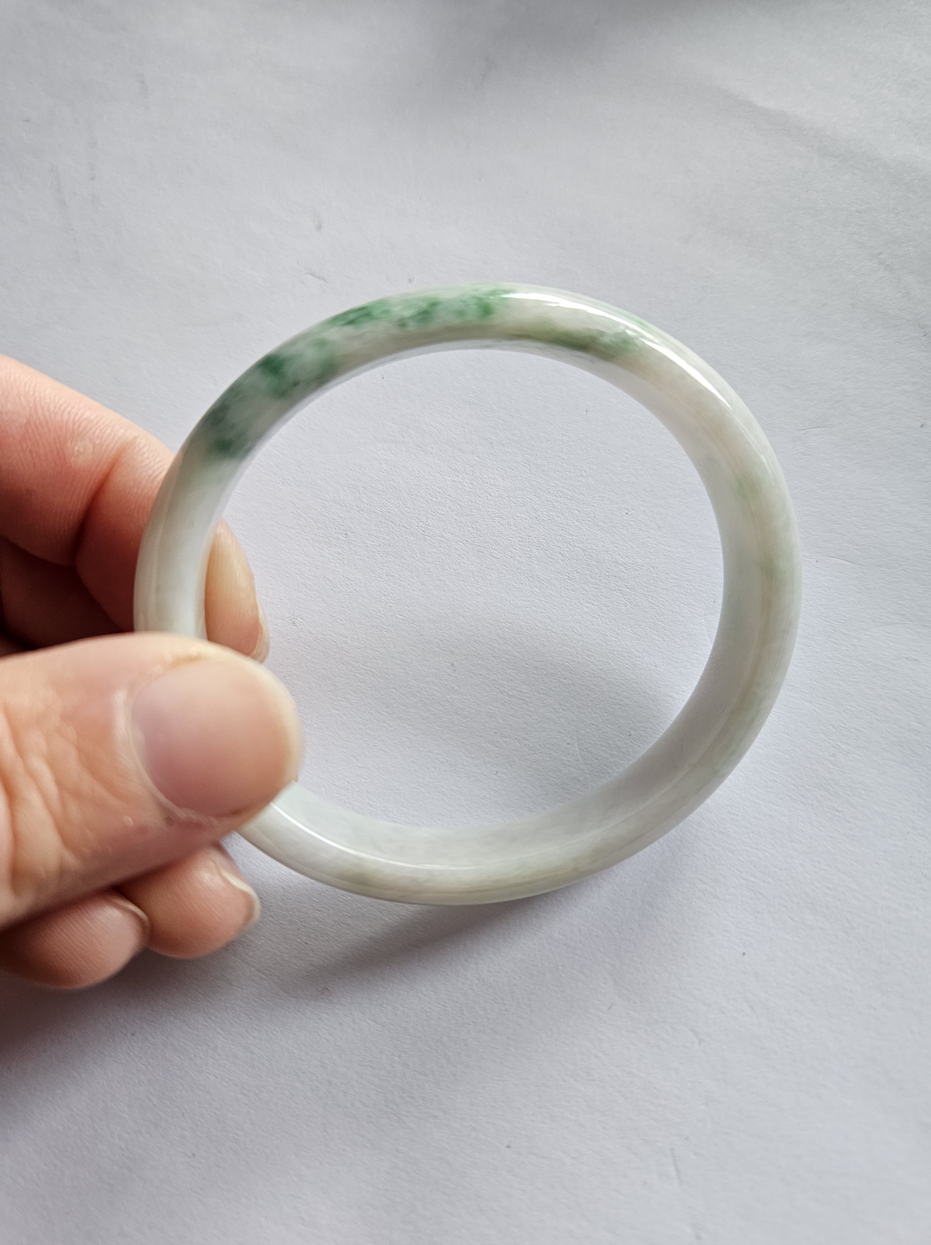 Lovely white jadeite oval shape bangle with apple green blooms measure 52.6 x 47.9 x 10.4 x 5.9mm, fits under 50mm. Comes with a certificate of authenticity £79