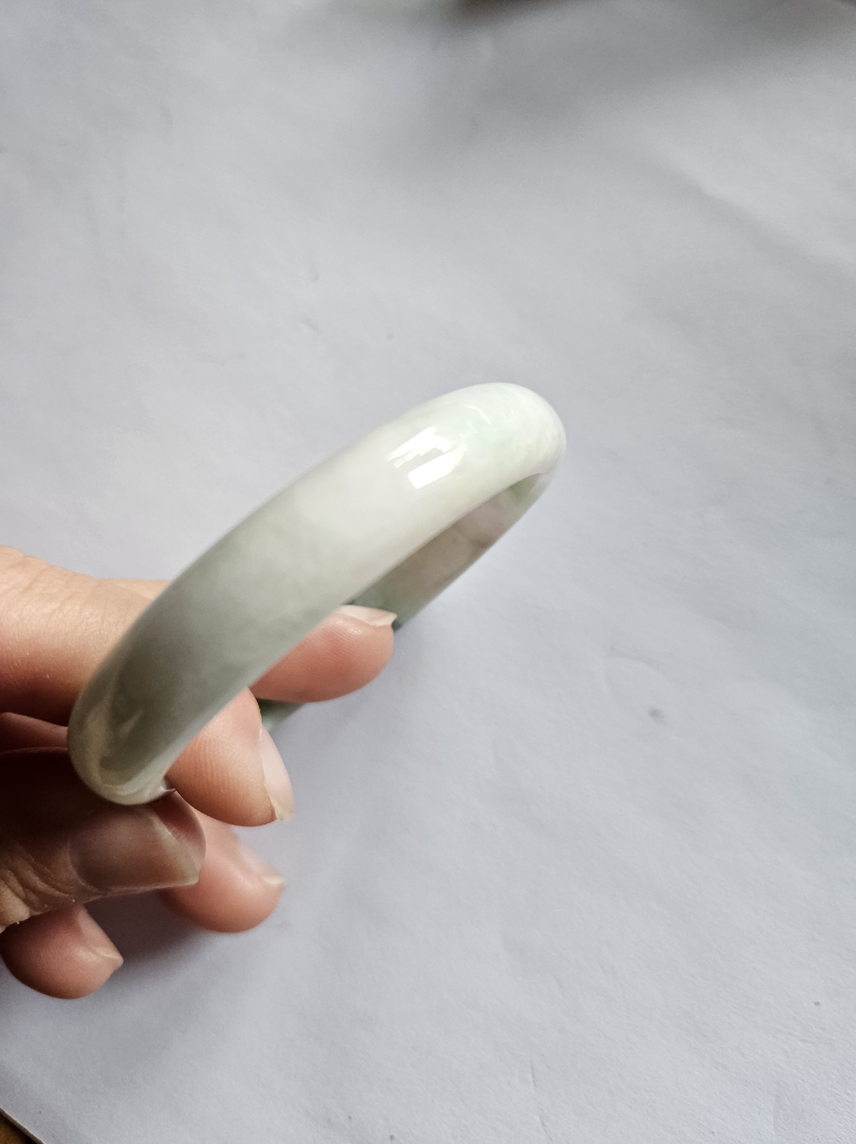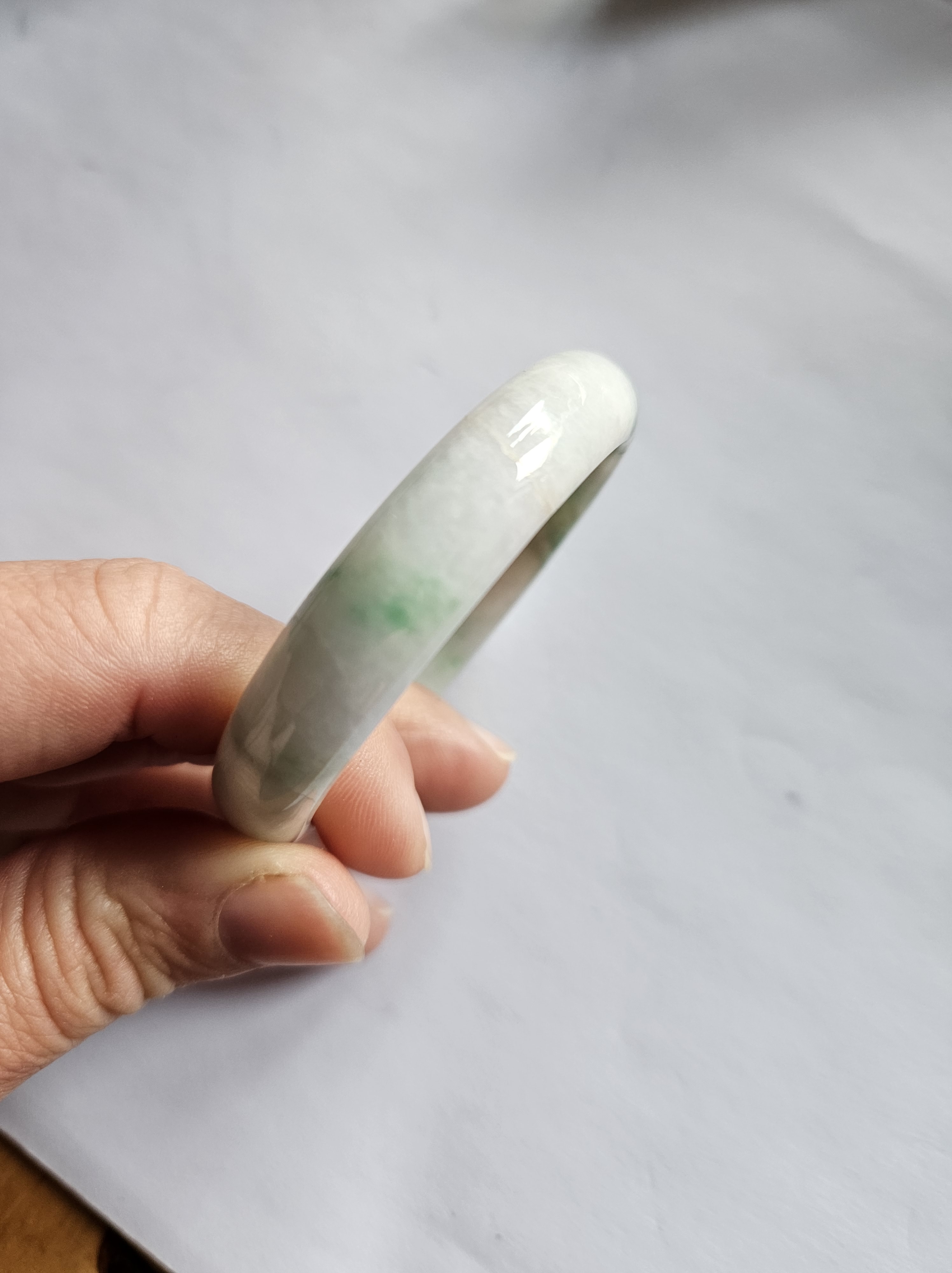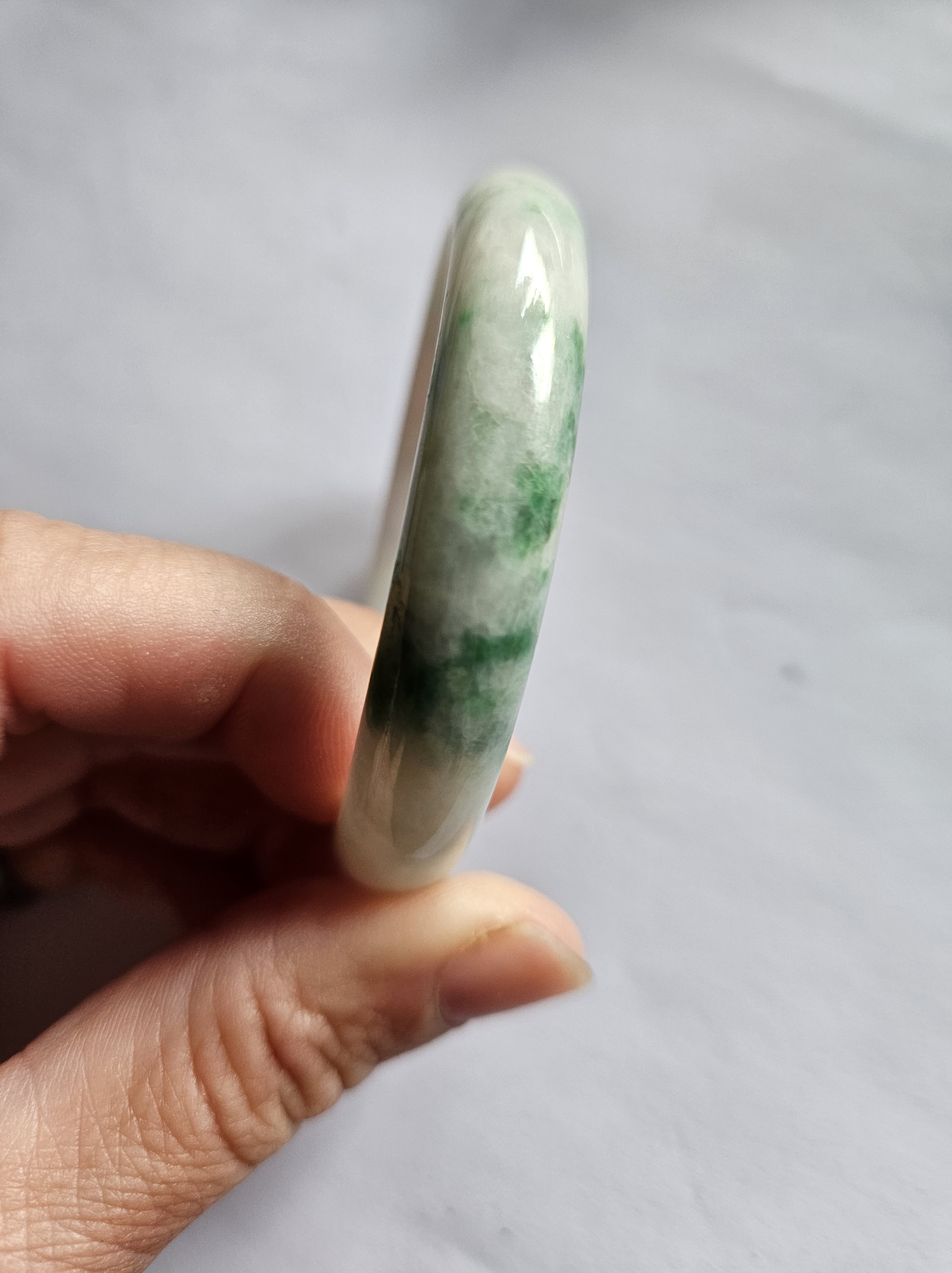 Lovely white jadeite oval shape bangle with apple green blooms measure 52.6 x 47.9 x 10.4 x 5.9mm, fits under 50mm. Comes with a certificate of authenticity £79