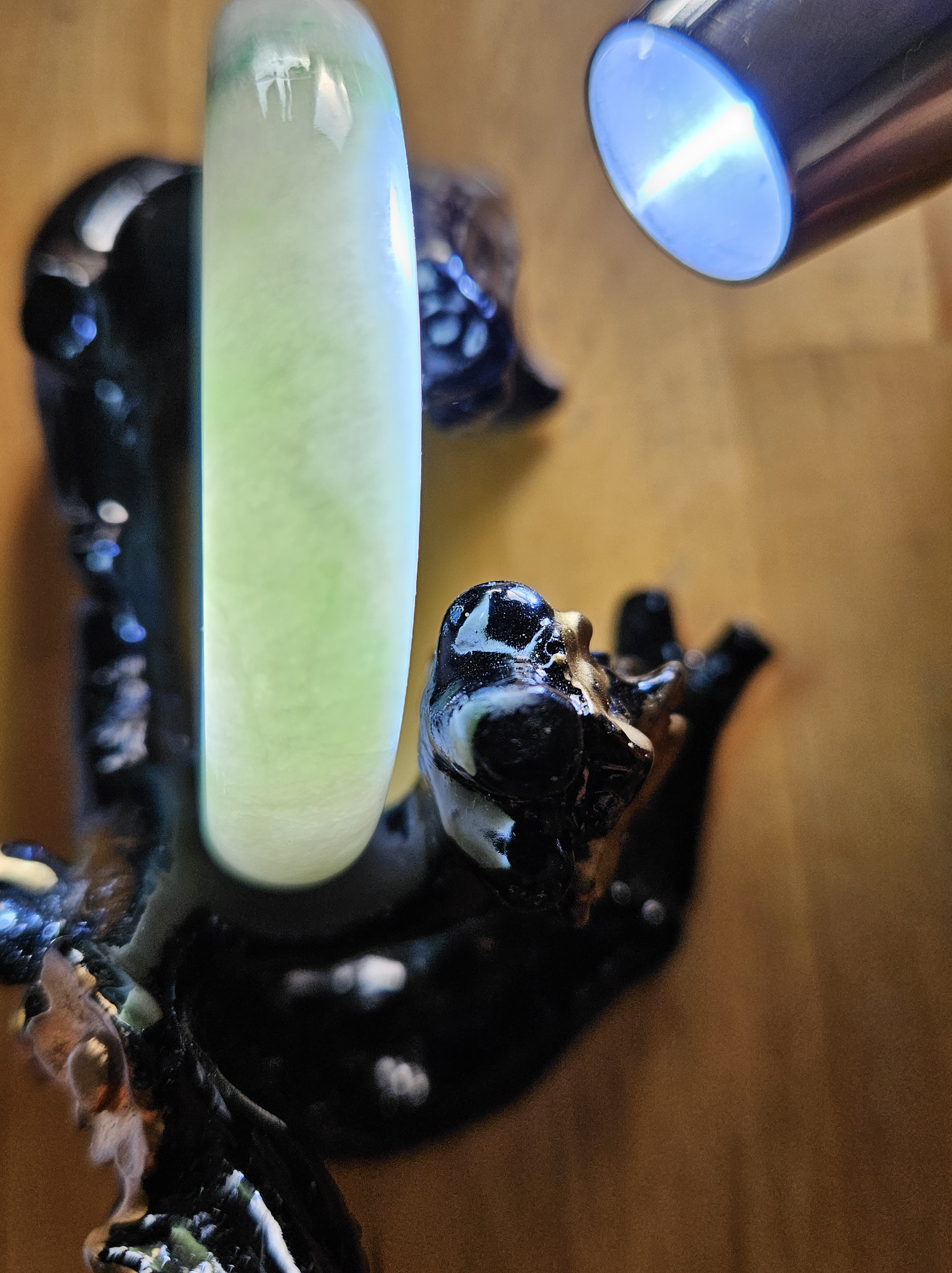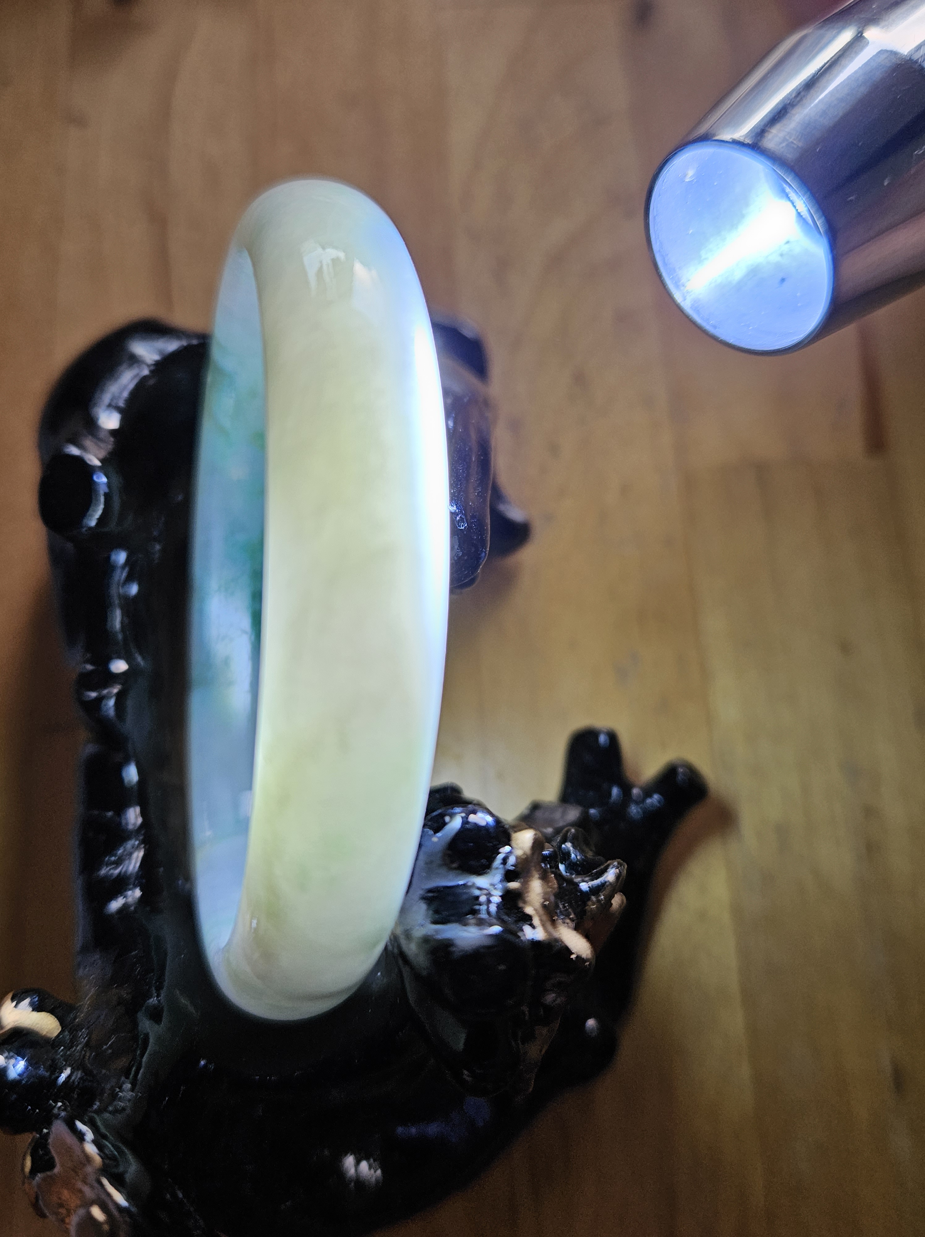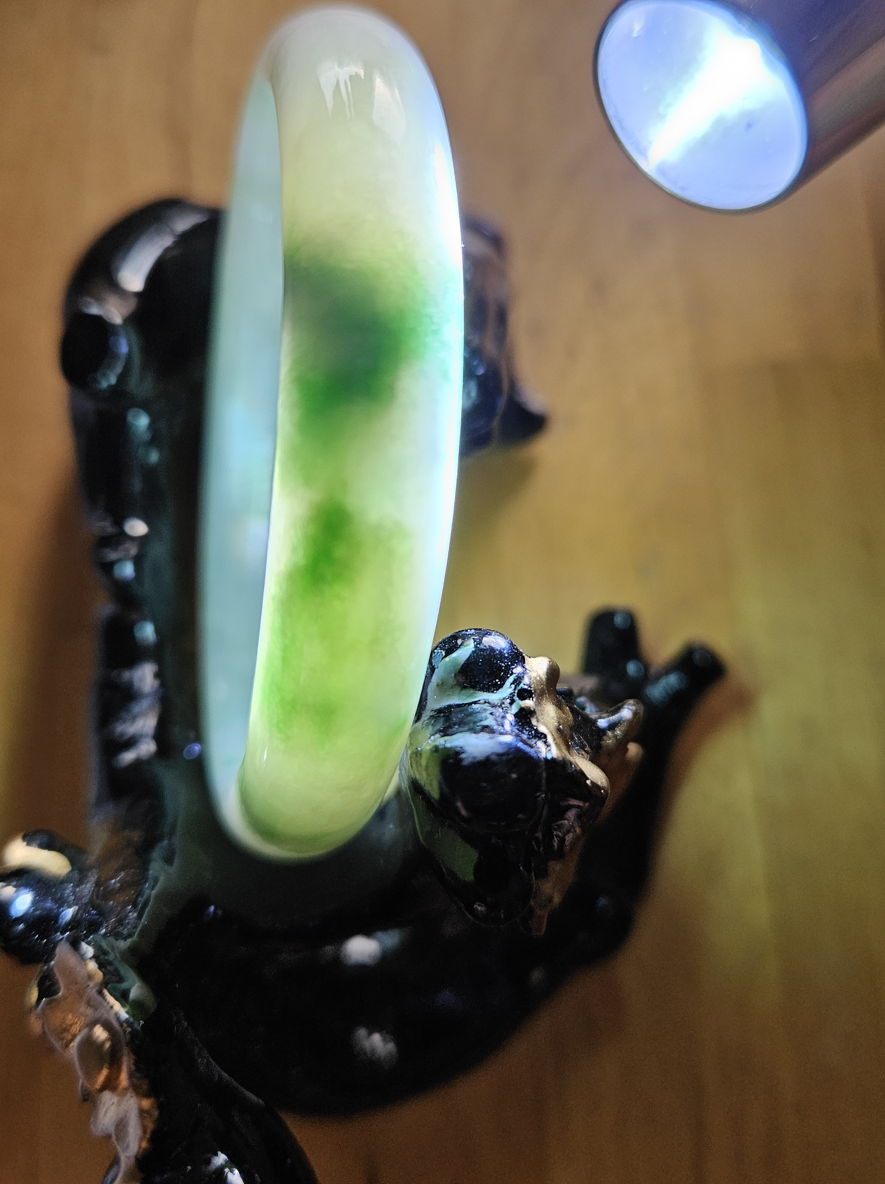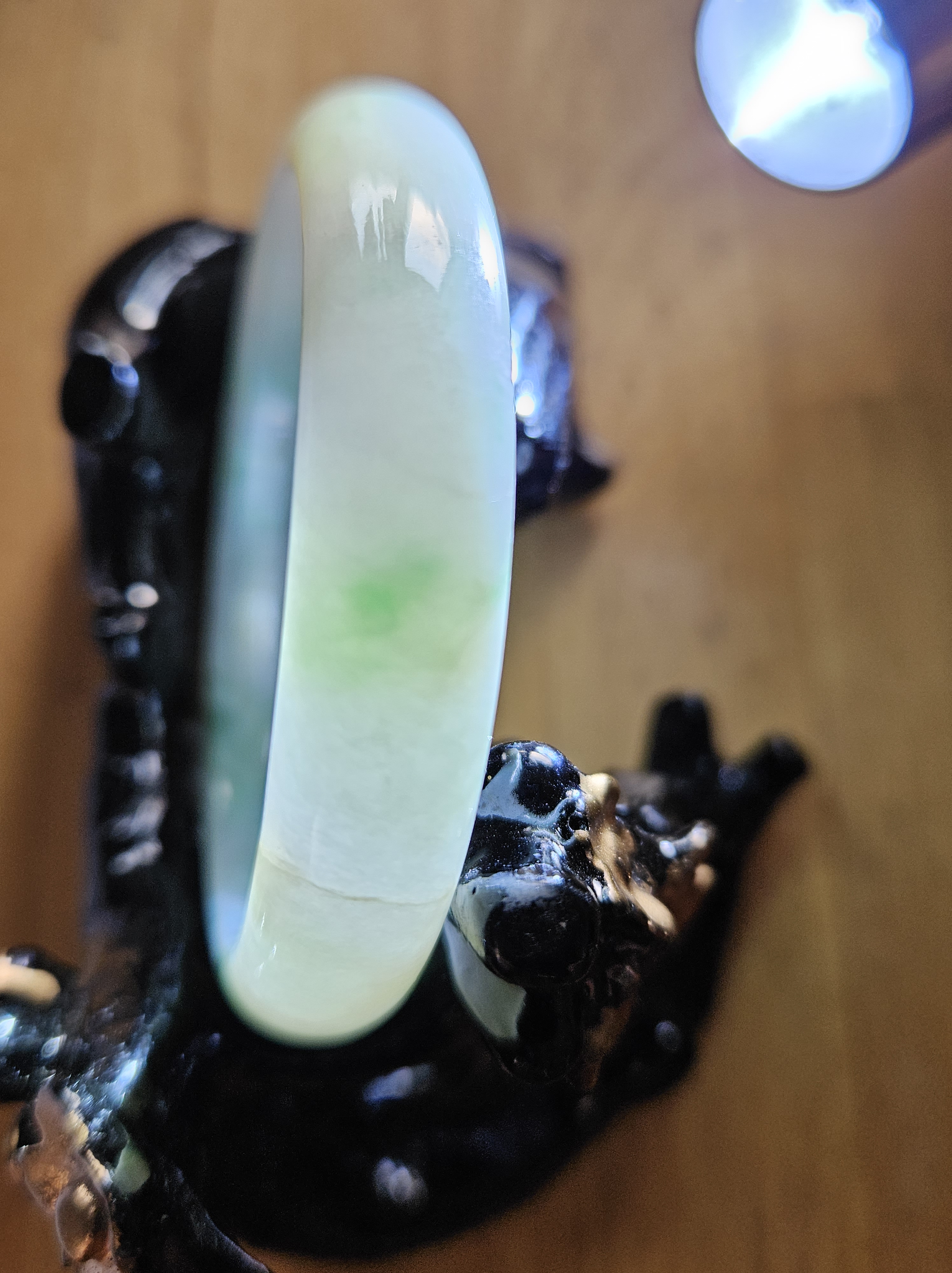 Lovely white jadeite oval shape bangle with apple green blooms measure 52.6 x 47.9 x 10.4 x 5.9mm, fits under 50mm. Comes with a certificate of authenticity £79