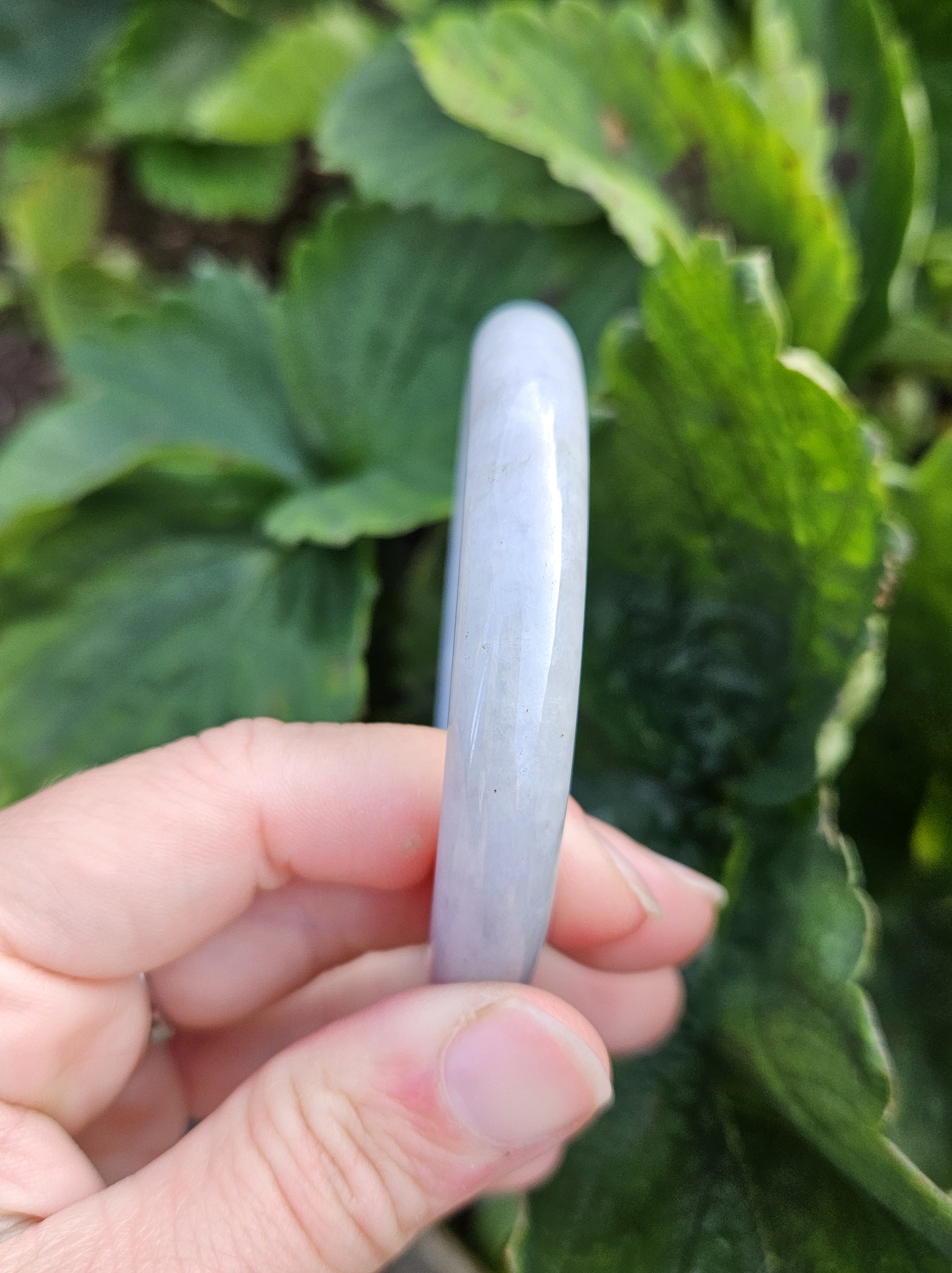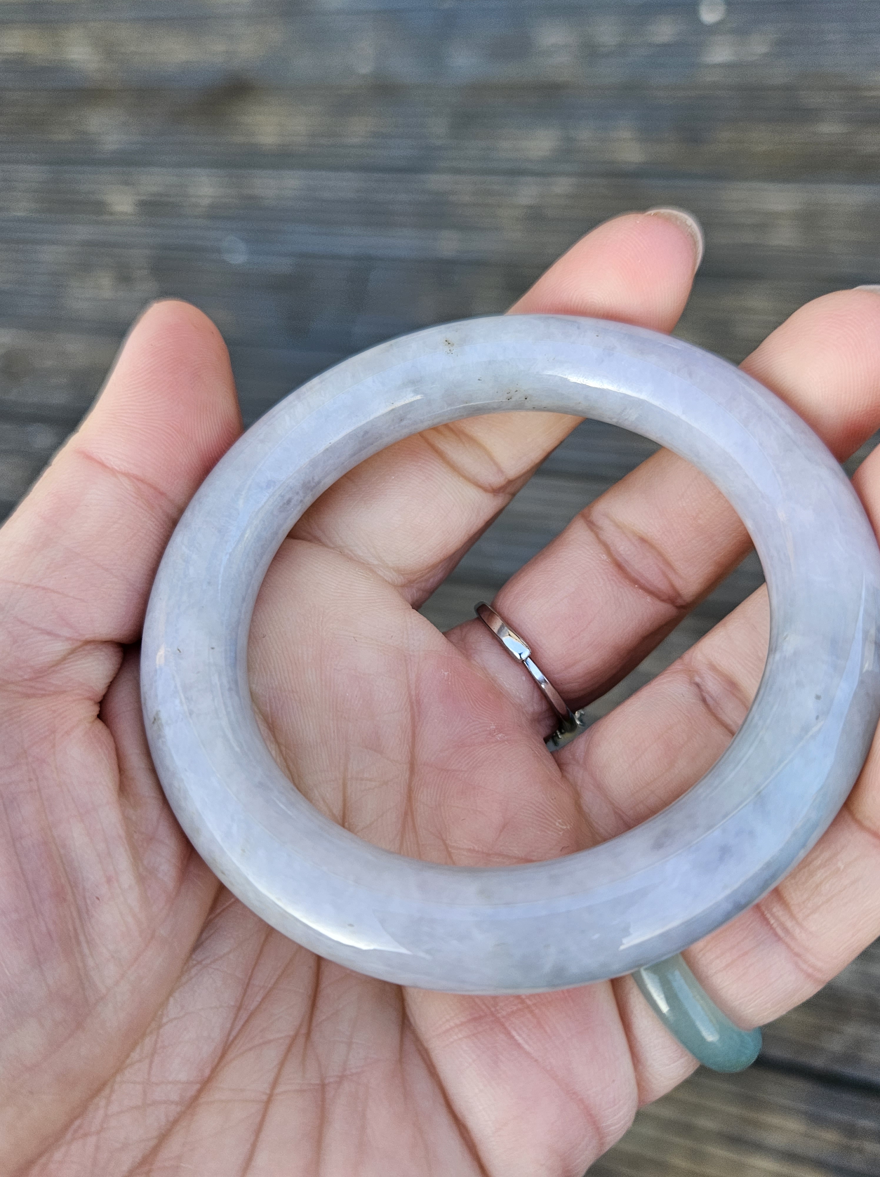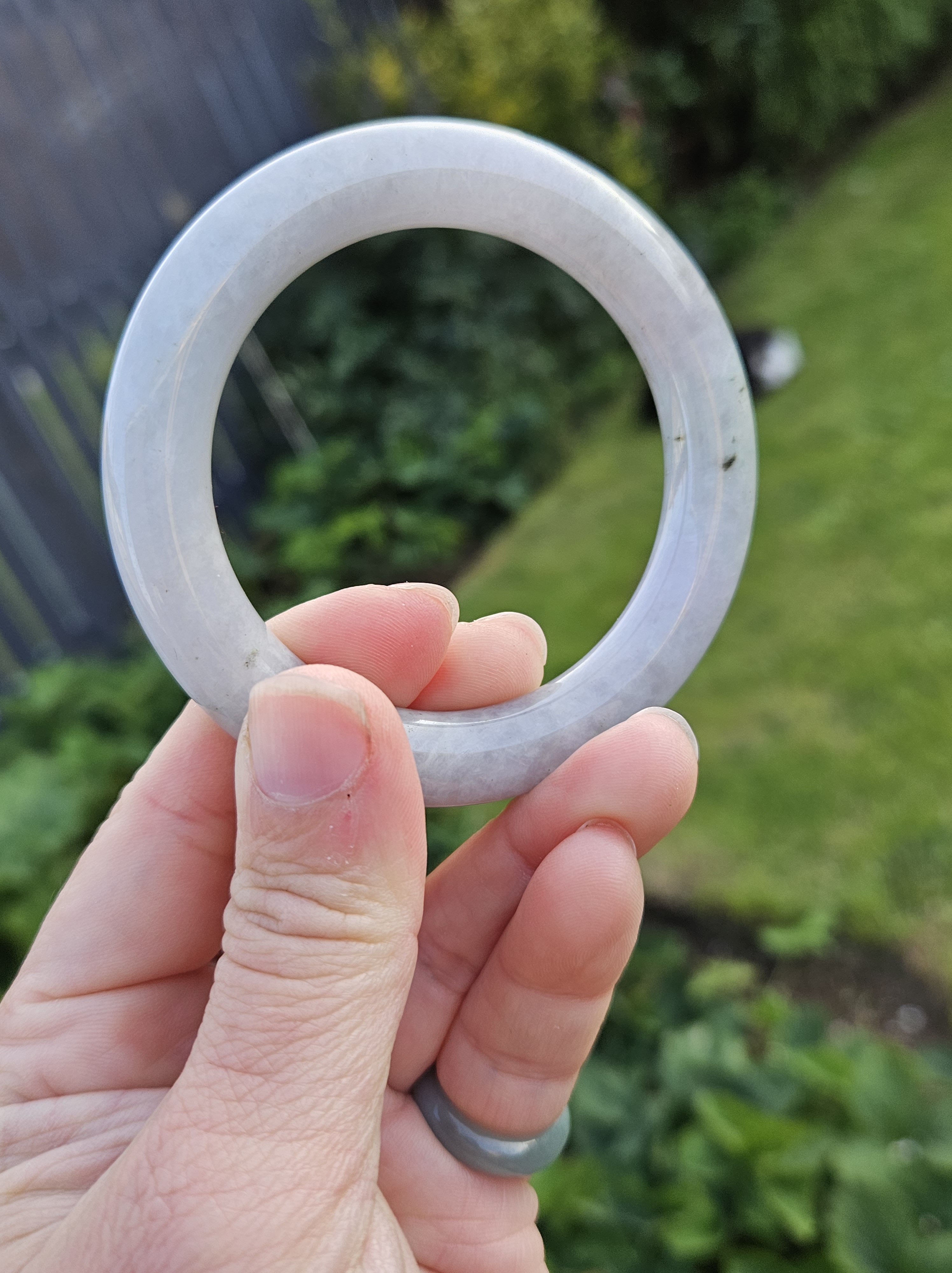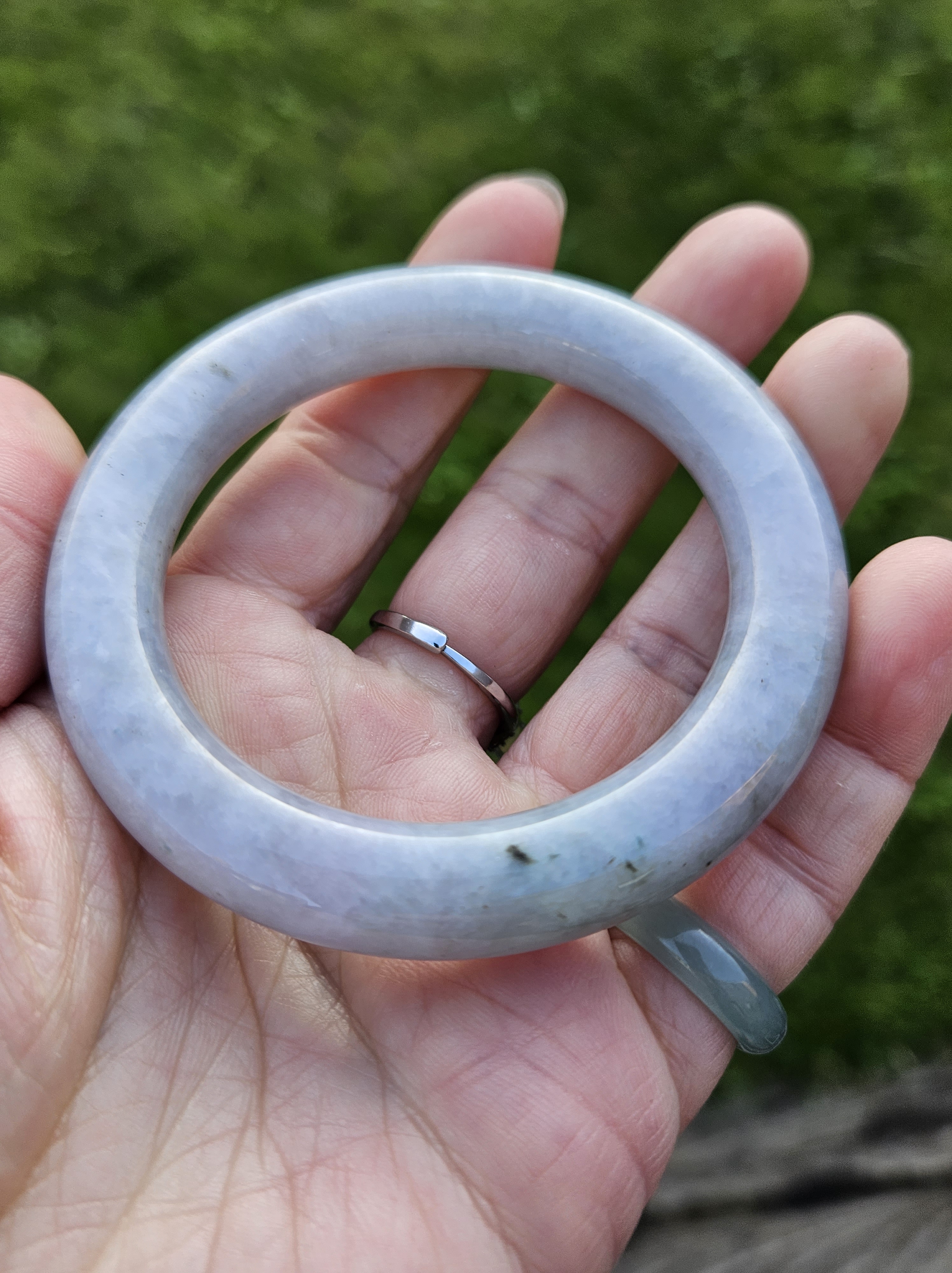 Lovely light green and purple jadeite bangle with smoky grey sprinkles fits up to 55mm, measures 53 x 9.5 10 5 x 11.4, weighs 60.61g , comes with a certificate of authenticity £228