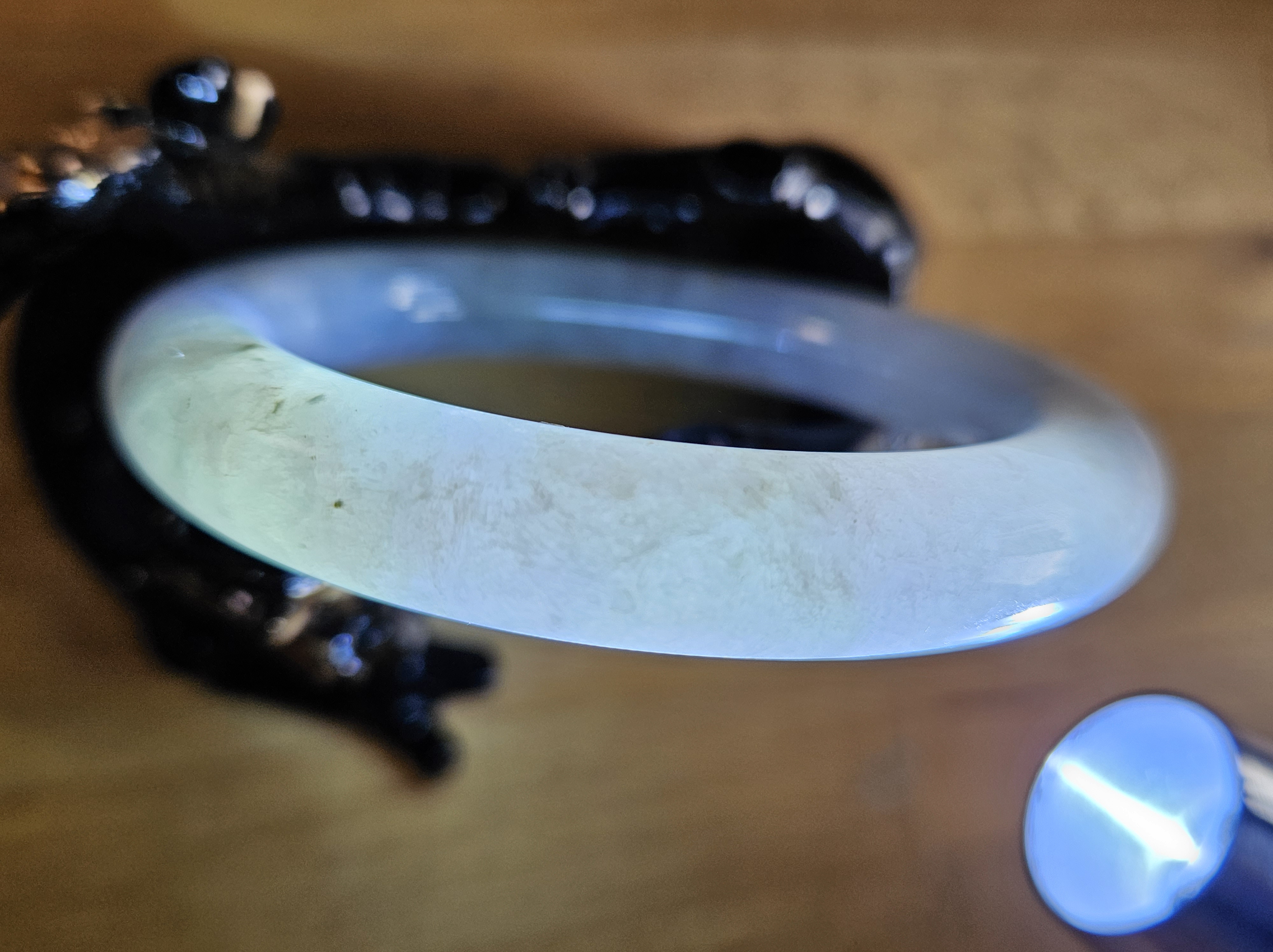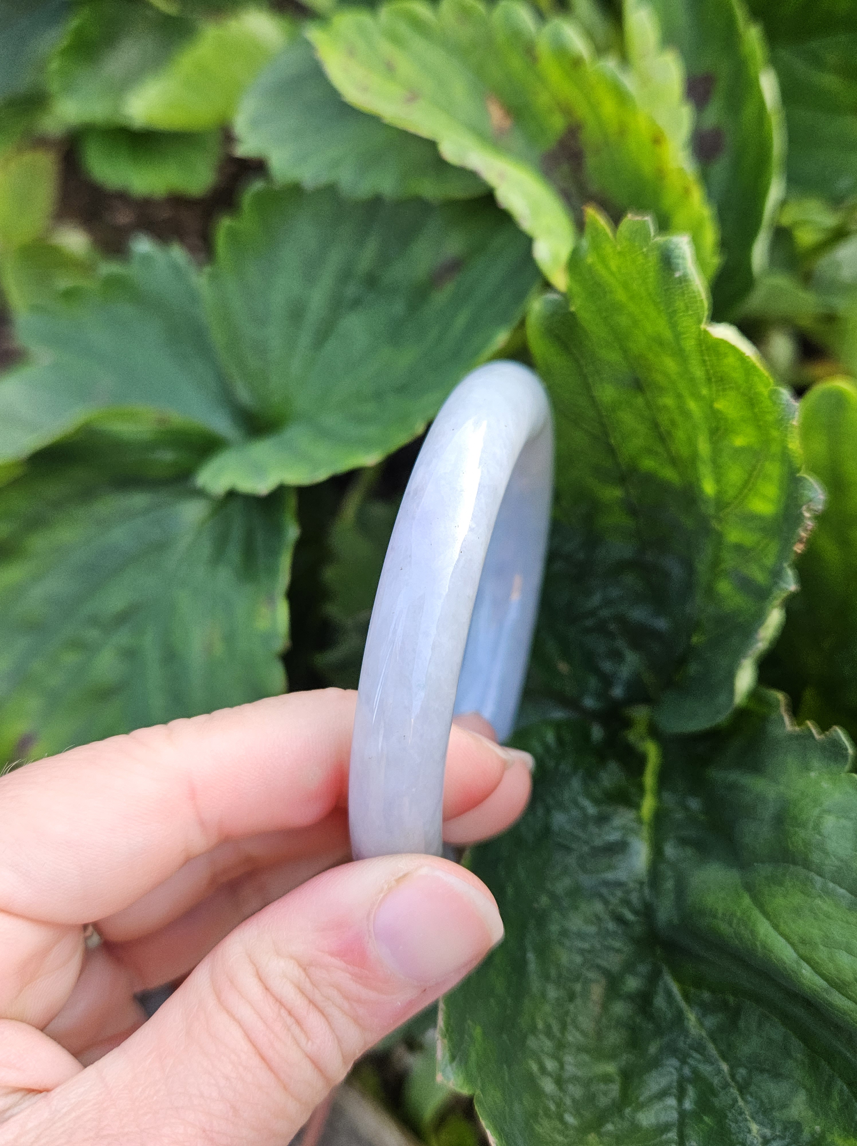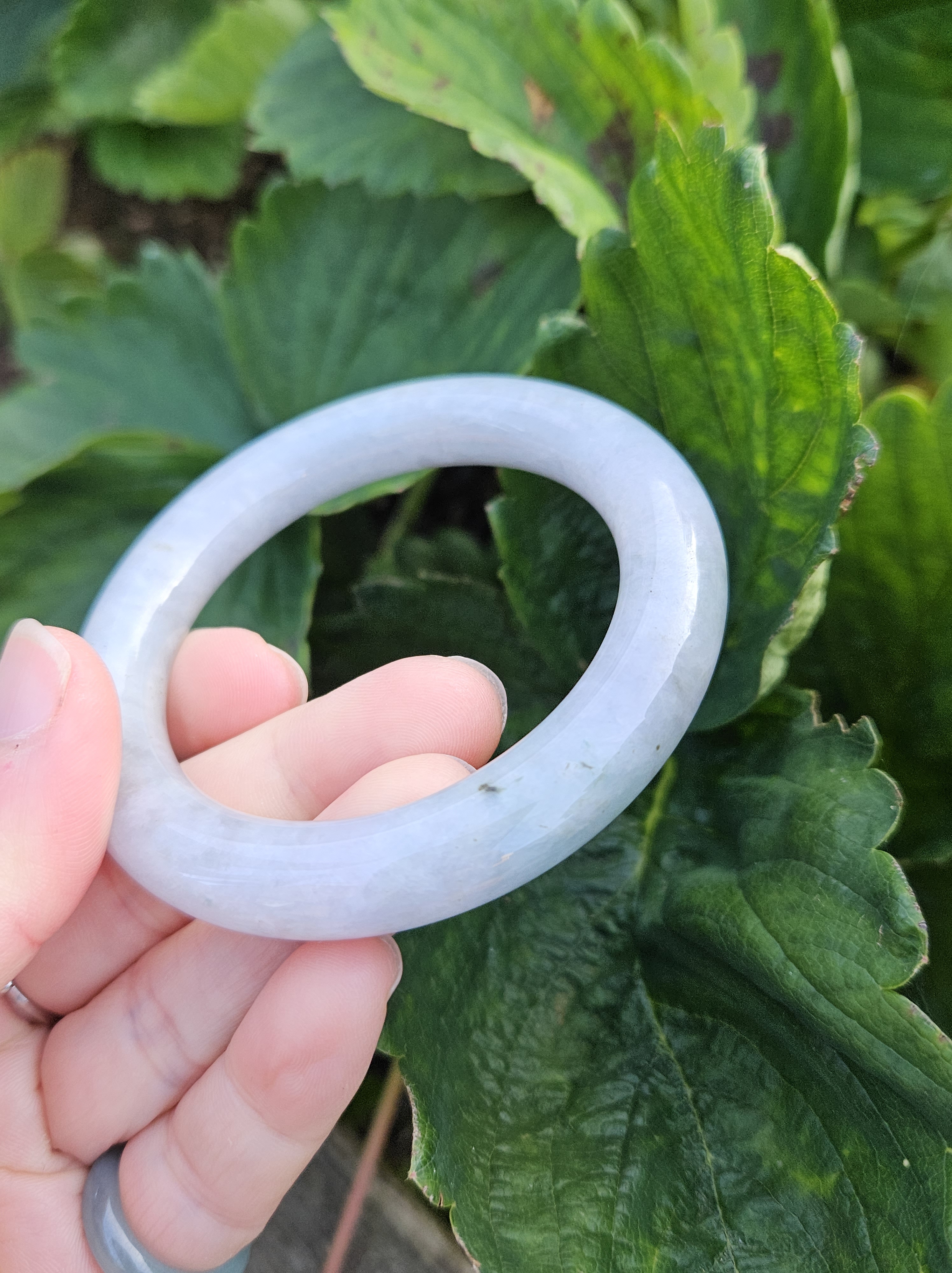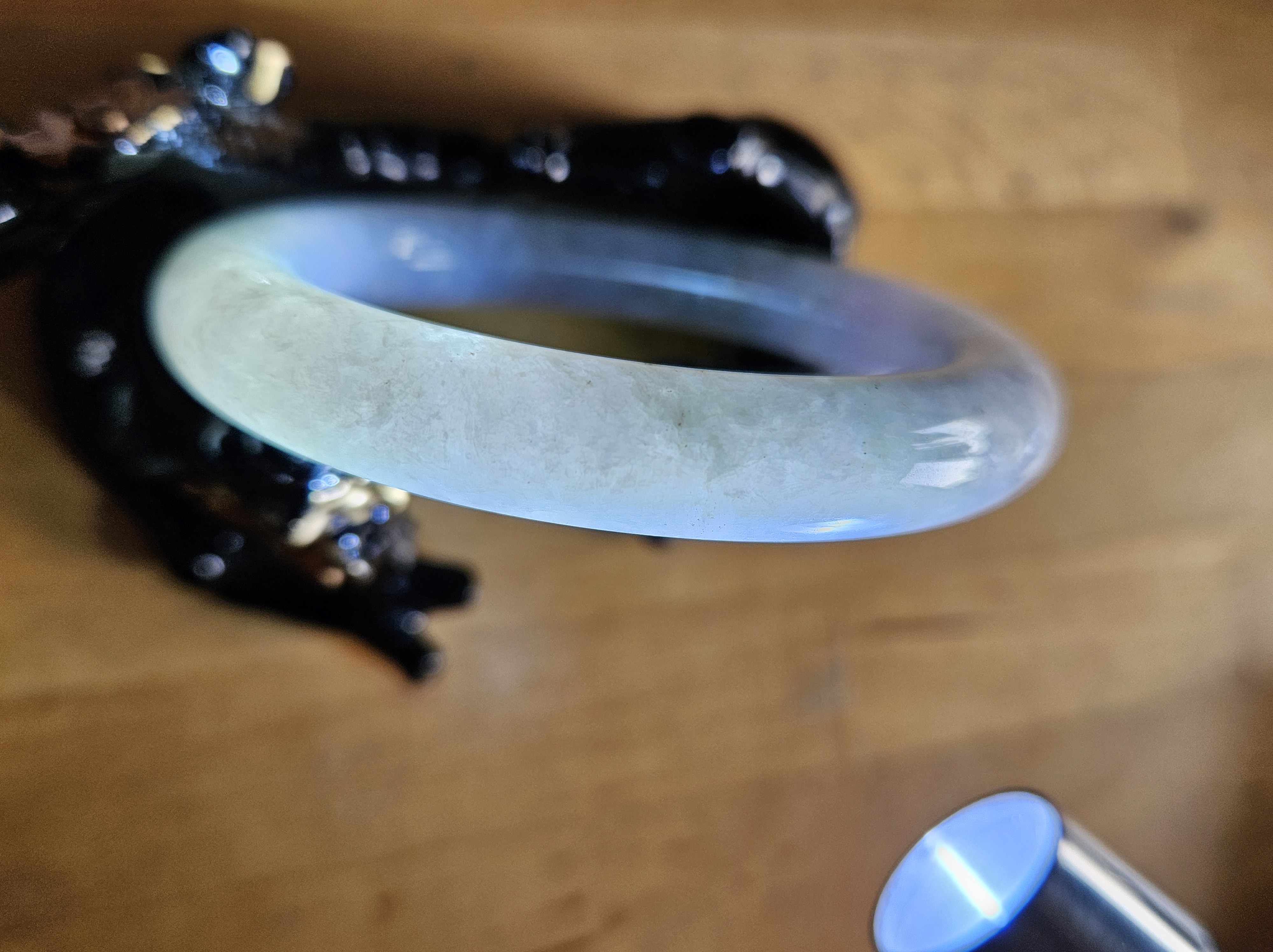 Lovely light green and purple jadeite bangle with smoky grey sprinkles fits up to 55mm, measures 53 x 9.5 10 5 x 11.4, weighs 60.61g , comes with a certificate of authenticity £228