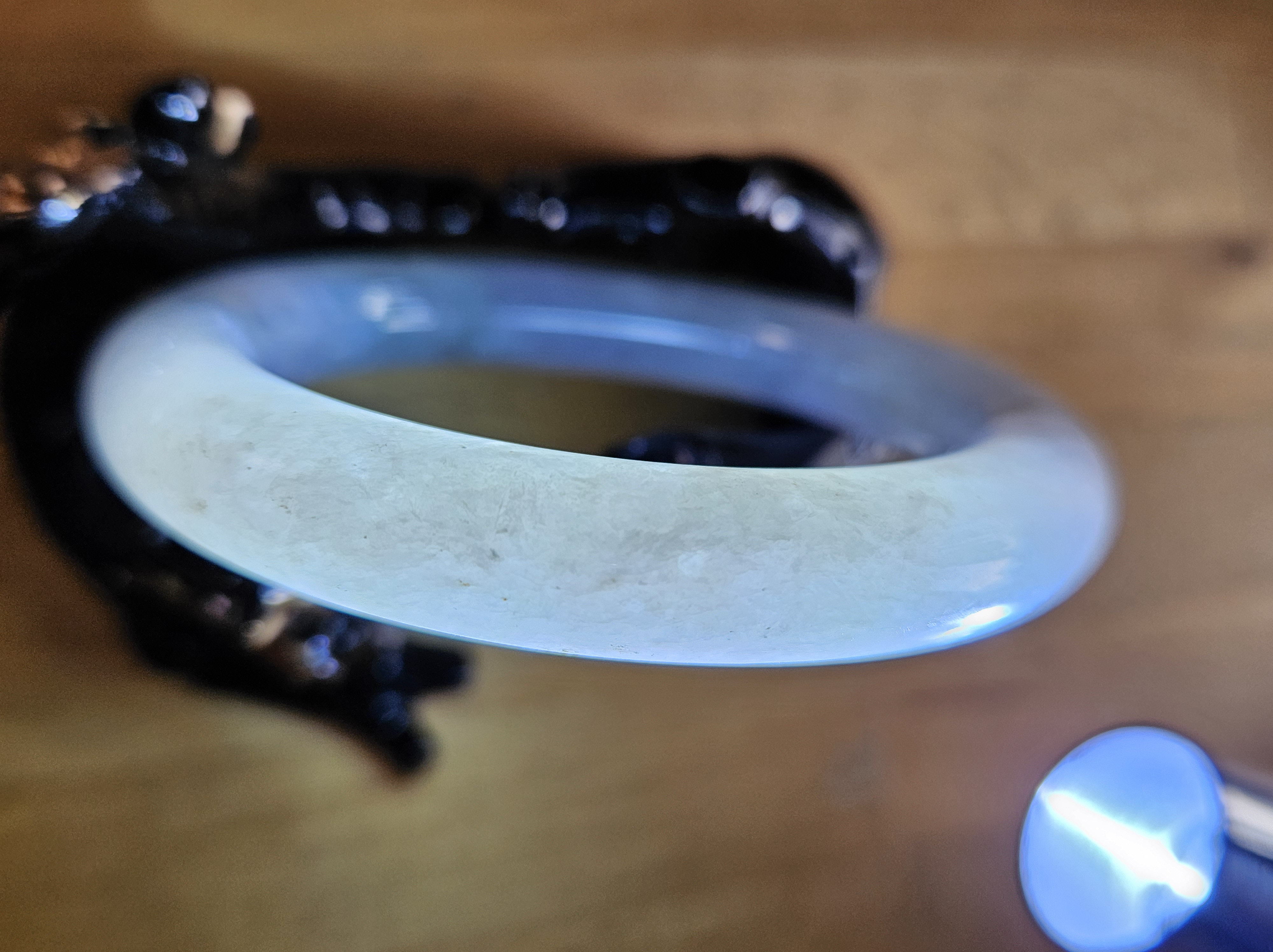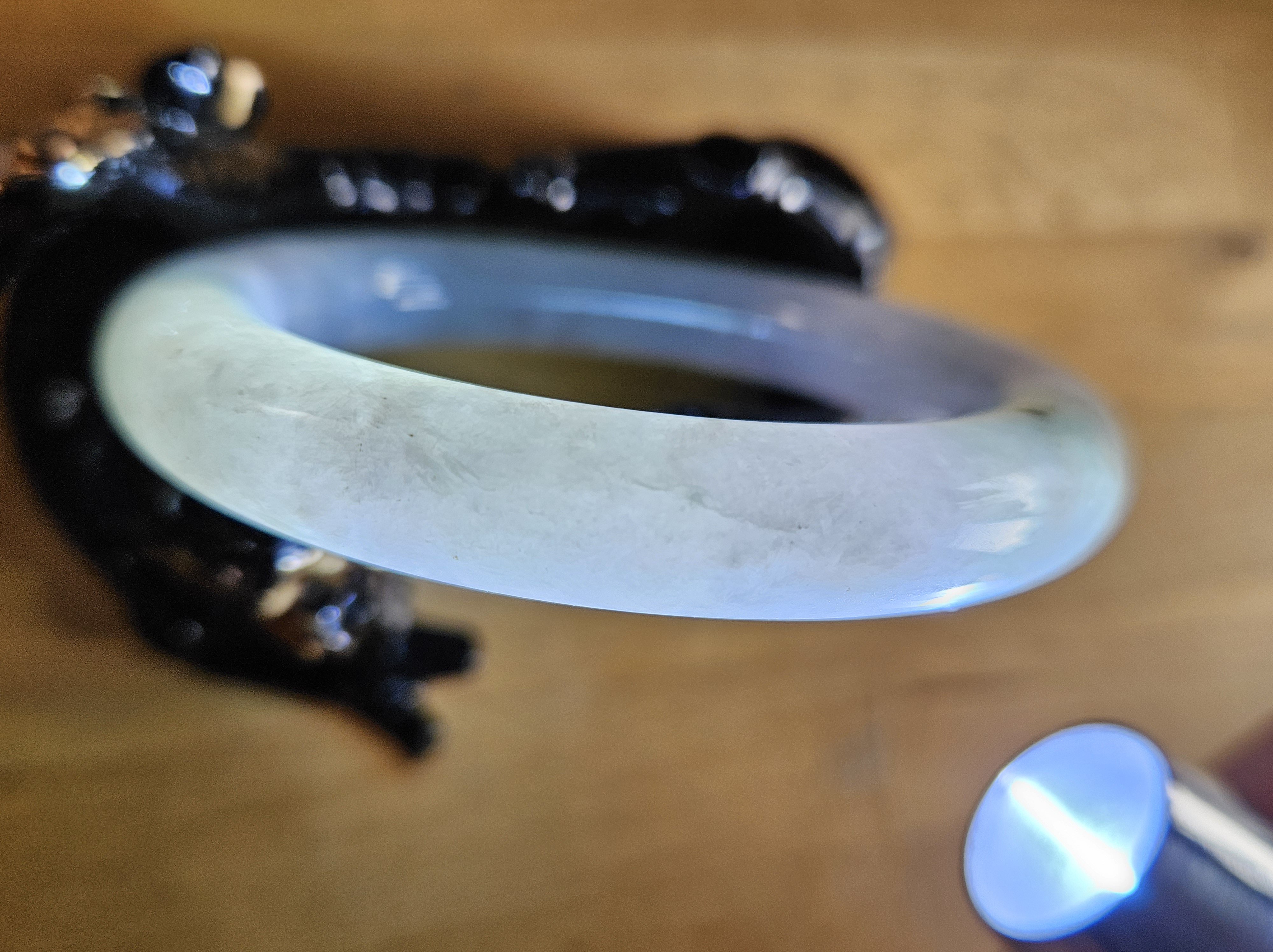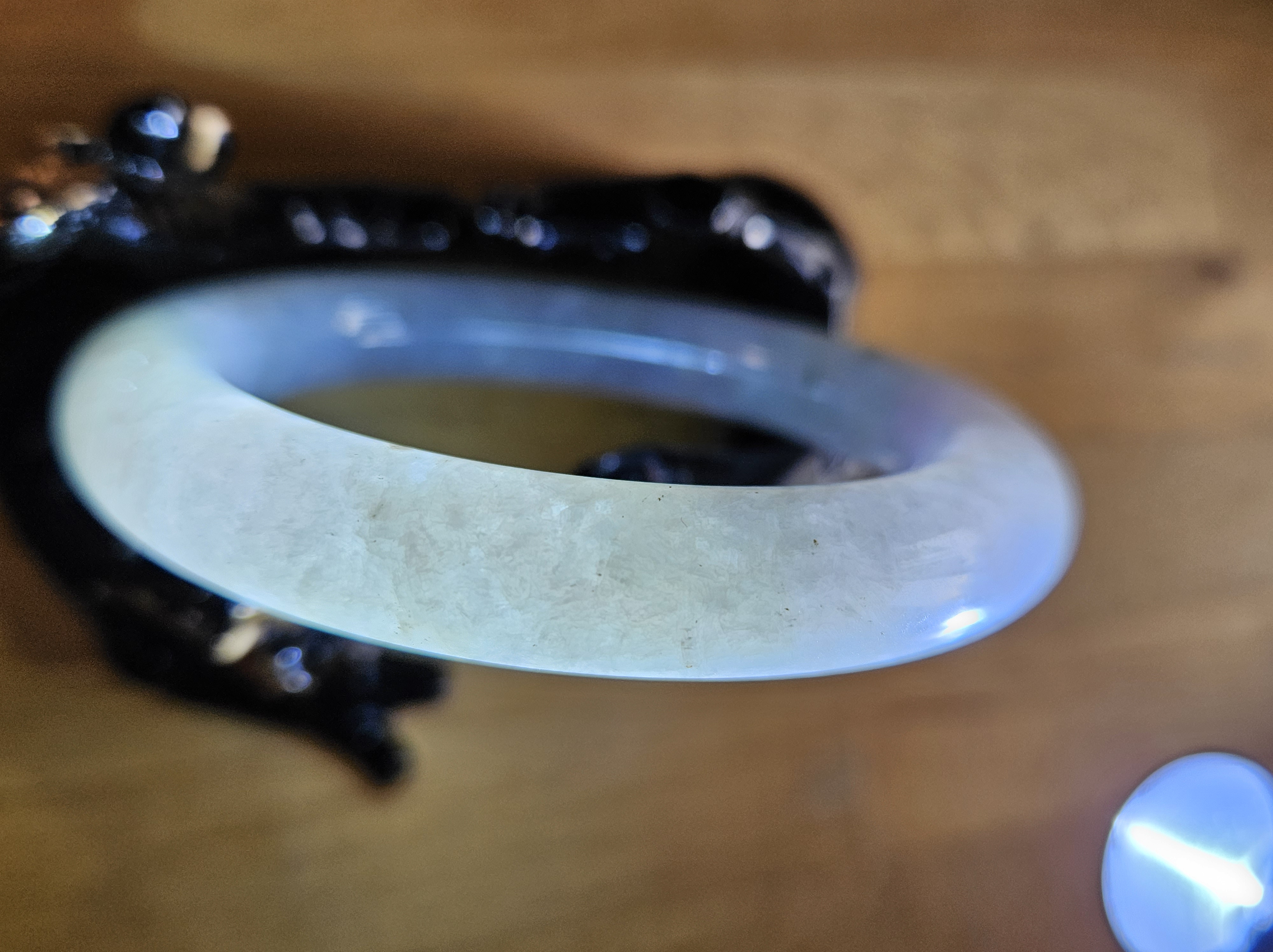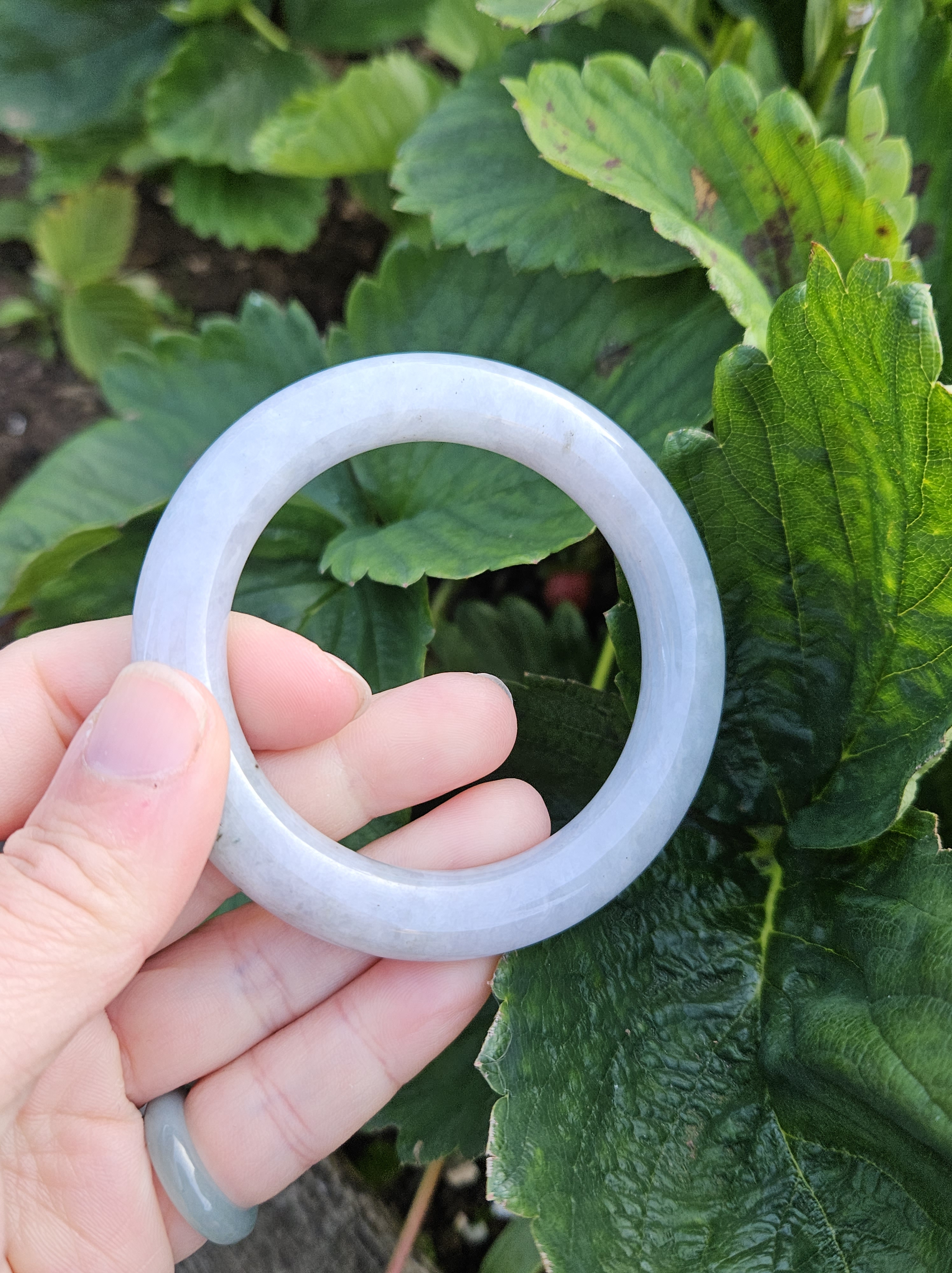 Lovely light green and purple jadeite bangle with smoky grey sprinkles fits up to 55mm, measures 53 x 9.5 10 5 x 11.4, weighs 60.61g , comes with a certificate of authenticity £228