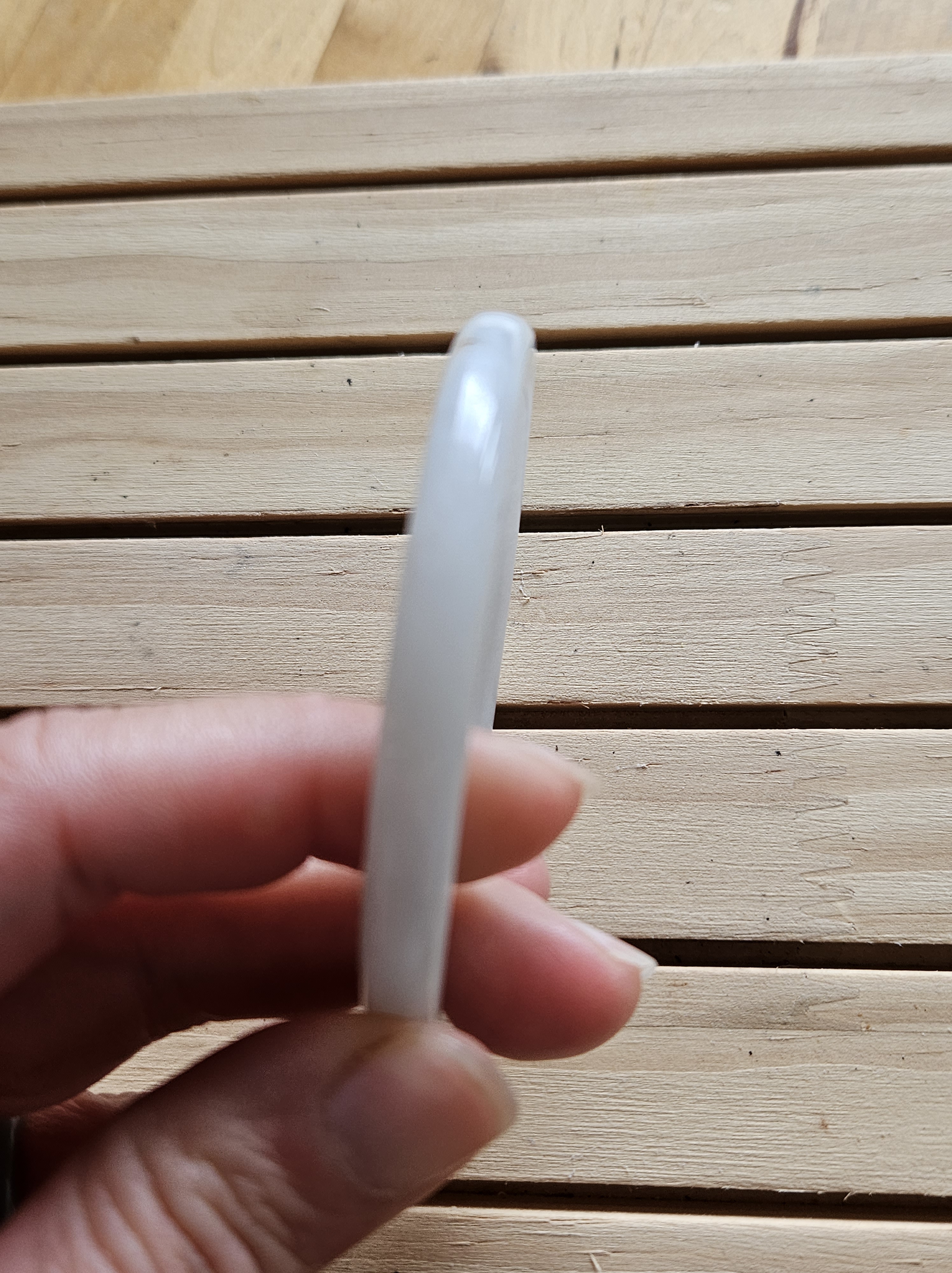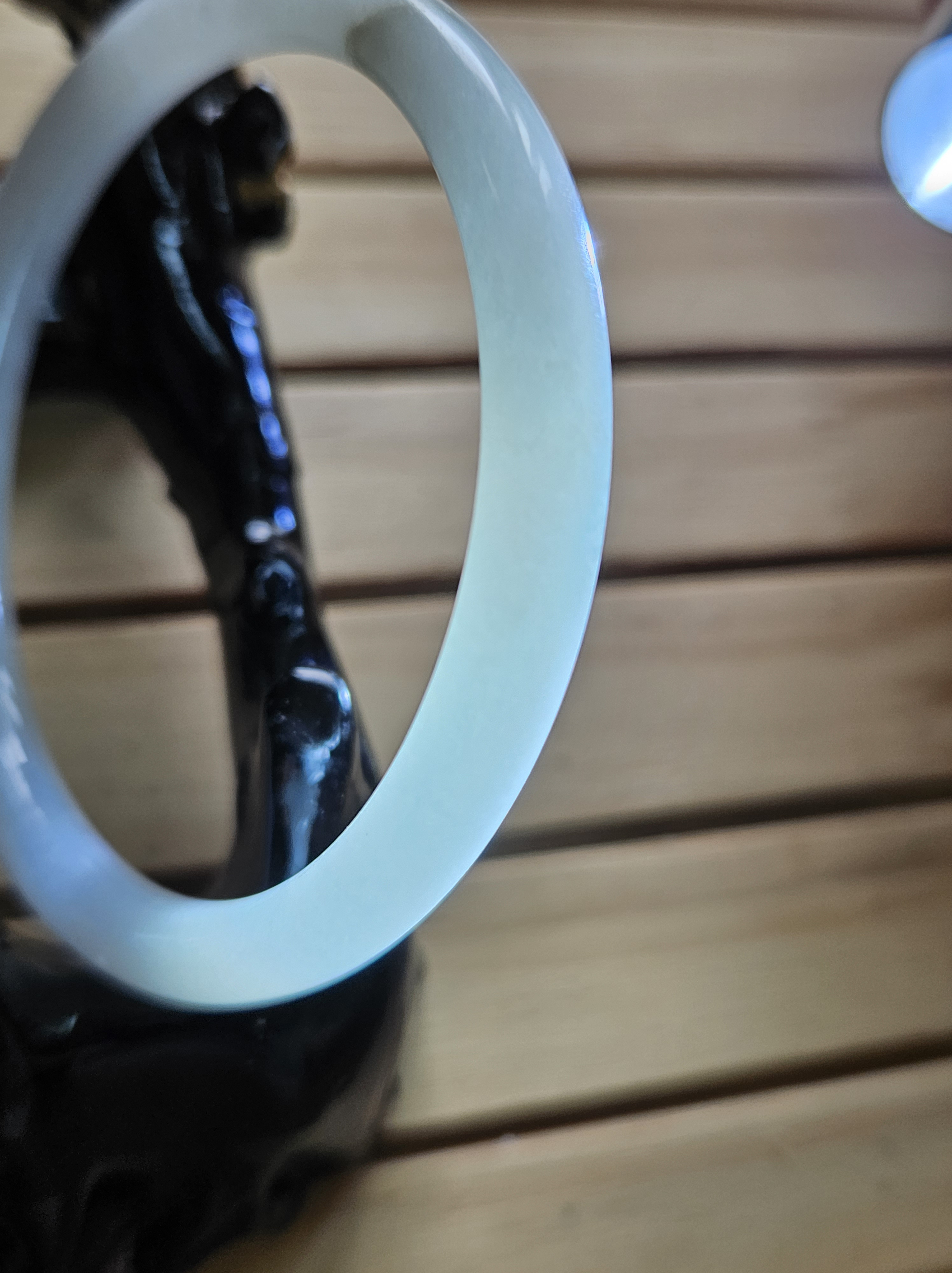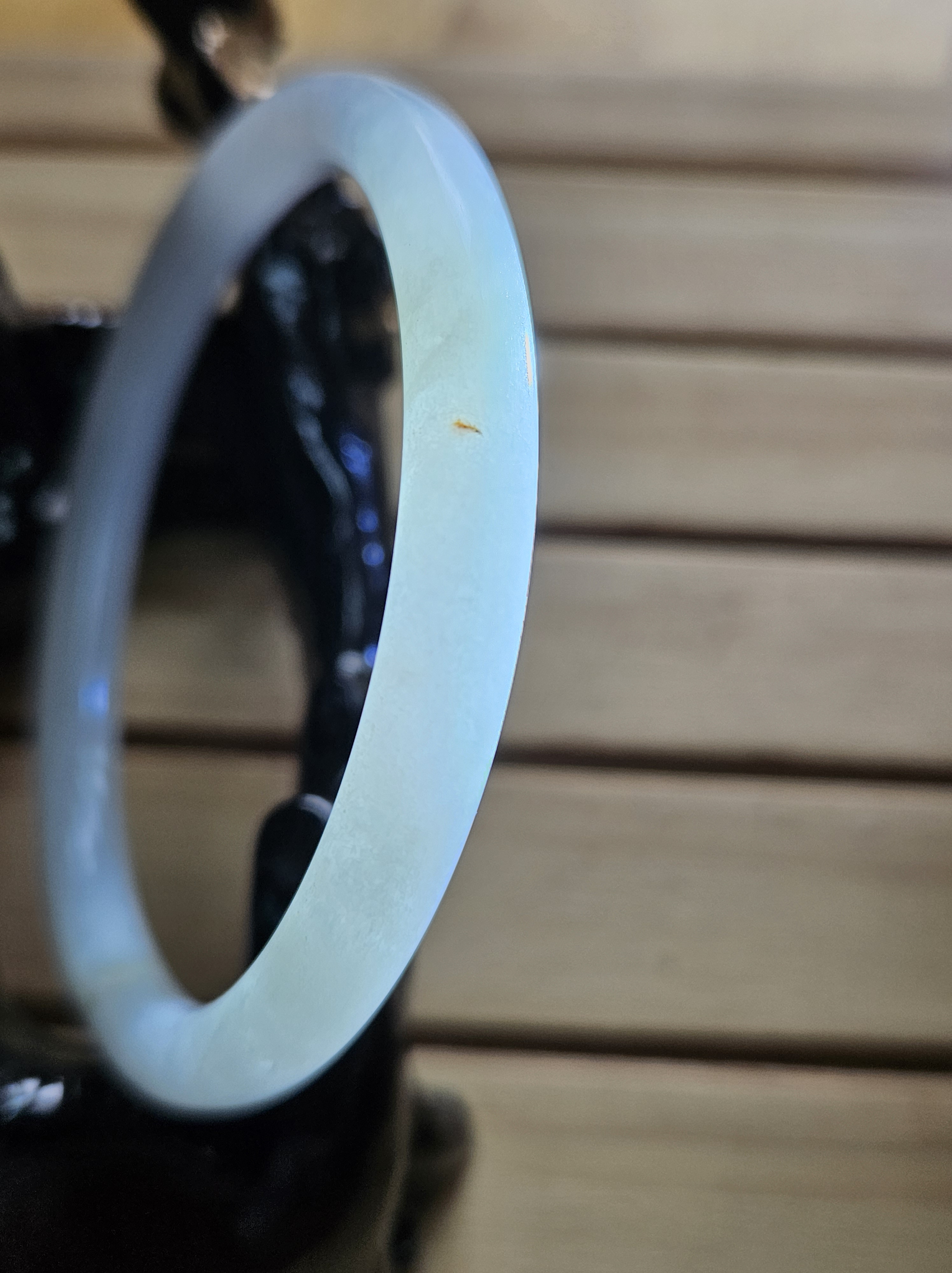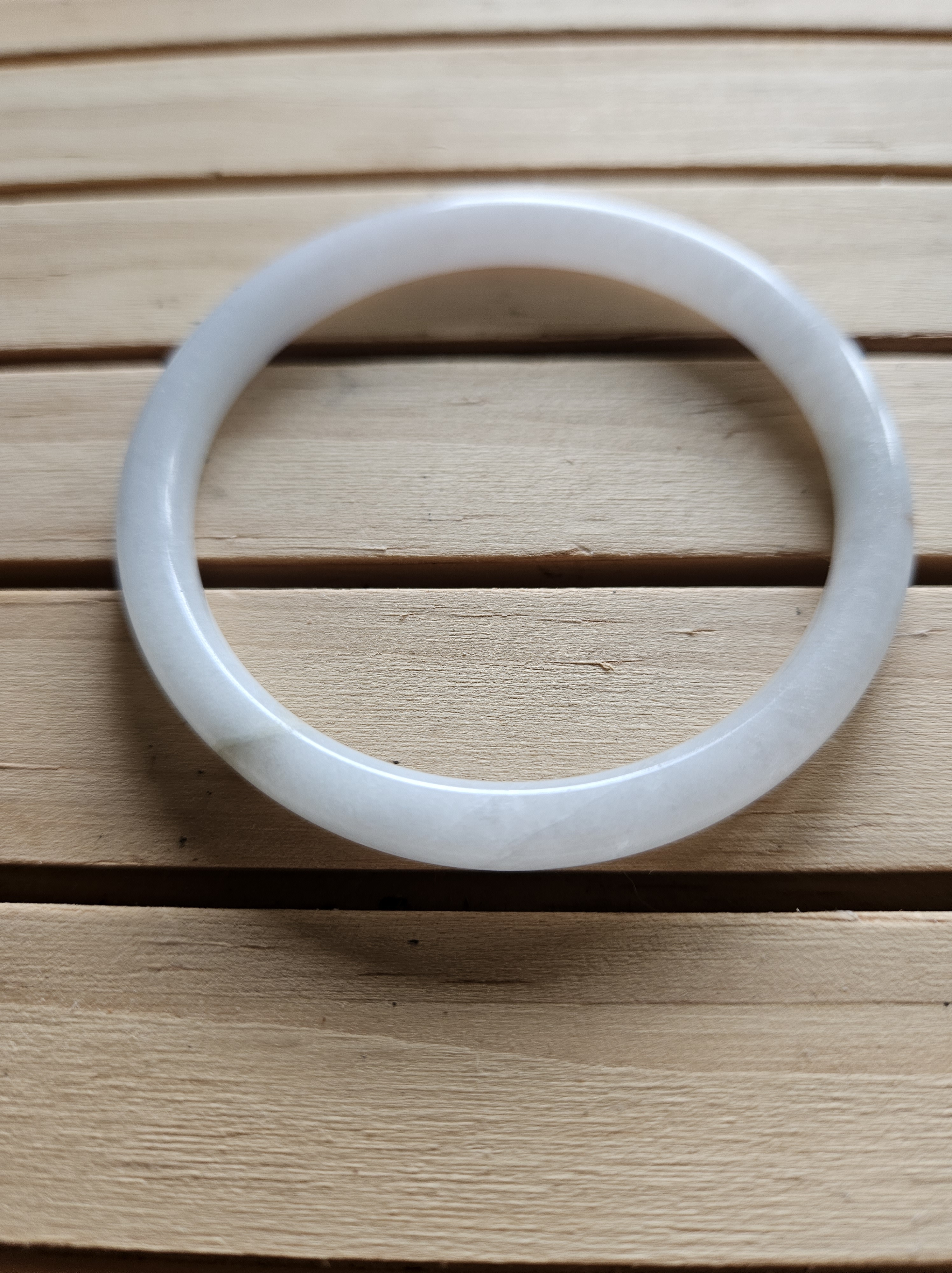 Measuring 55 x 6.5 x 6.7mm, weigh 21.63g, this lovely Burmese jadeite bangle can be worn on its own or make a pair with another similar size bangle that creates lovely sound when they clang together hence the term ding dang for a pair. Fits up to 57mm, comes with a certificate of authenticity £69