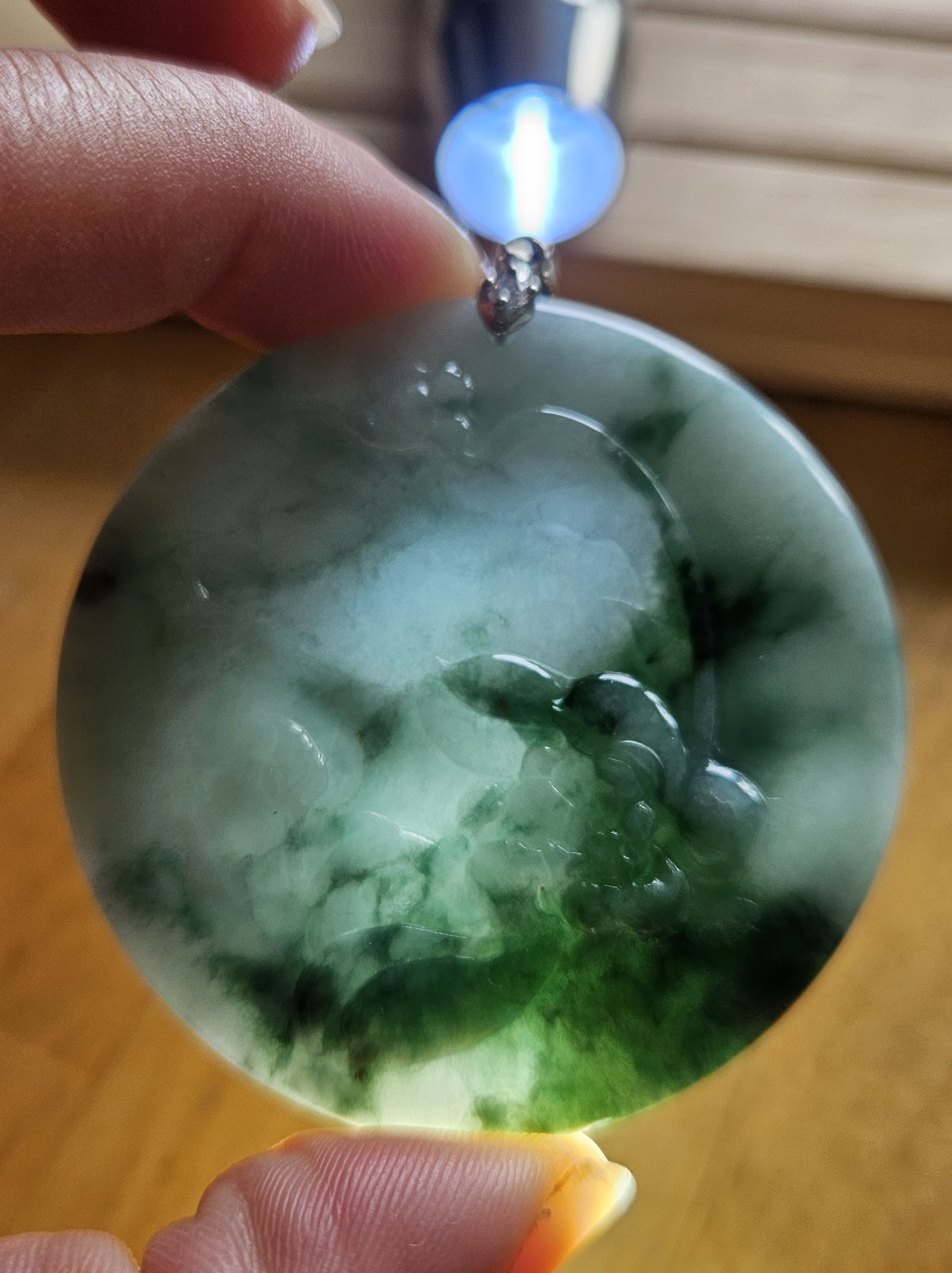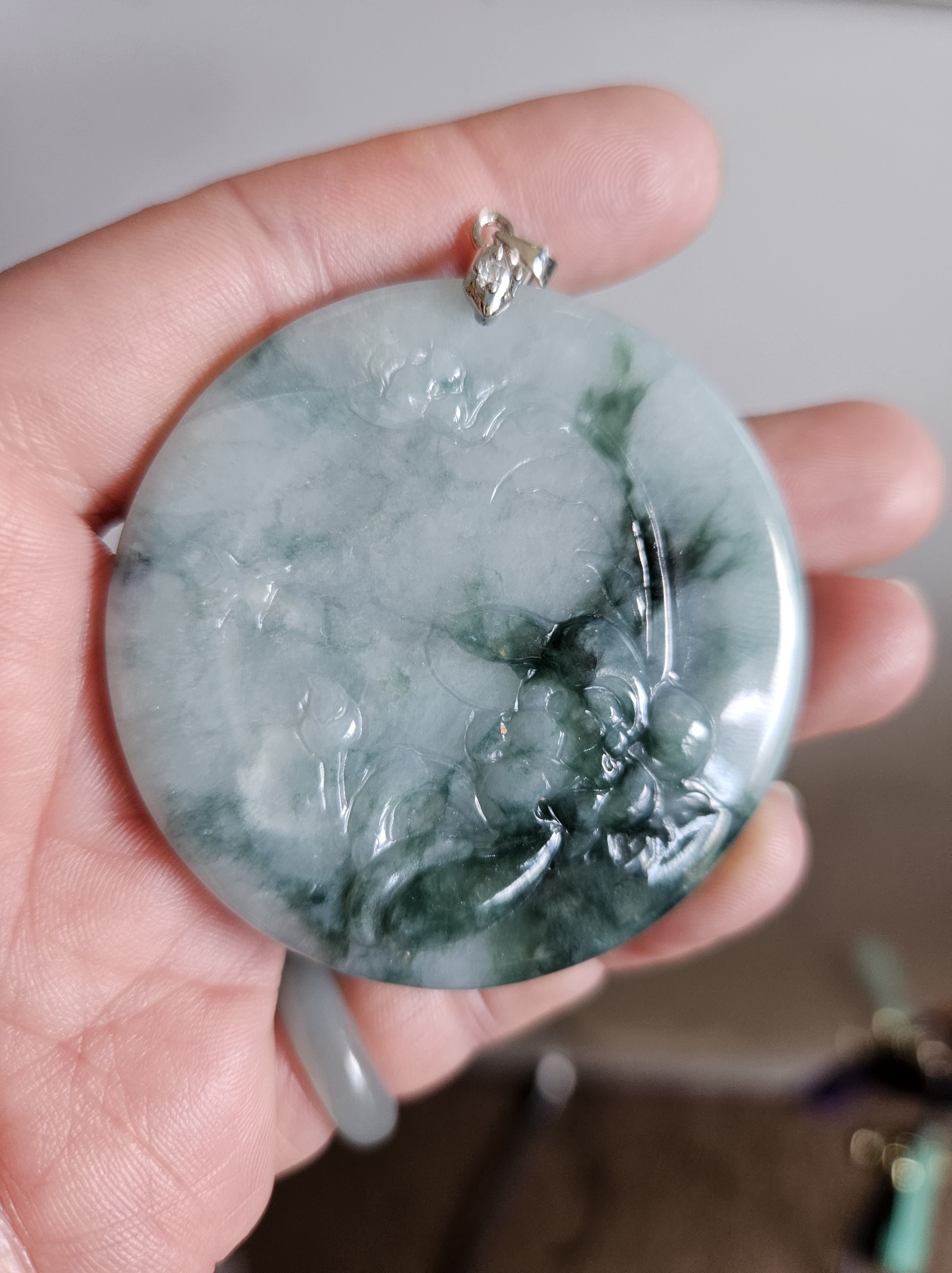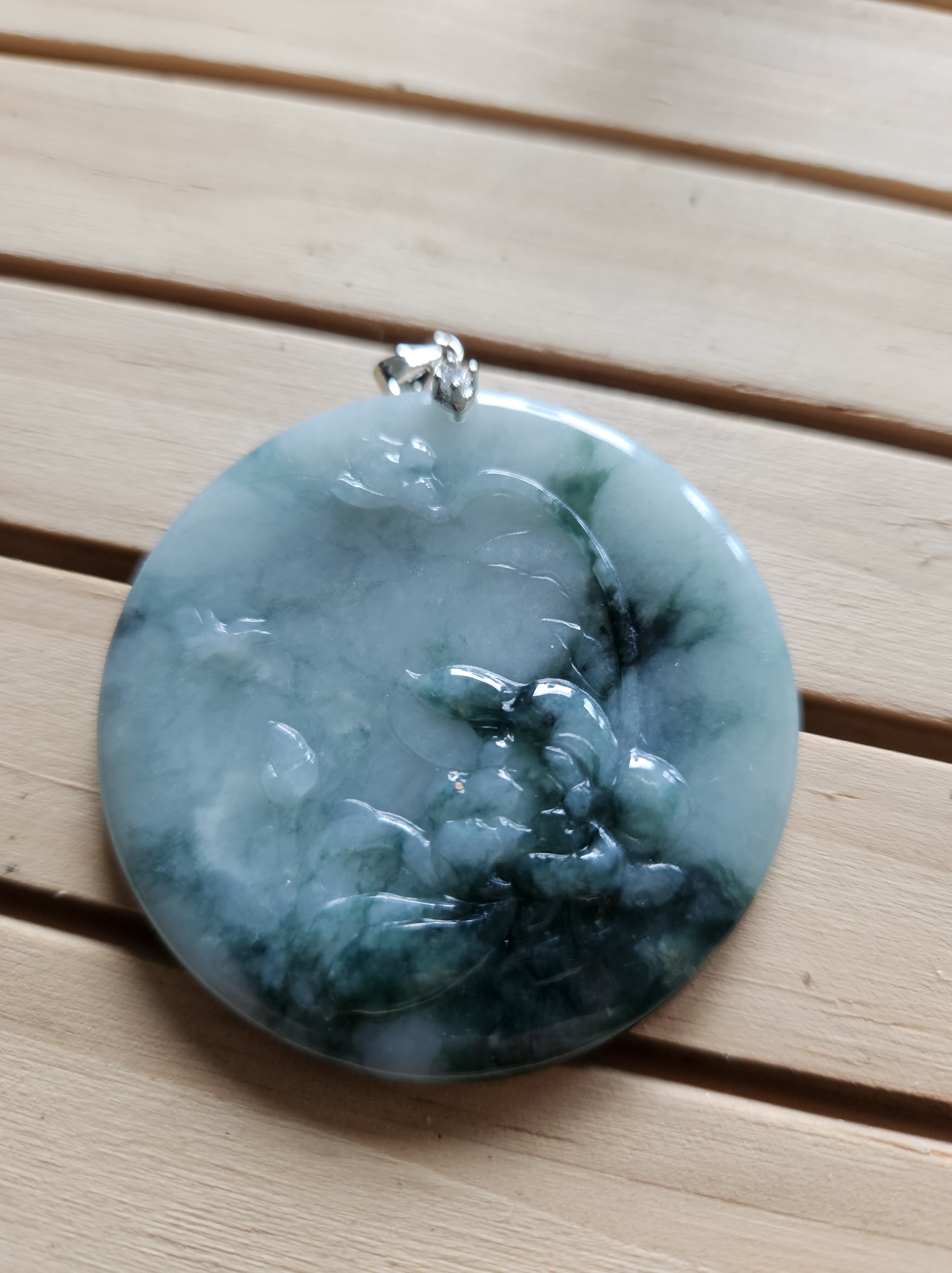 Whether you’re religious or not and whether you have a lot of knowledge on the lotus flower or not — deriving from the Buddhist meaning — the lotus flower signifies purity, rebirth, and strength. “It is all about new beginnings and starting fresh as our senses become awakened to something new. Measures 51.5 x 6mm, this is a lovely Burmese jadeite with gorgeous blooms. The back of the jade is smooth so you can double the pendant as a wushipai无事牌, which means may every go smoothly and nothing bad befalls you. £40
