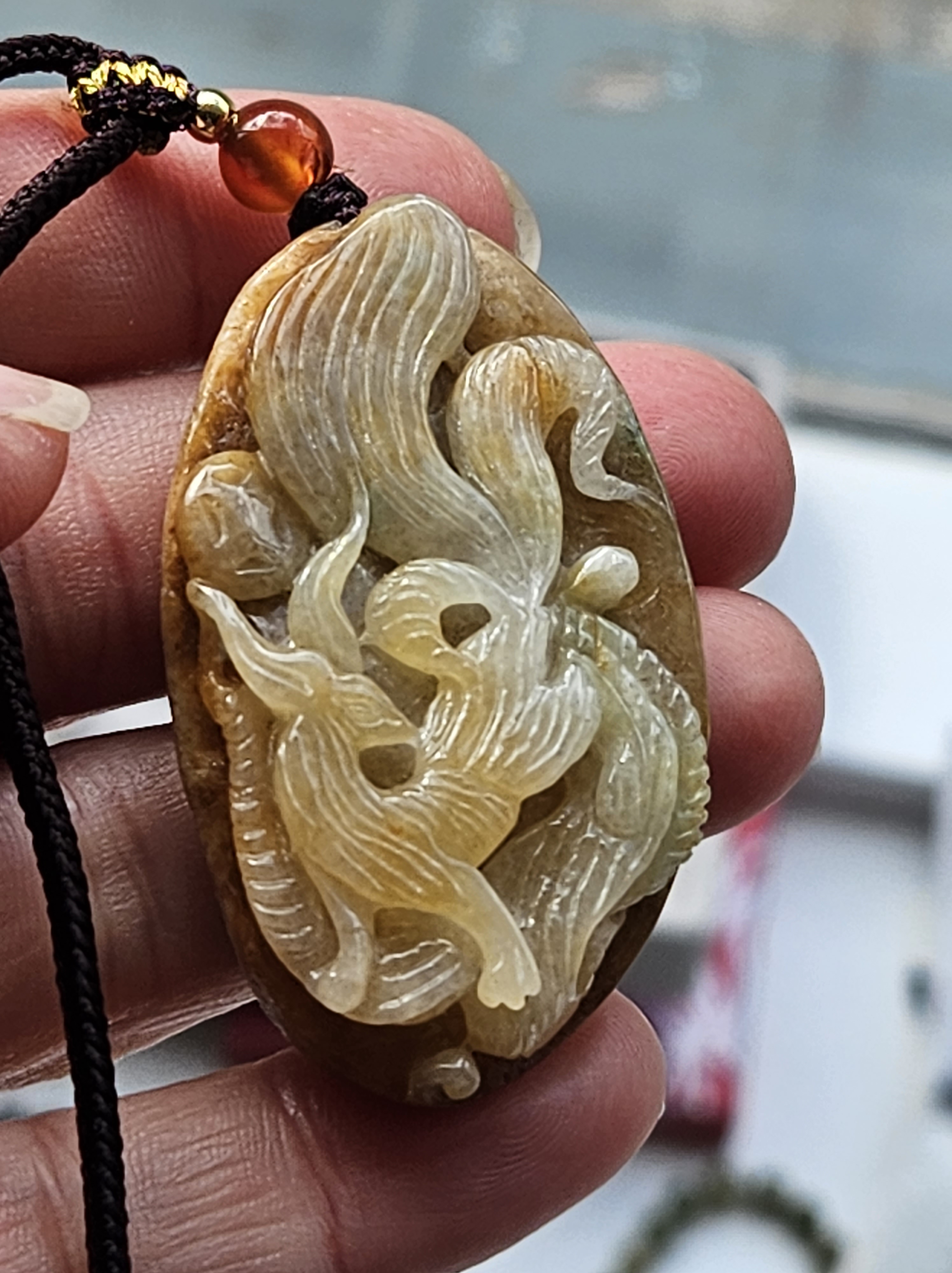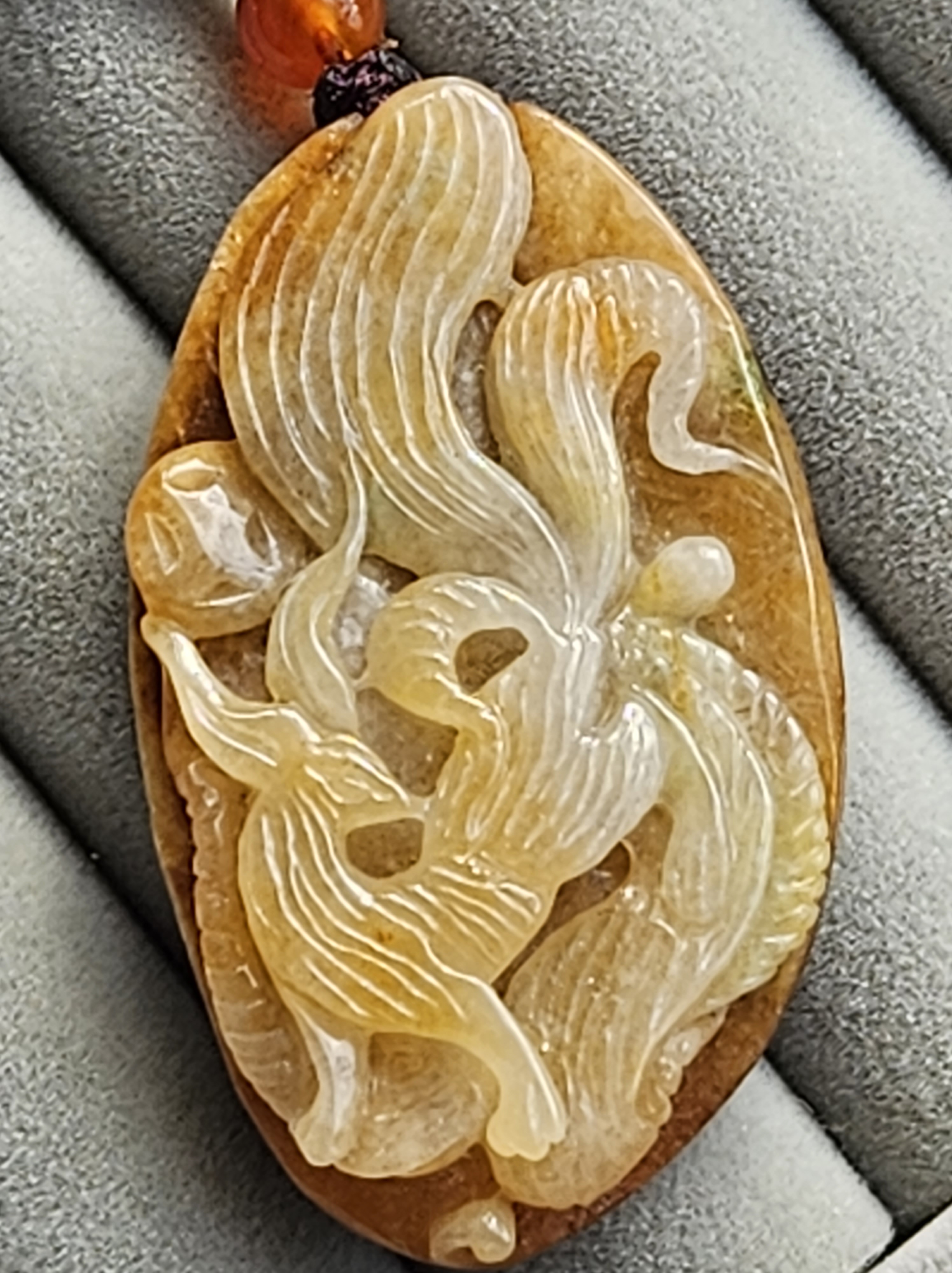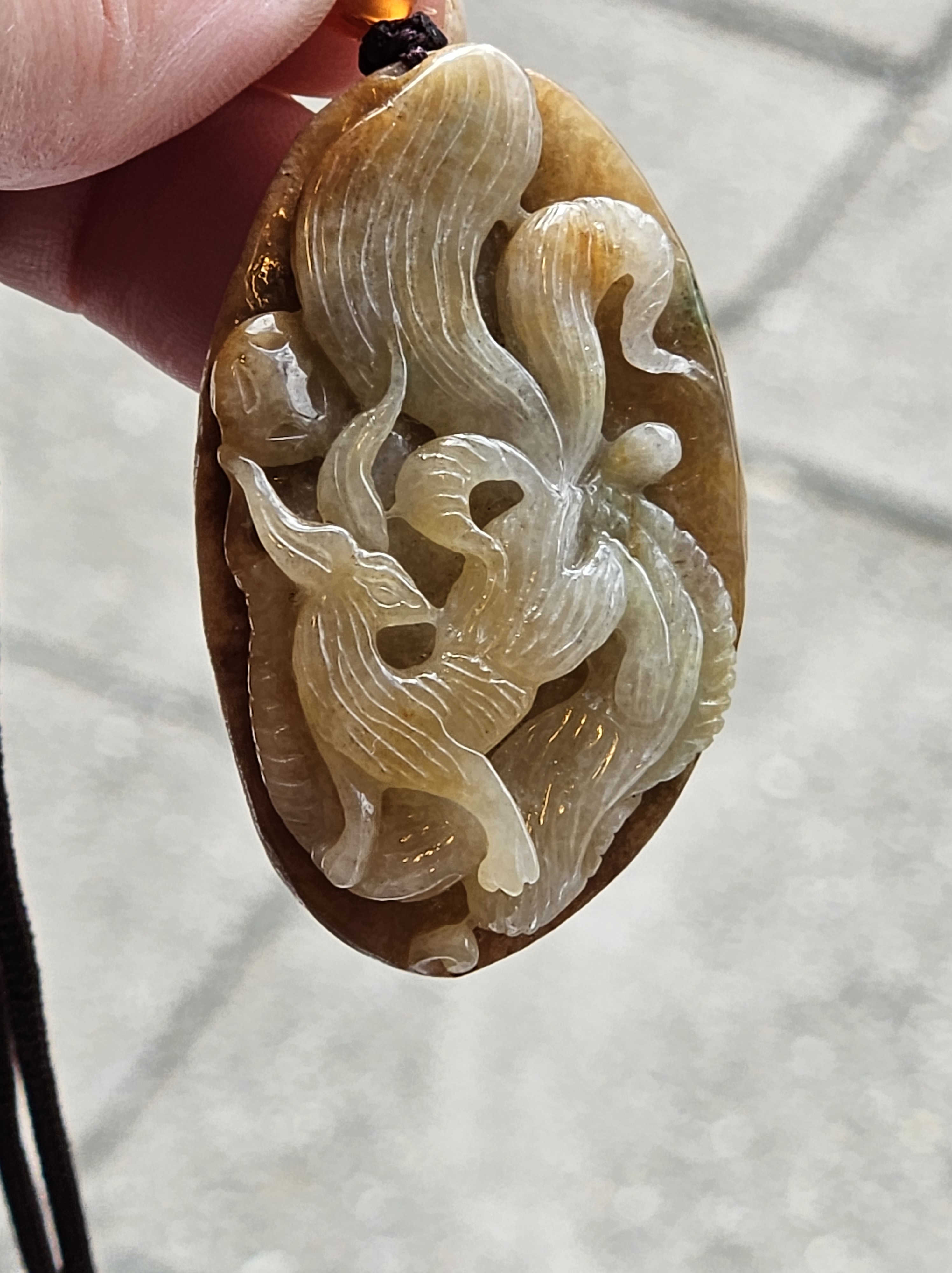 Stunning 9 tailed fox intricately carved on yellow Burmese jadeite. Measures 47.4 x 27.1 x 11.2mm, weighs 24.53g, comes on an adjustable string chain and with a certificate of authenticity. £118