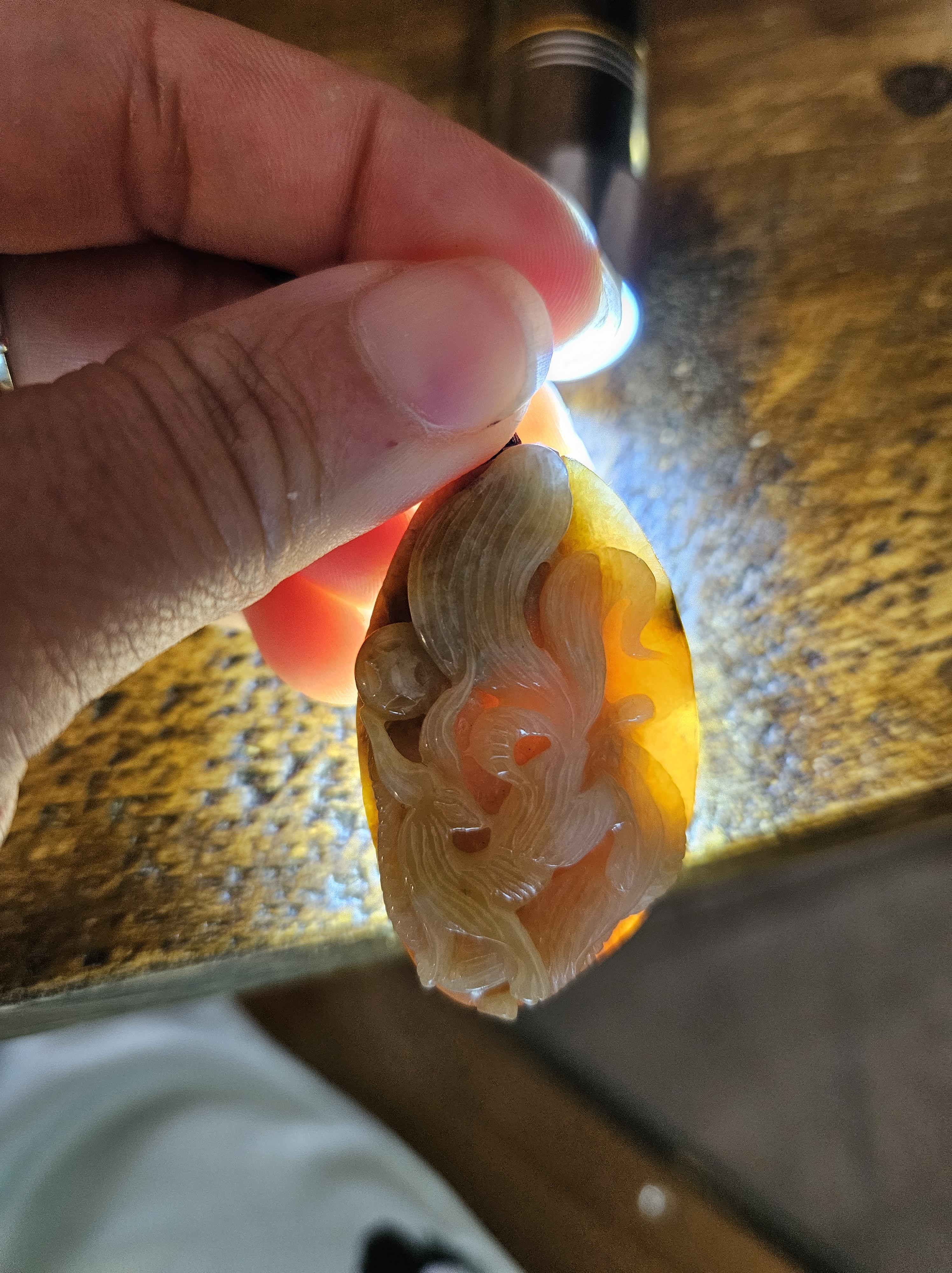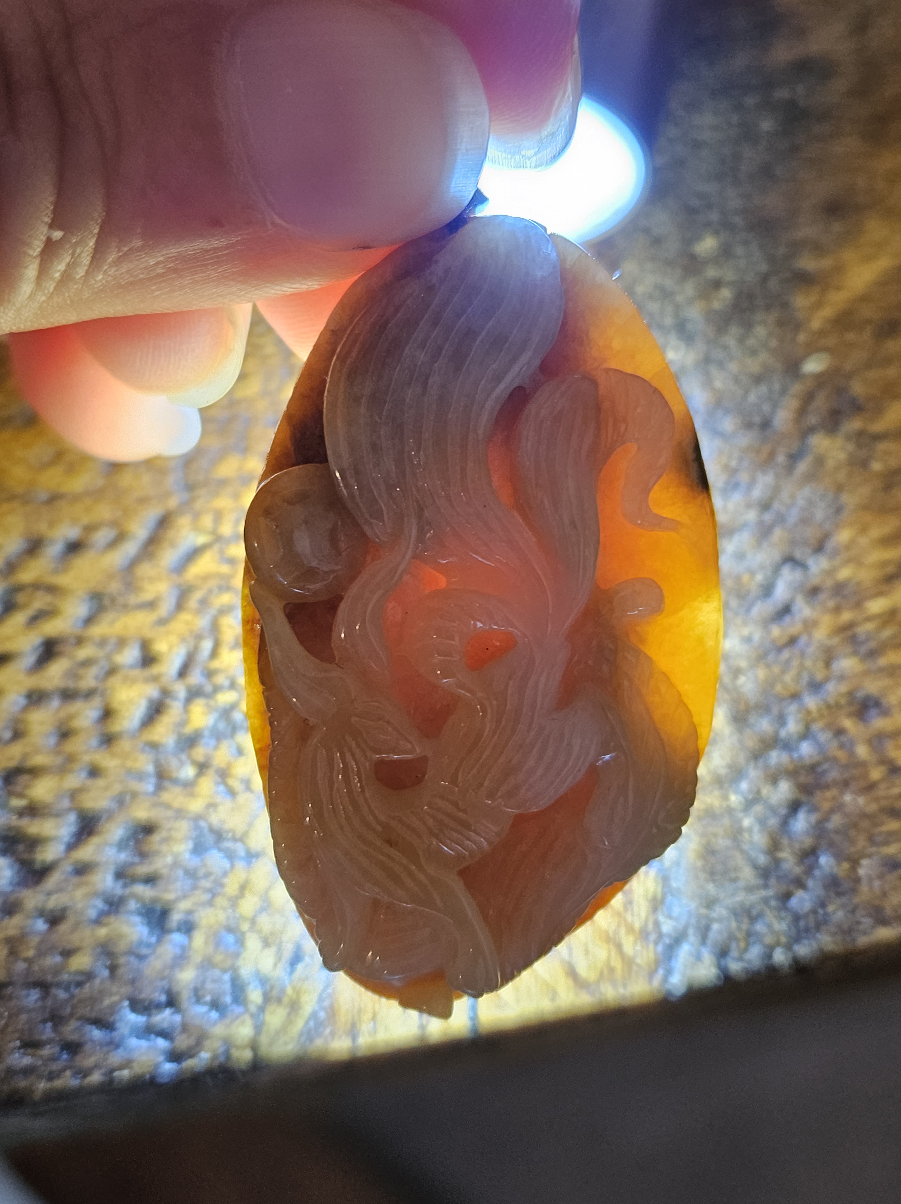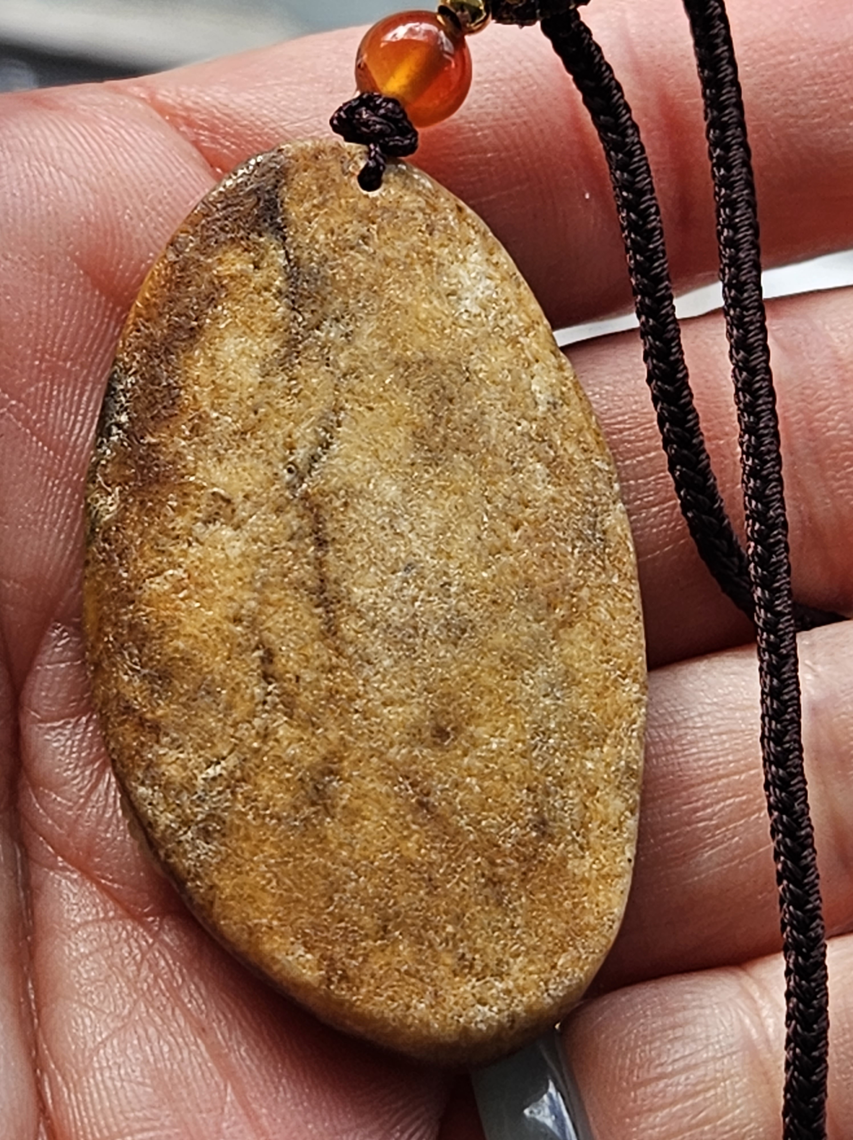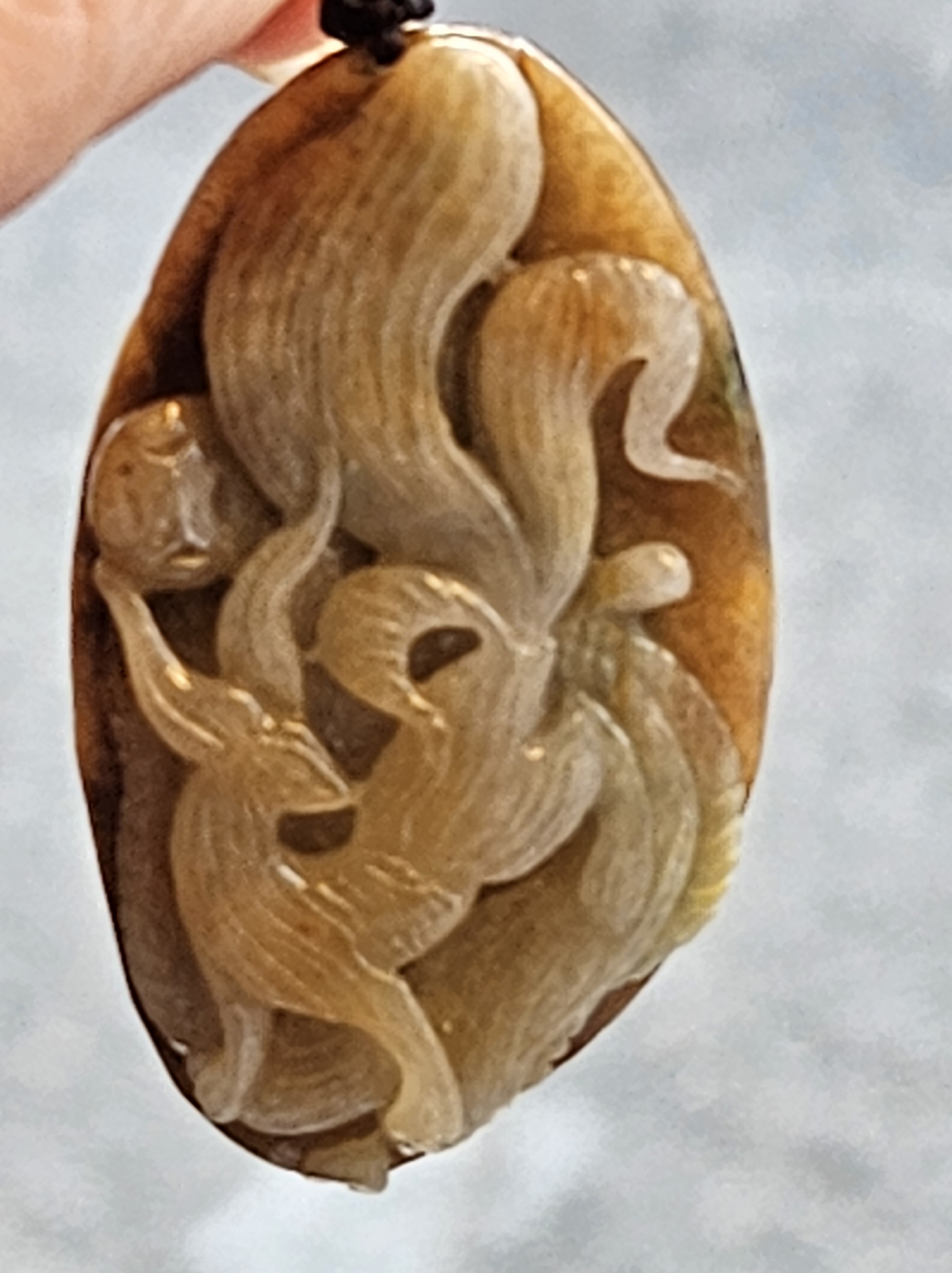 Stunning 9 tailed fox intricately carved on yellow Burmese jadeite. Measures 47.4 x 27.1 x 11.2mm, weighs 24.53g, comes on an adjustable string chain and with a certificate of authenticity. £118