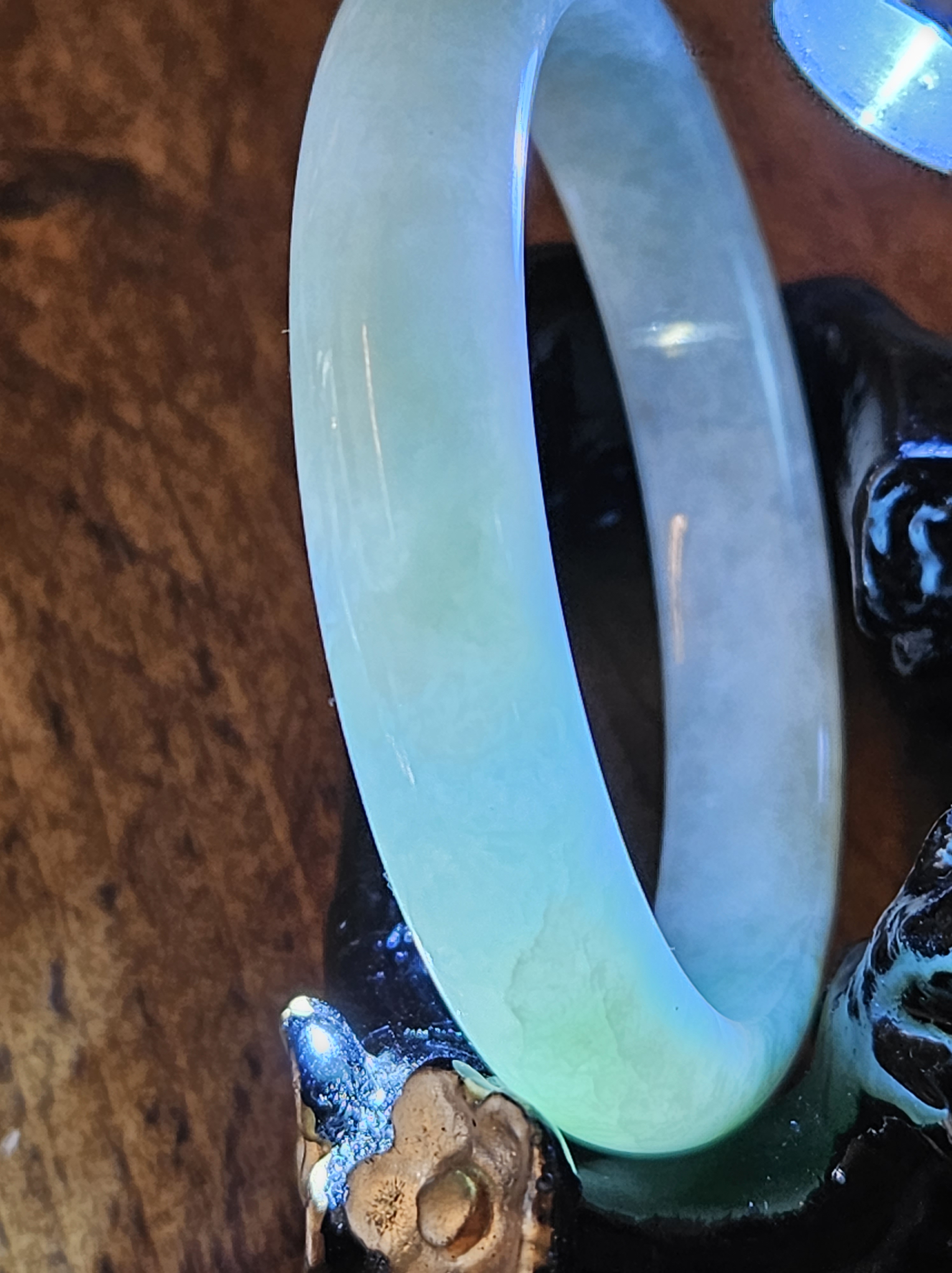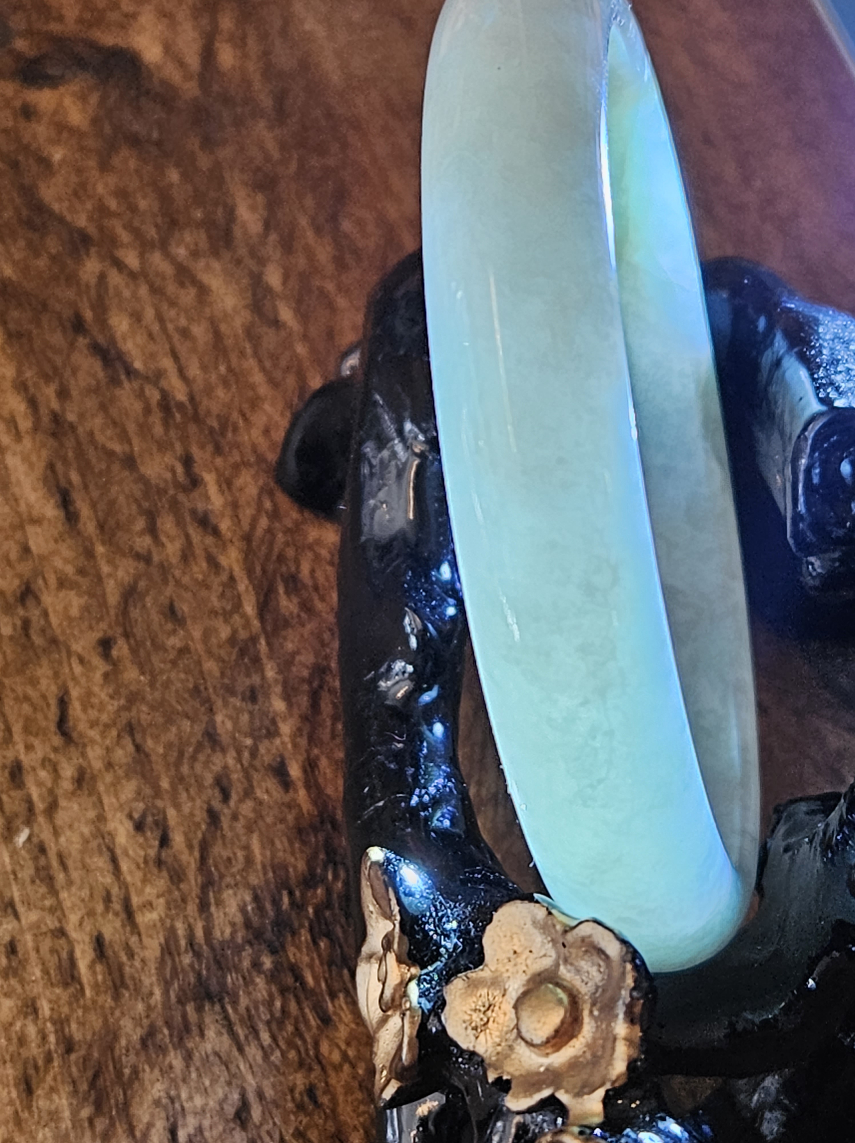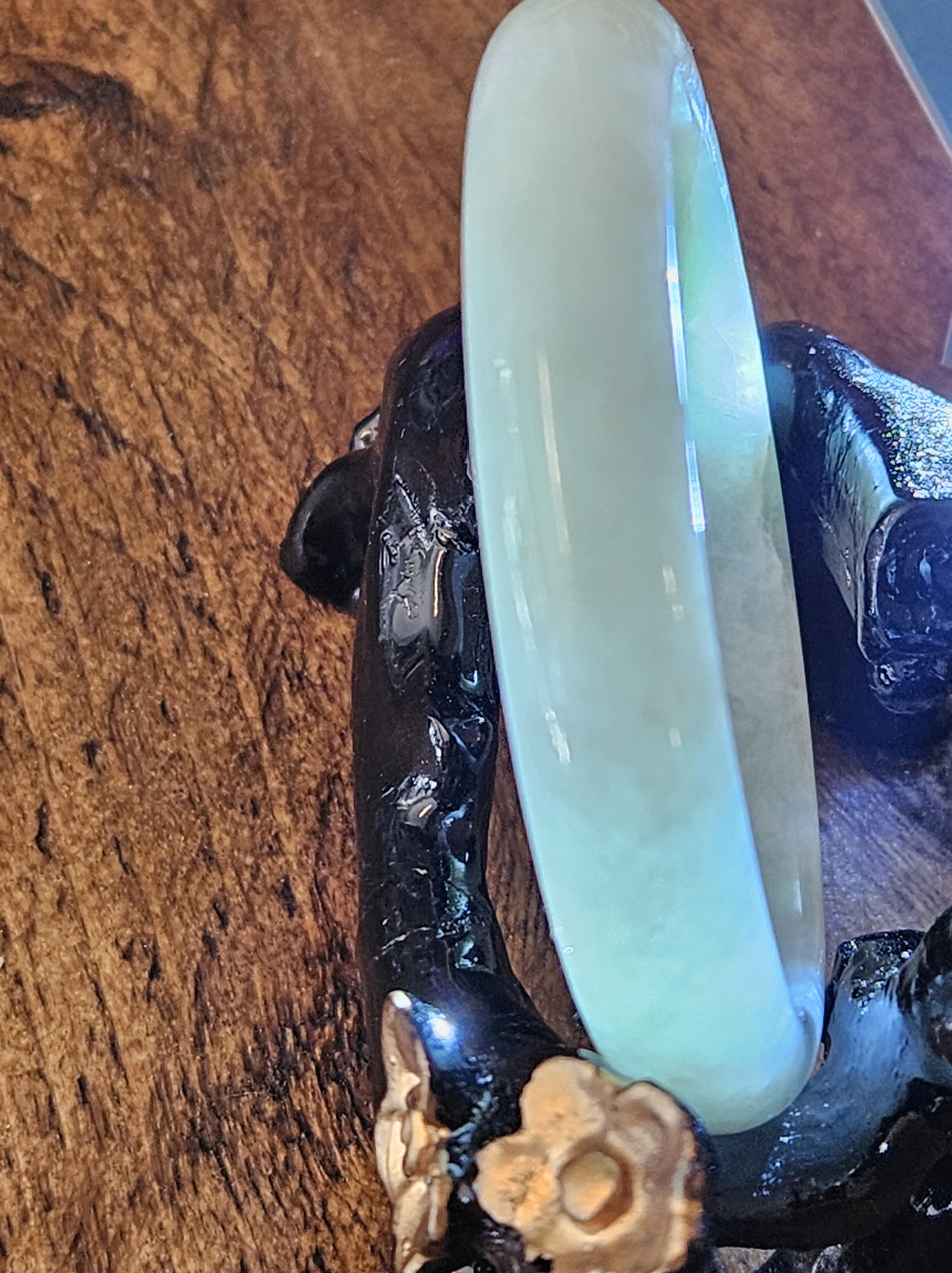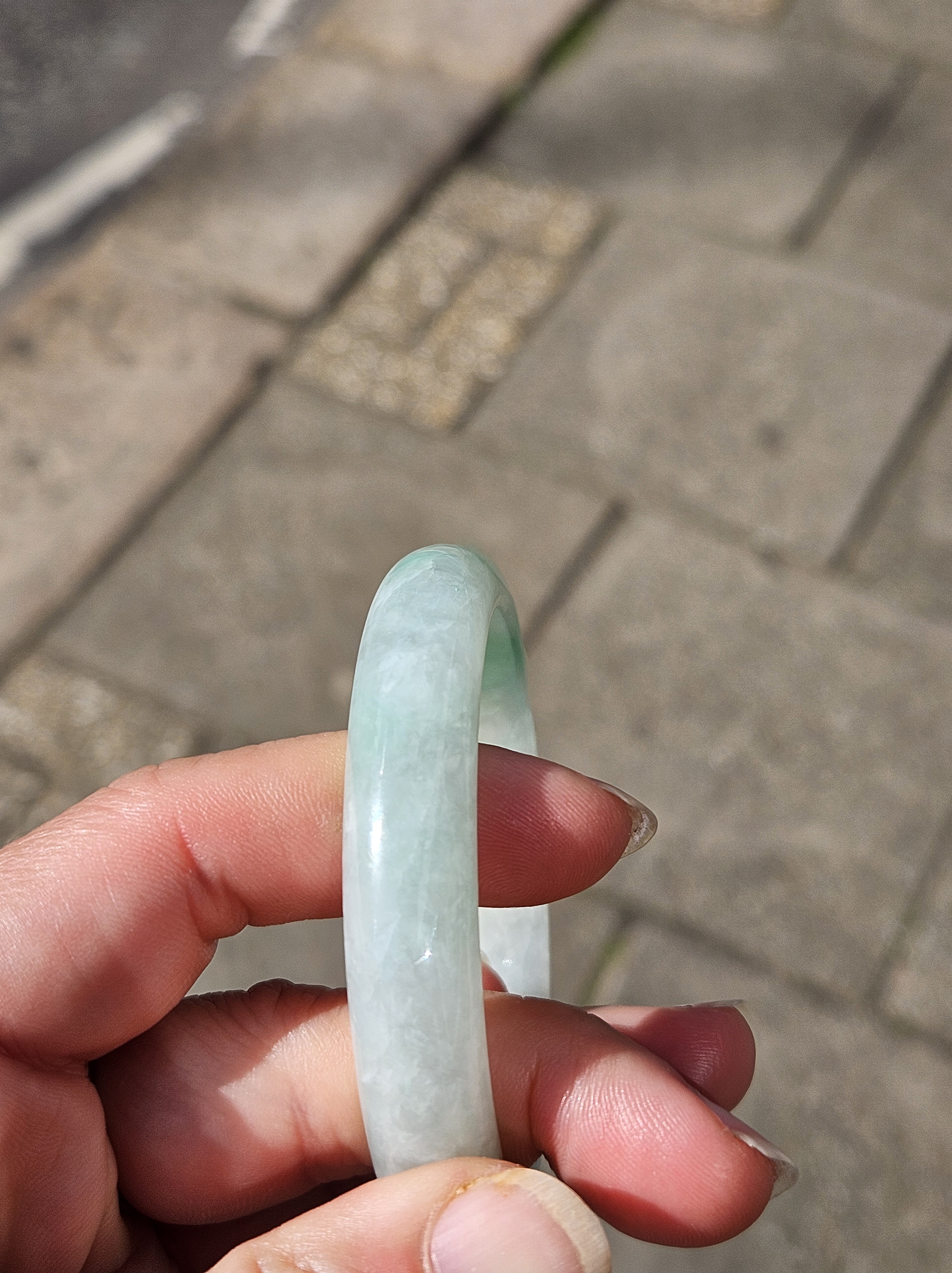 Gorgeous light green bangle with a patch of apple green and red measures 56.5 x 11.3 x 6.9mm, weighs 41.38g, comes with a certificate of authenticity £288