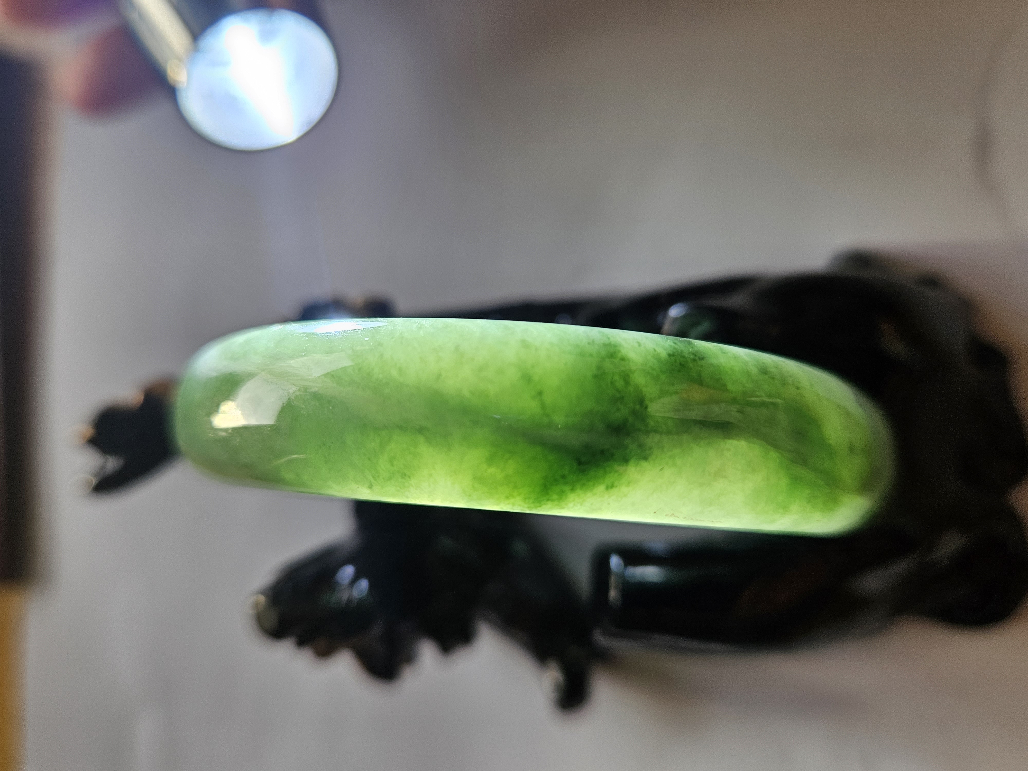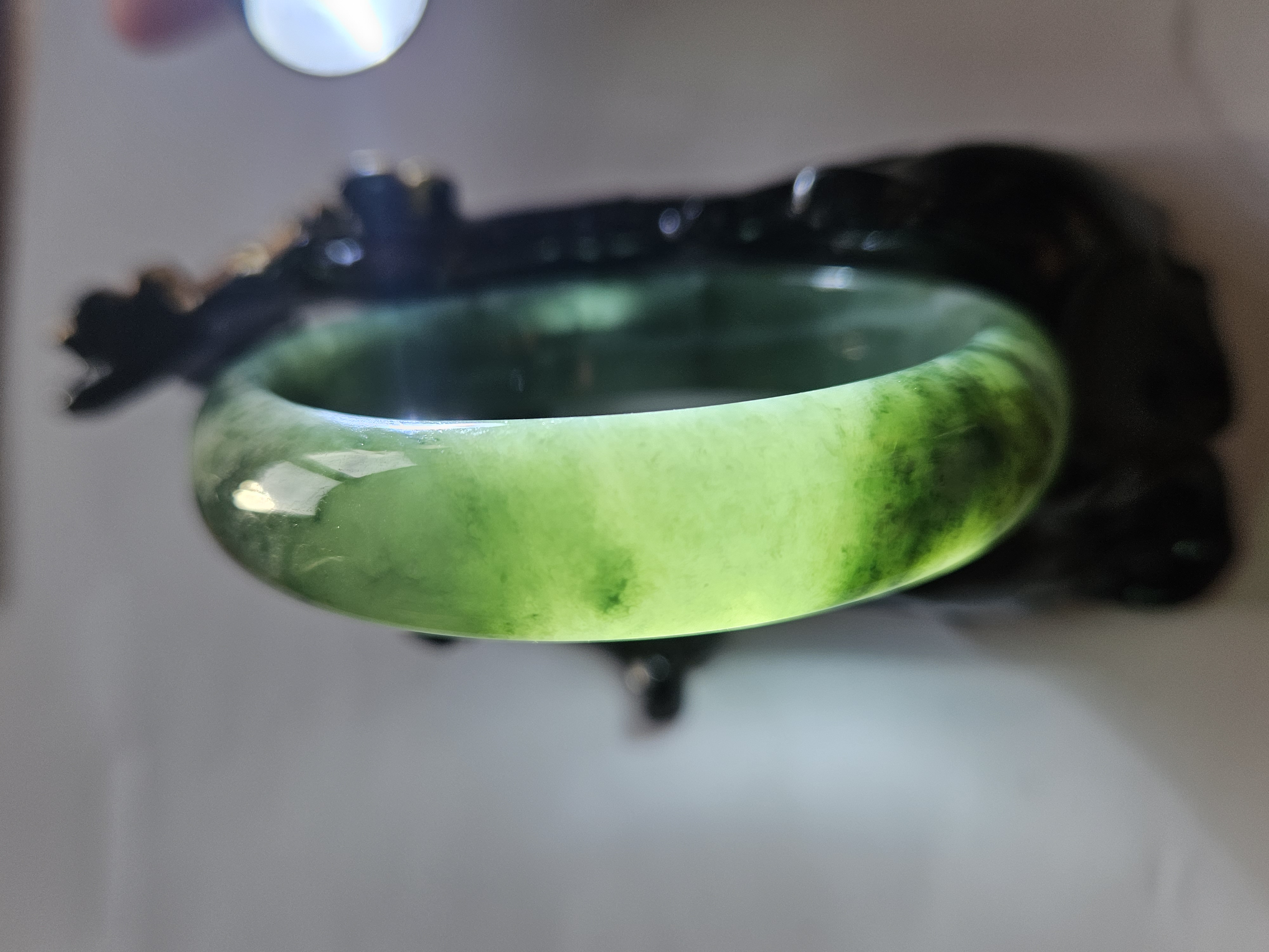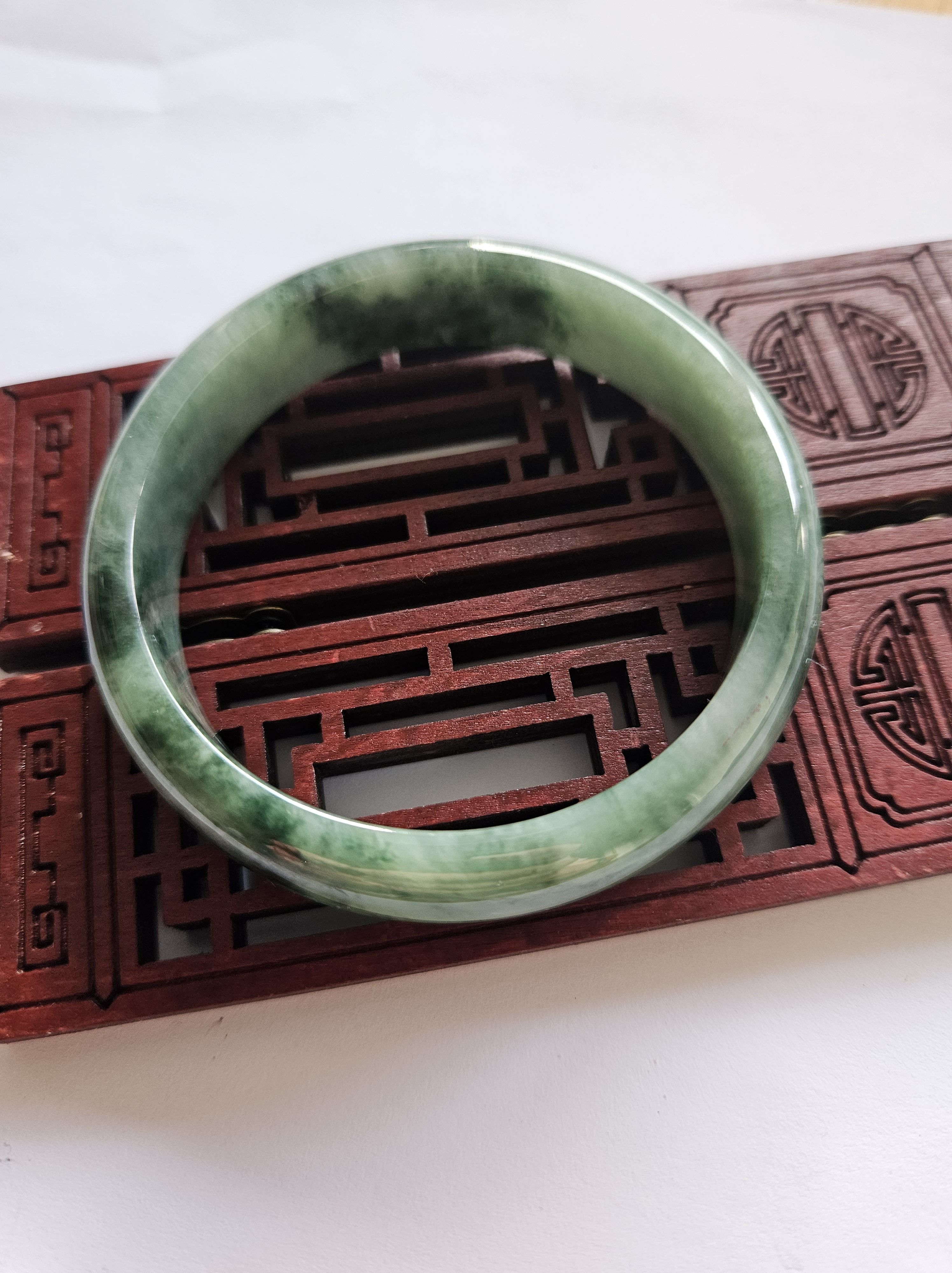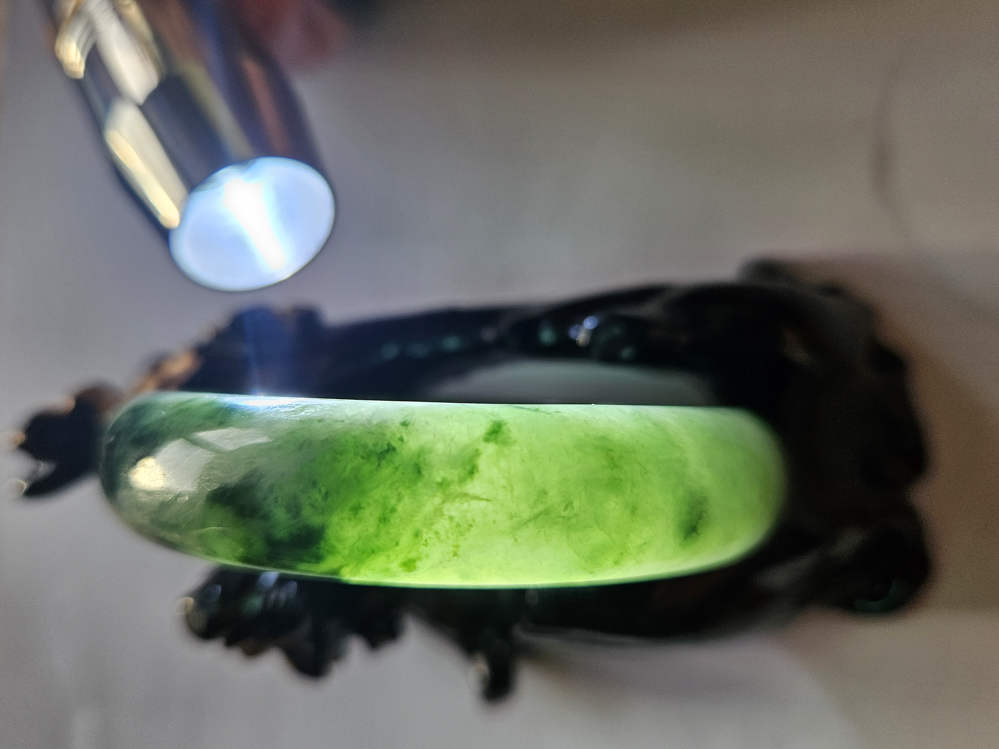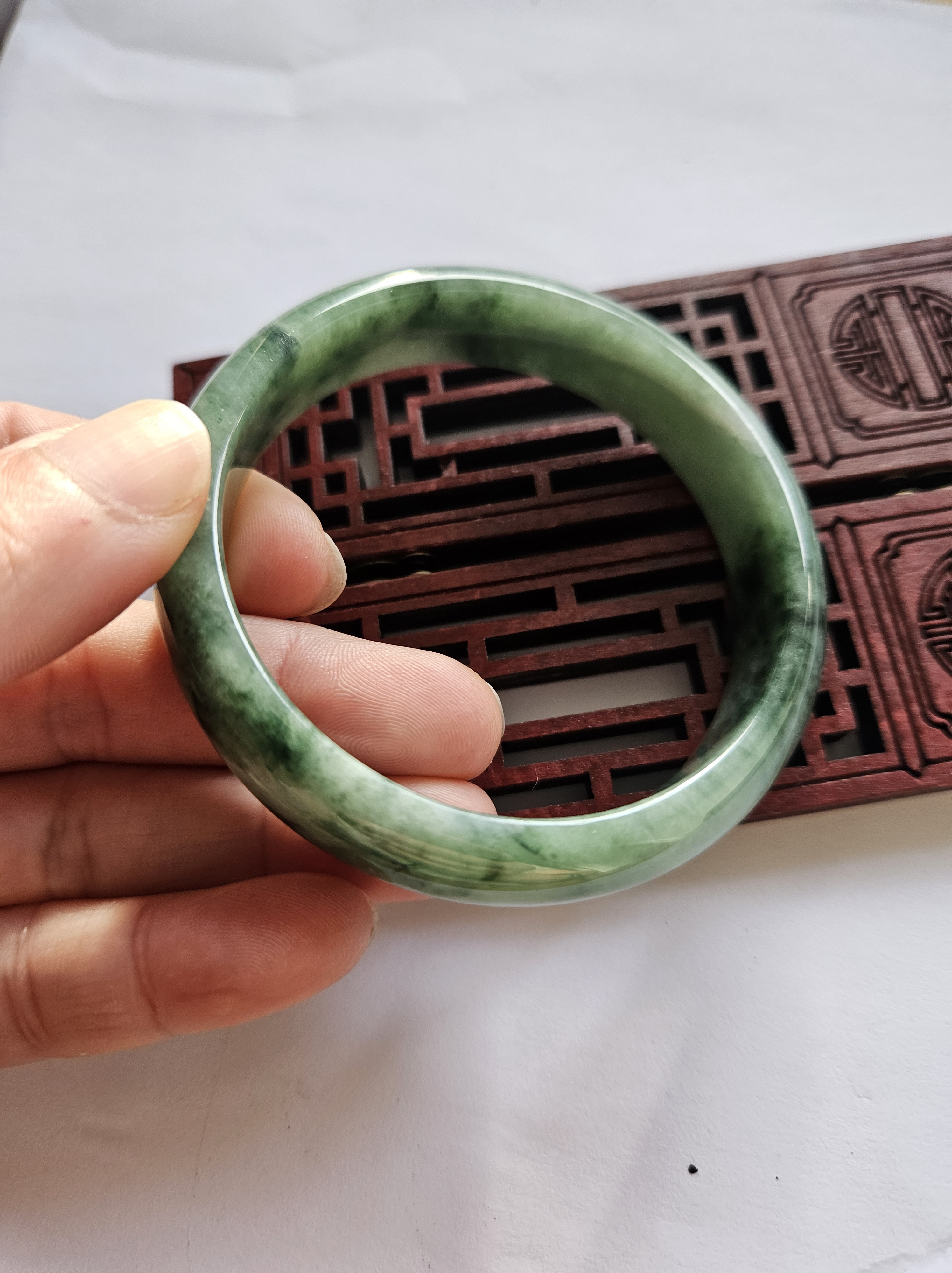 Lovely full green bangle with darker green blooms measures 56.6 x 13.3 x 7.1mm, weighs 49.2g, has a long colour line which makes it unique. Comes with a certificate of authenticity £158