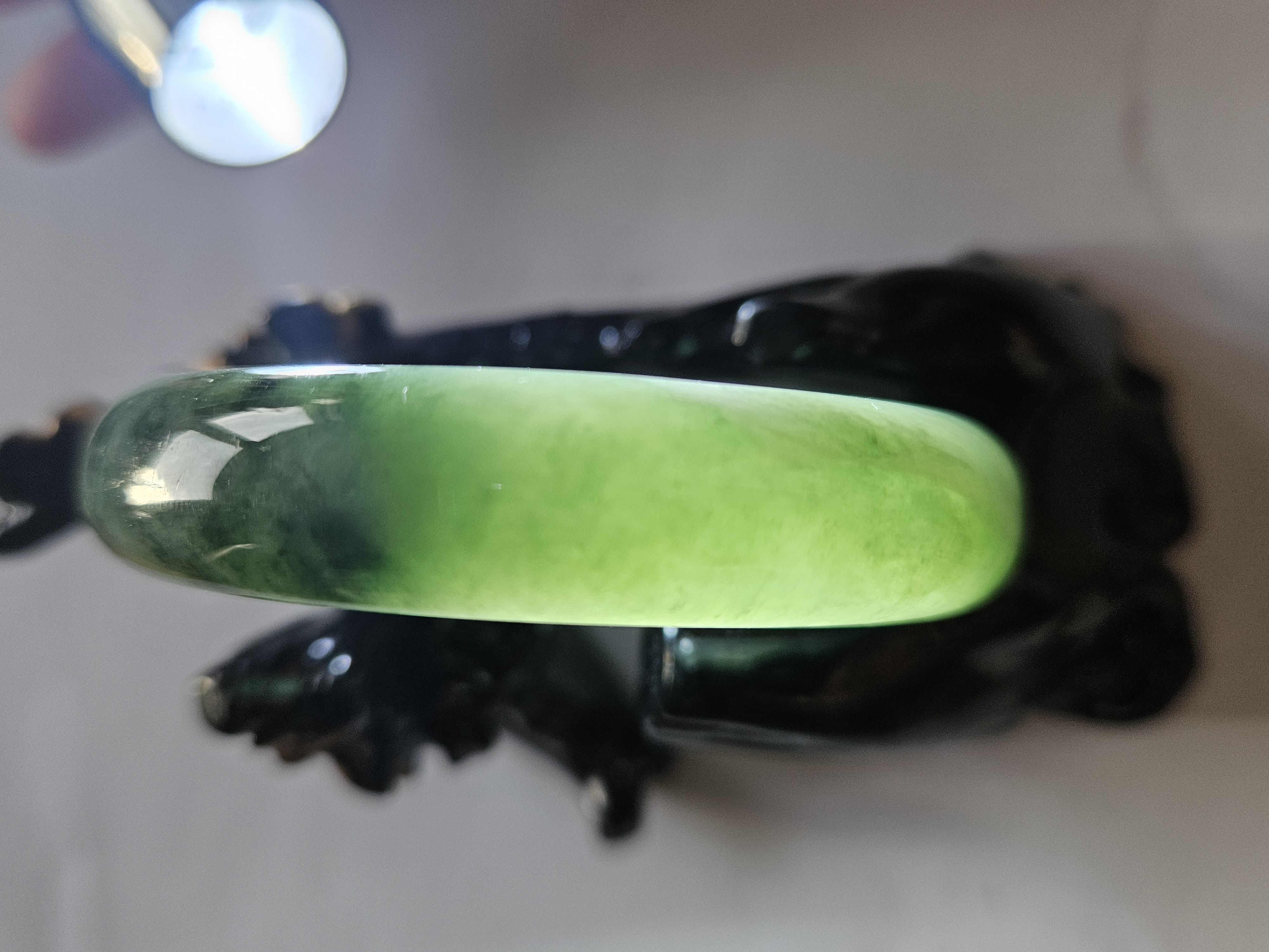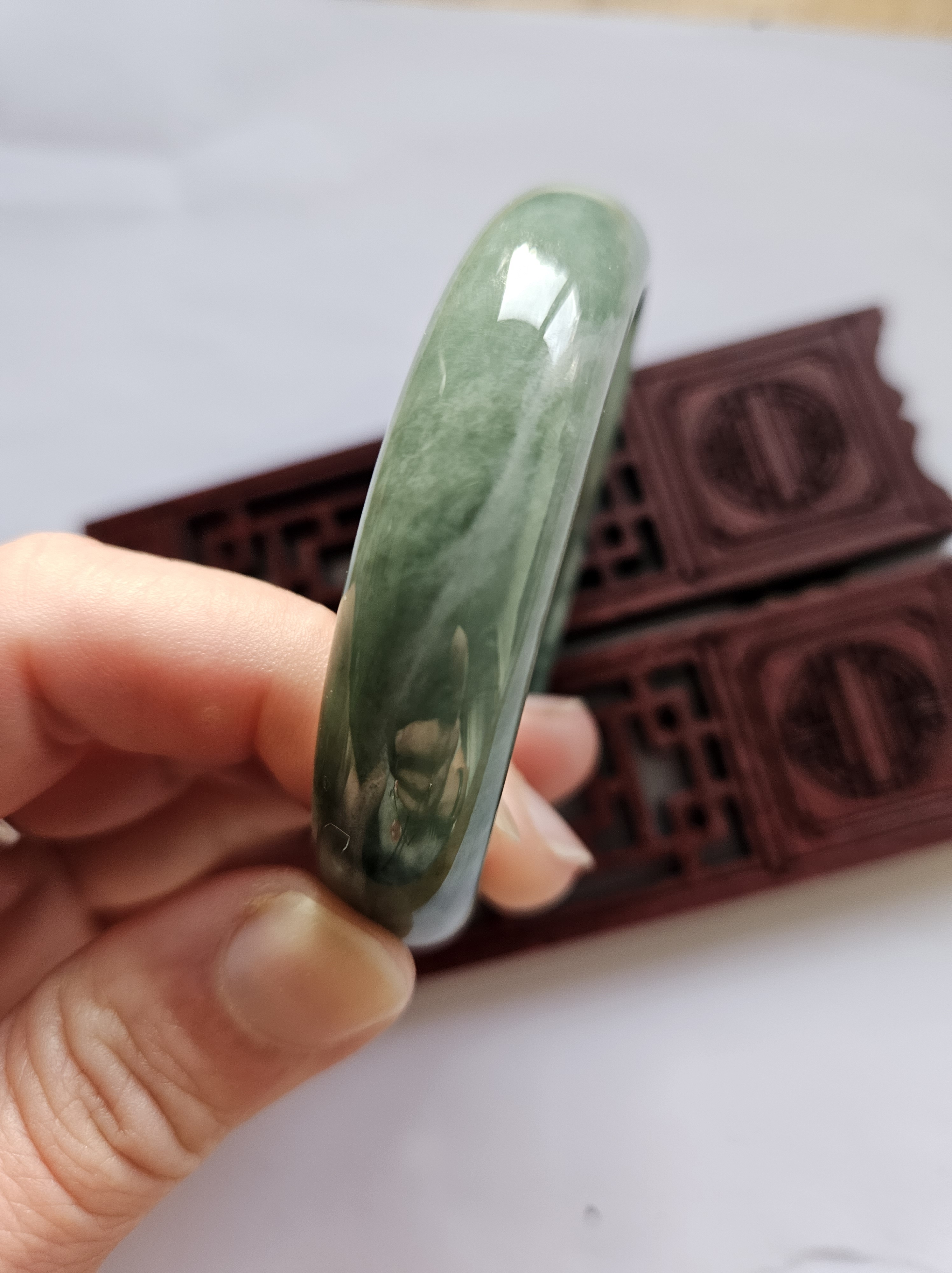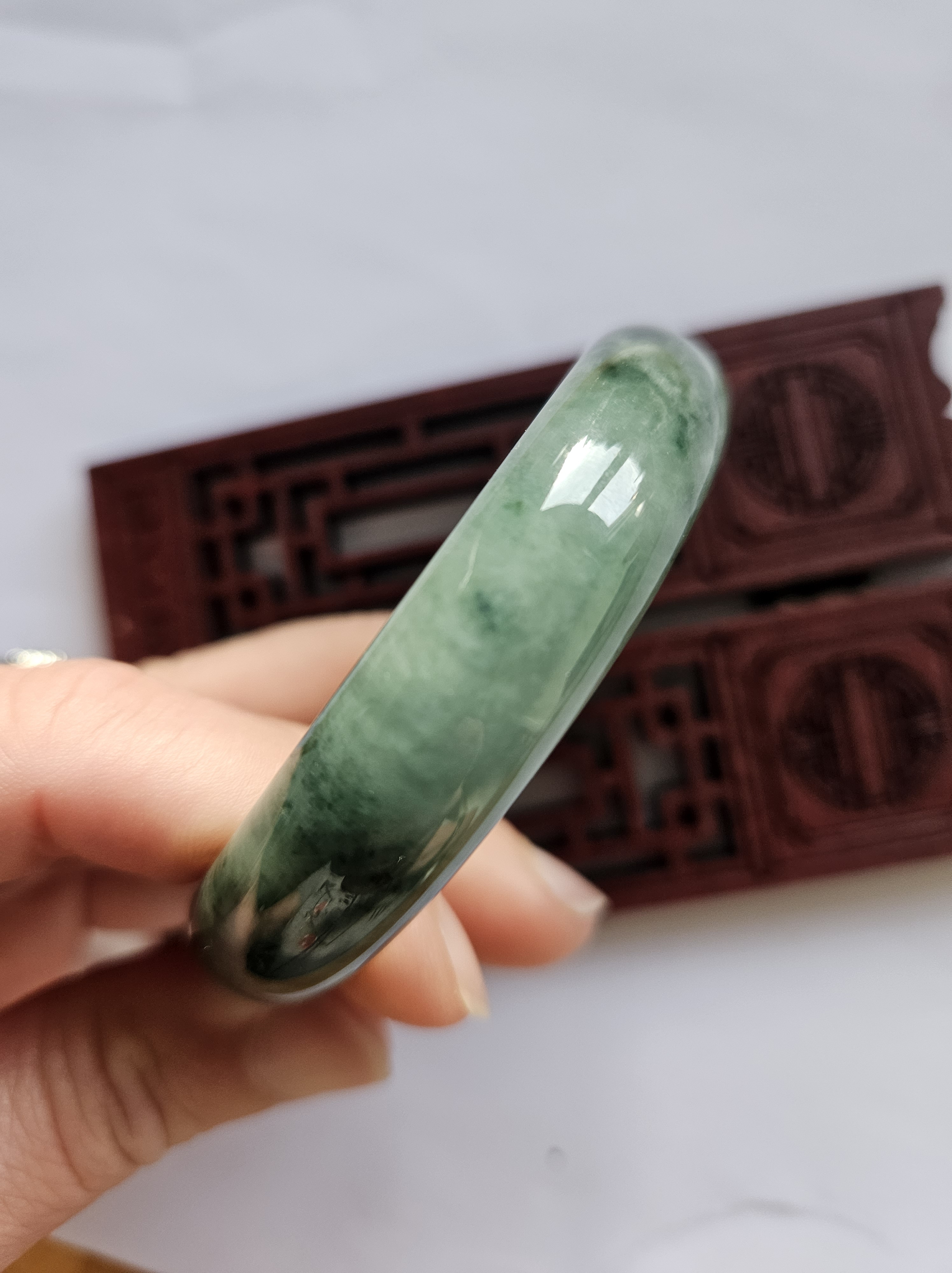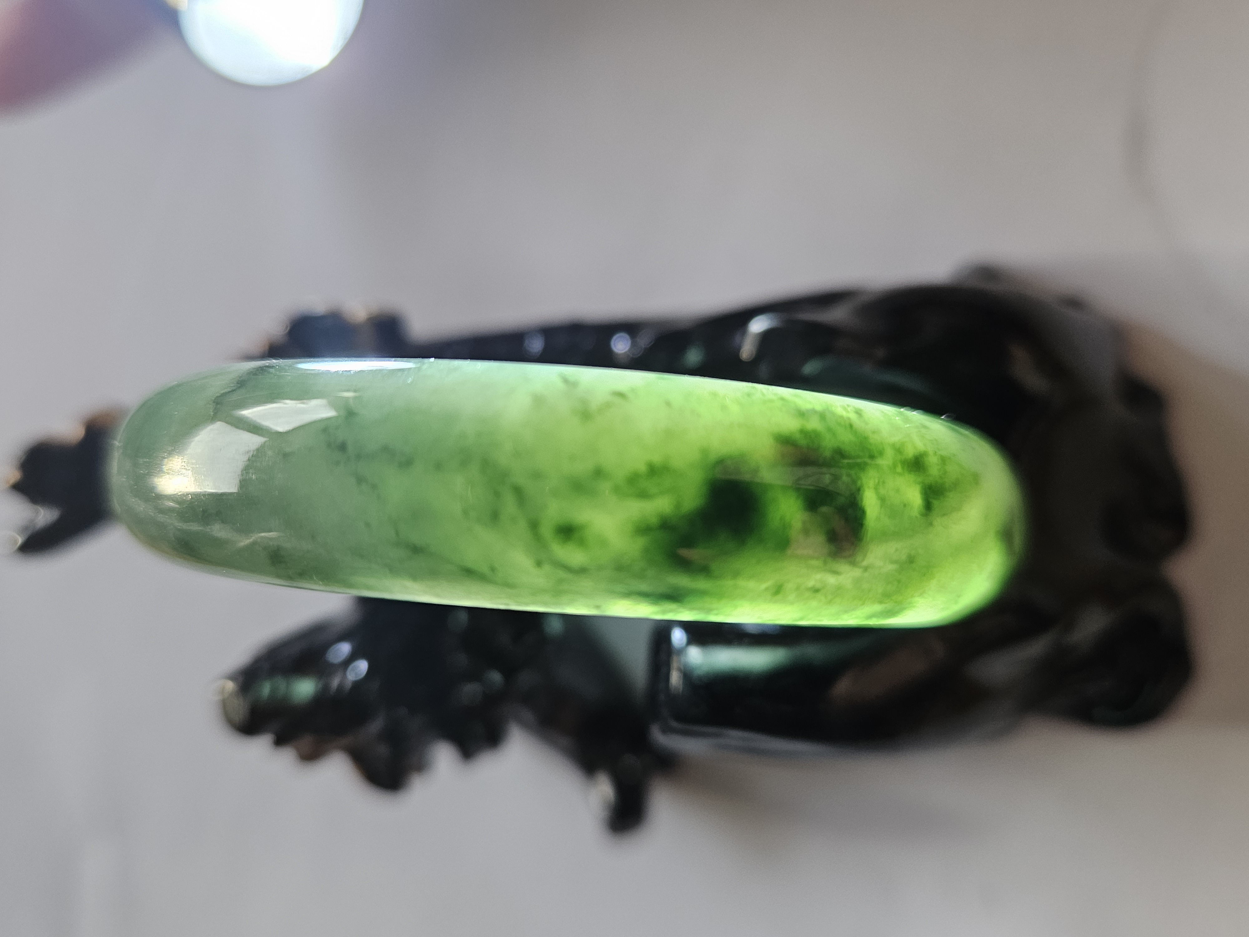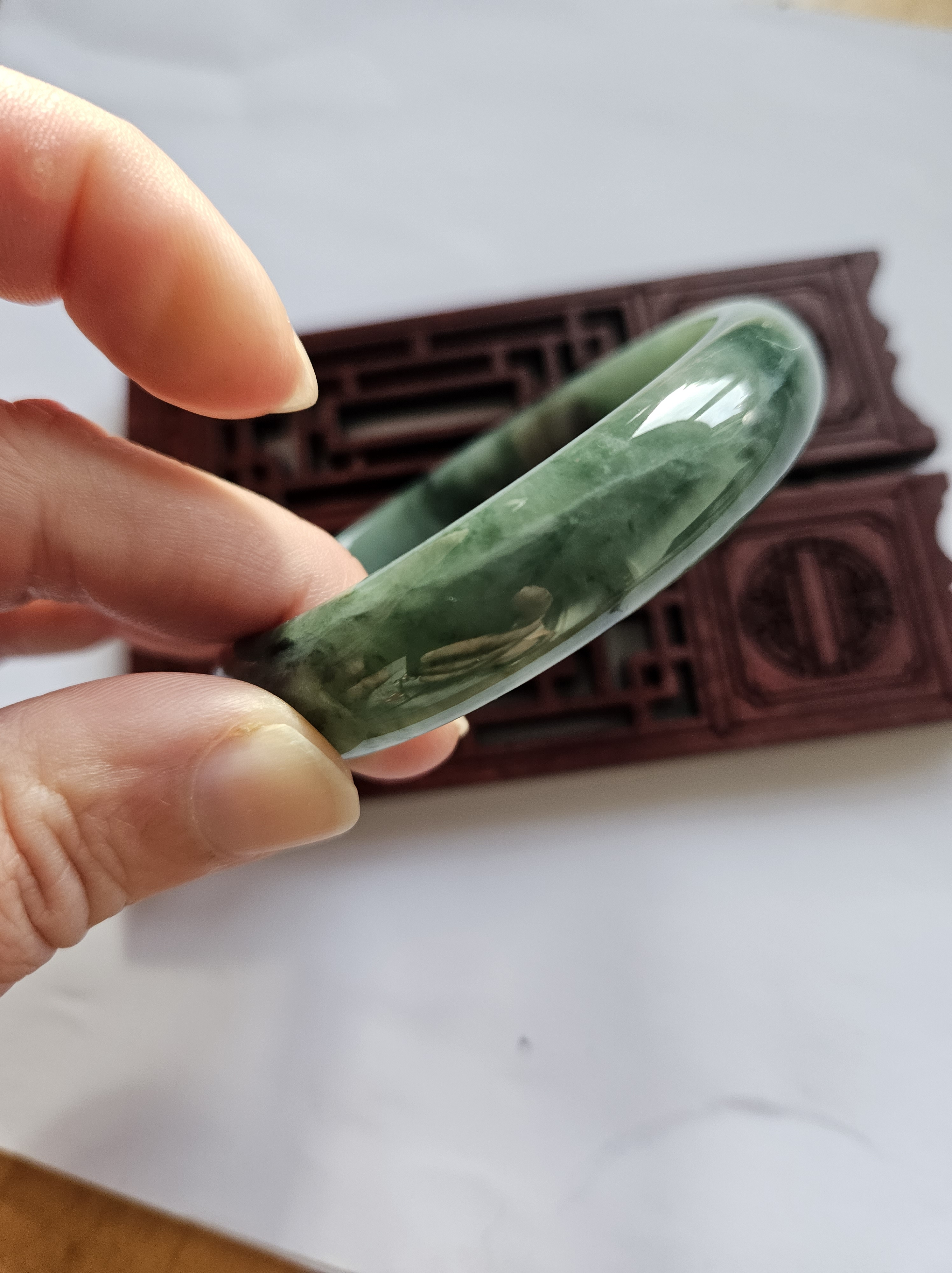 Lovely full green bangle with darker green blooms measures 56.6 x 13.3 x 7.1mm, weighs 49.2g, has a long colour line which makes it unique. Comes with a certificate of authenticity £158