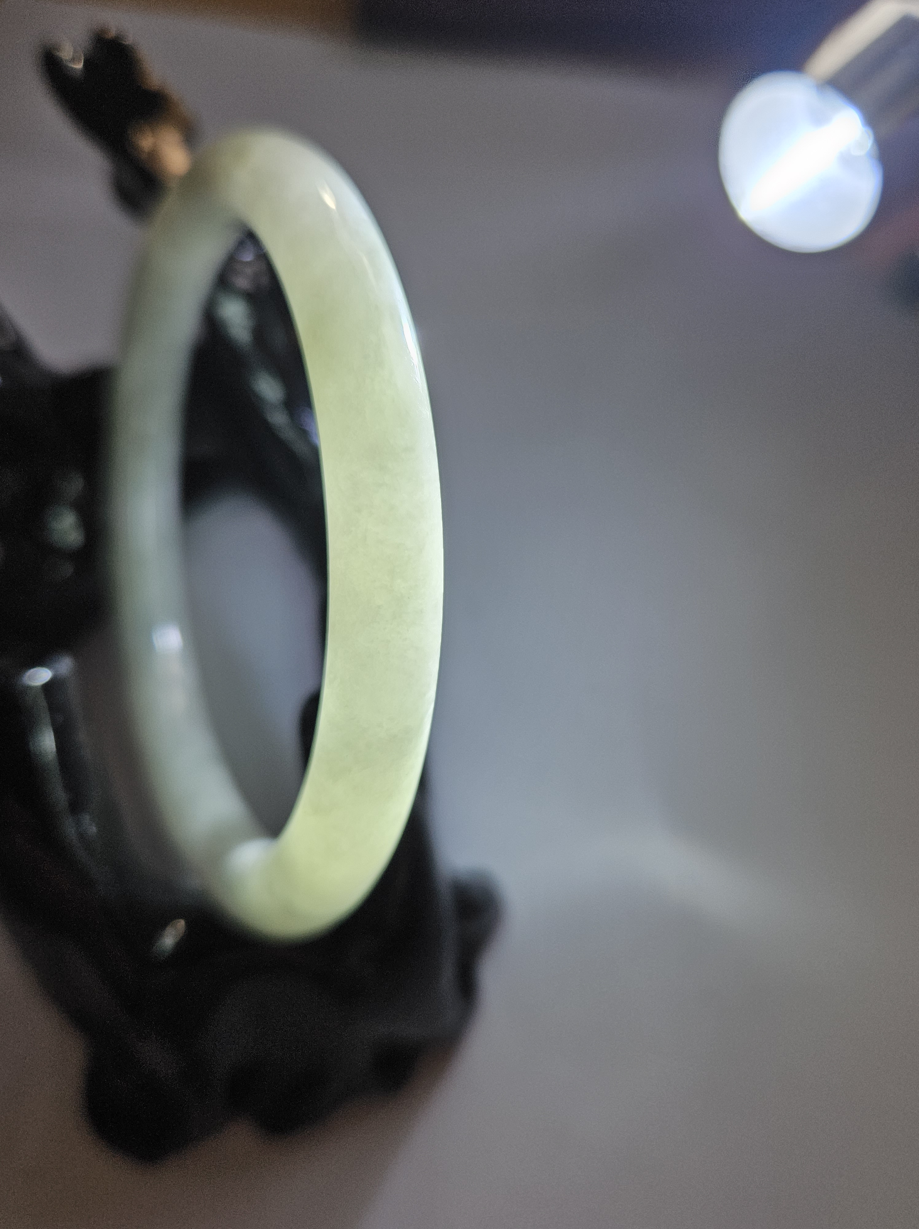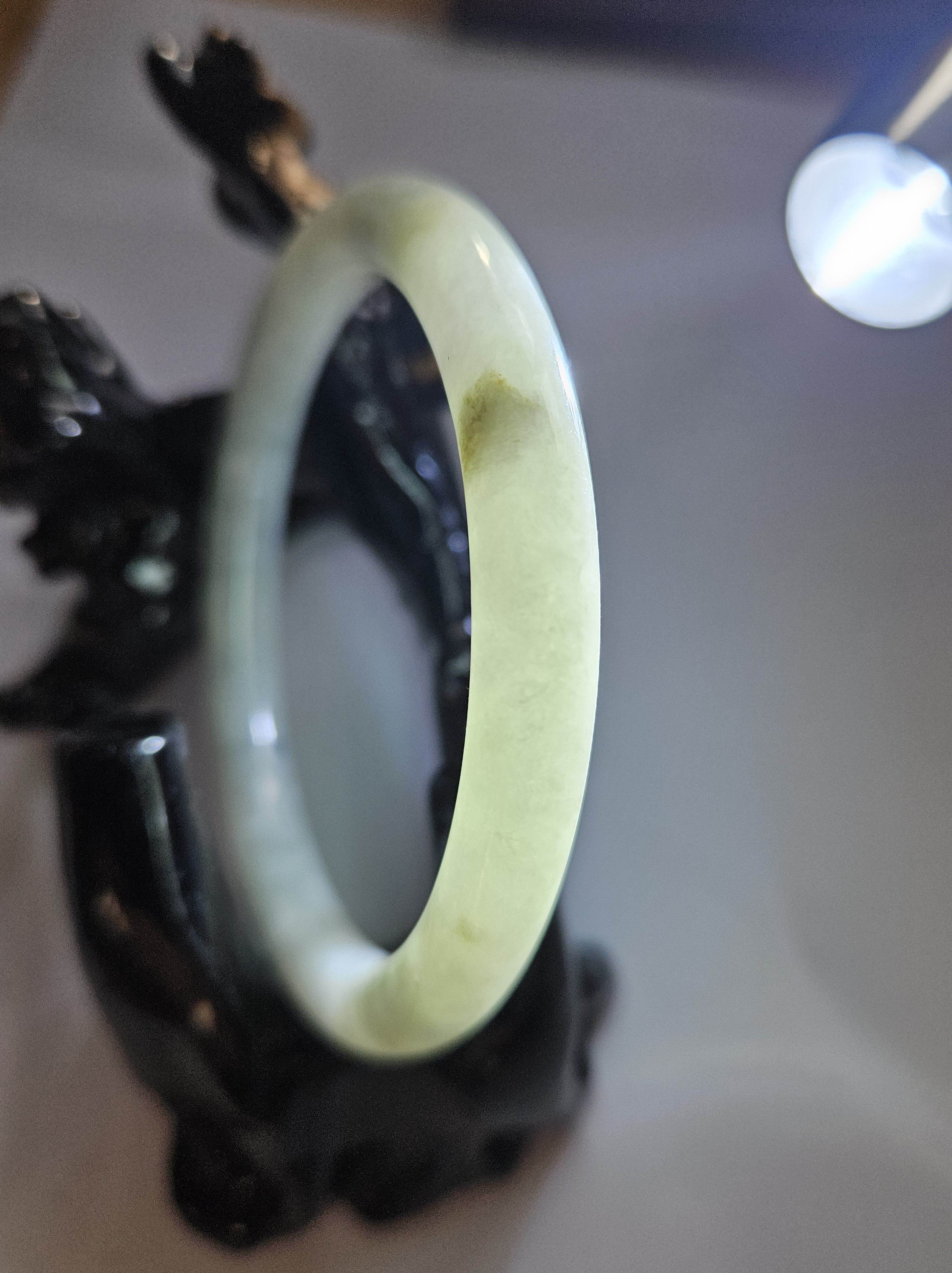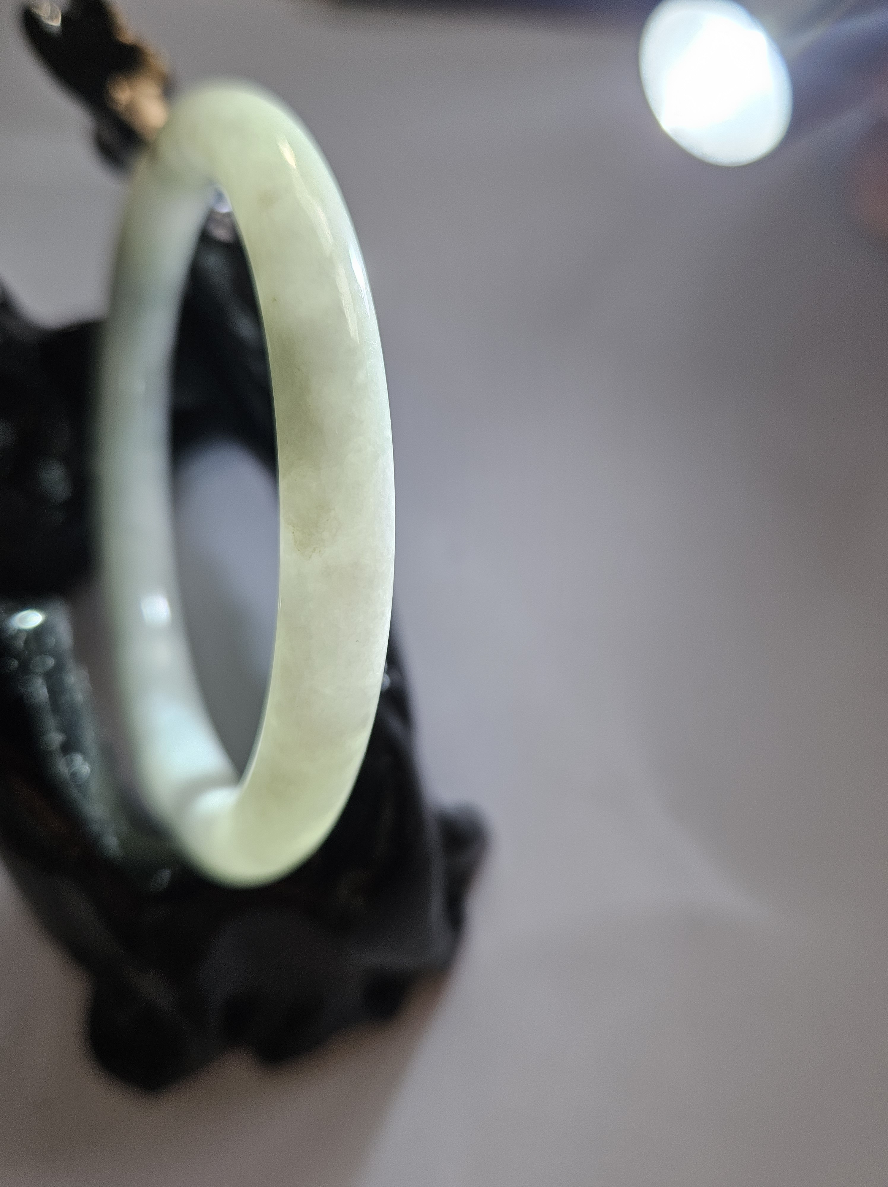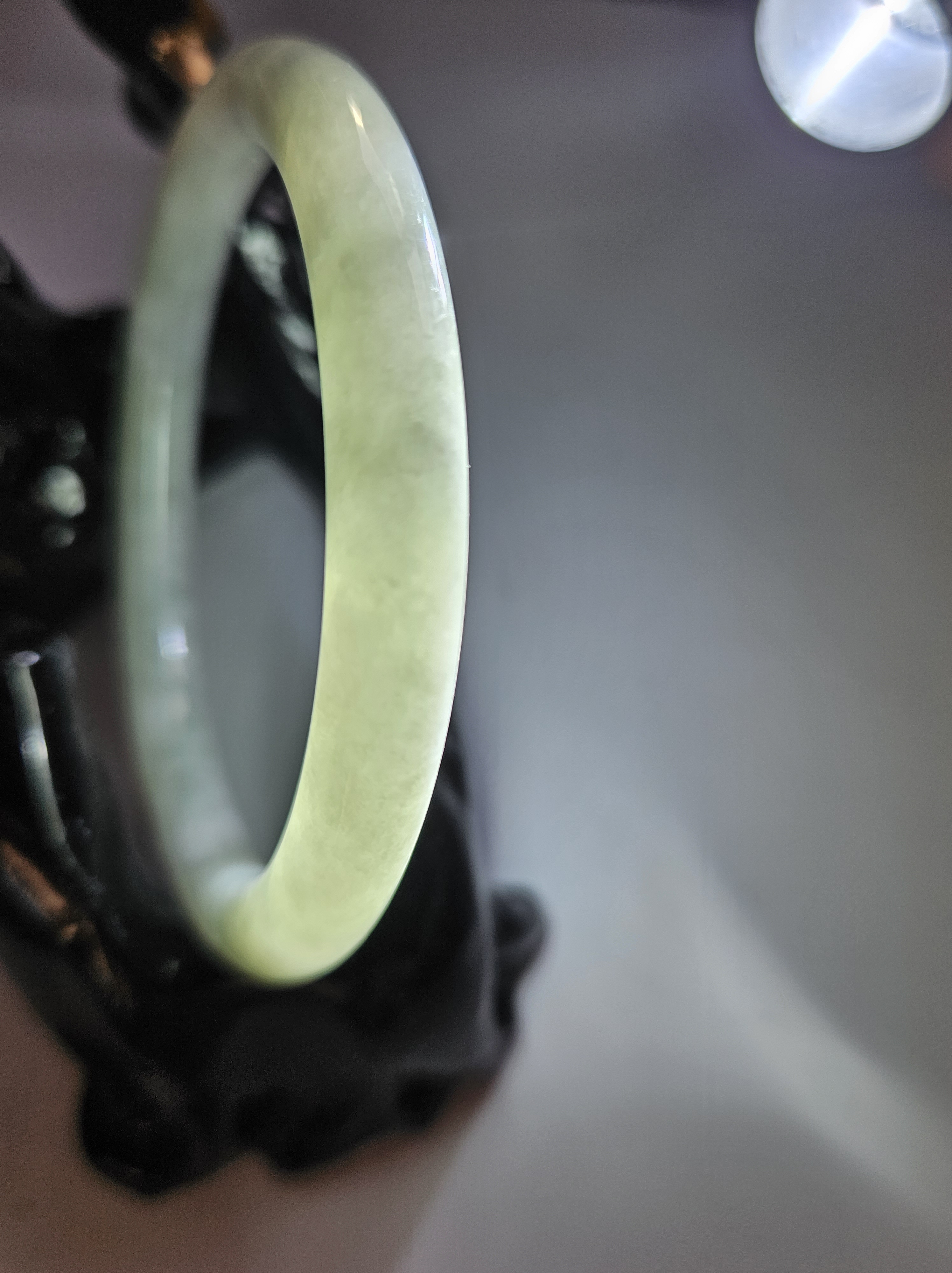 Lovely light green jadeite bangle with autumnal blooms but has a small patch of rough spot that was the skin of the stone but does not affect usage, fits up to 46mm, measures 54.2 x 7.4 x 7.5mm, weighs 28.60g, comes with a certificate of authenticity £89