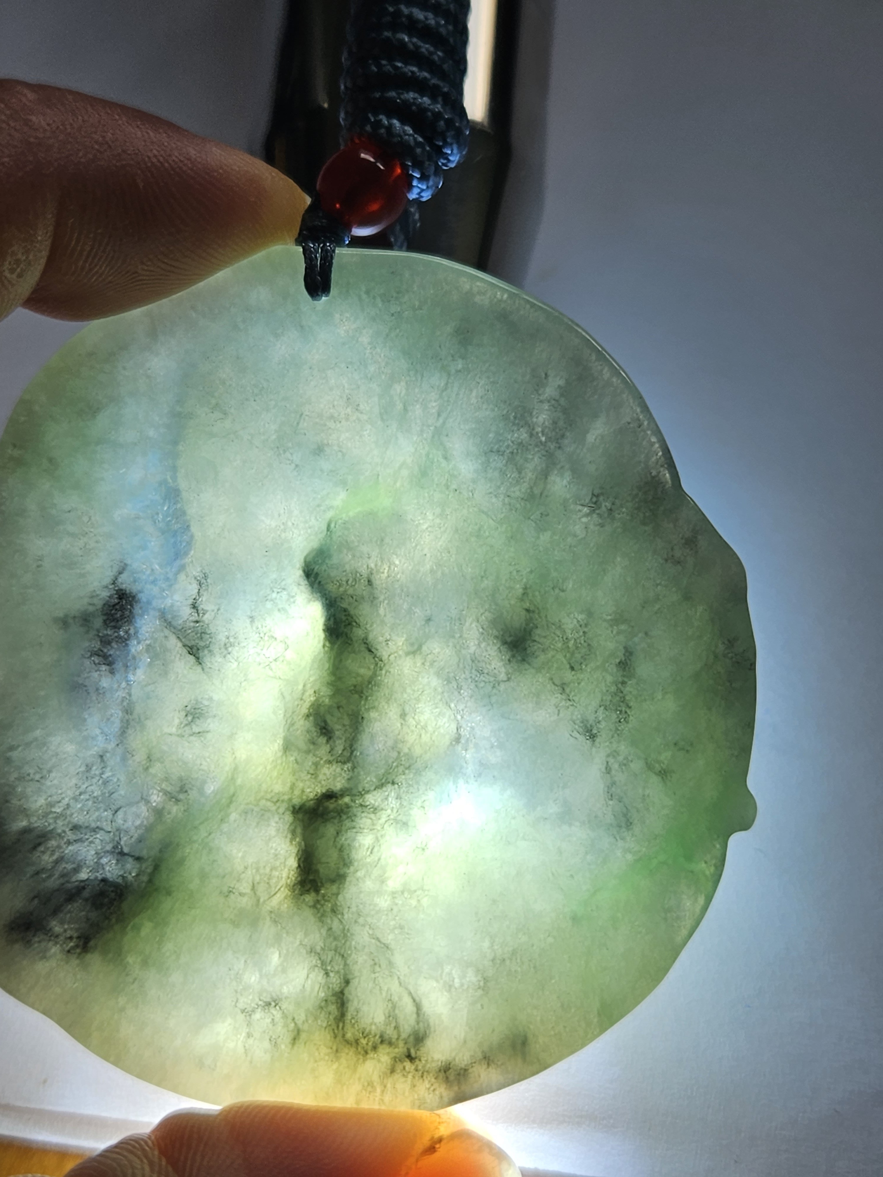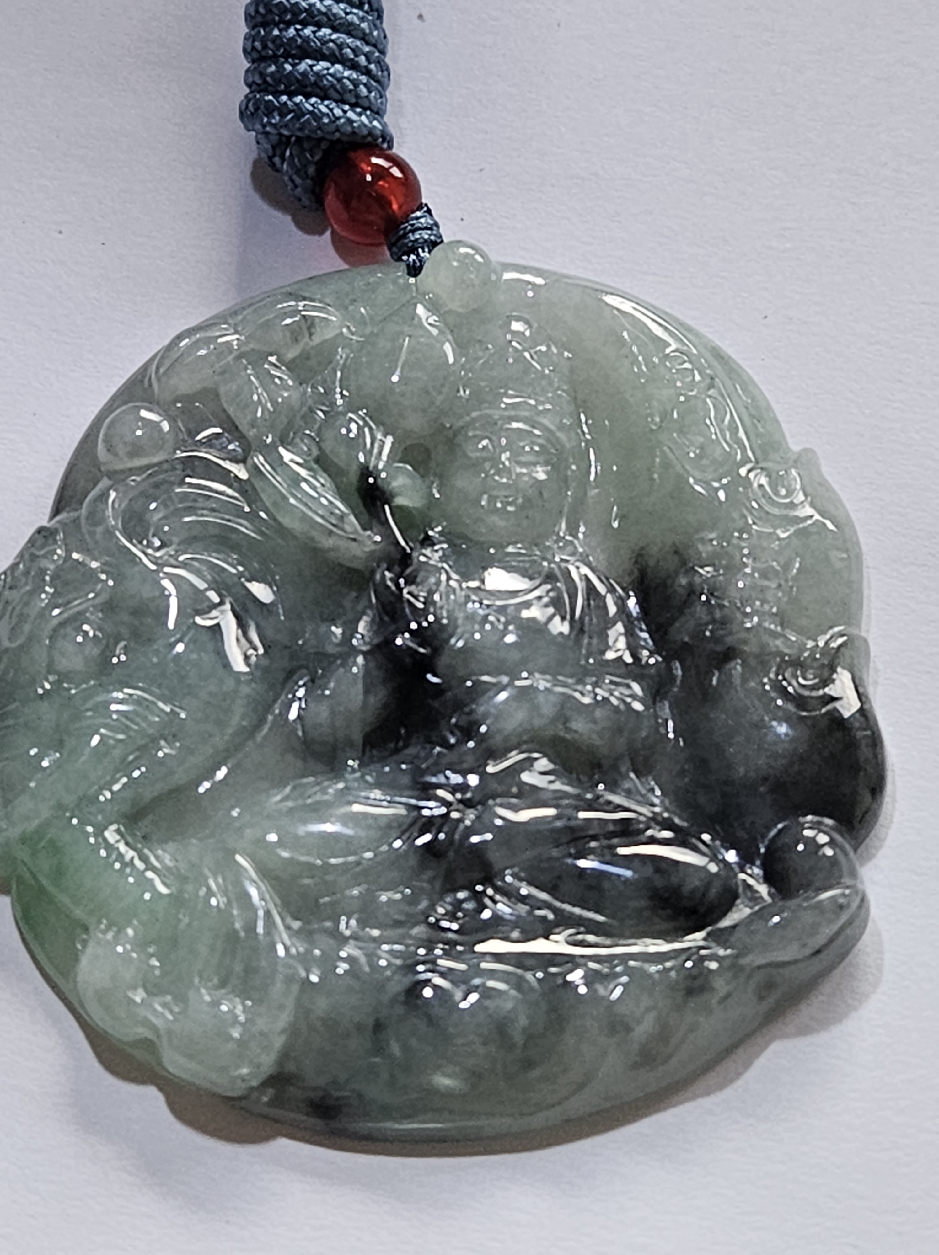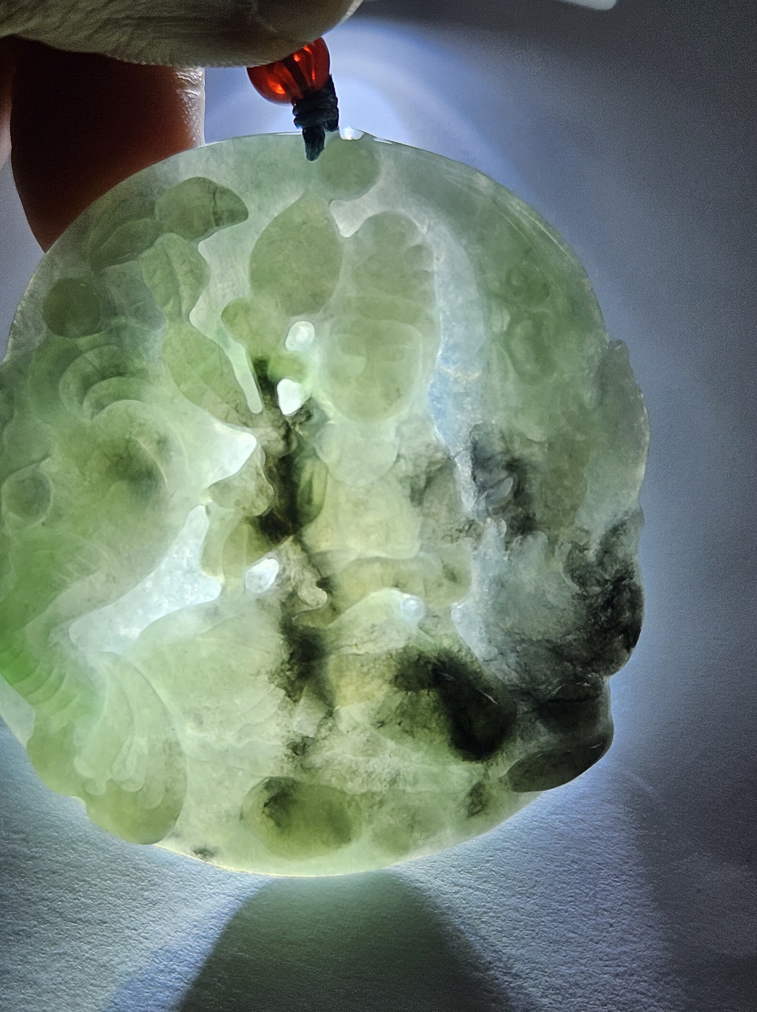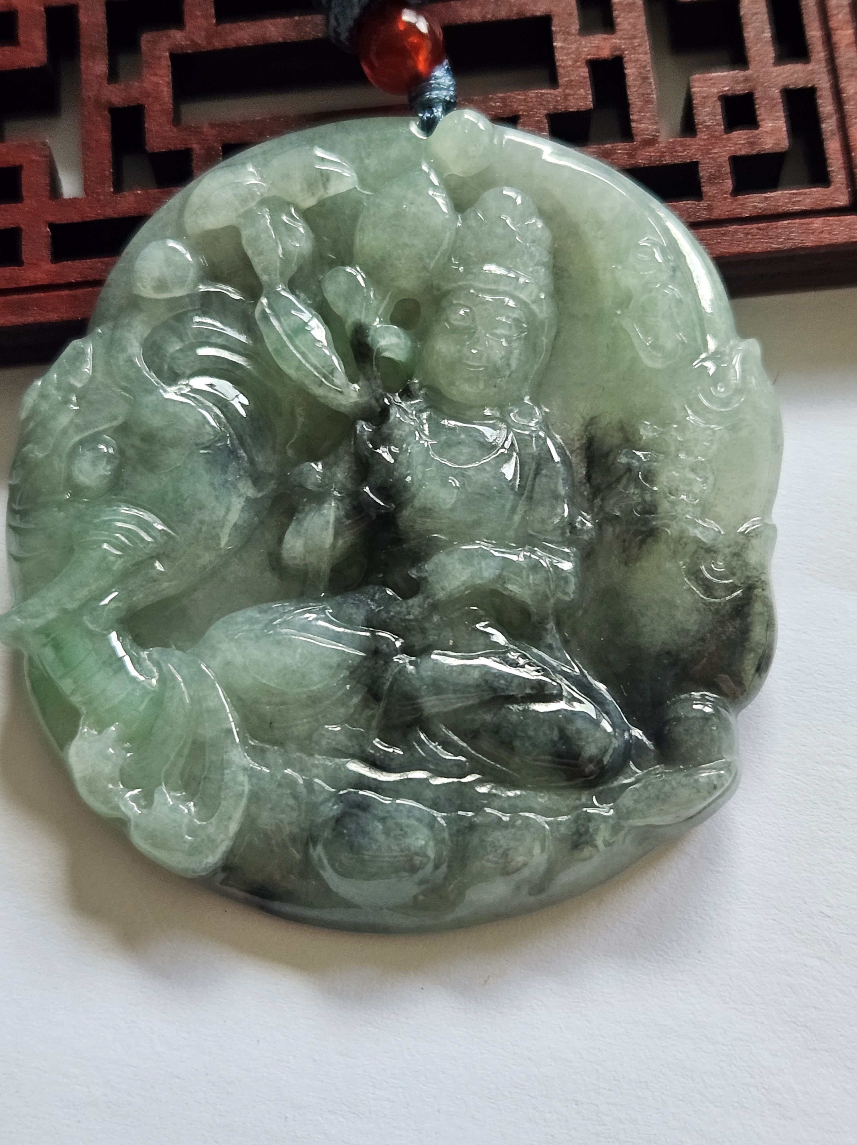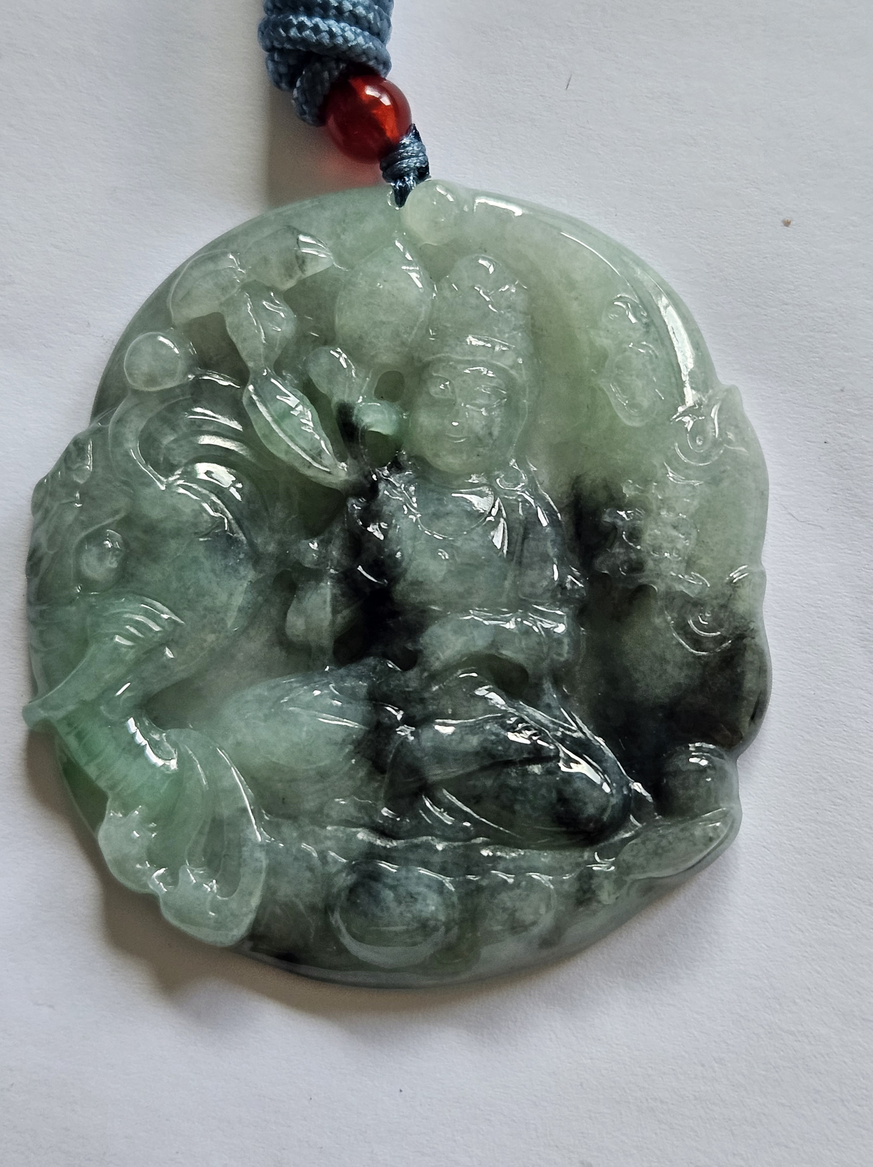 The necklace comes on an adjustable string chain, the pendant is made of Burmese jade, engraved with Samantabhadra riding on an elephant. Measures 54.4 x 53.8 x 5.8mm, light green with smoky grey blooms, weighs 34.66g, comes with a certificate of authenticity £69