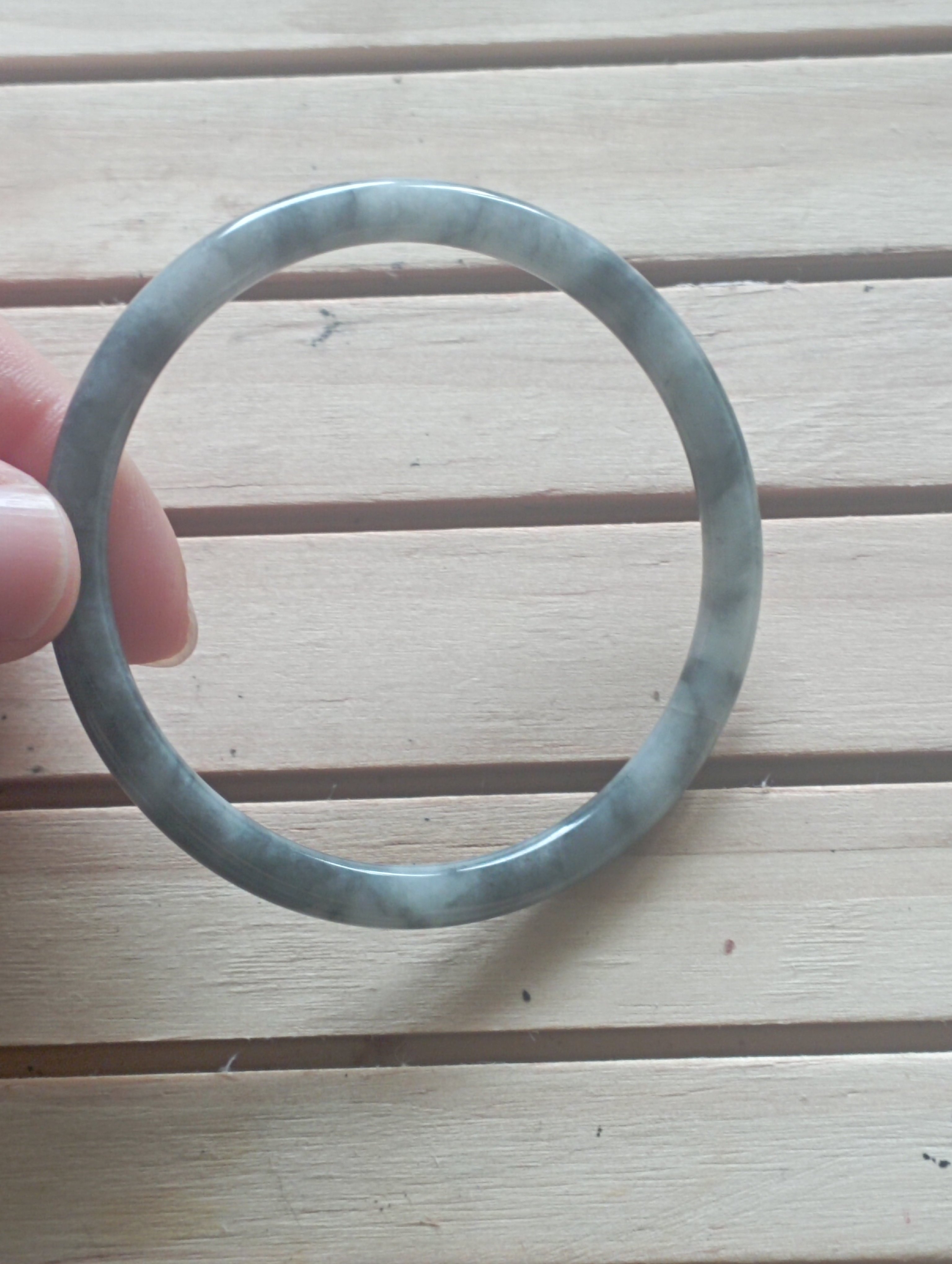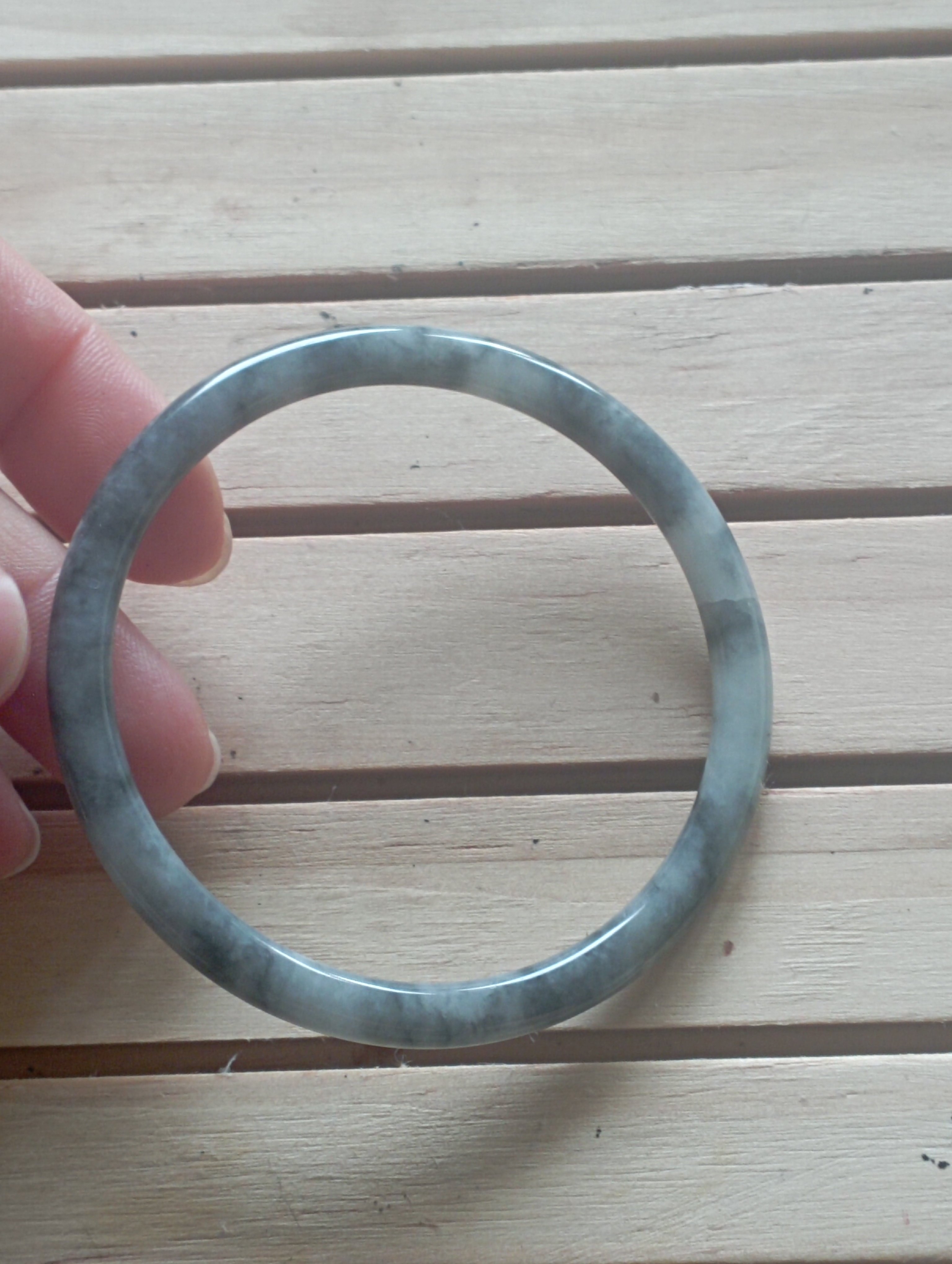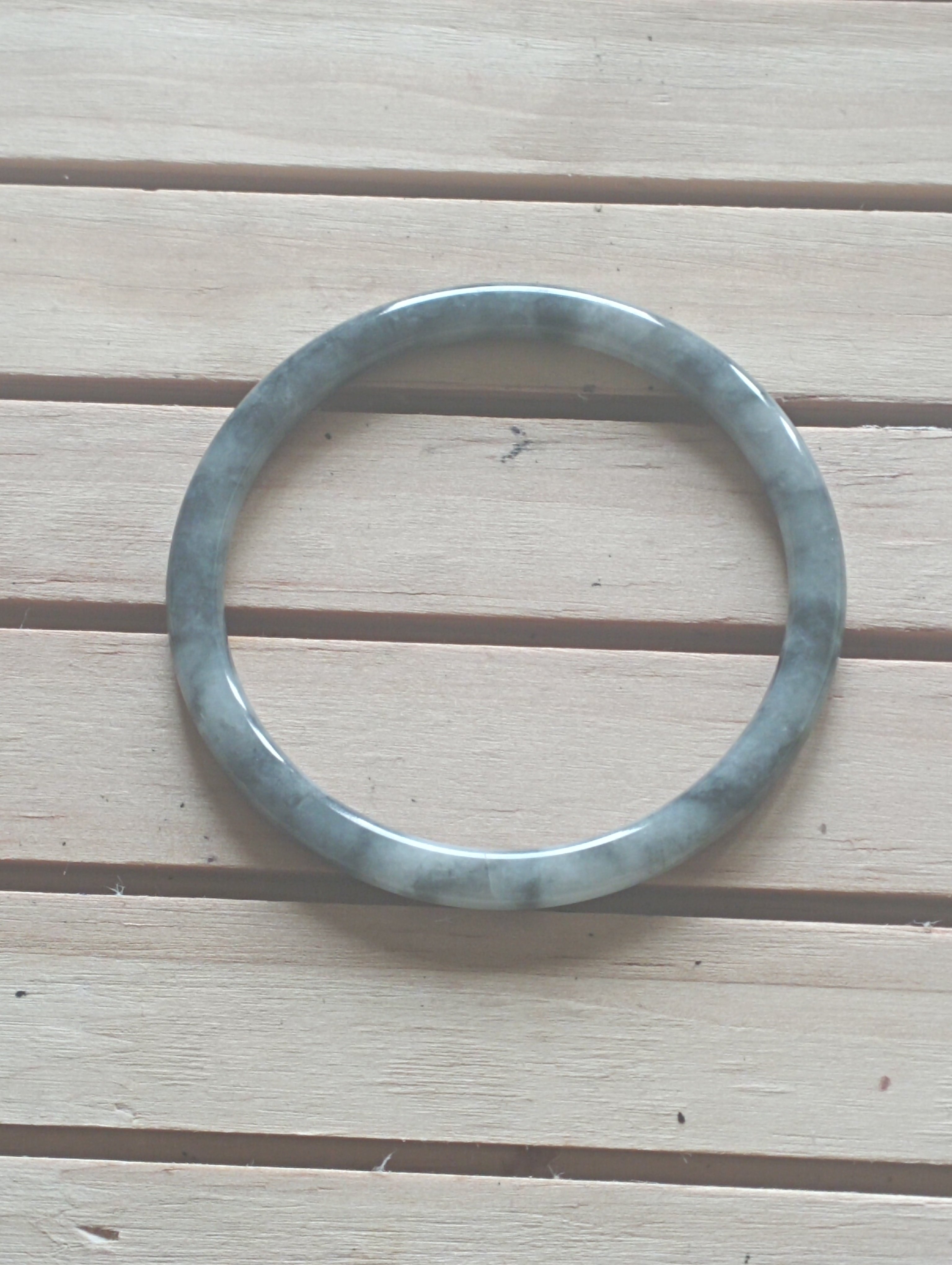 Icy smoky grey jadeite bangle measures 55.3 X 4.8 X 6.7mm, weighs 14.5g, fits up to 57mm. Can be paired with a similar size and colour to form a pair of ding dang so called due to the sound they make when tinkling together. Comes with a certificate of authenticity £69