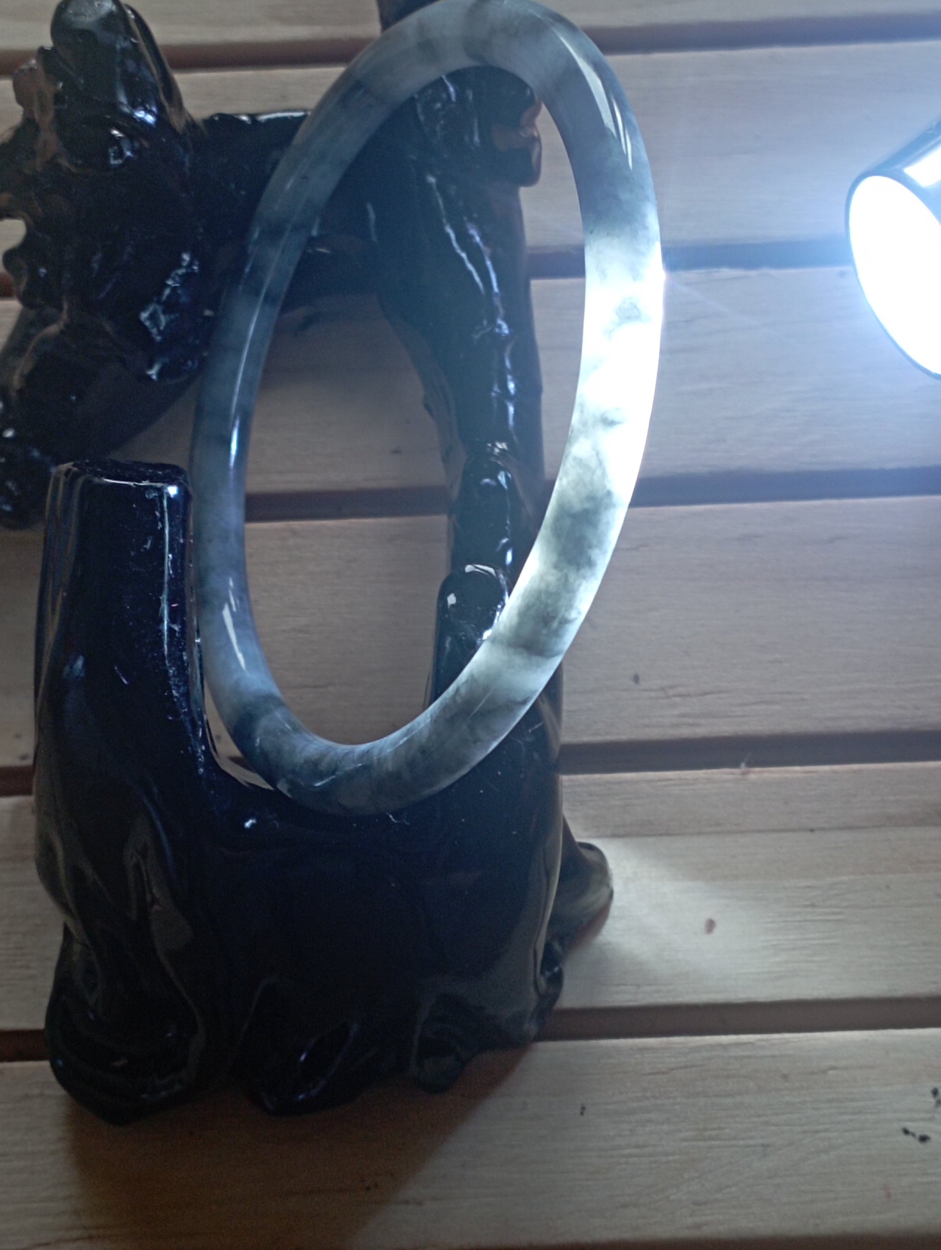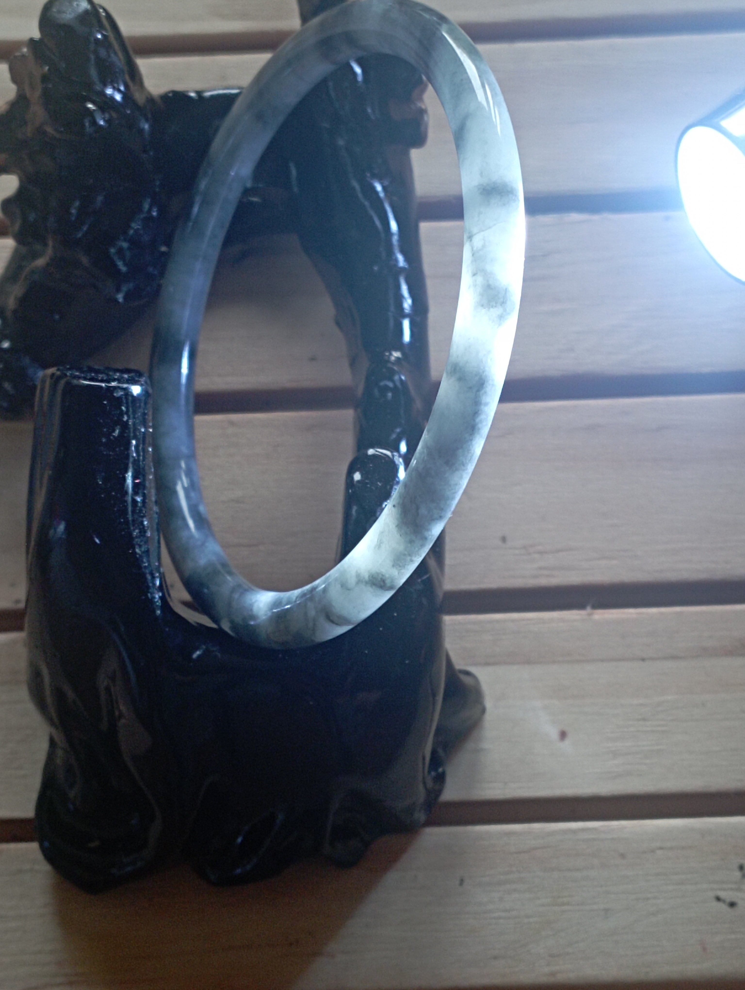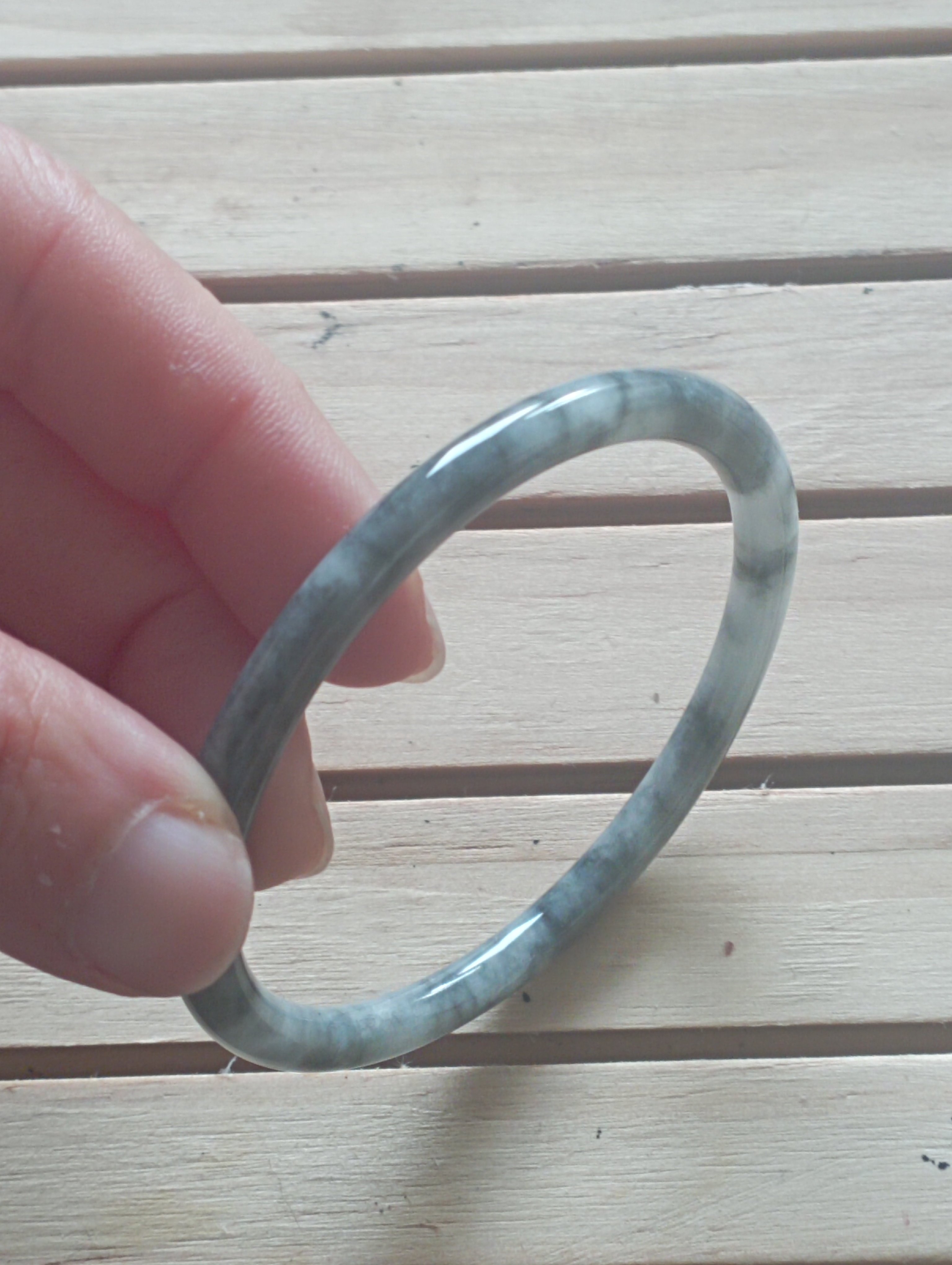 Icy smoky grey jadeite bangle measures 55.3 X 4.8 X 6.7mm, weighs 14.5g, fits up to 57mm. Can be paired with a similar size and colour to form a pair of ding dang so called due to the sound they make when tinkling together. Comes with a certificate of authenticity £69
