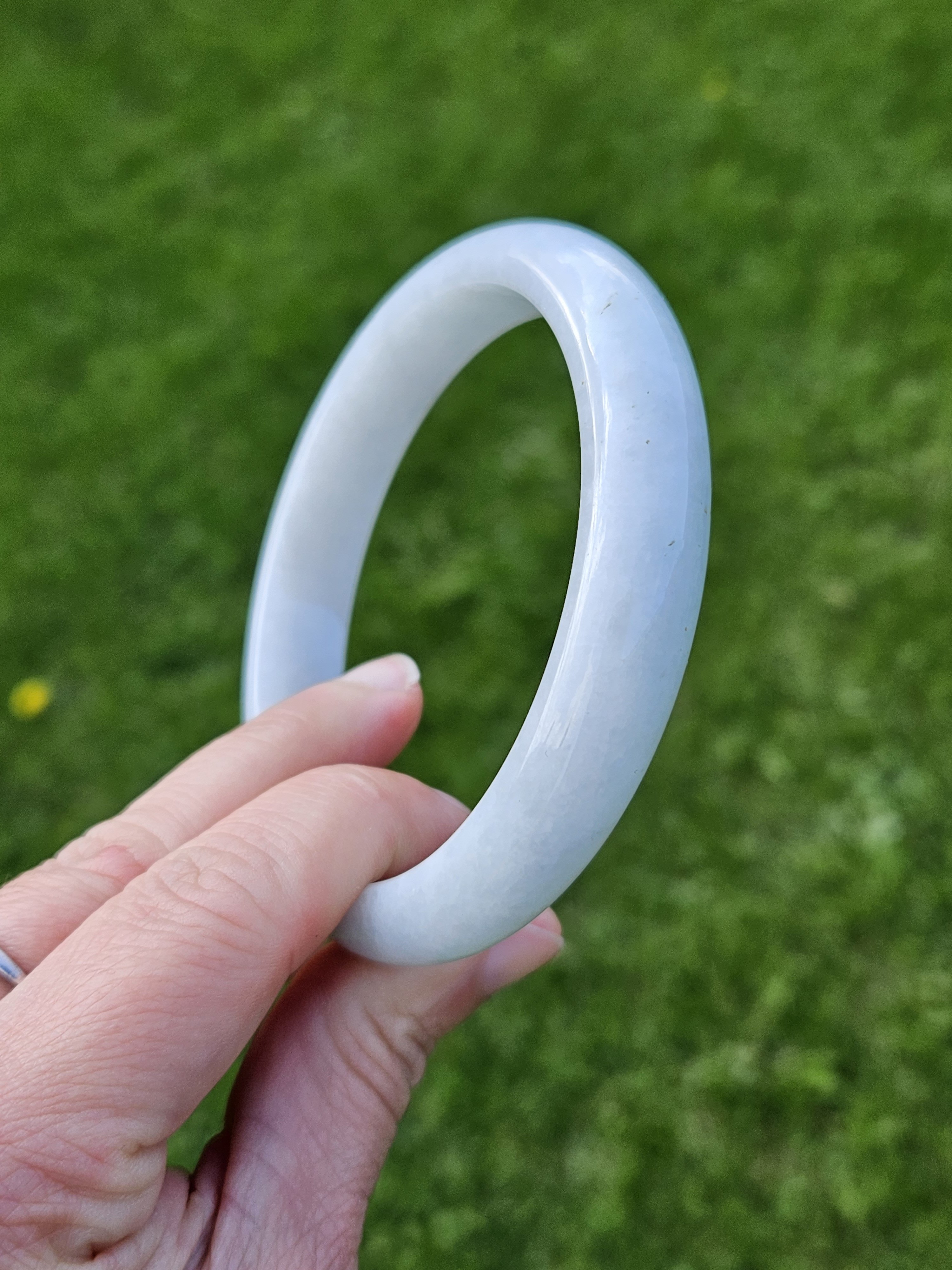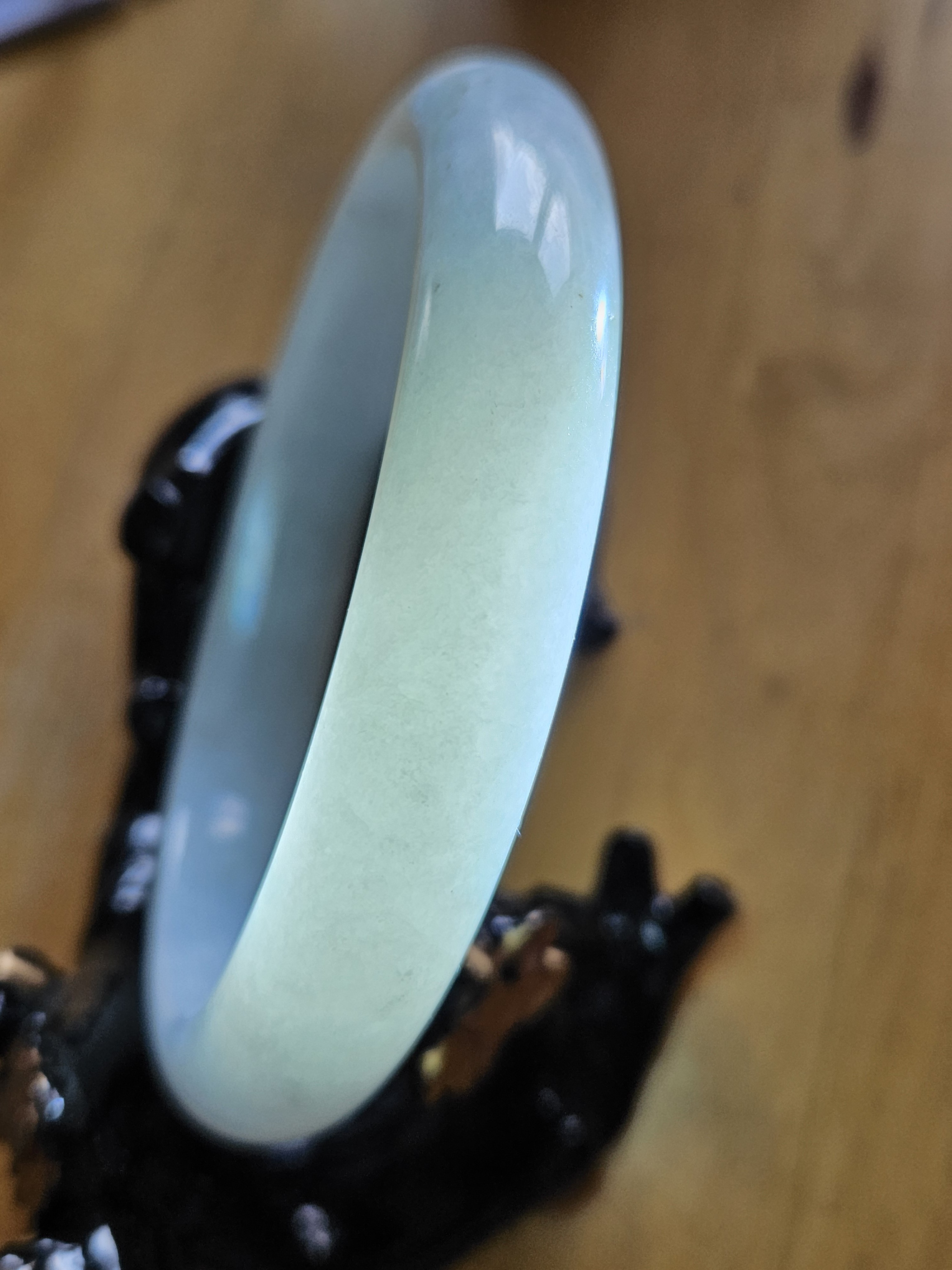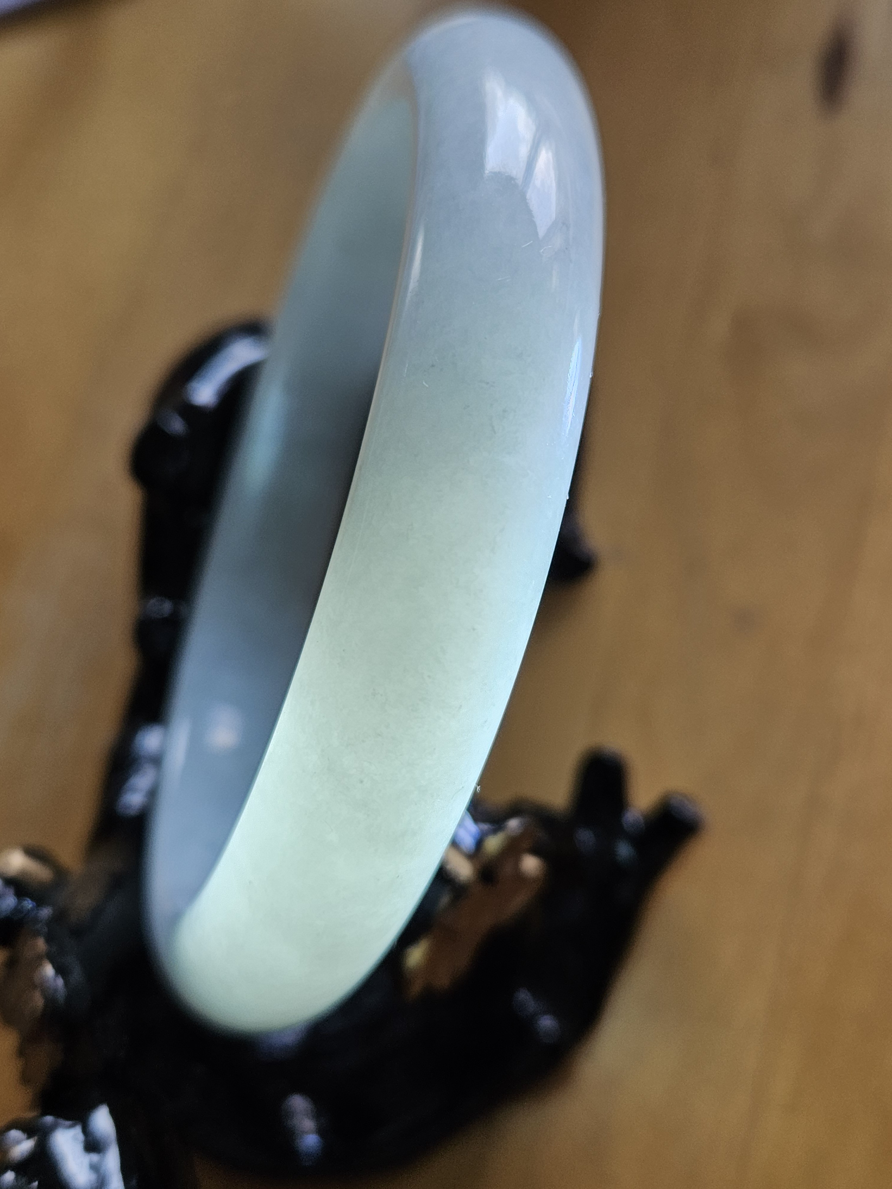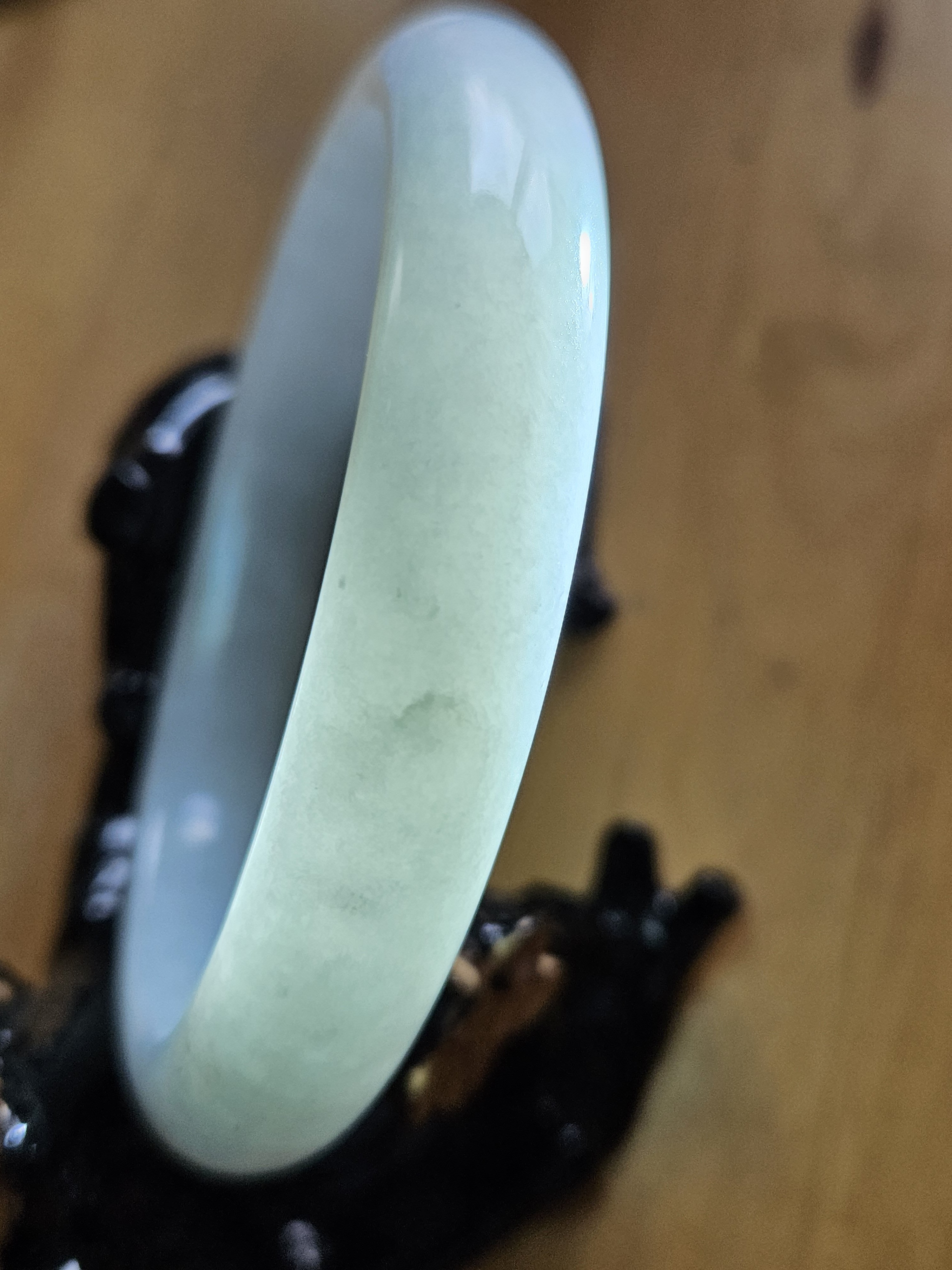 Made of Burmese jadeite, this light green bangle has a slight internal cracks that does not affect usage. Rare size at 66mm diameter, 12.7mm in width and 8.5mm thickness. Comes with a certificate of authenticity £298