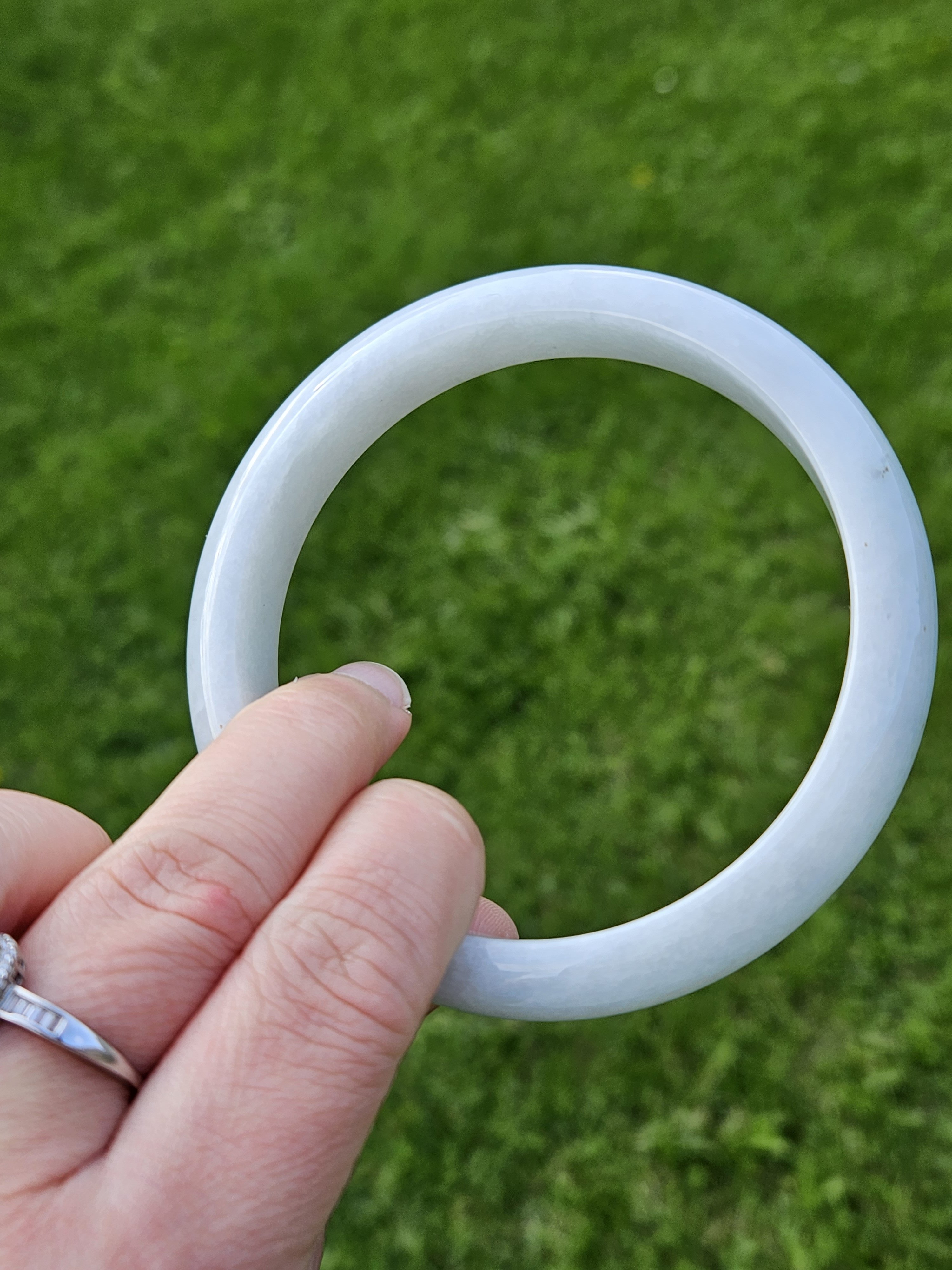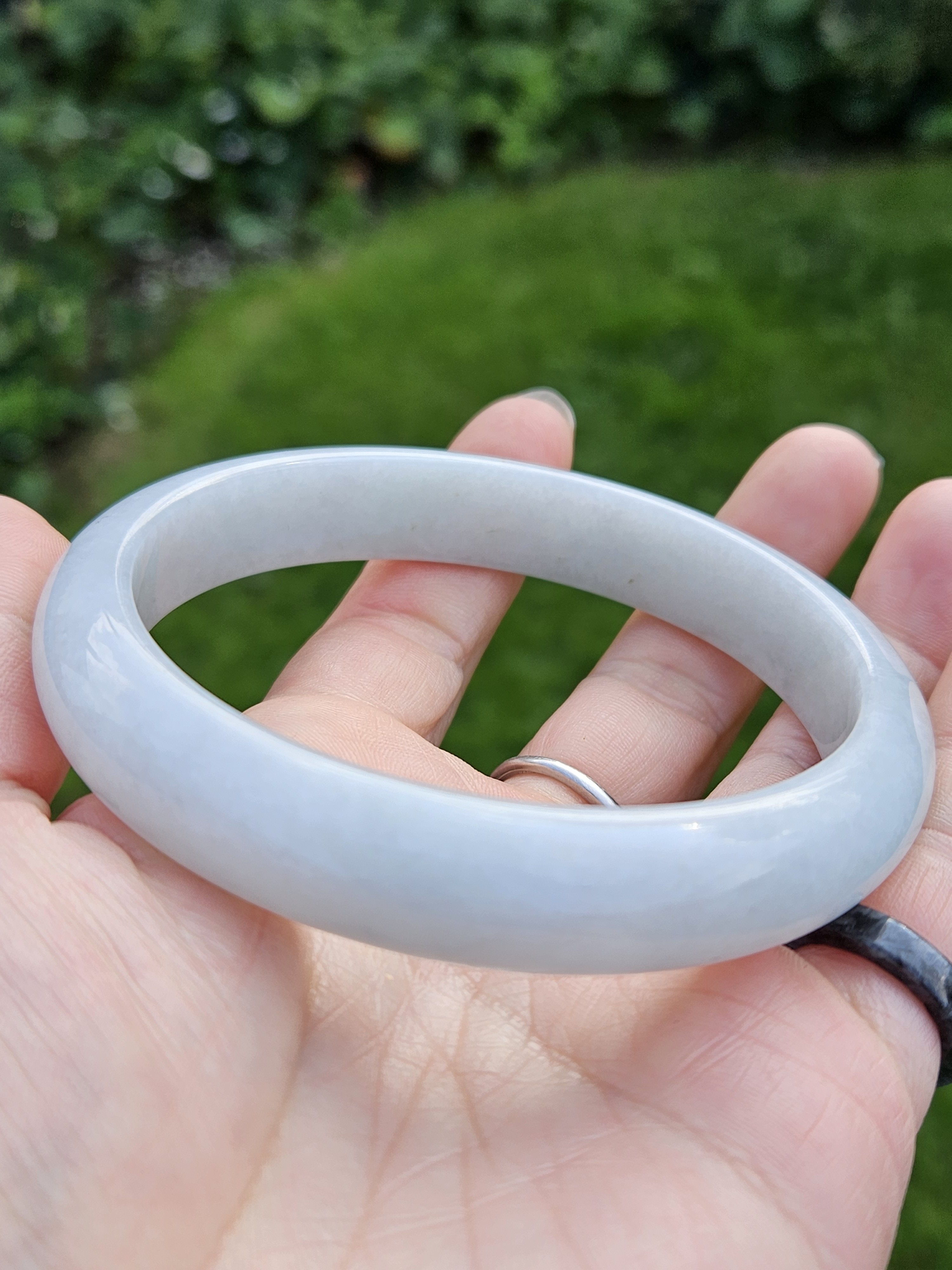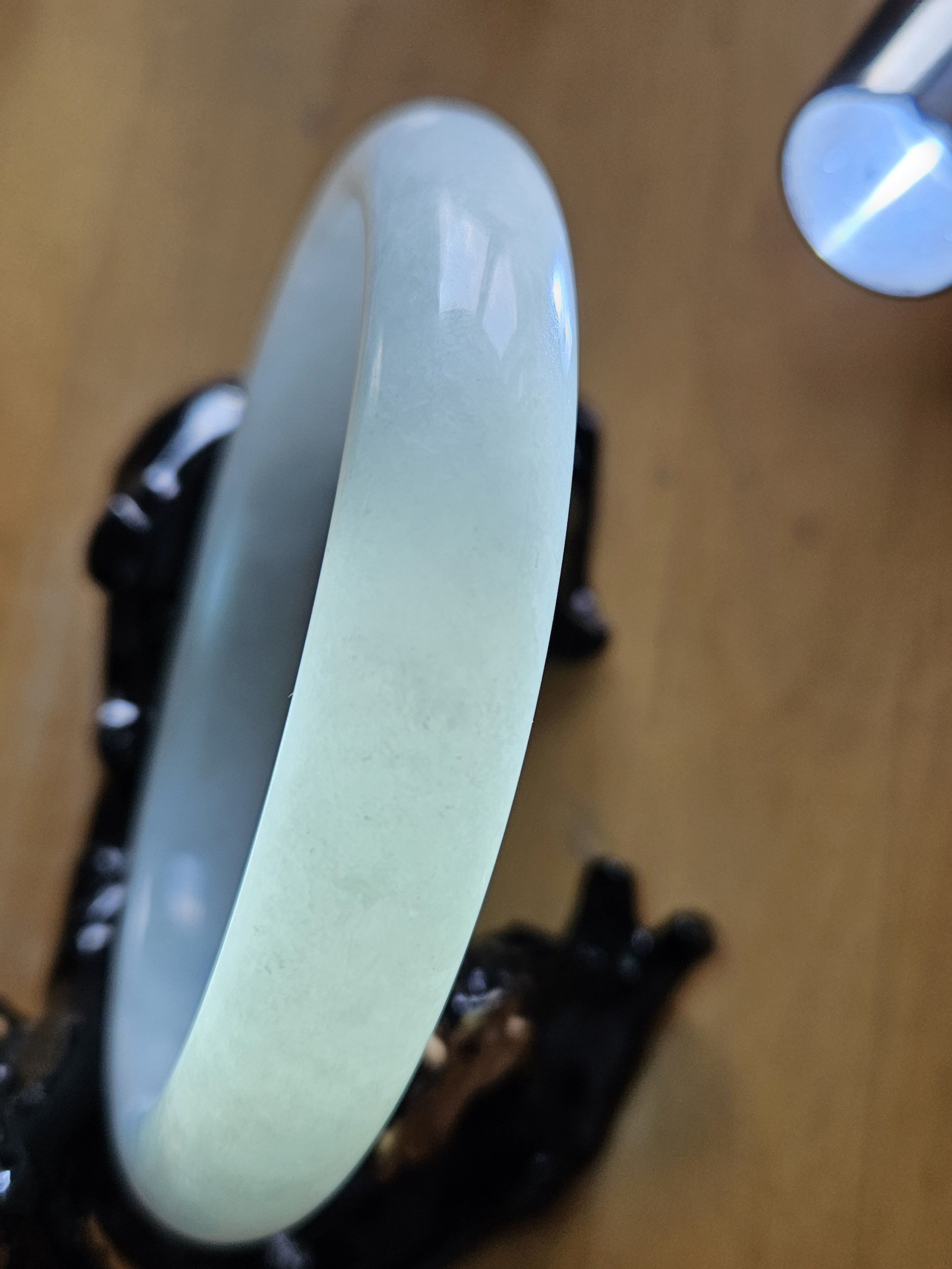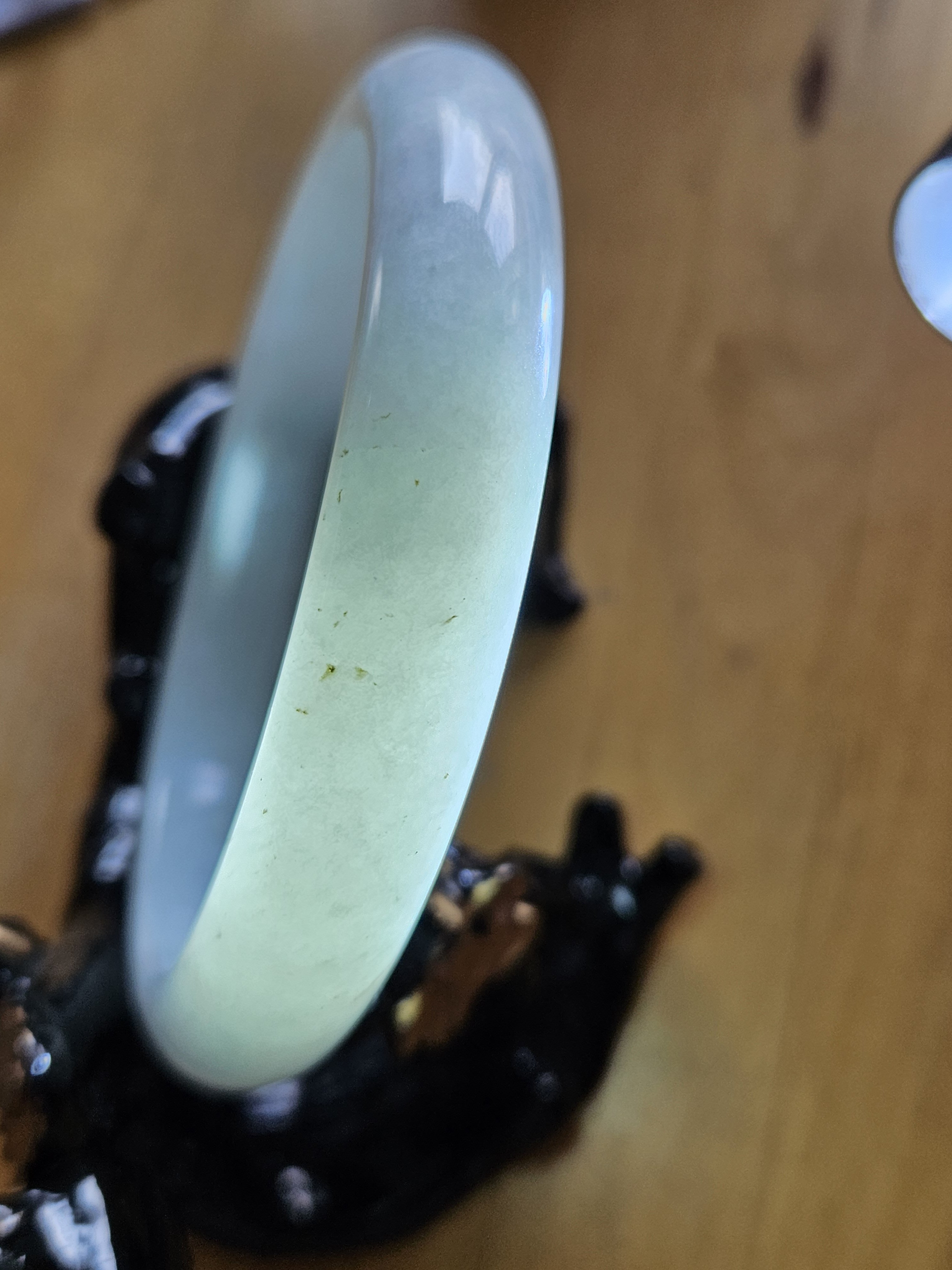 Made of Burmese jadeite, this light green bangle has a slight internal cracks that does not affect usage. Rare size at 66mm diameter, 12.7mm in width and 8.5mm thickness. Comes with a certificate of authenticity £298