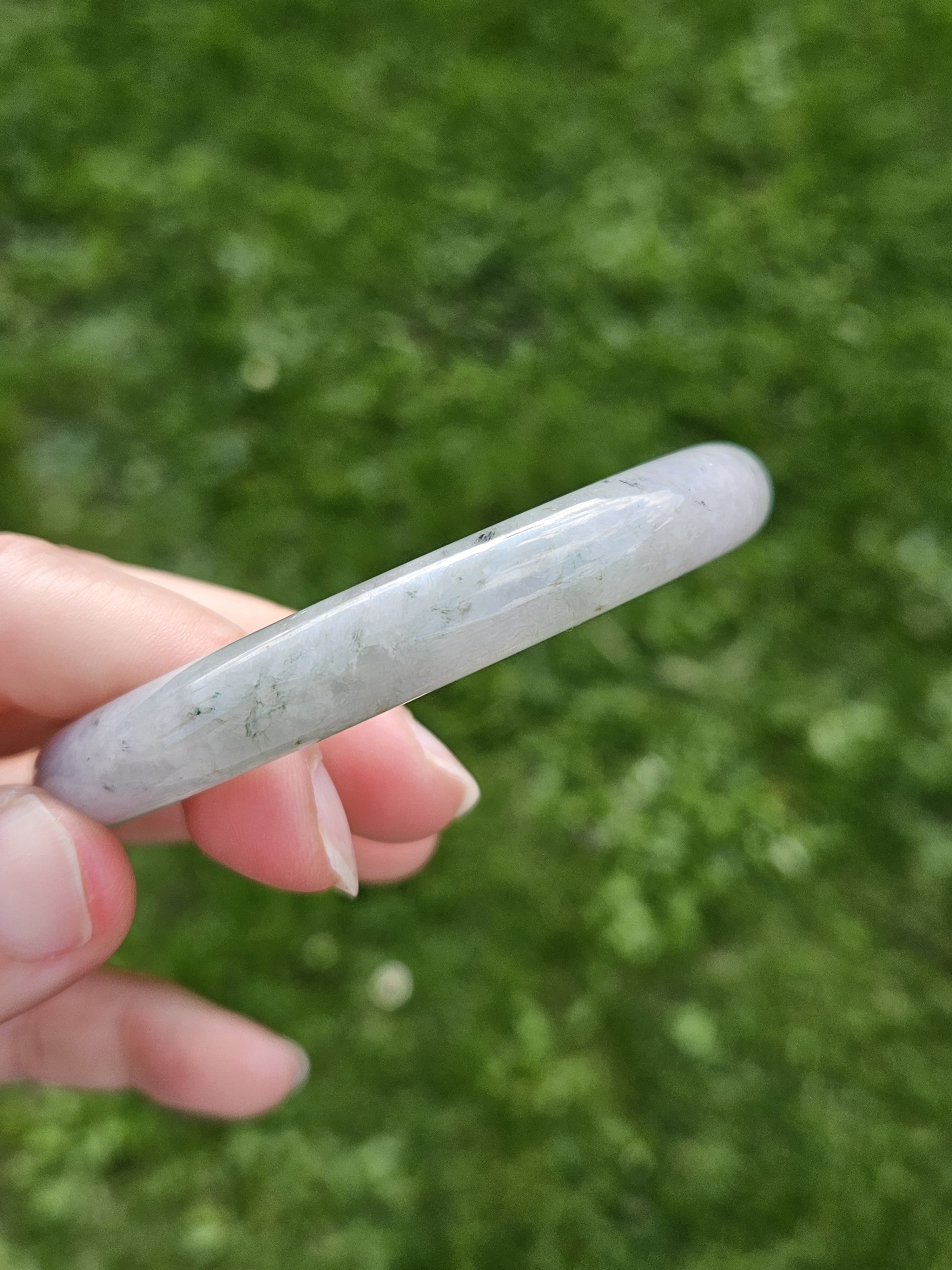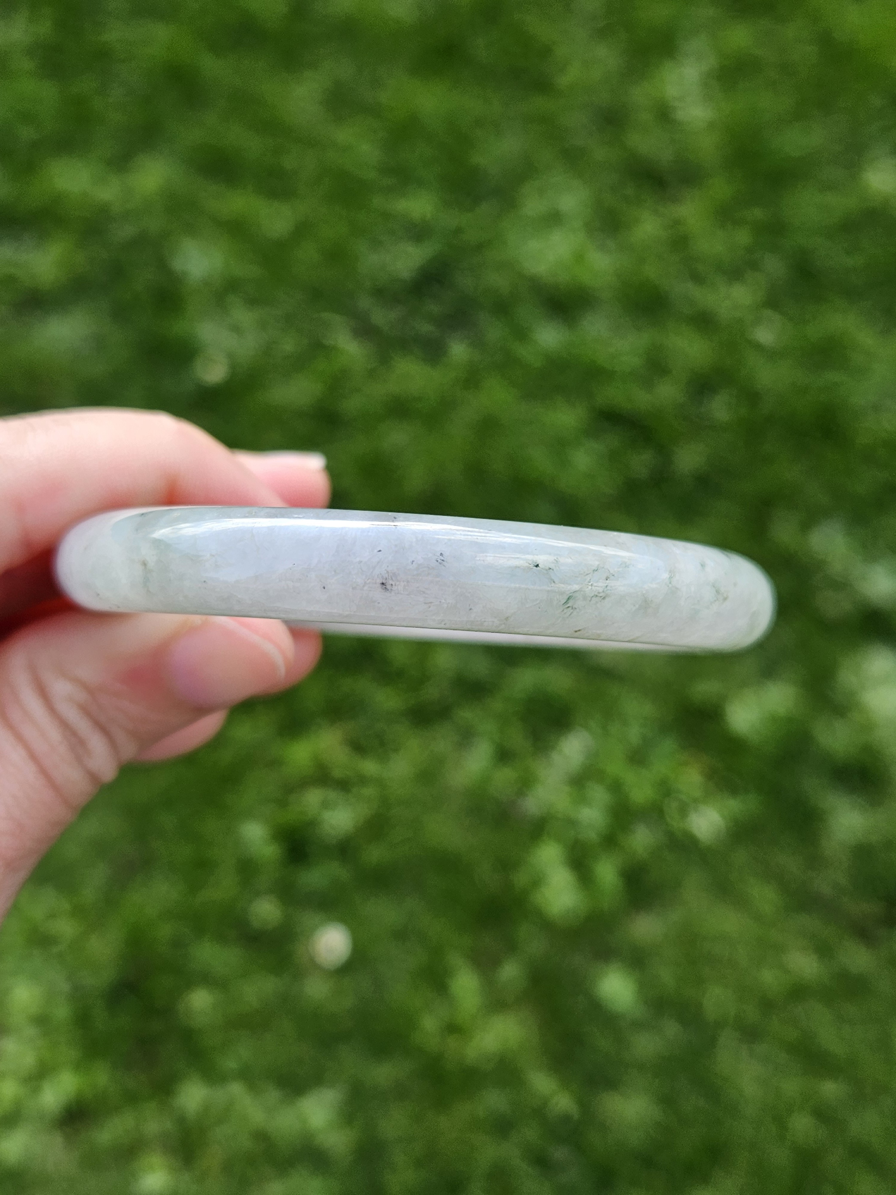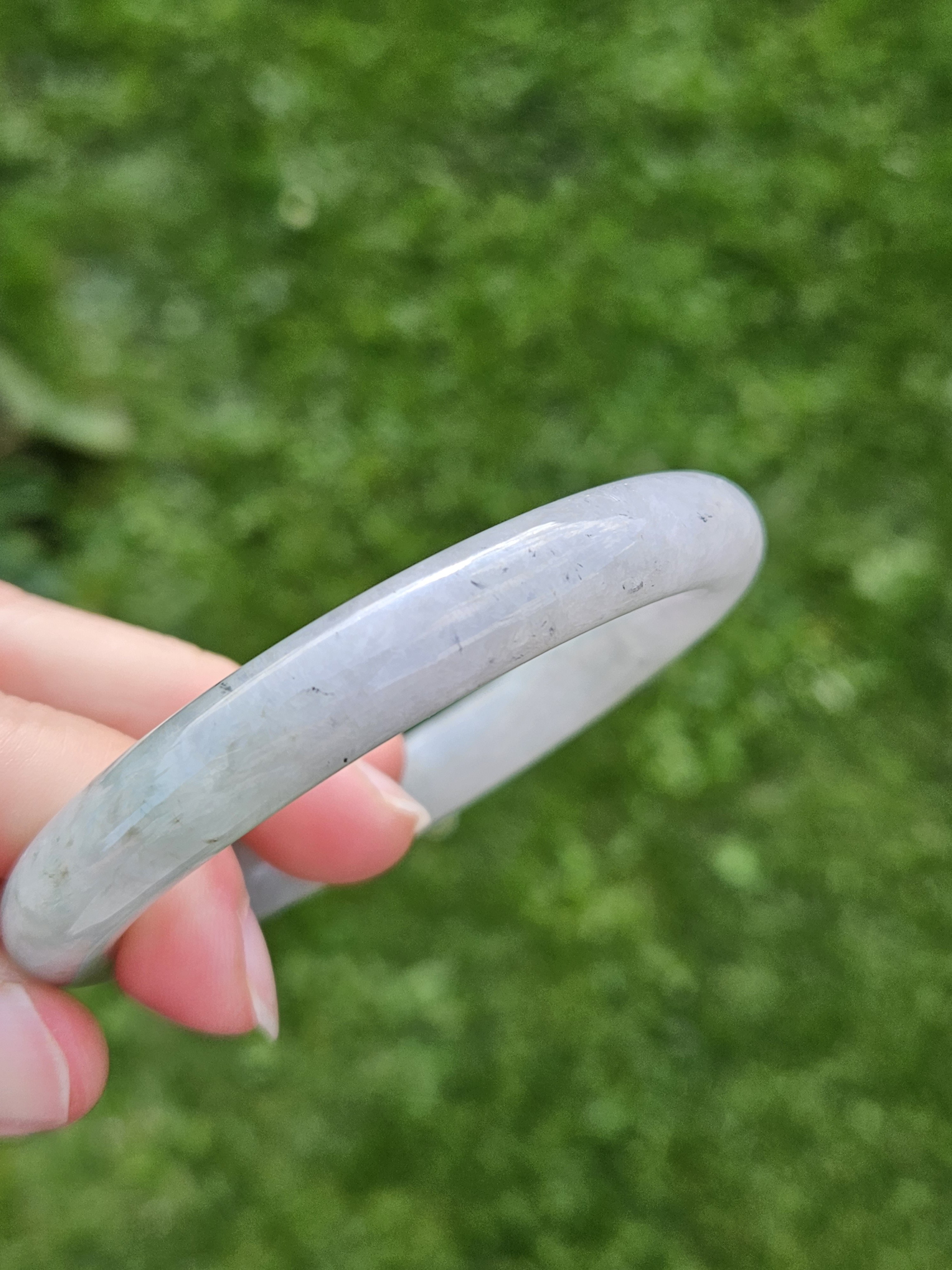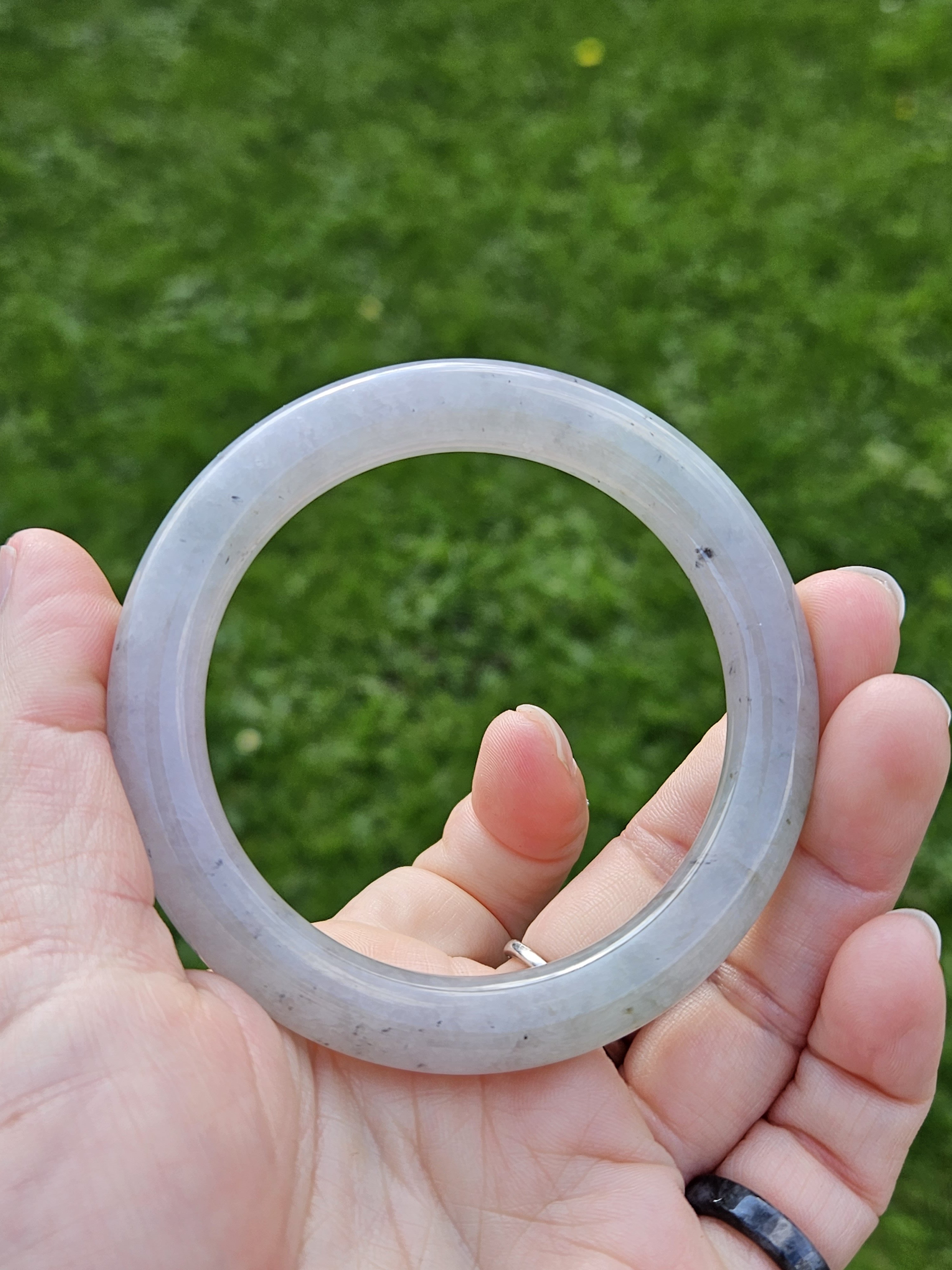 A lovely Burmese round bangle with specks of smoky grey, green and gold, measures 55.5 x 9.8 x 10.1mm, fits up to 57mm, comes with a certificate of authenticity £428