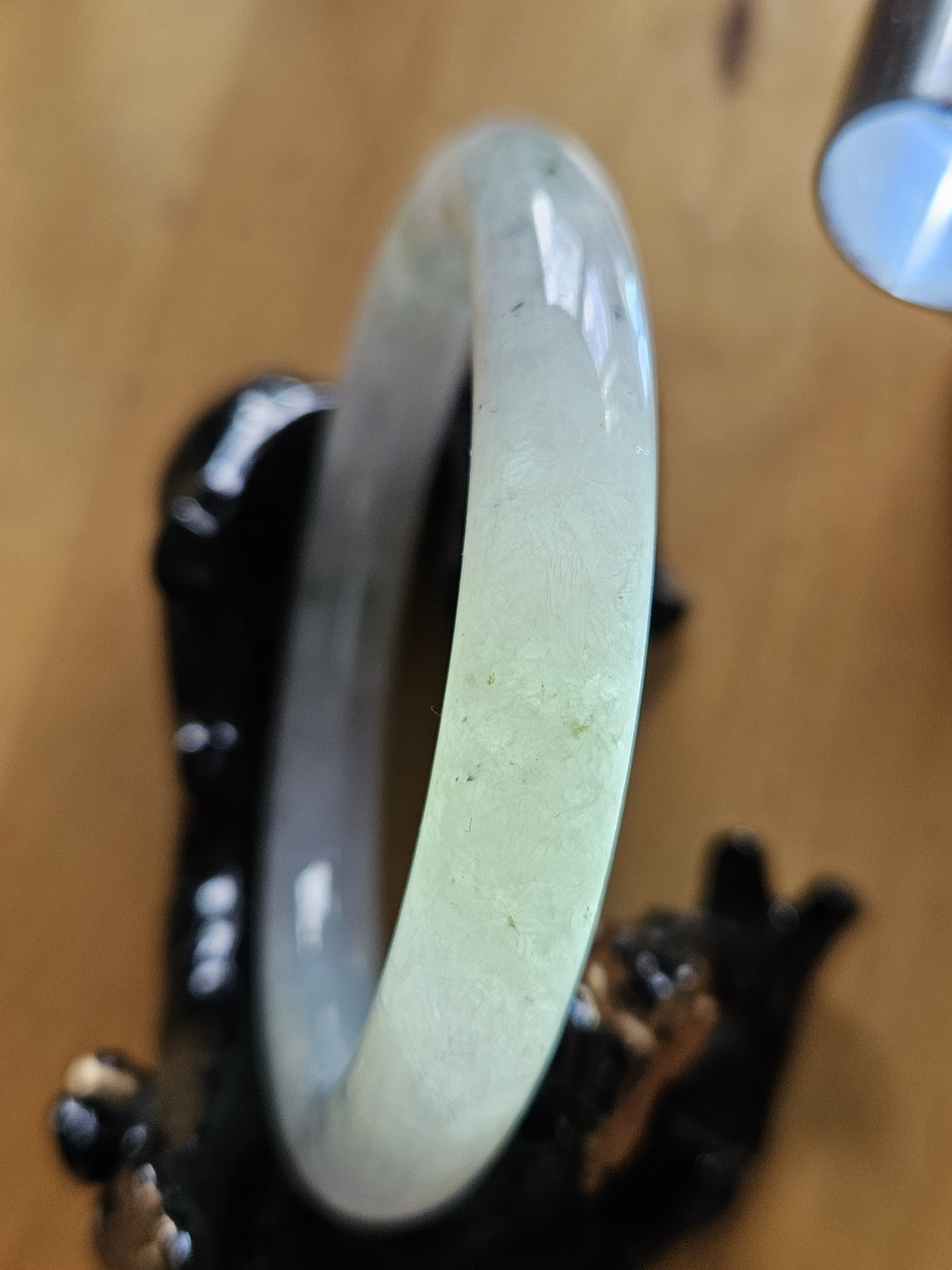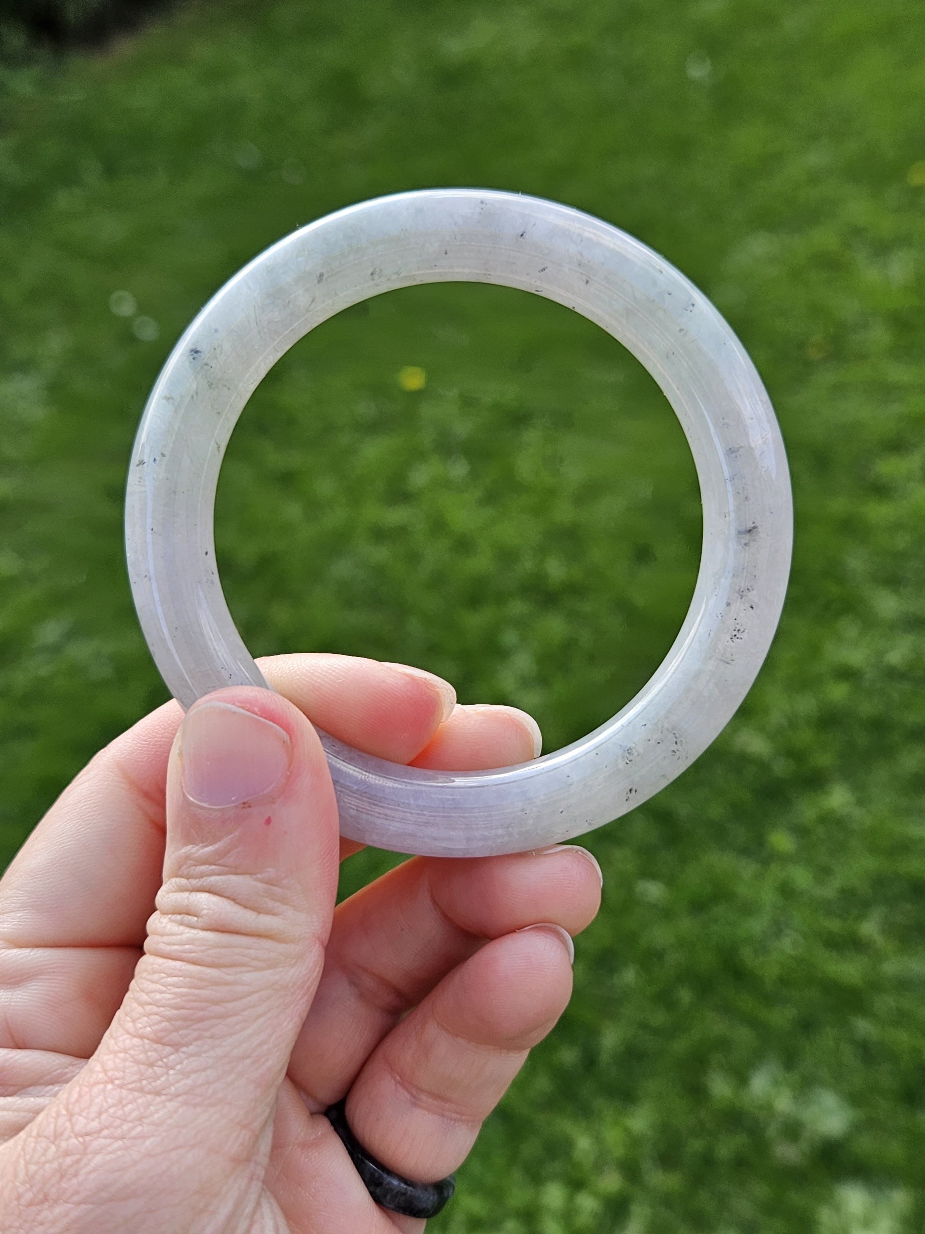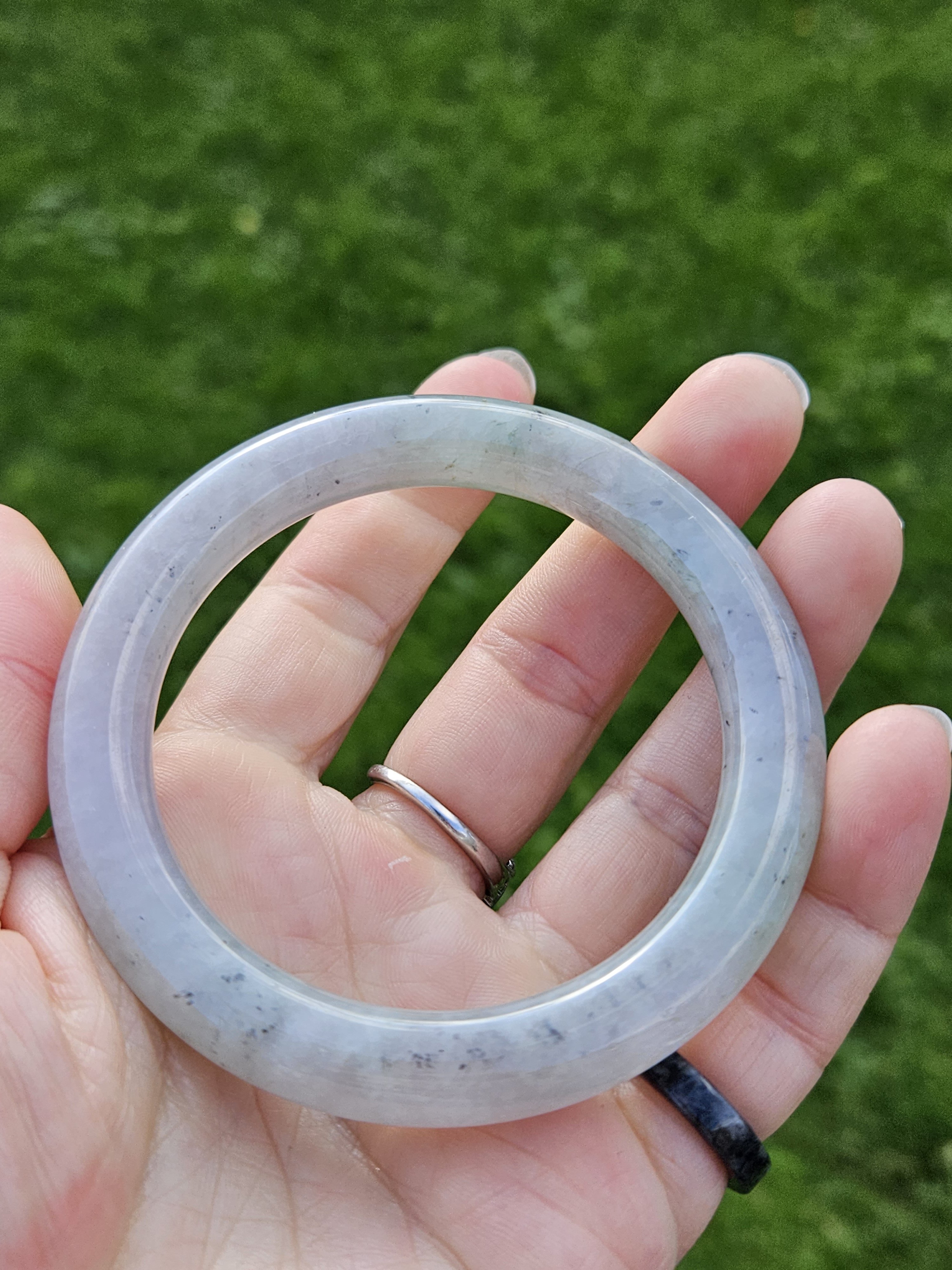 A lovely Burmese round bangle with specks of smoky grey, green and gold, measures 55.5 x 9.8 x 10.1mm, fits up to 57mm, comes with a certificate of authenticity £428