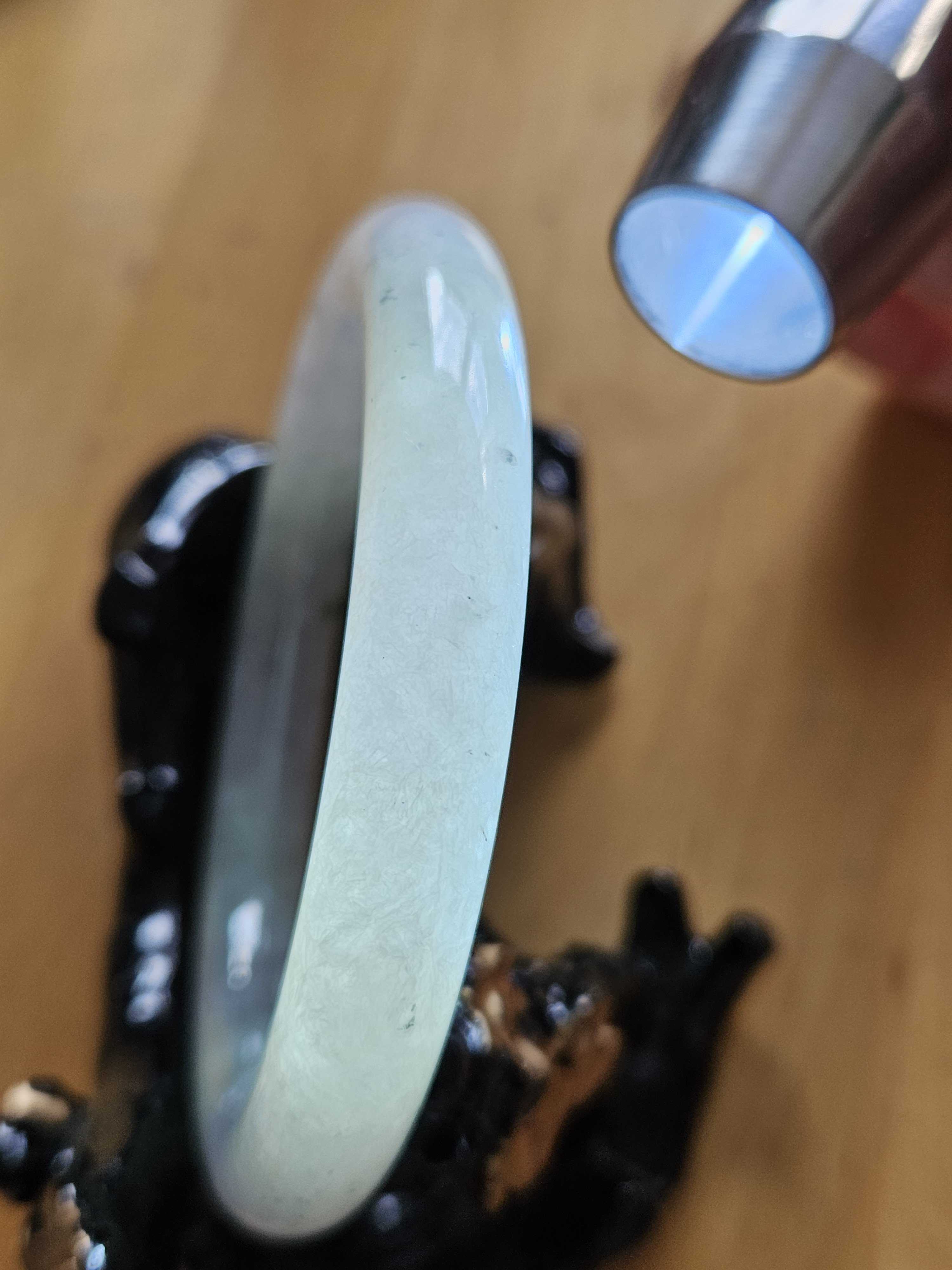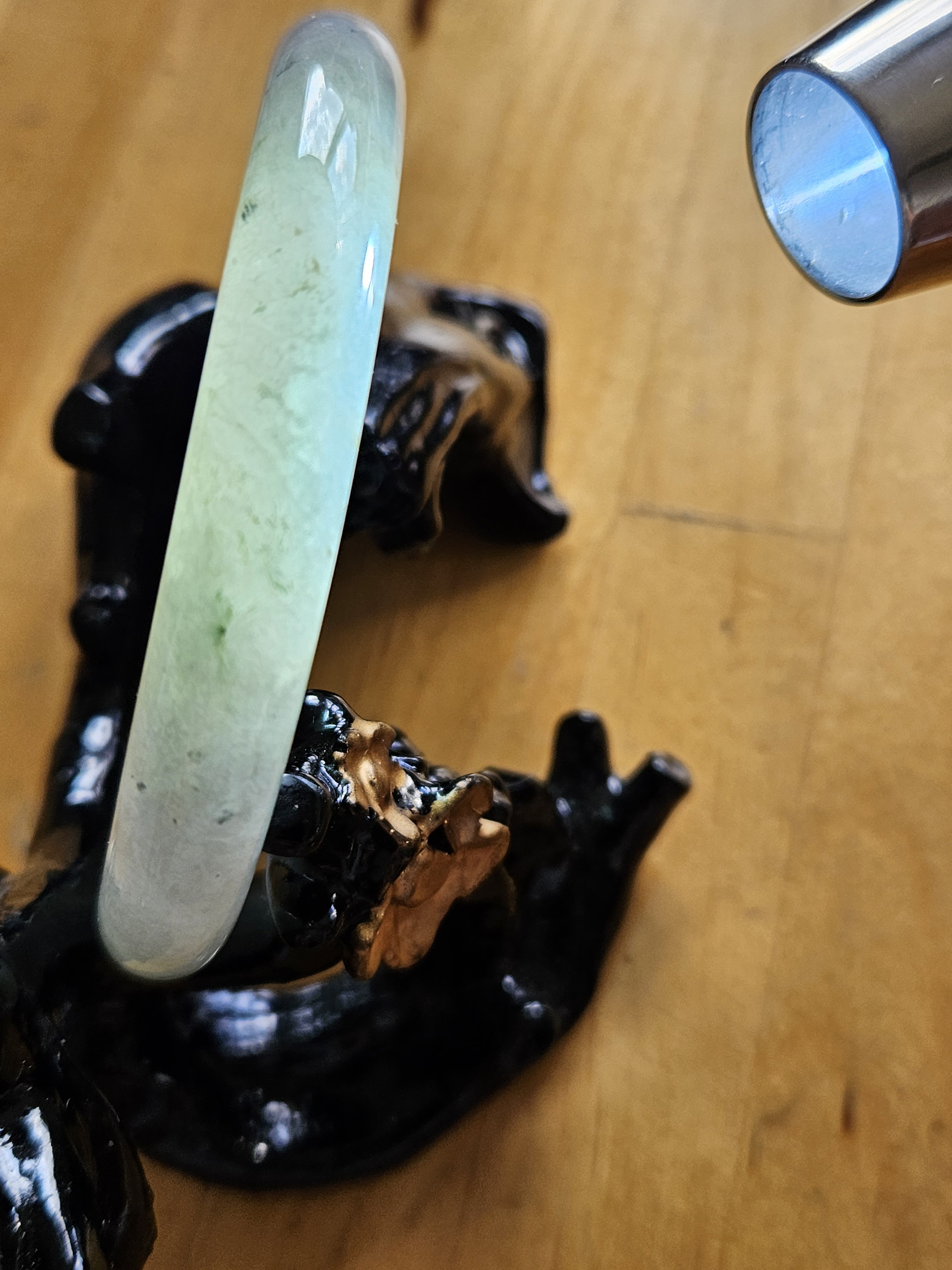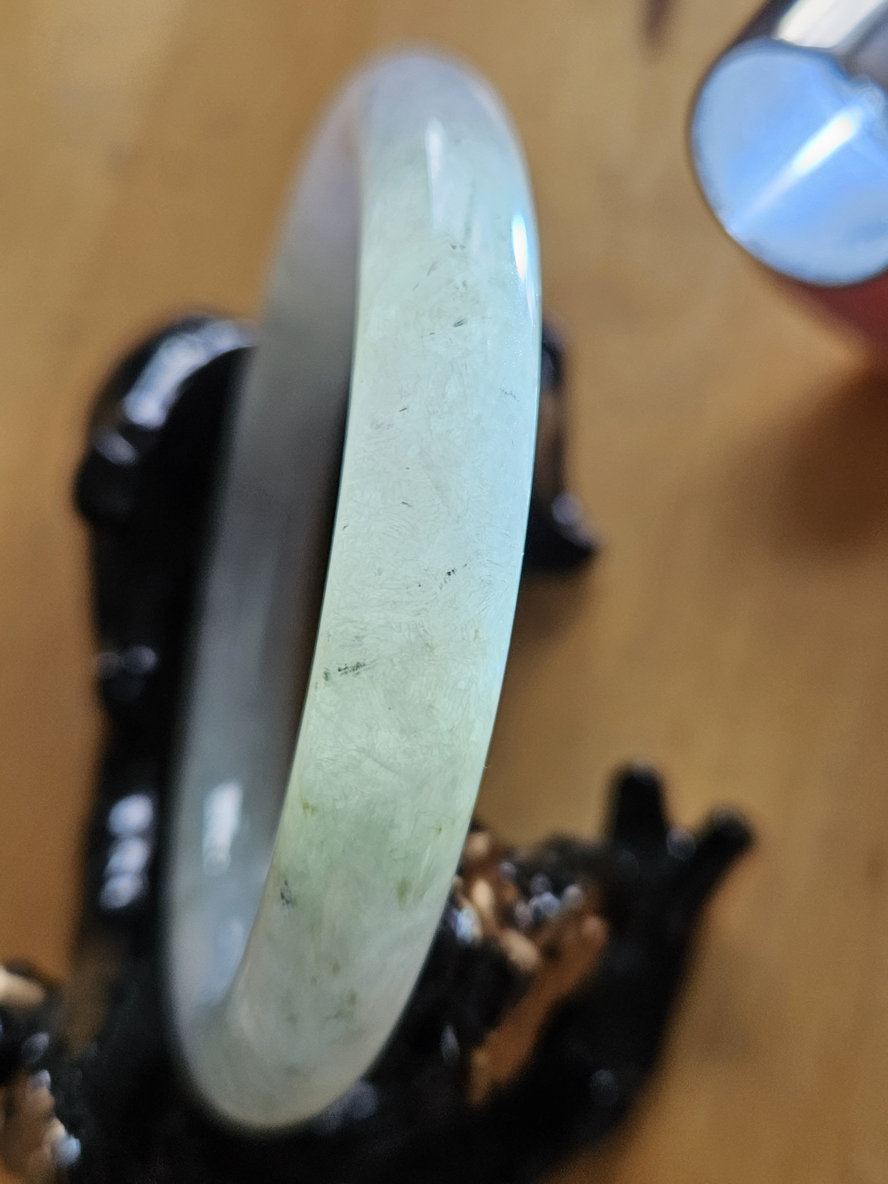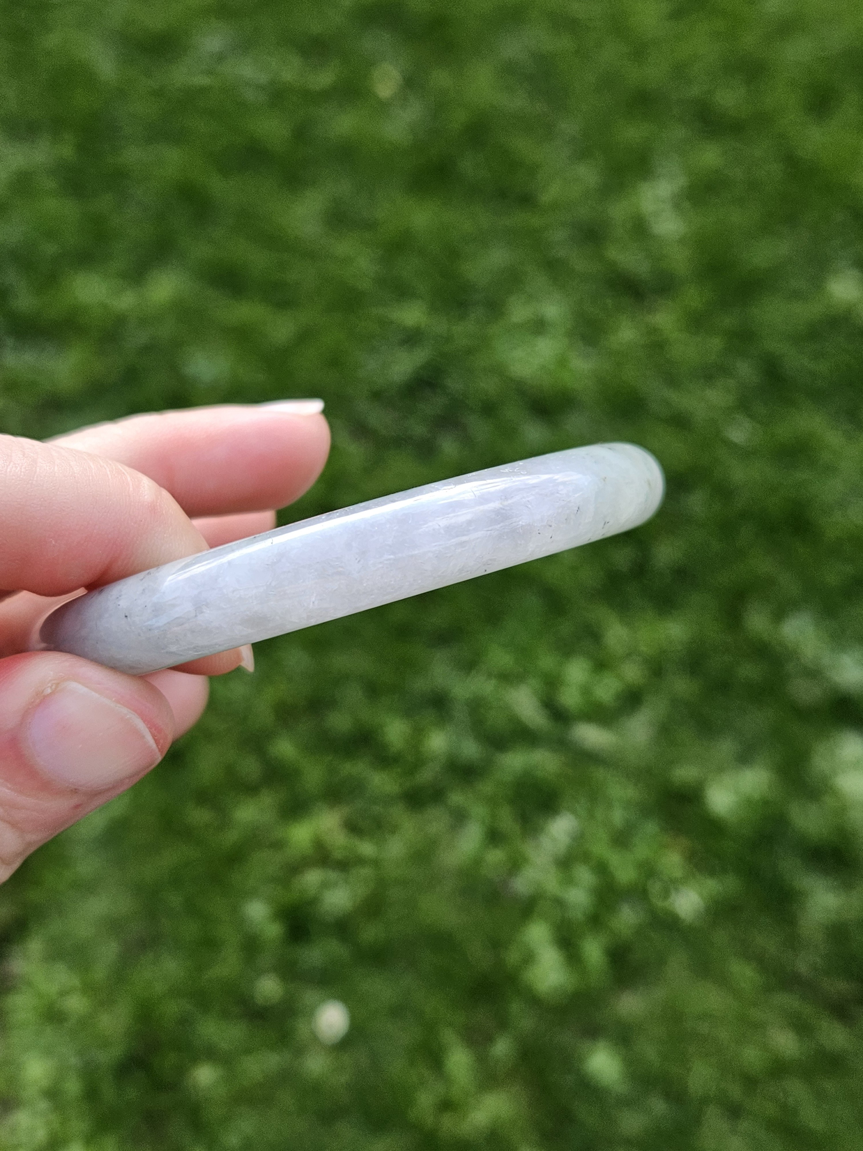 A lovely Burmese round bangle with specks of smoky grey, green and gold, measures 55.5 x 9.8 x 10.1mm, fits up to 57mm, comes with a certificate of authenticity £428