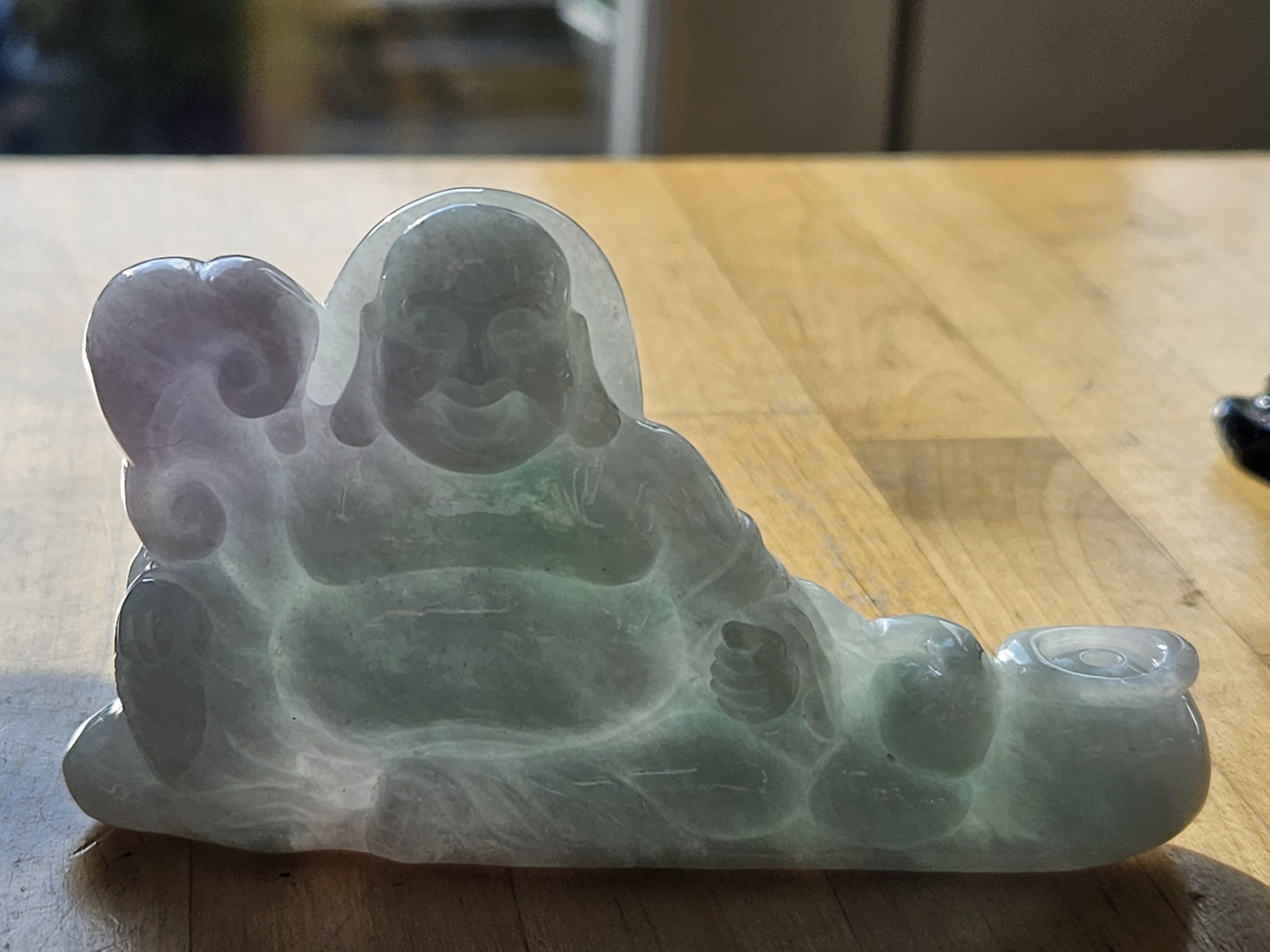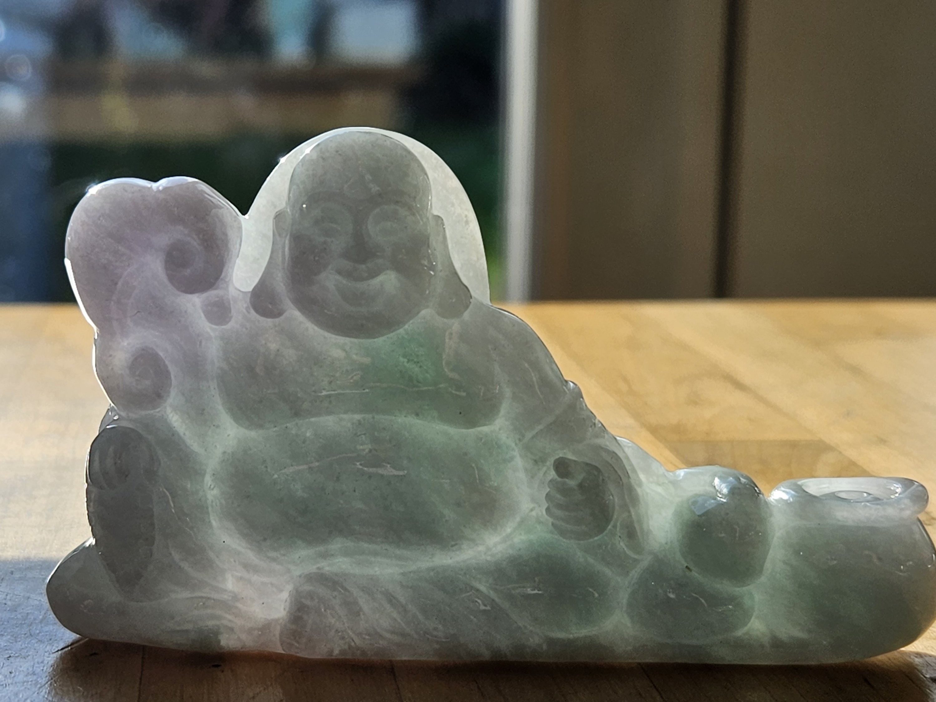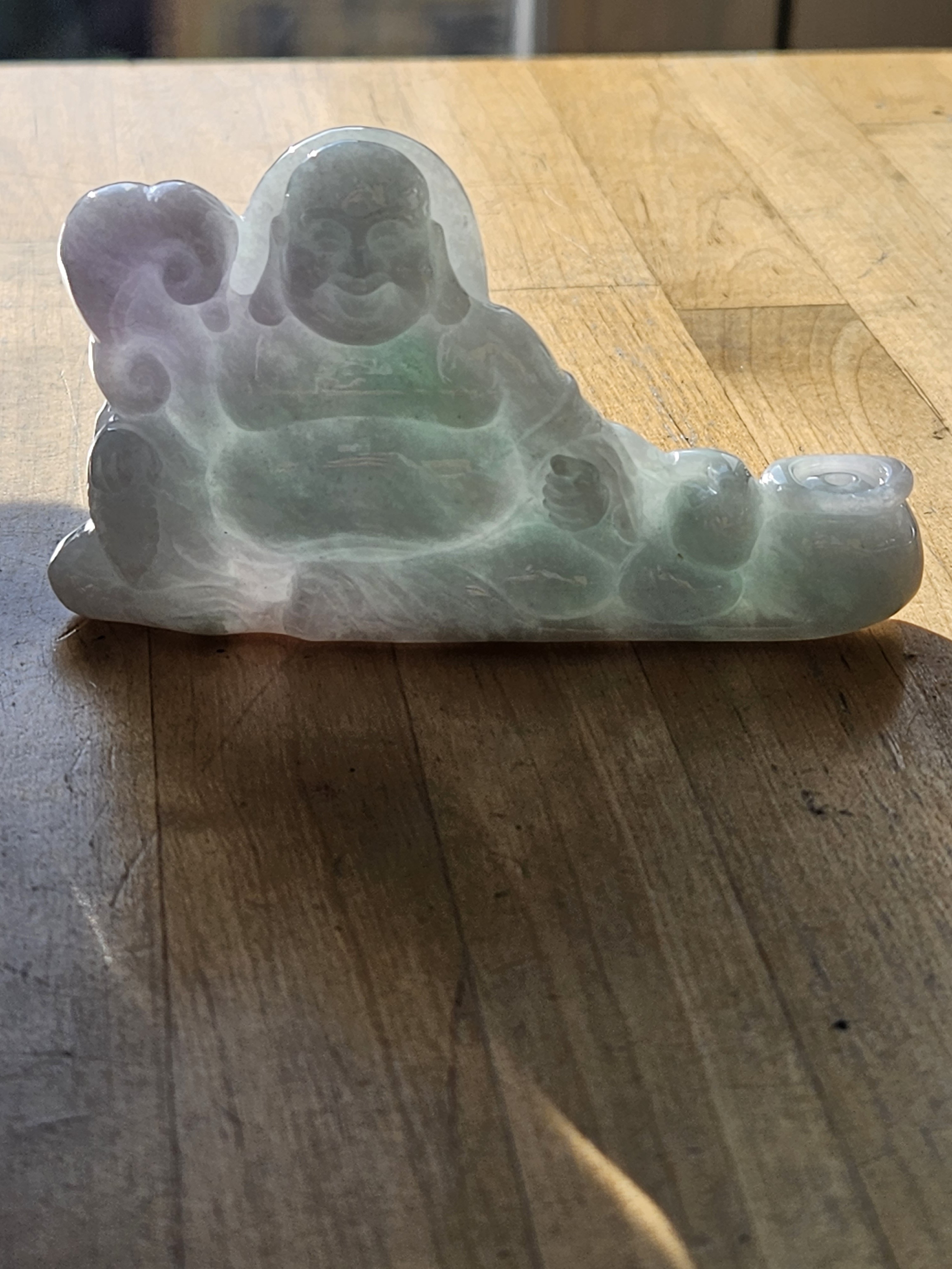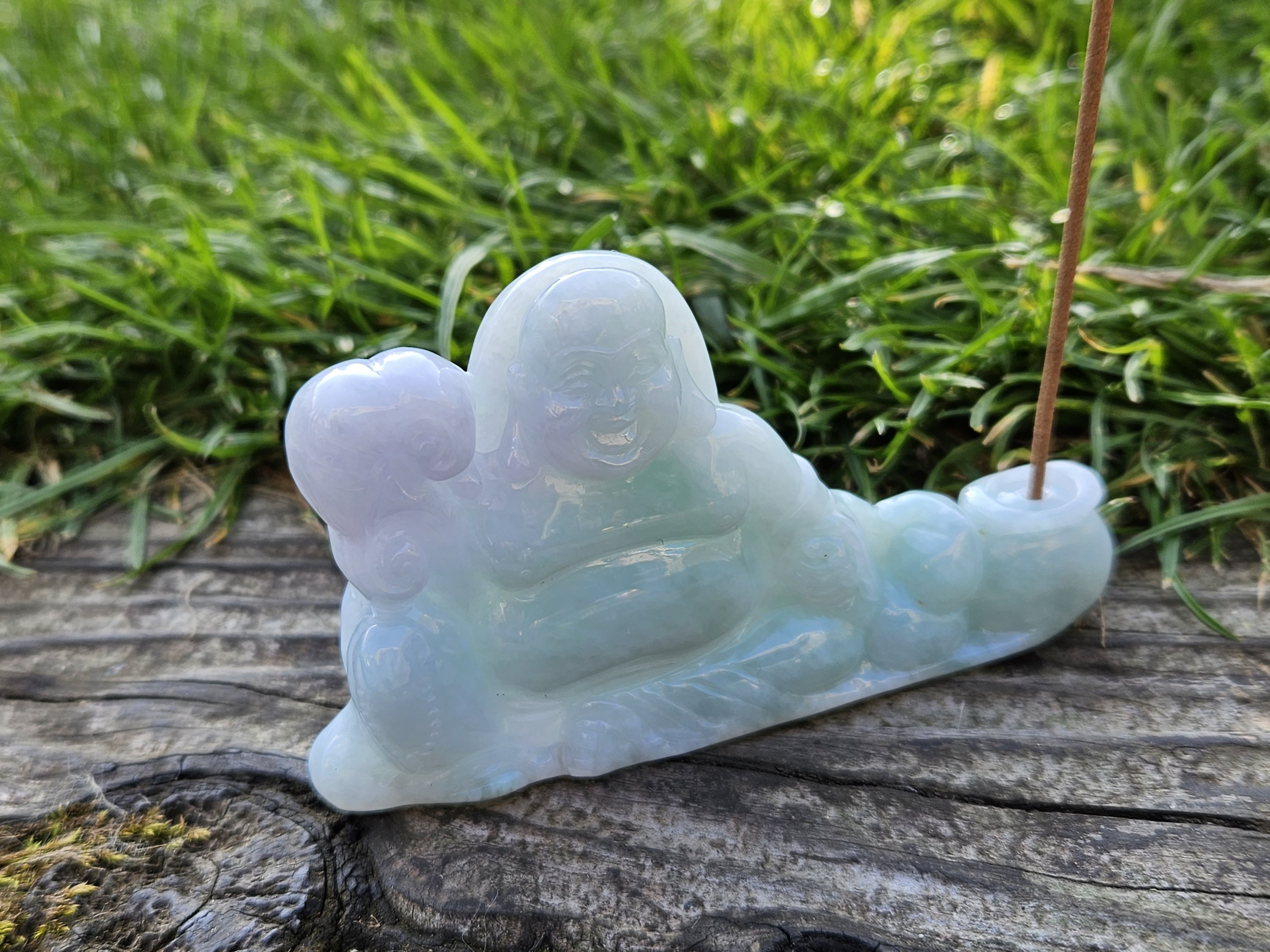 Purple and green jadeite Buddha holding onto a Ruyi (may everything go smoothly). The Buddha has lovely long ears (longevity), huge smile( happiness), big cheeks and tummy (plenty wealth). This can be used as a display item or as an incense holder in the shape of a money bag. Measures 53.3 x 91.8 x 11.7mm. £70