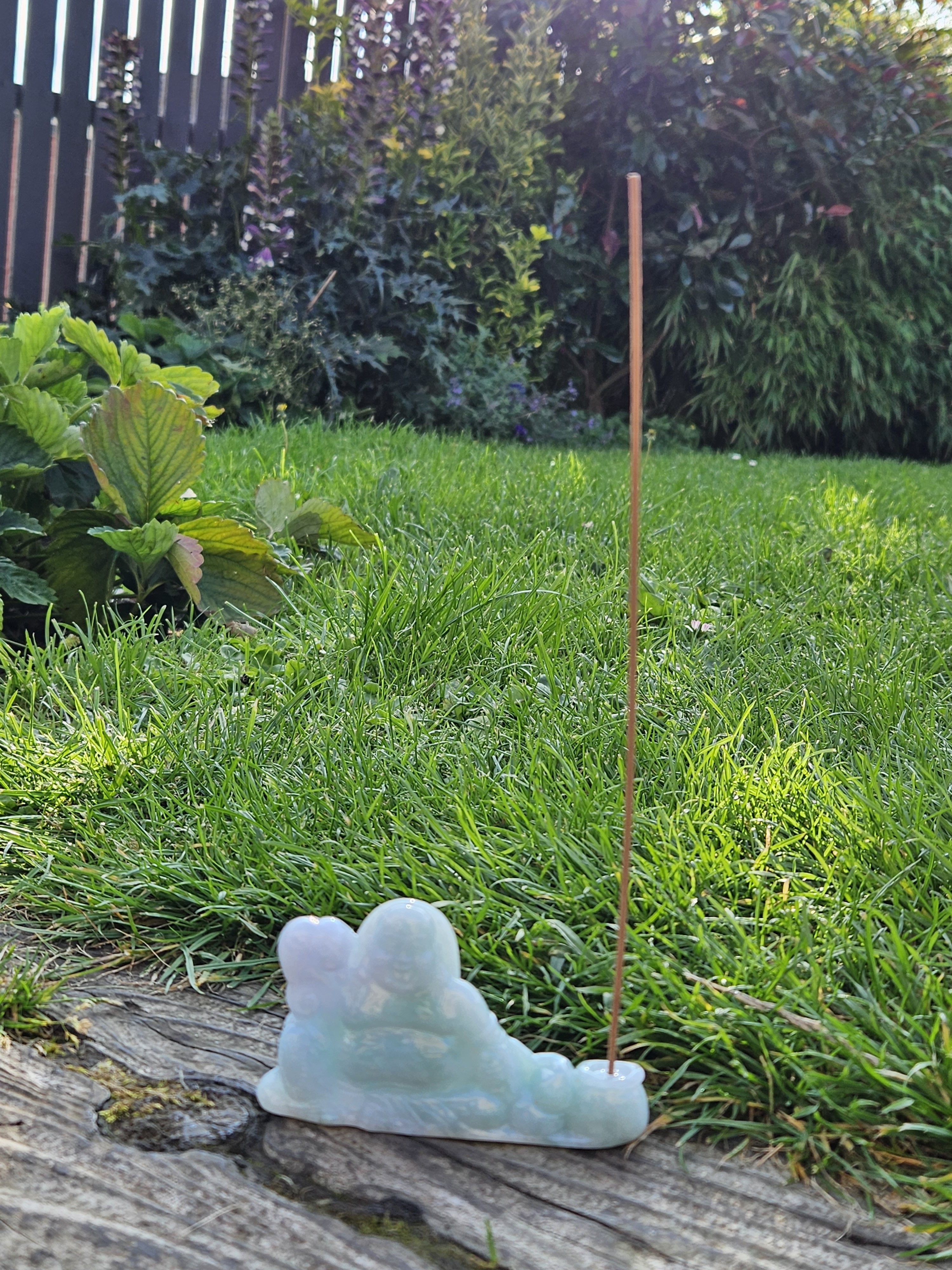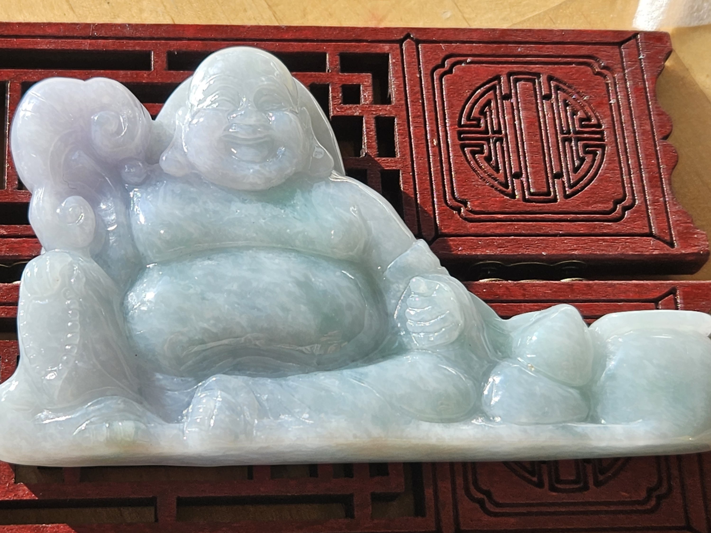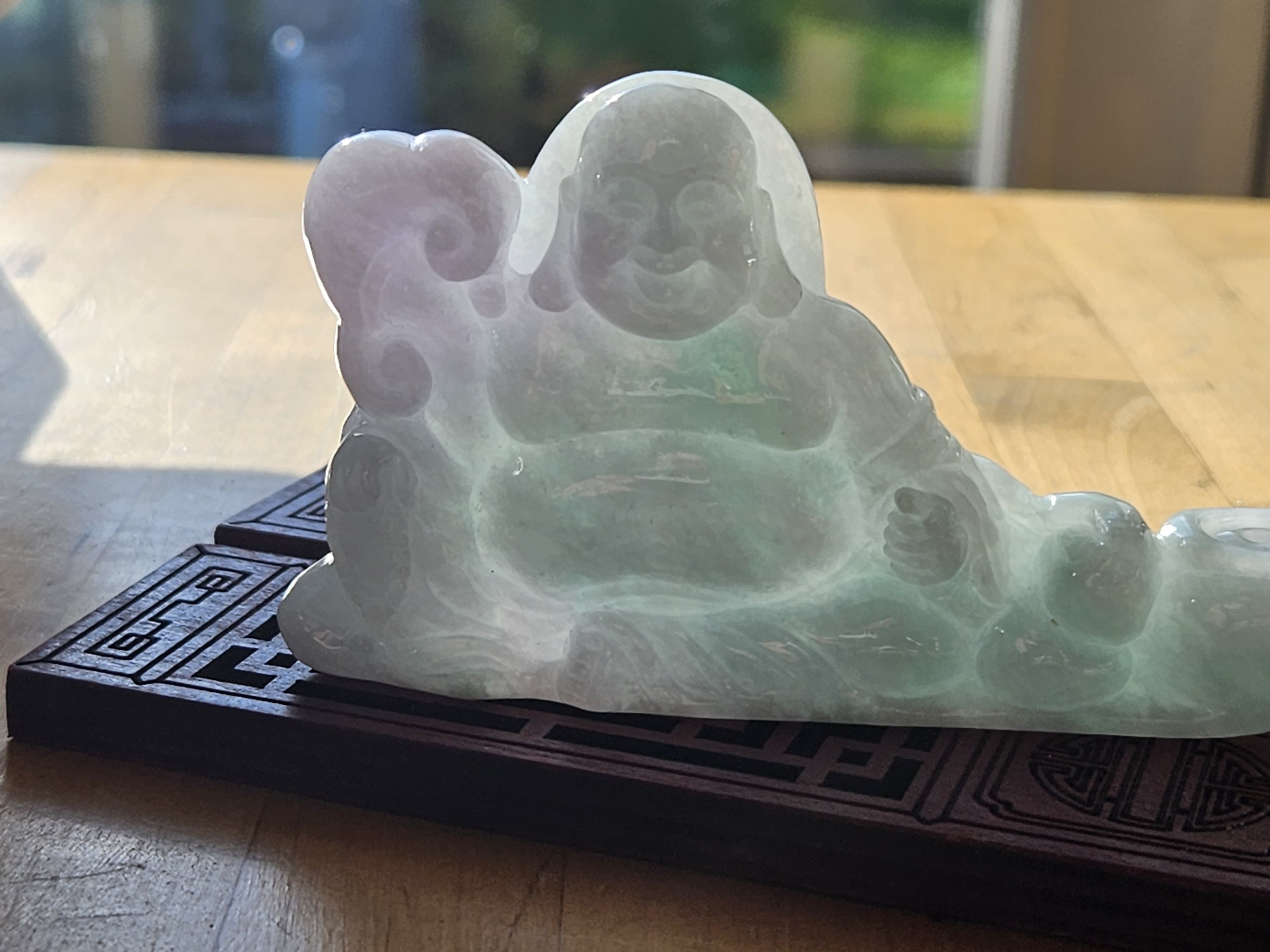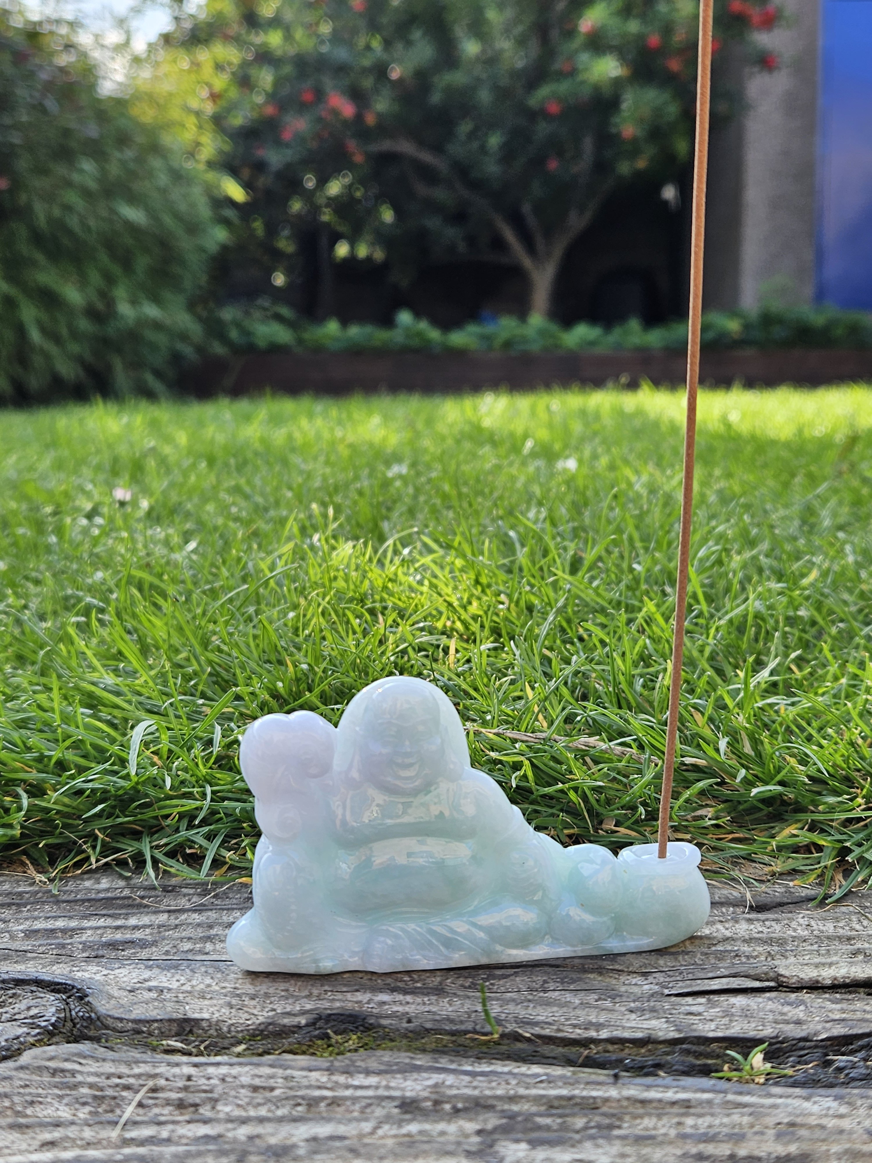 Purple and green jadeite Buddha holding onto a Ruyi (may everything go smoothly). The Buddha has lovely long ears (longevity), huge smile( happiness), big cheeks and tummy (plenty wealth). This can be used as a display item or as an incense holder in the shape of a money bag. Measures 53.3 x 91.8 x 11.7mm. £70