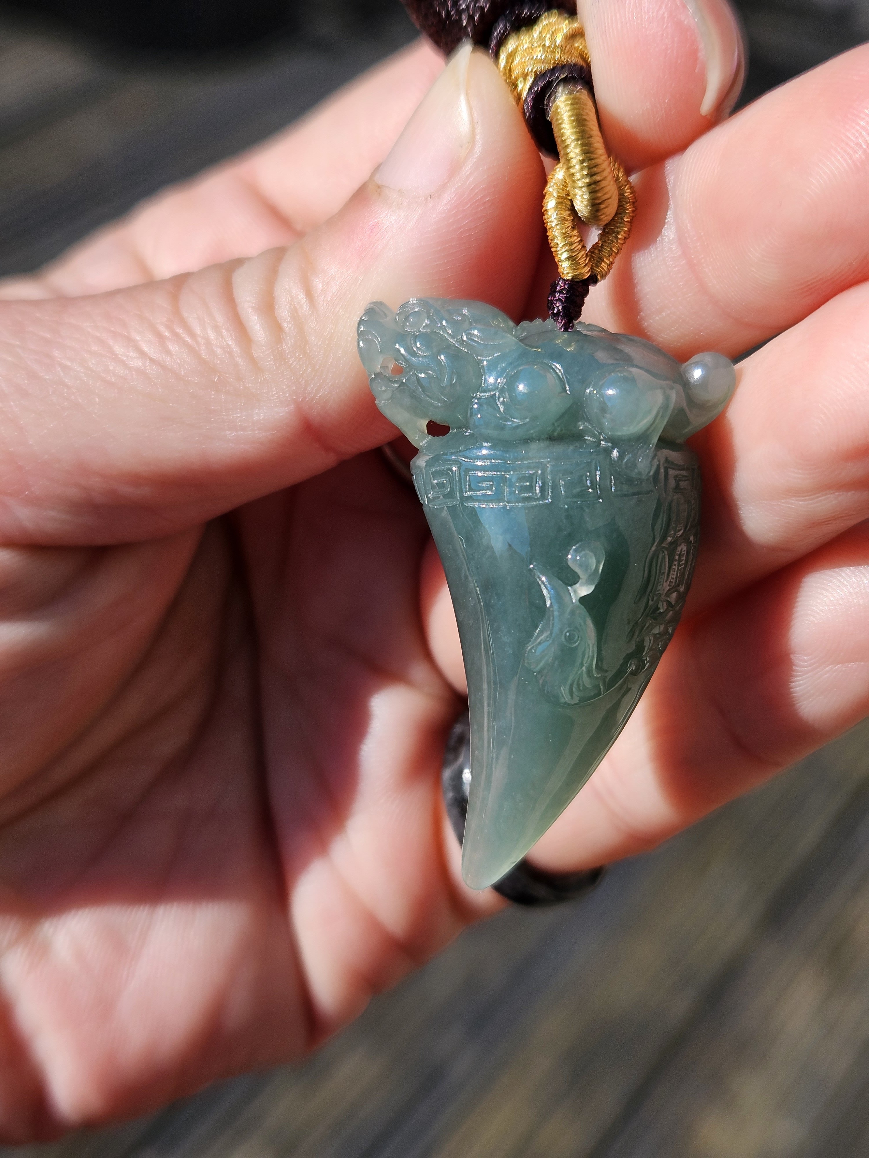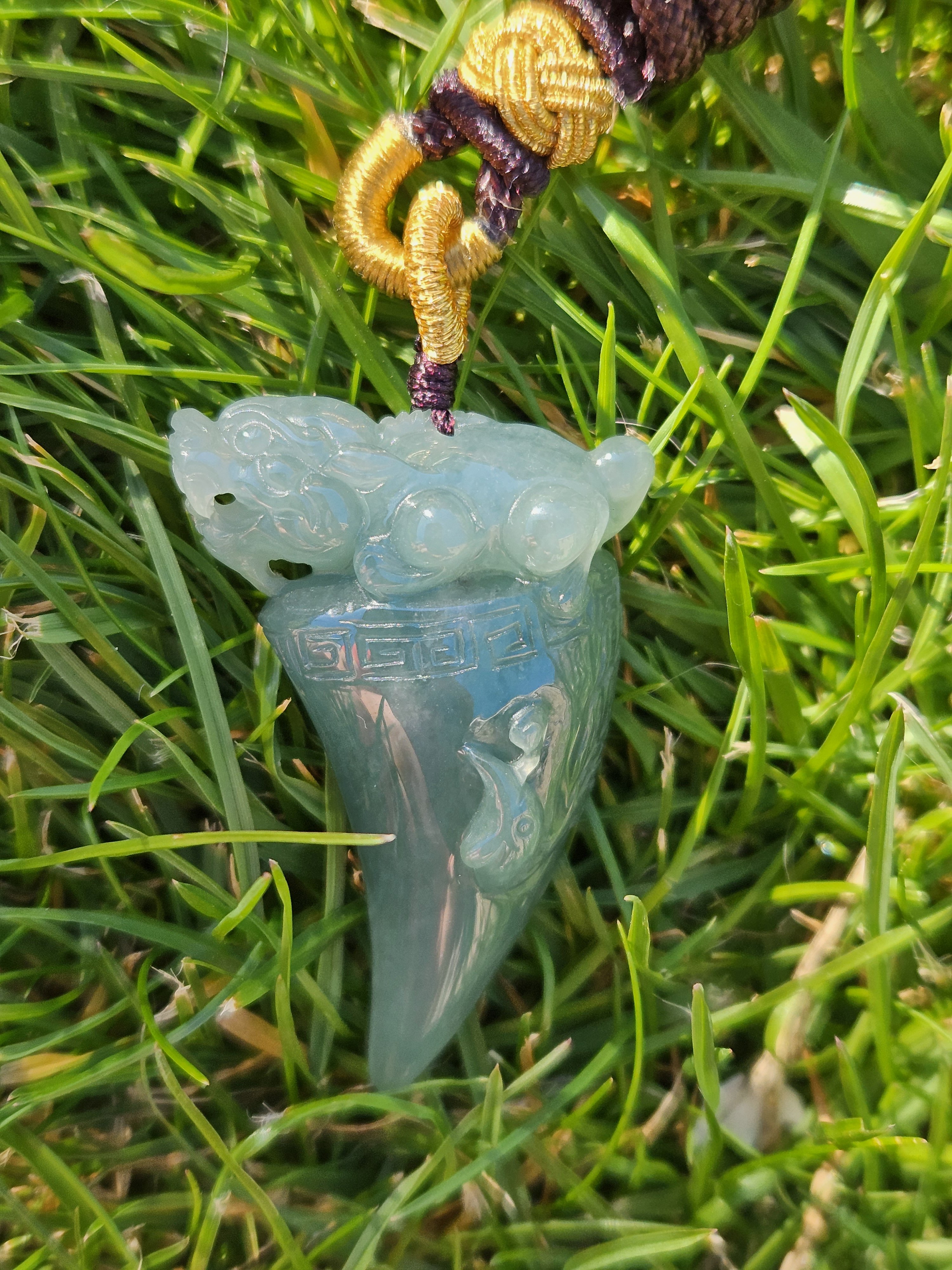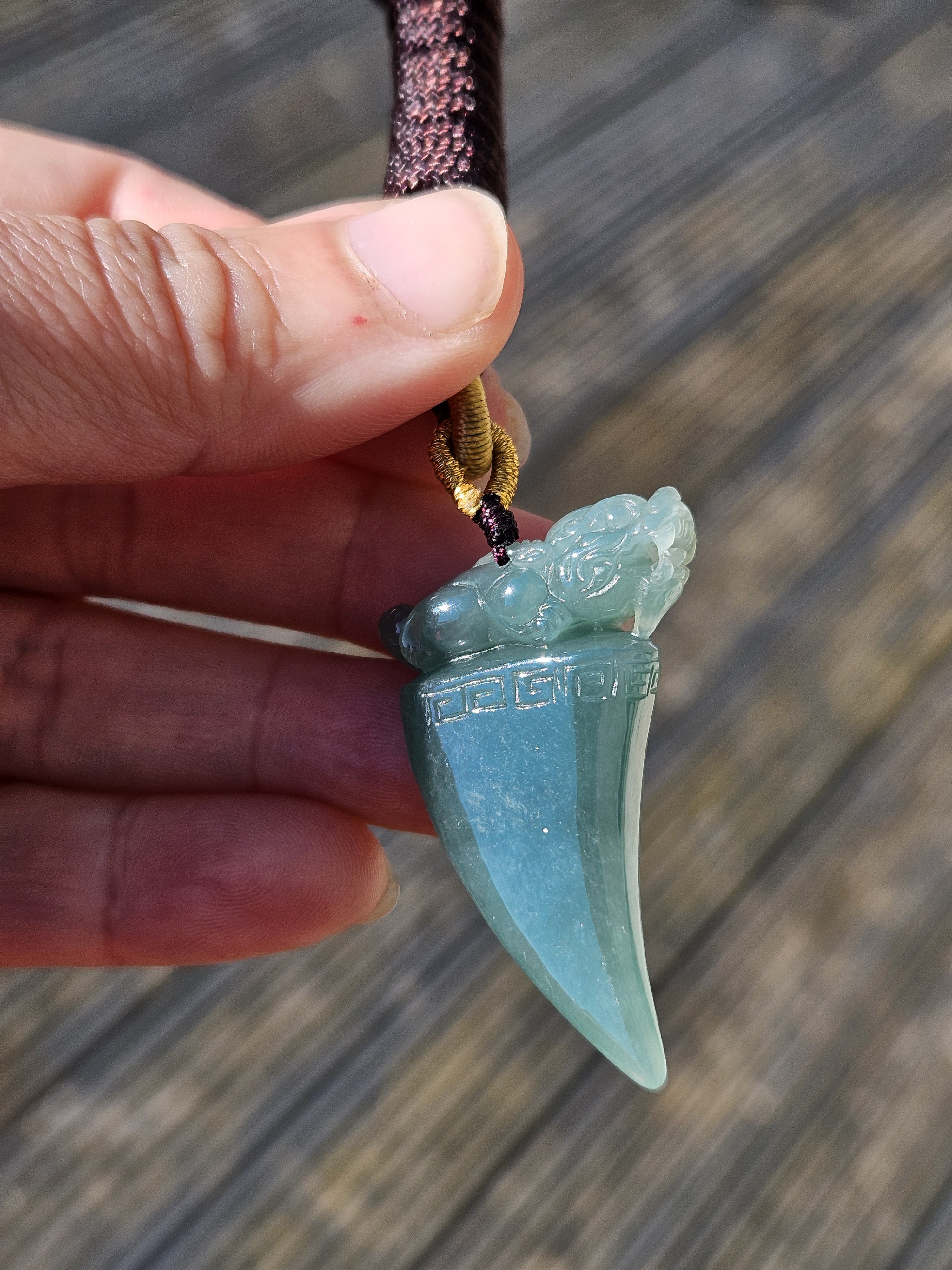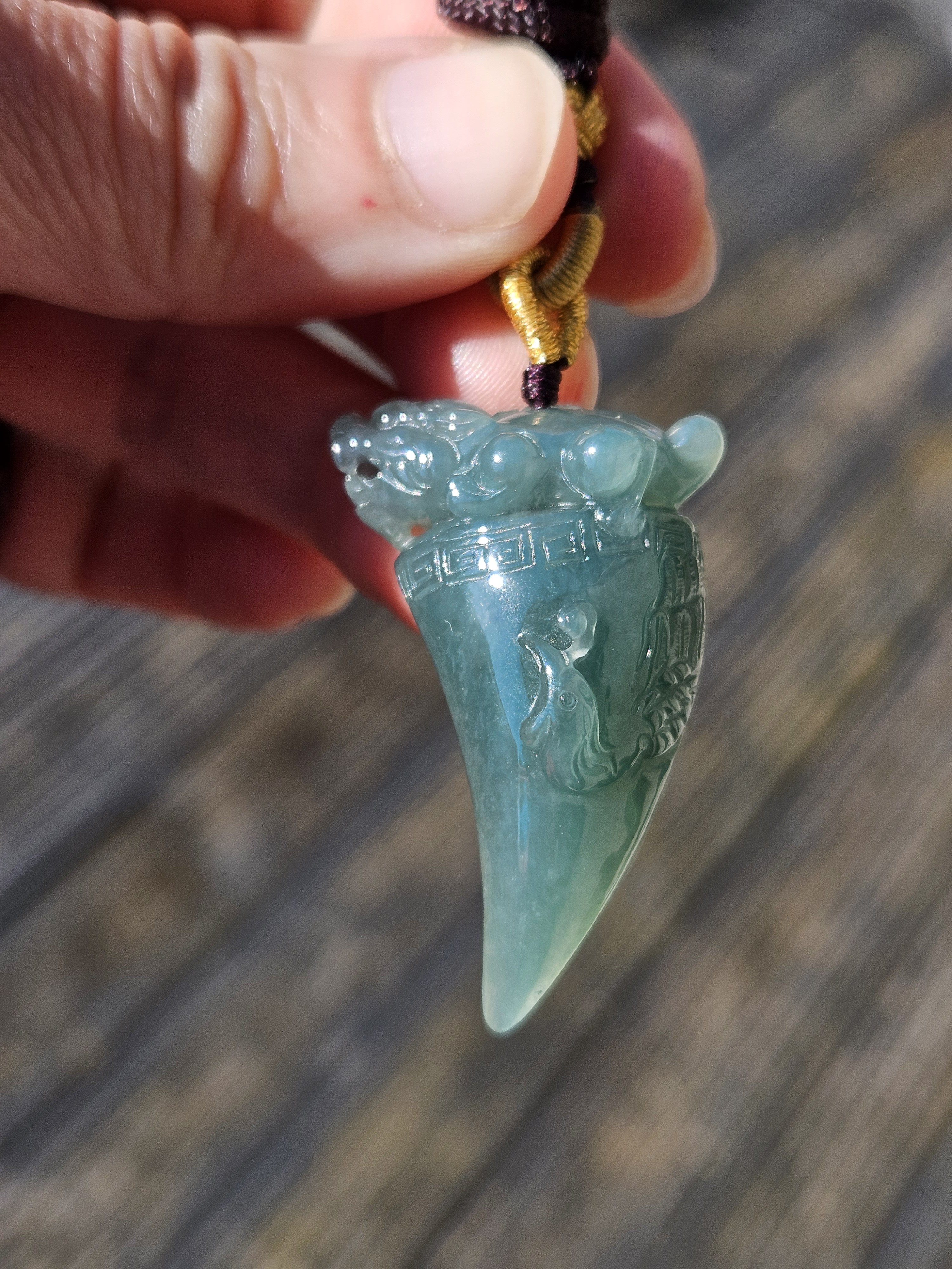 Superb carving of a pixiu crouching on top of a dragon tooth. Made of Guatemala jadeite. The tooth is engraved with a cliff with a fish swimming in the sea. The quality is icy bluish green and measures 41.7 x 25.8 x 12.1mm, comes with a certificate of authenticity