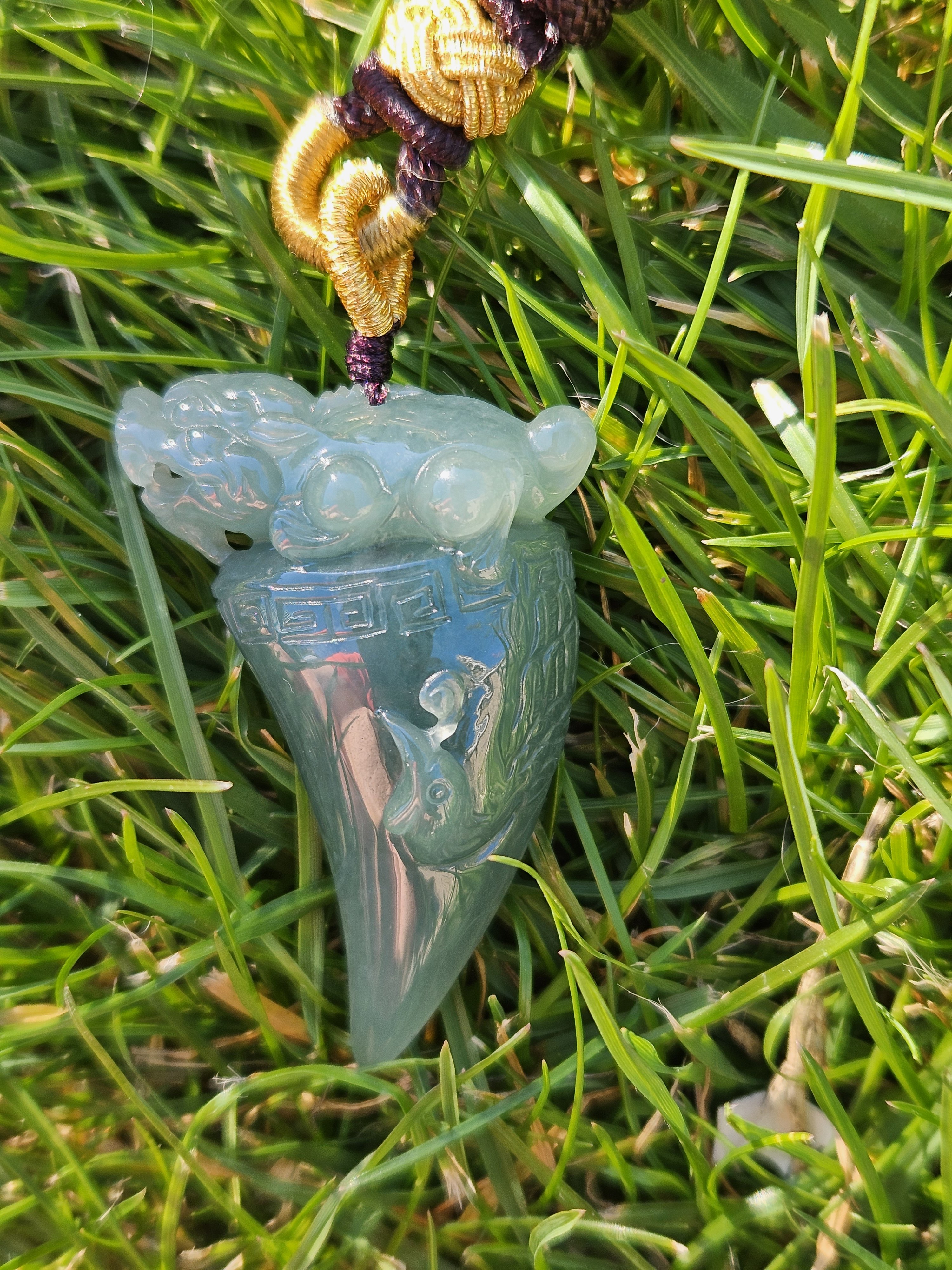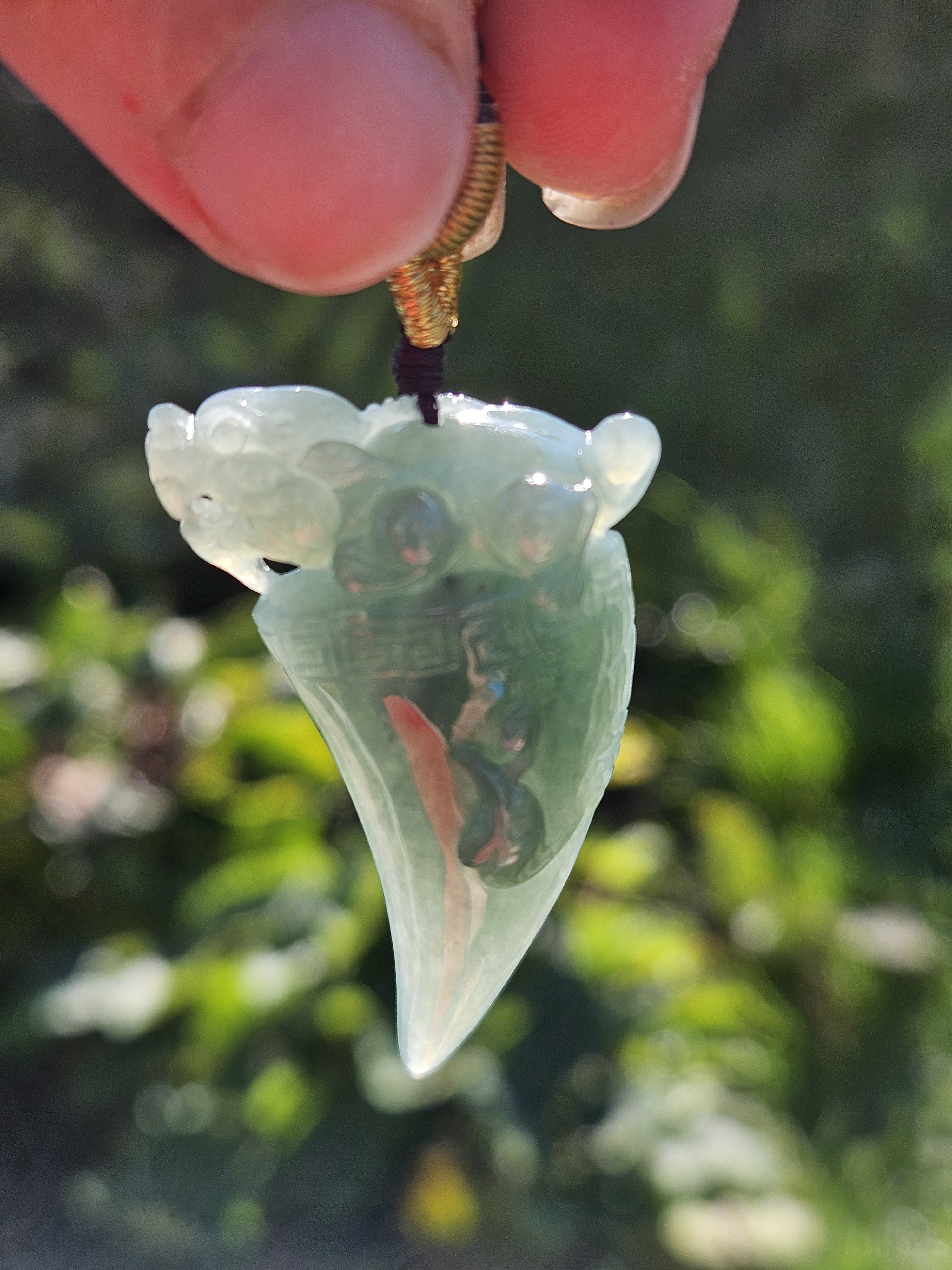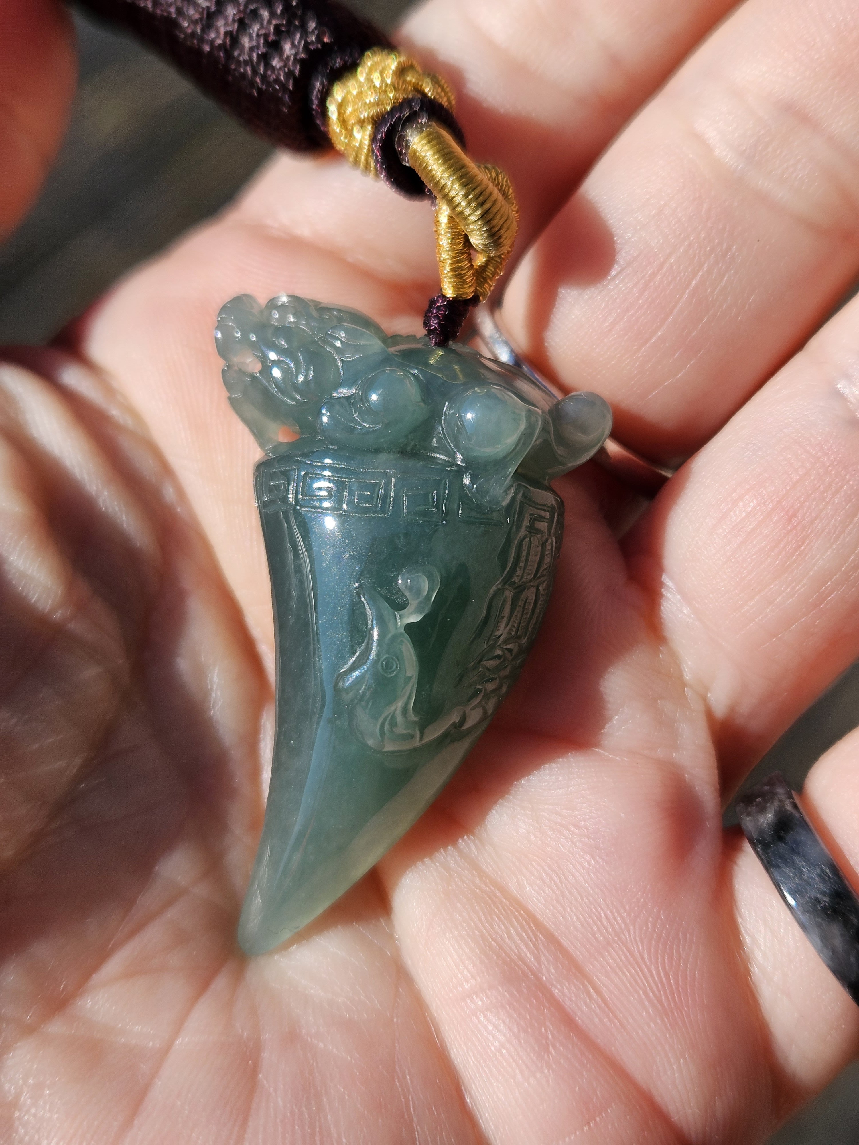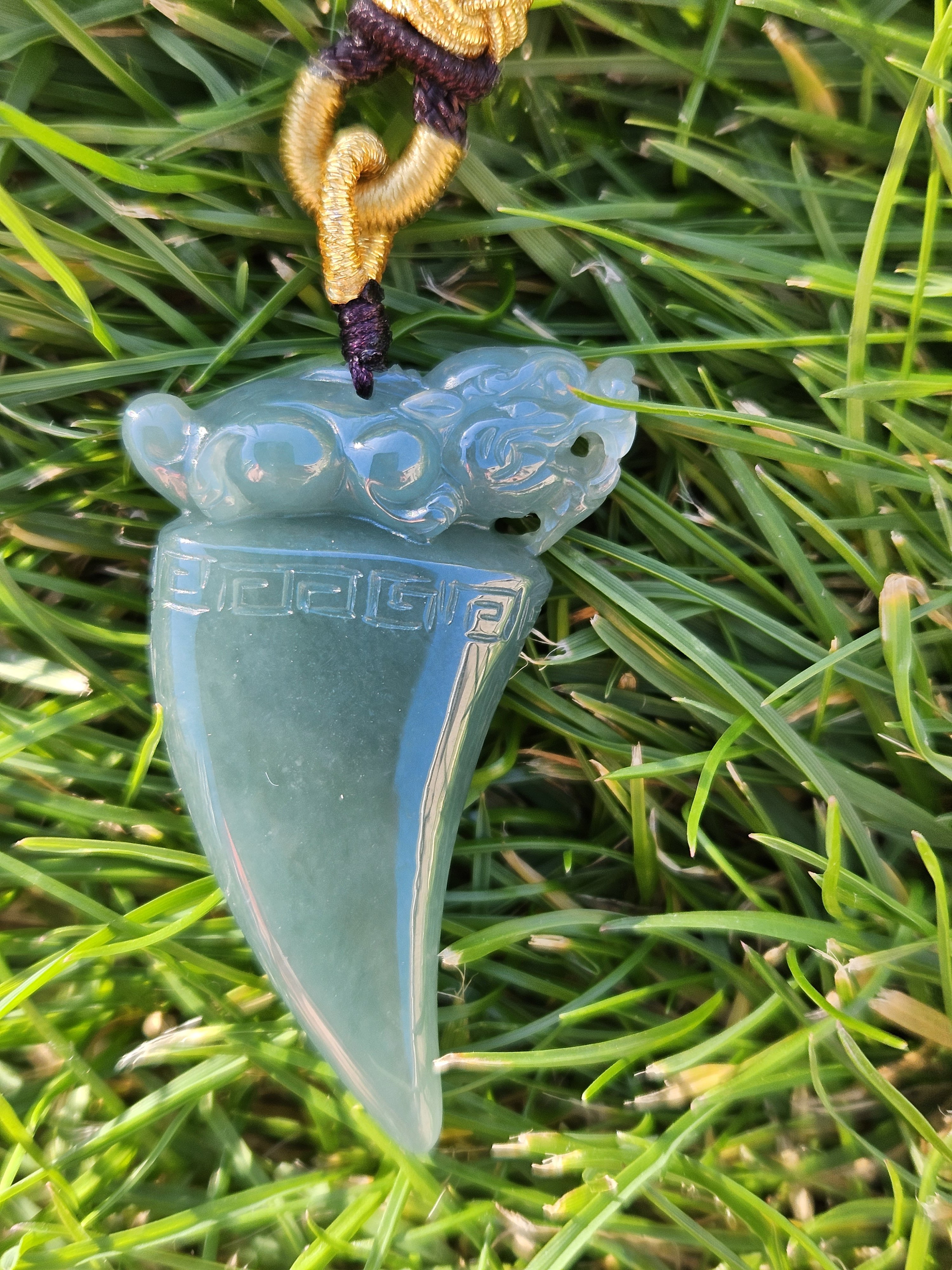 Superb carving of a pixiu crouching on top of a dragon tooth. Made of Guatemala jadeite. The tooth is engraved with a cliff with a fish swimming in the sea. The quality is icy bluish green and measures 41.7 x 25.8 x 12.1mm, comes with a certificate of authenticity