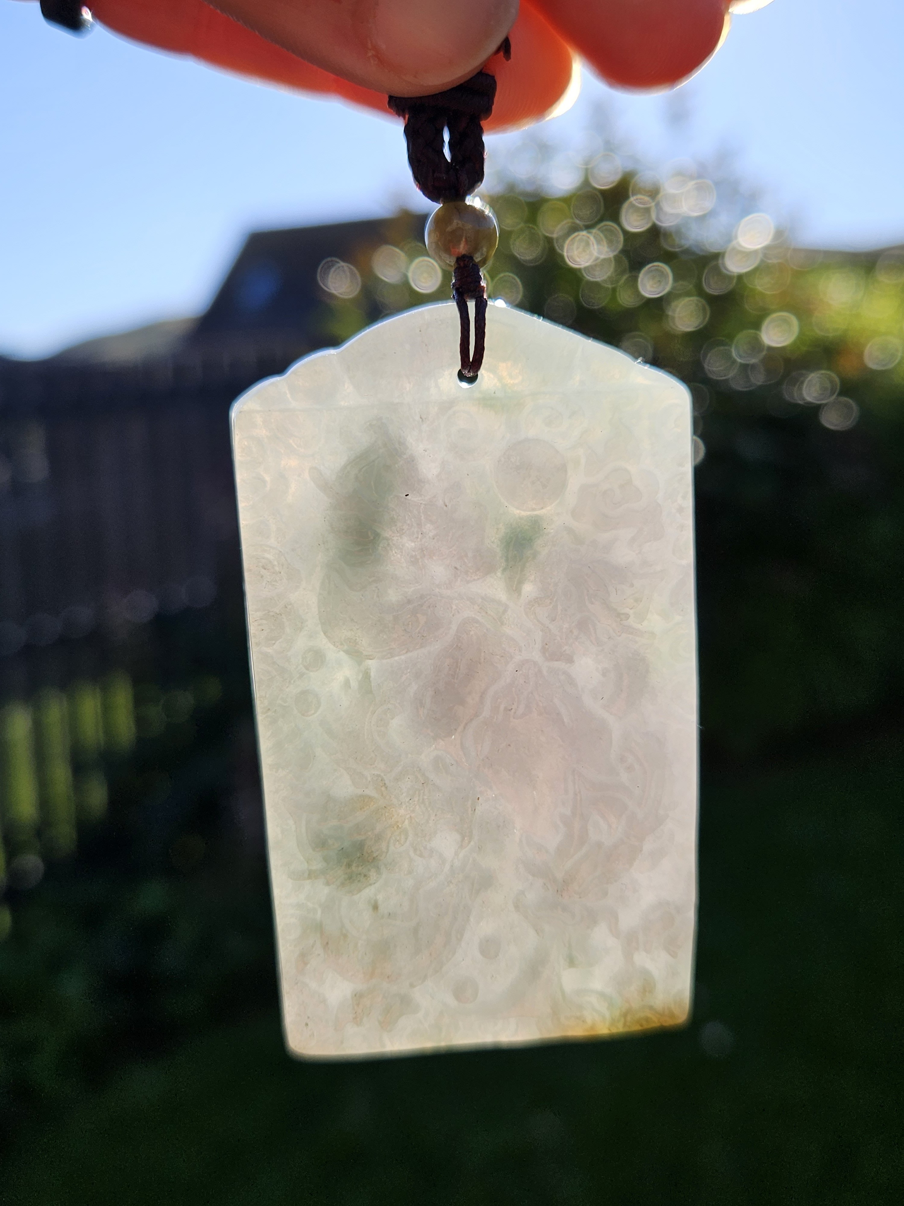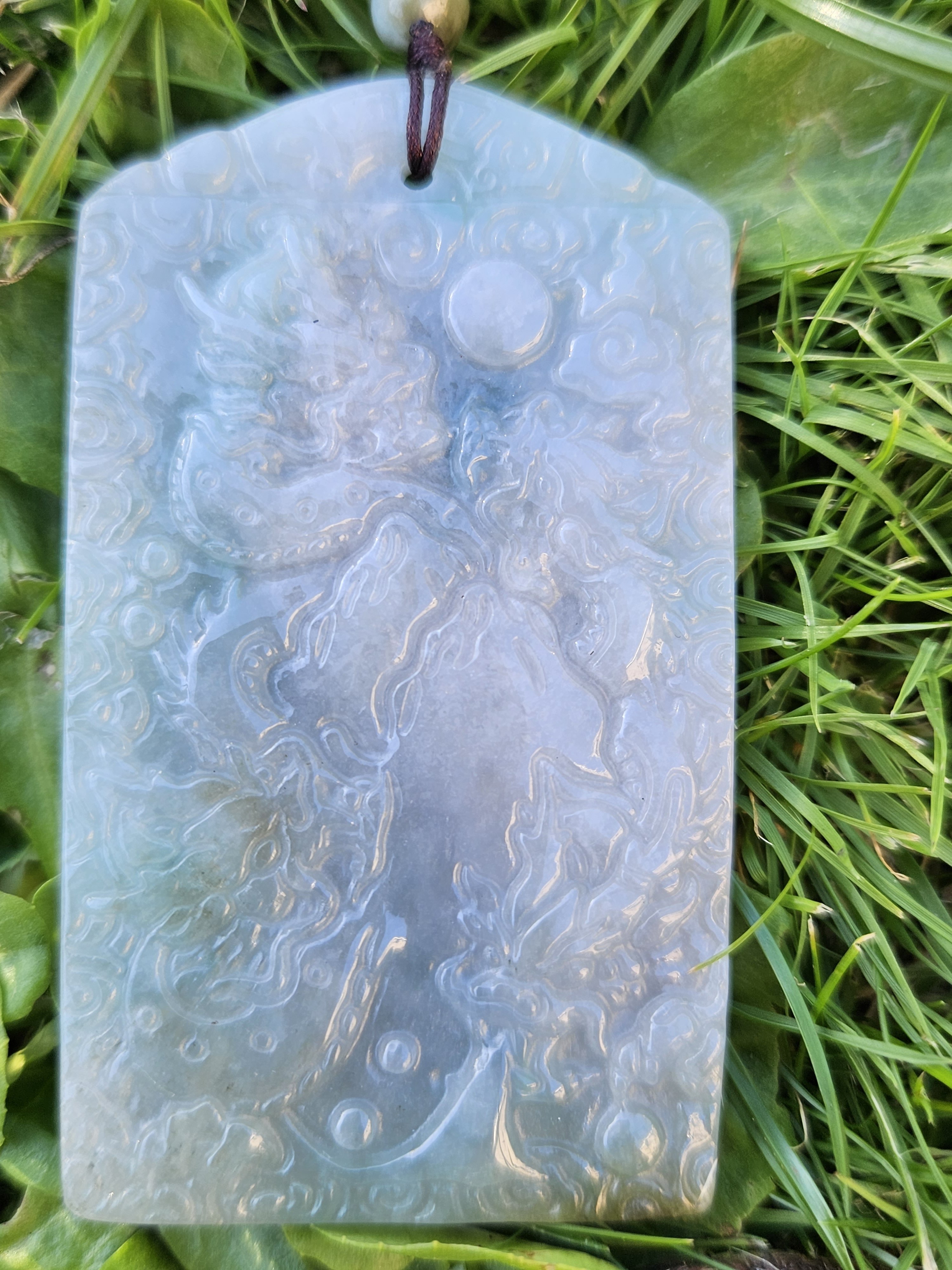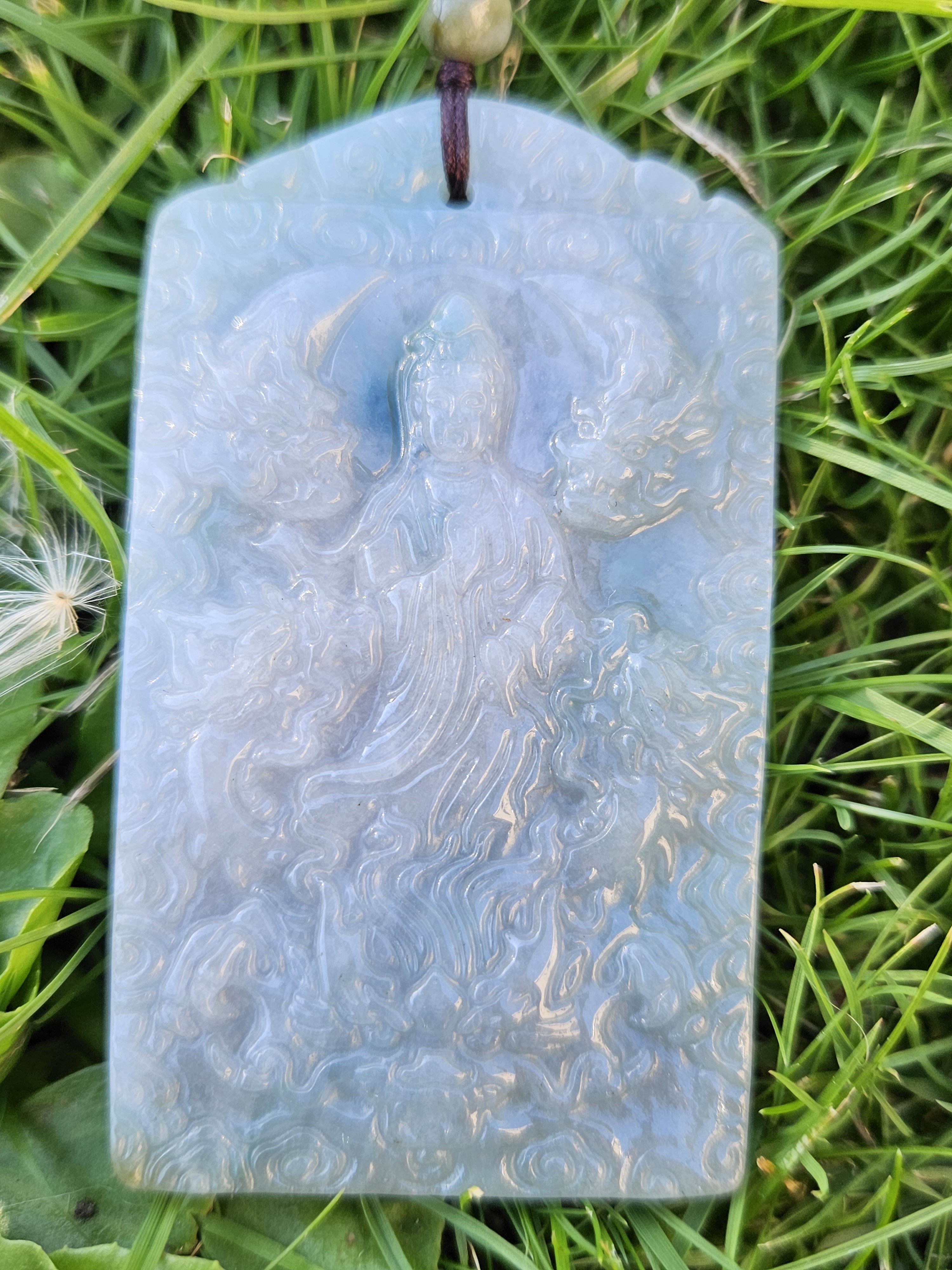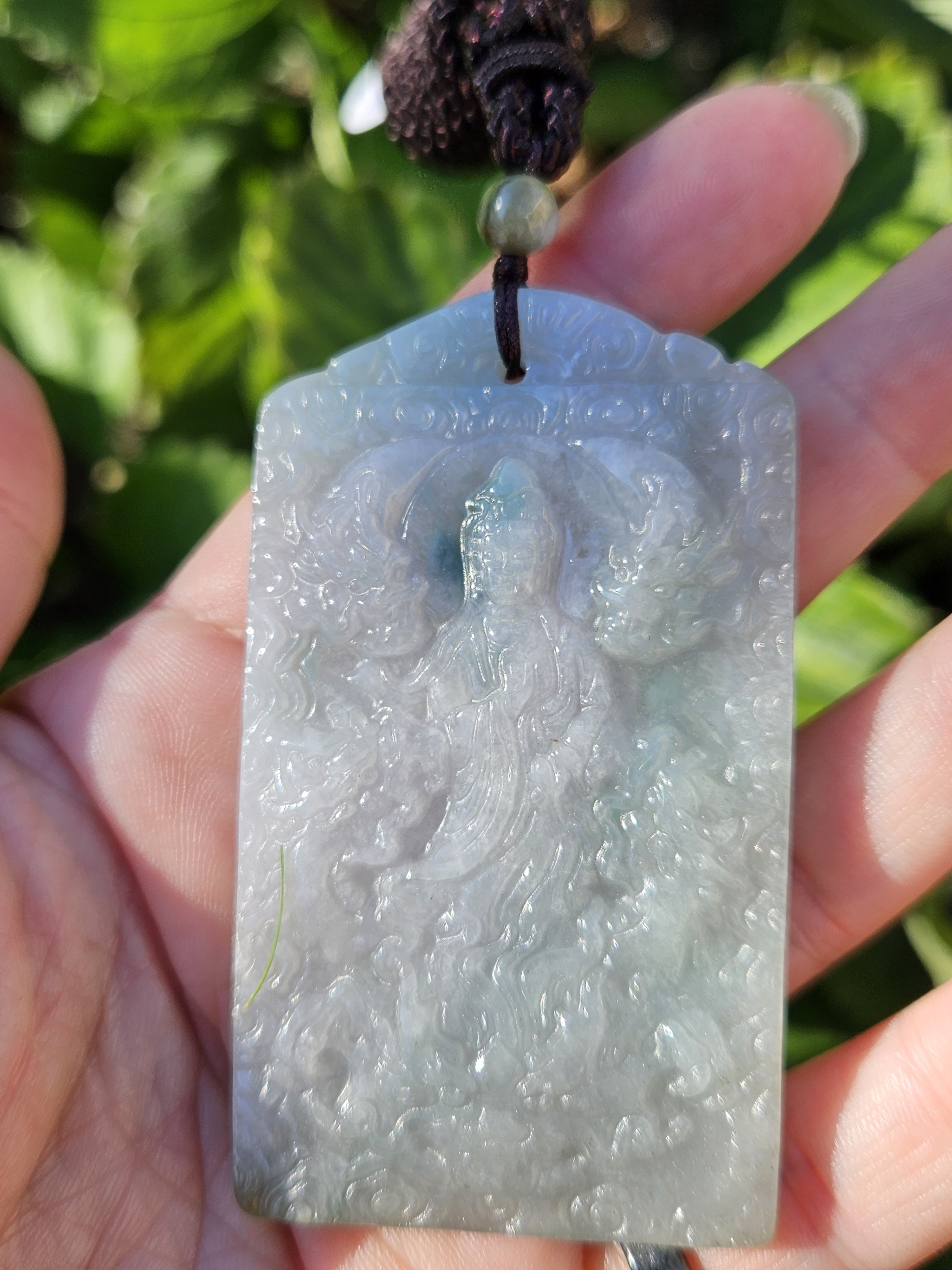 Dragons are regarded as divine mythical creatures that bring prosperity and good luck. The number nine is the greatest number in Yang and represents infinity and extremity. The c Guanyin who symbolizes compassion and mercy, is surrounded by 4 dragons and riding on 1. At the back of pendant, there are another 4 dragons on the mountain. The dragons are surrounded by lucky clouds symbolize good luck and wealth. Made of Burmese jadeite in spring colour aka putple and green, it measures 69 x 39.5 x 7.9mm, comes with a certificate of authenticity. Comes on an adjustable string chain. £79