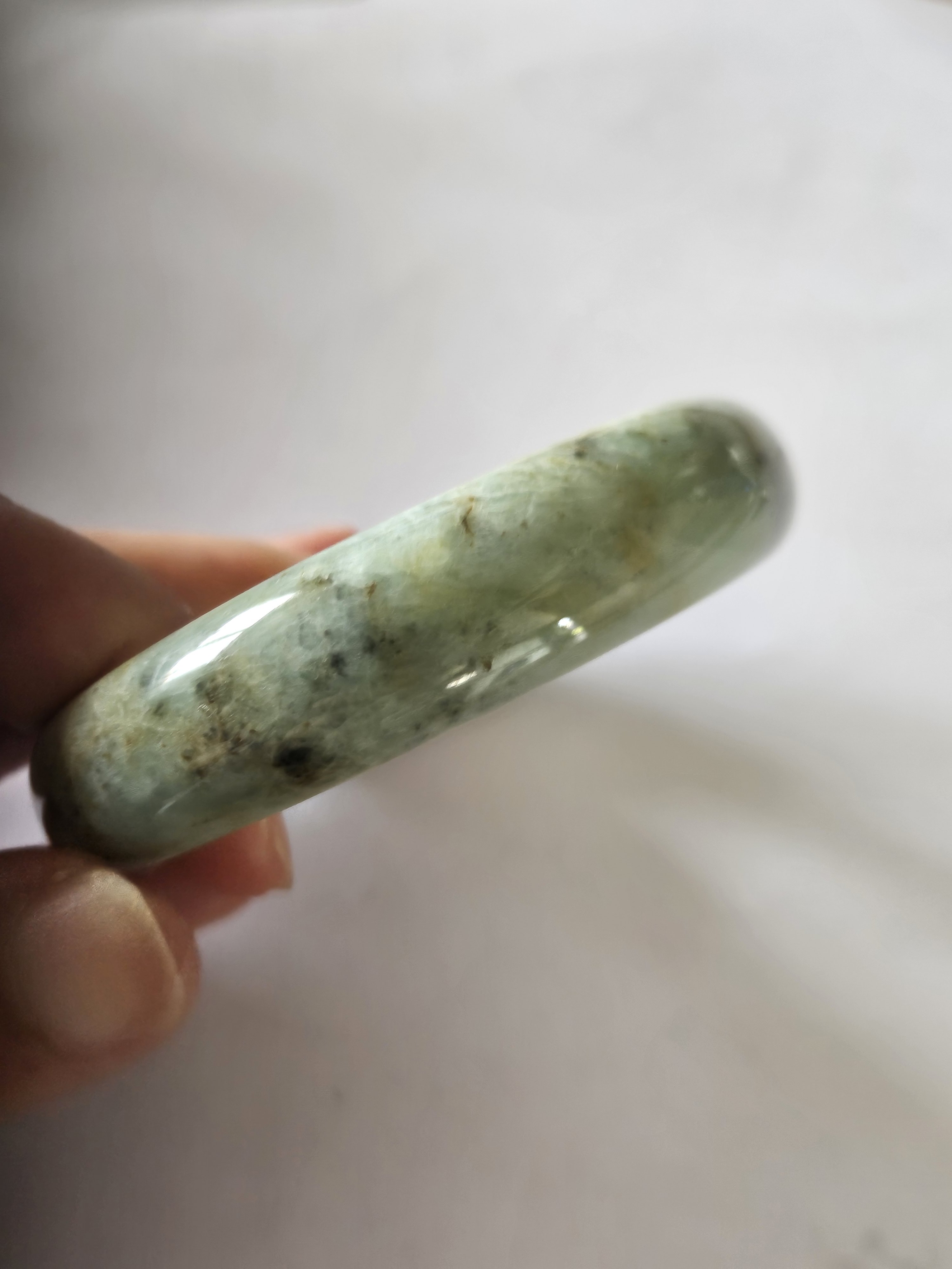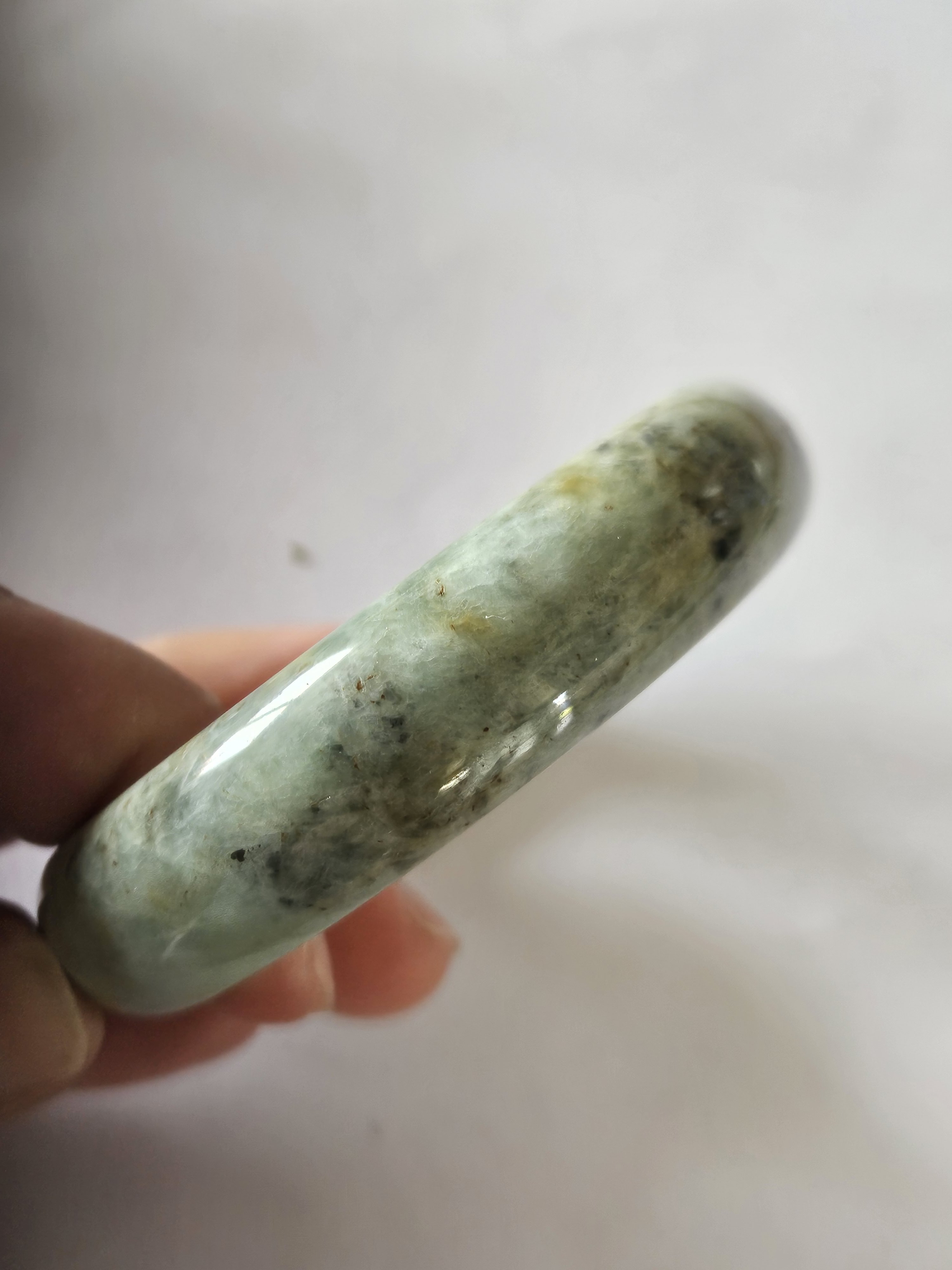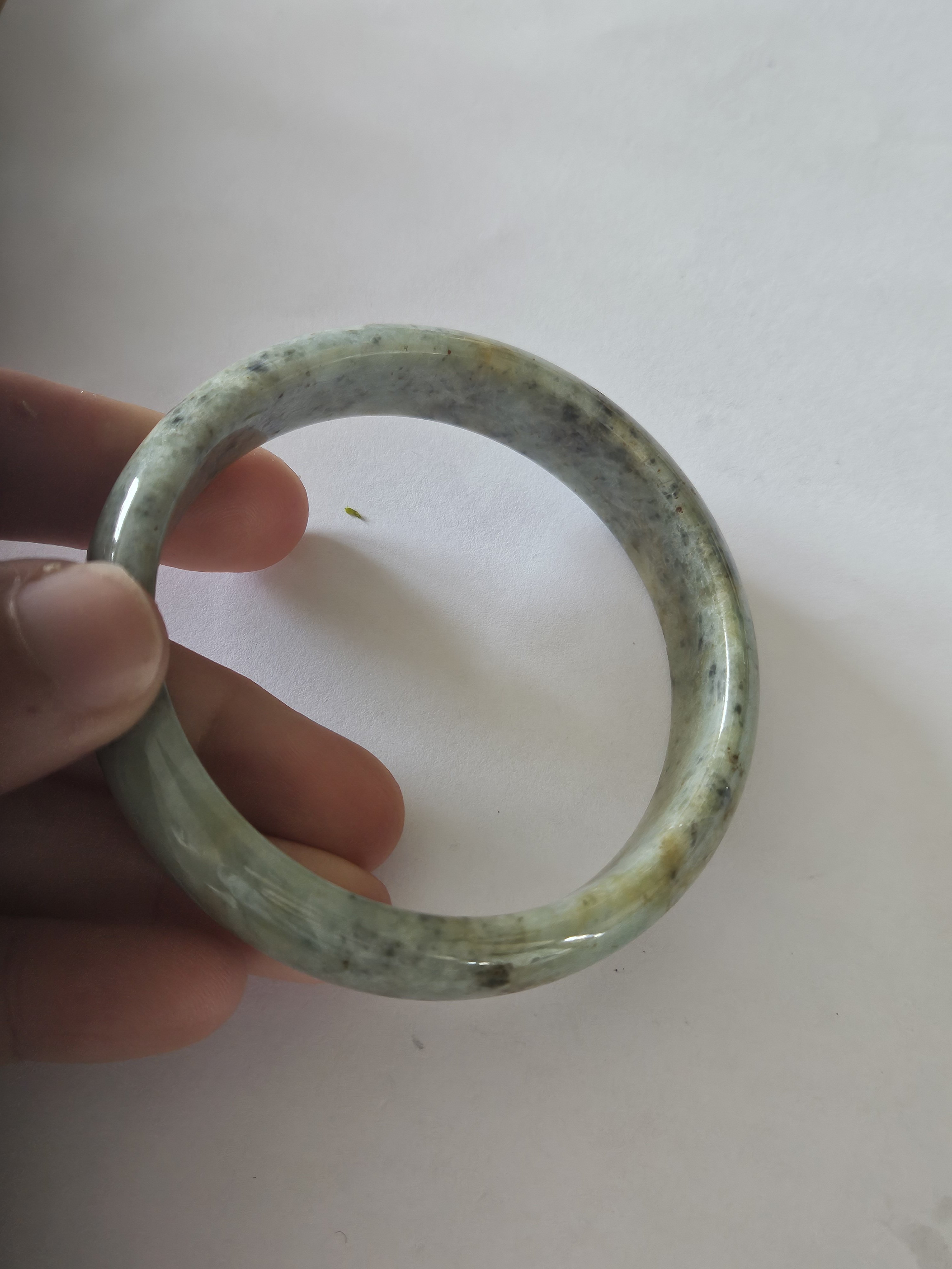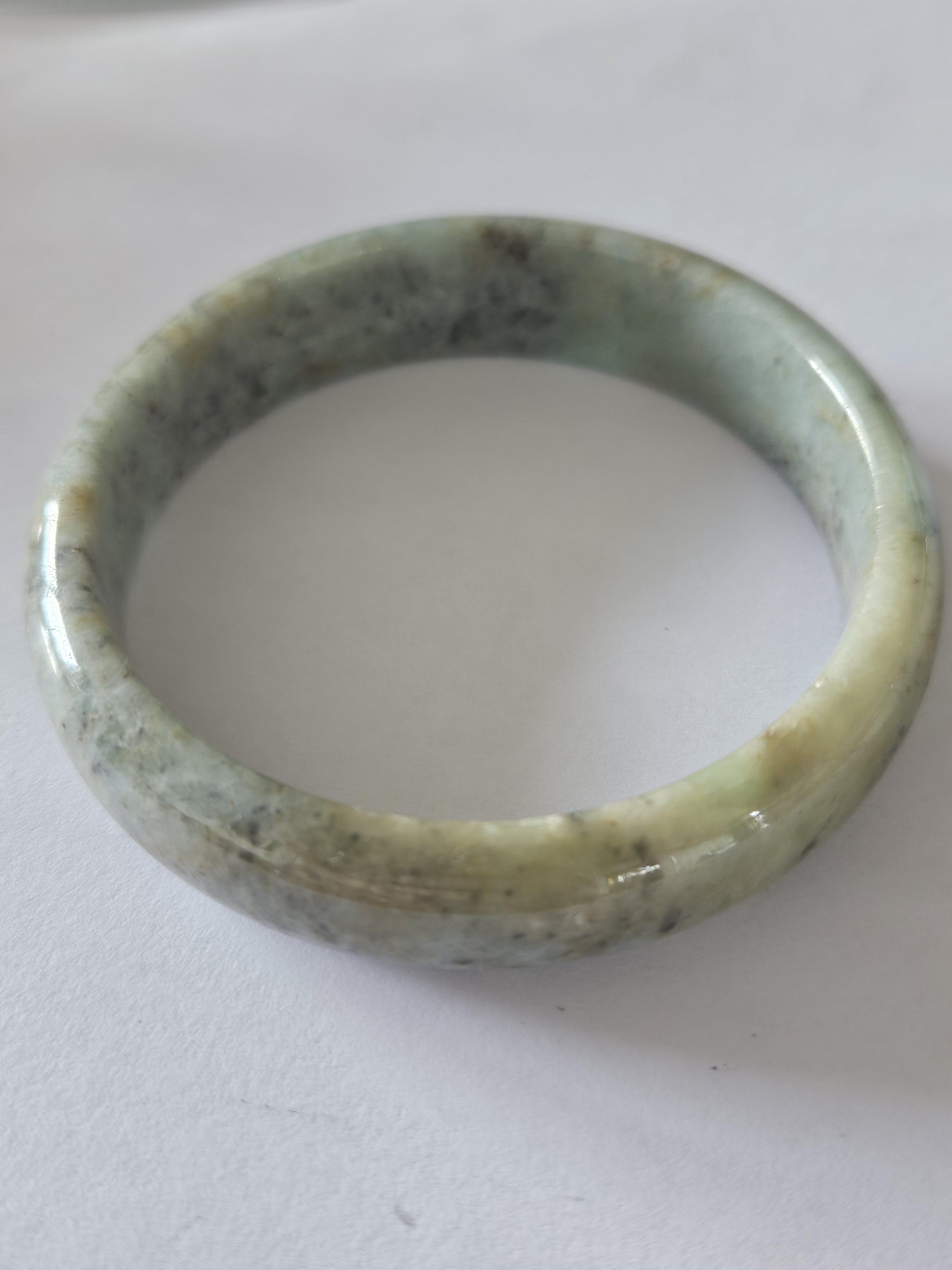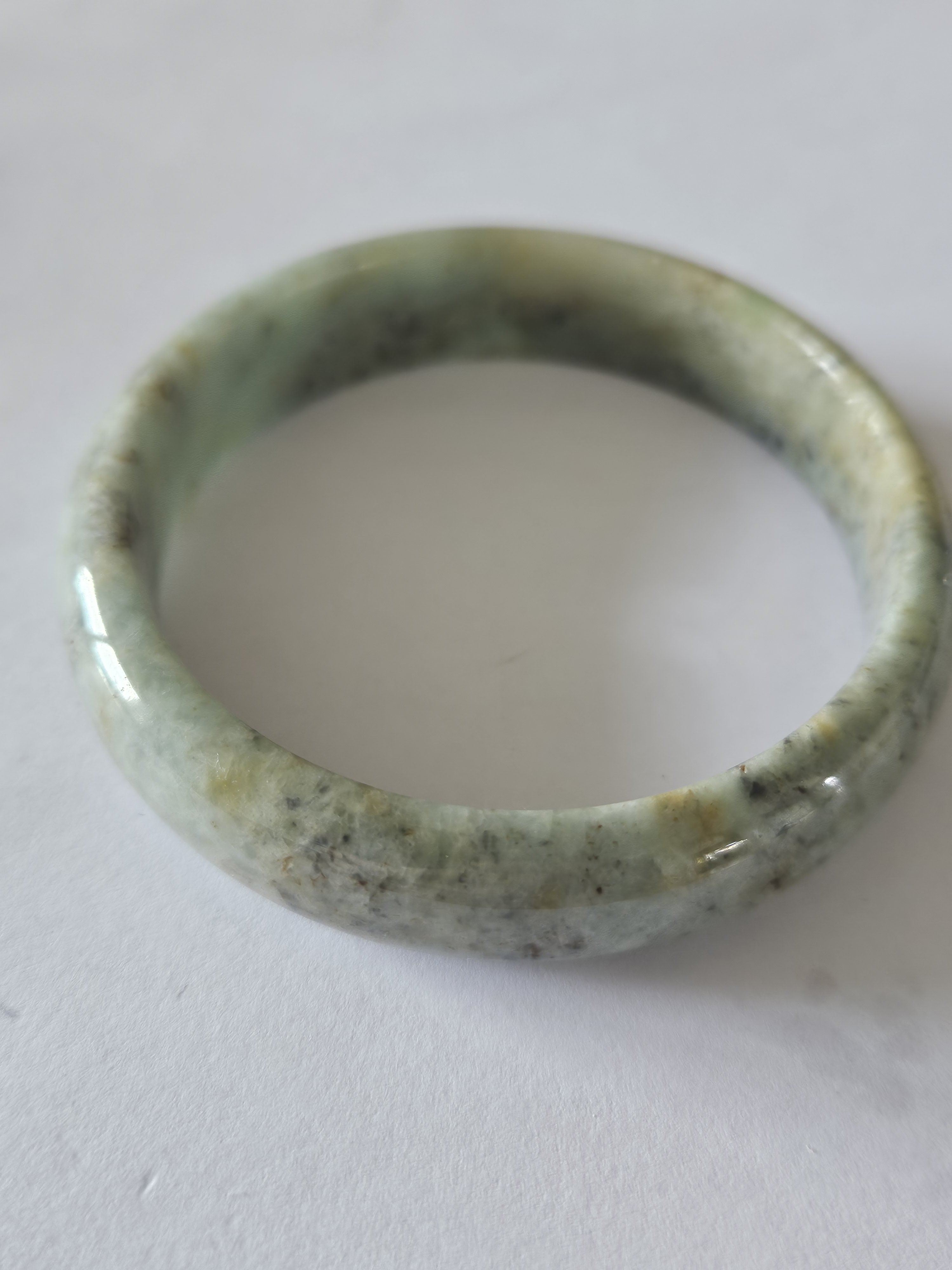 Gorgeous light green Burmese jadeite bangle that is 14.3mm wide, 6.6mm thick, full of yellow and smoky grey speckles, internal diameter measures 57.4mm, weighs 52.79g, comes with a certificate of authenticity £79.
