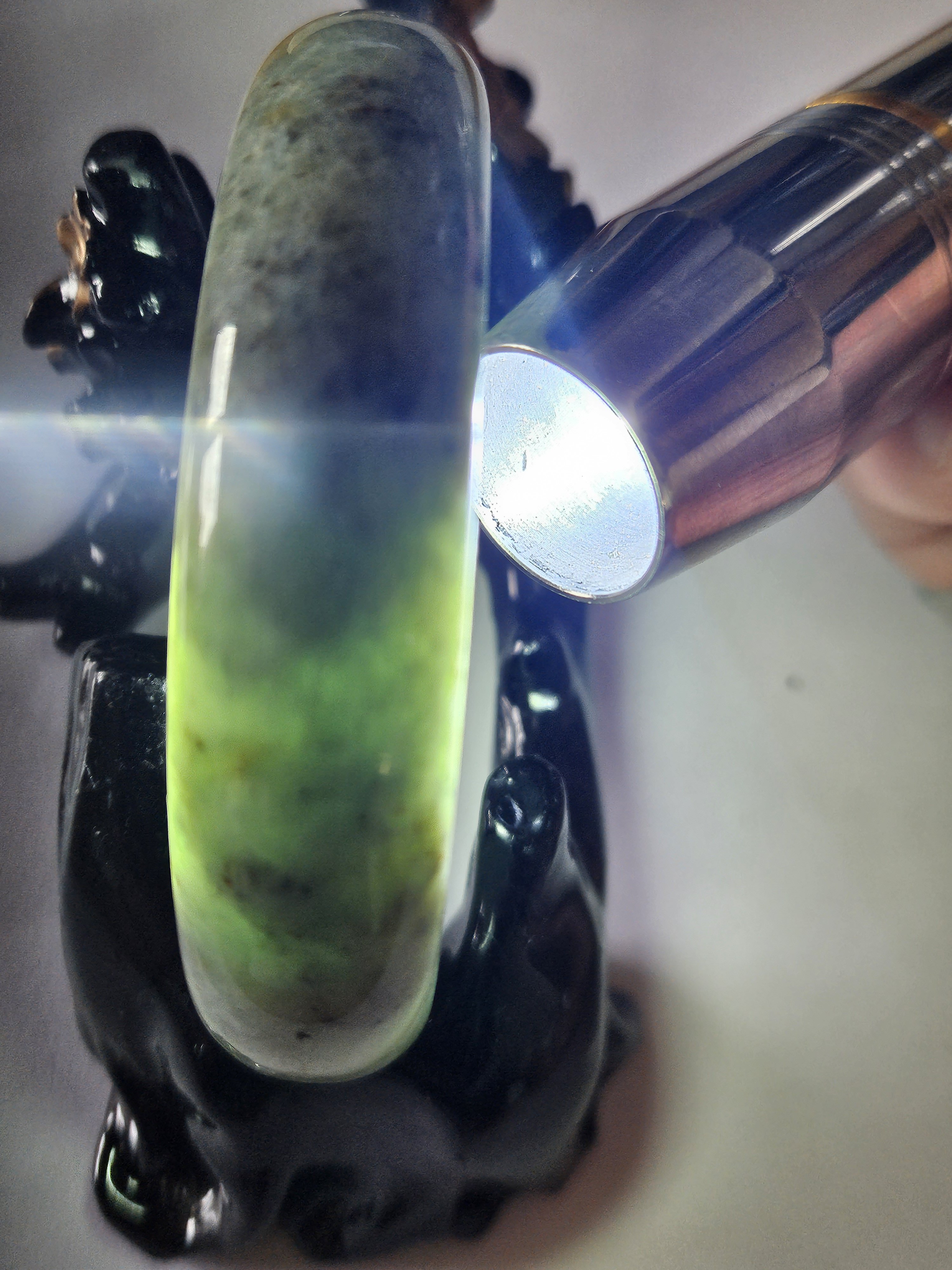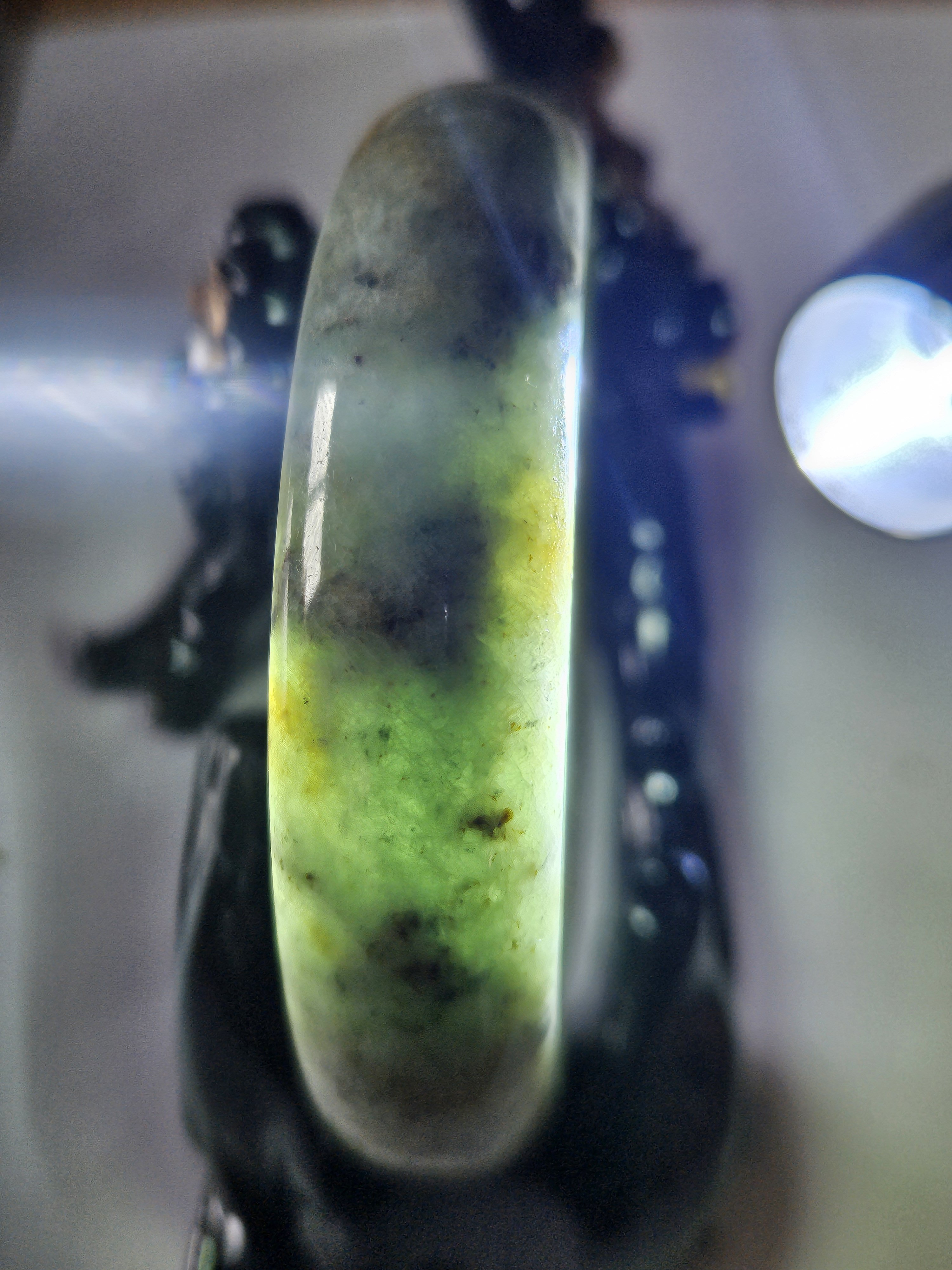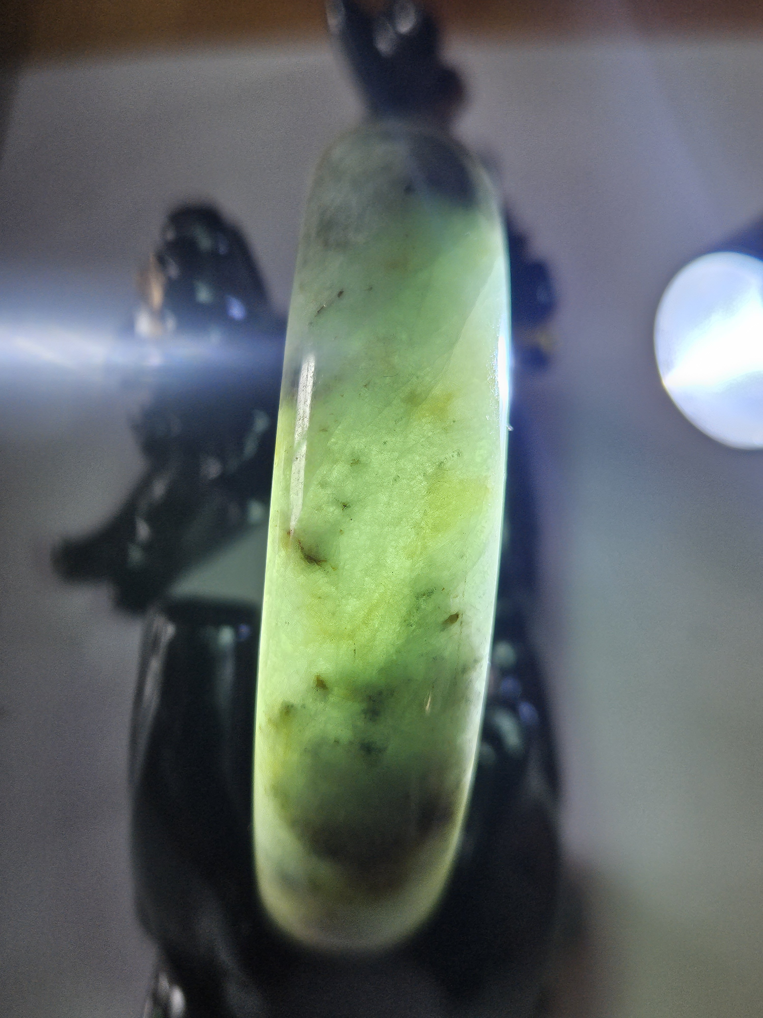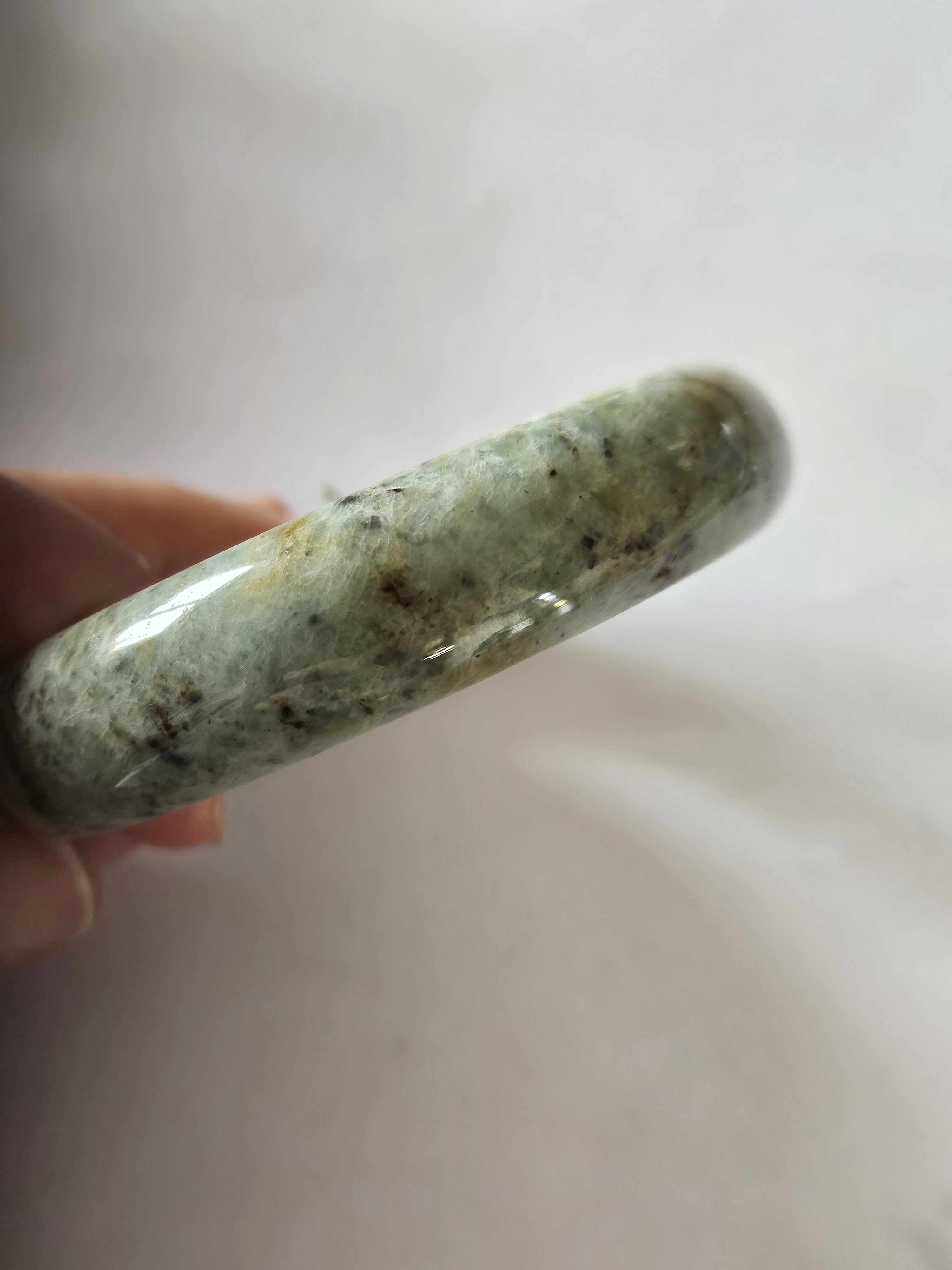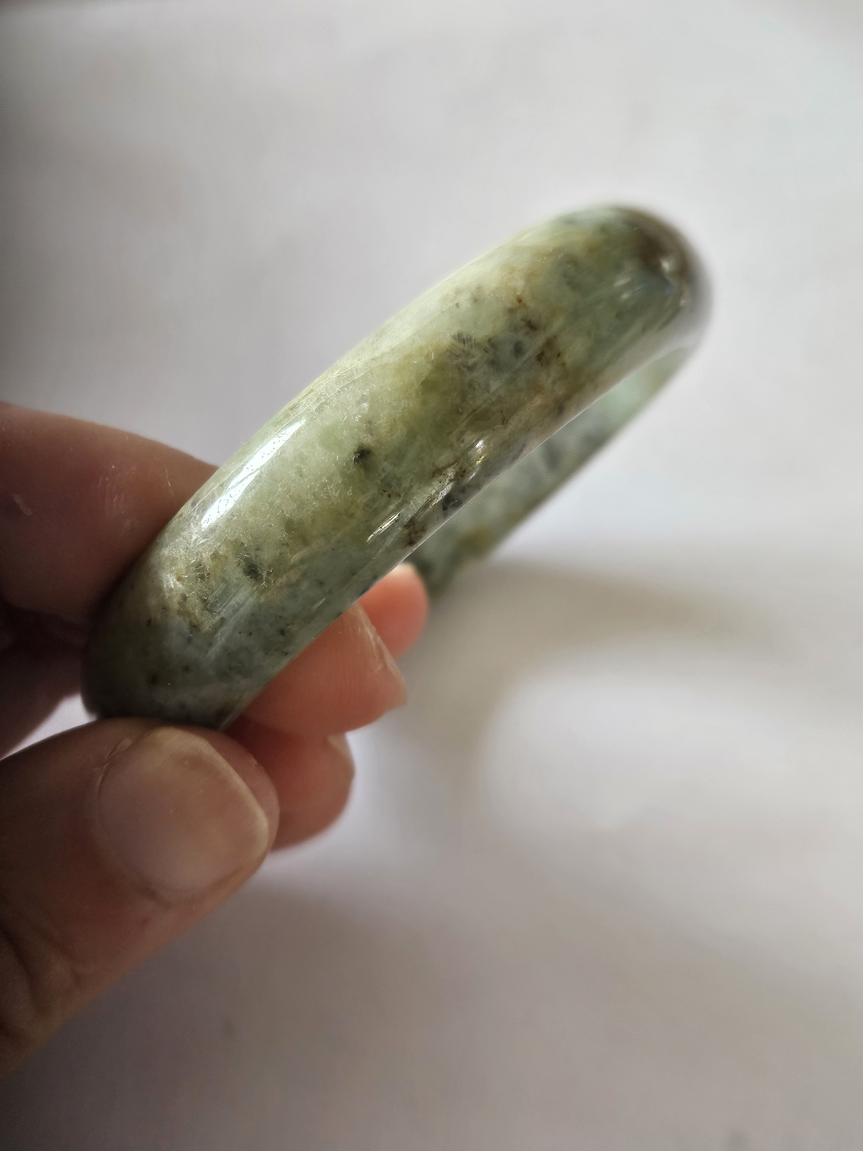 Gorgeous light green Burmese jadeite bangle that is 14.3mm wide, 6.6mm thick, full of yellow and smoky grey speckles, internal diameter measures 57.4mm, weighs 52.79g, comes with a certificate of authenticity £79.