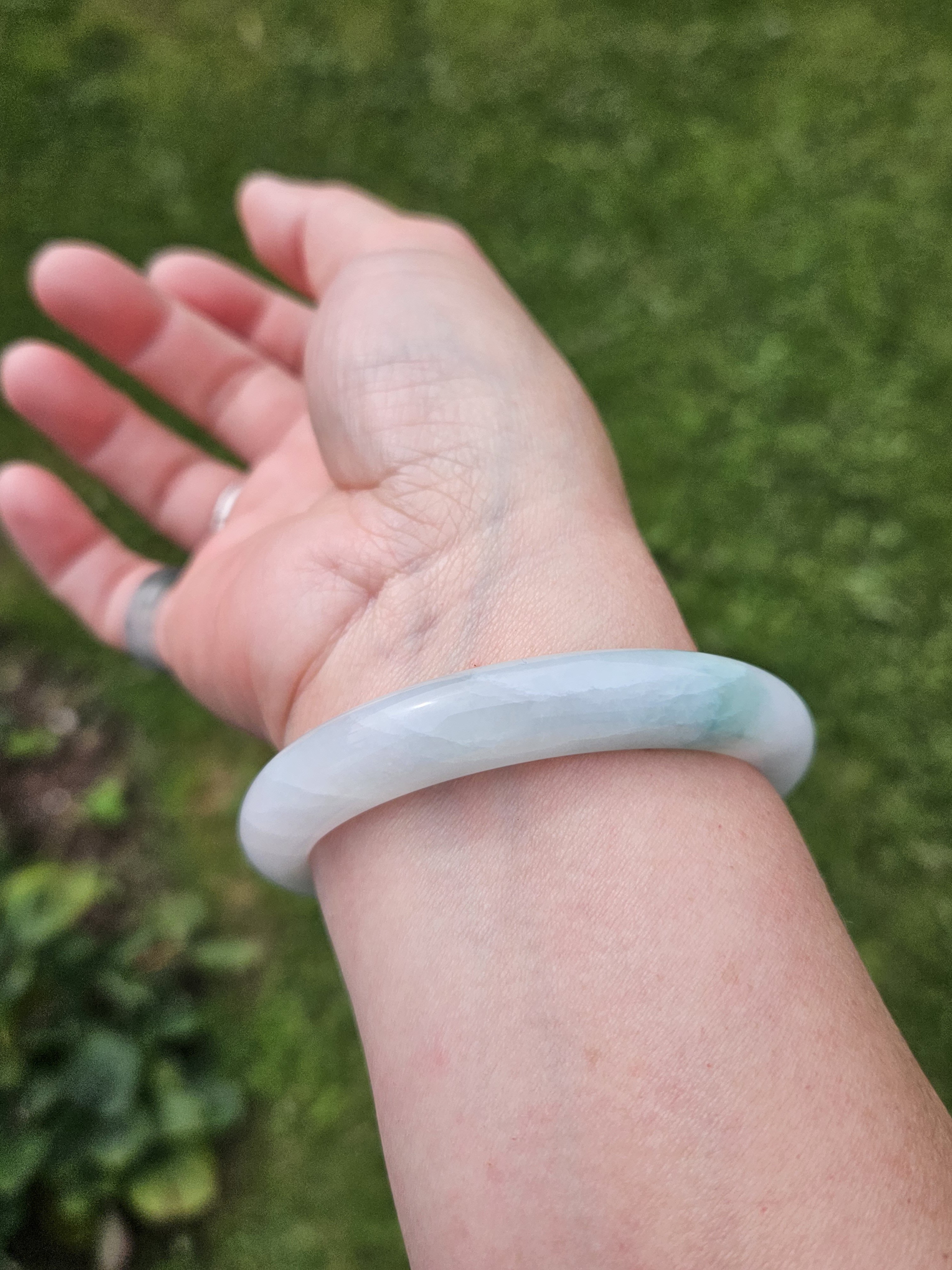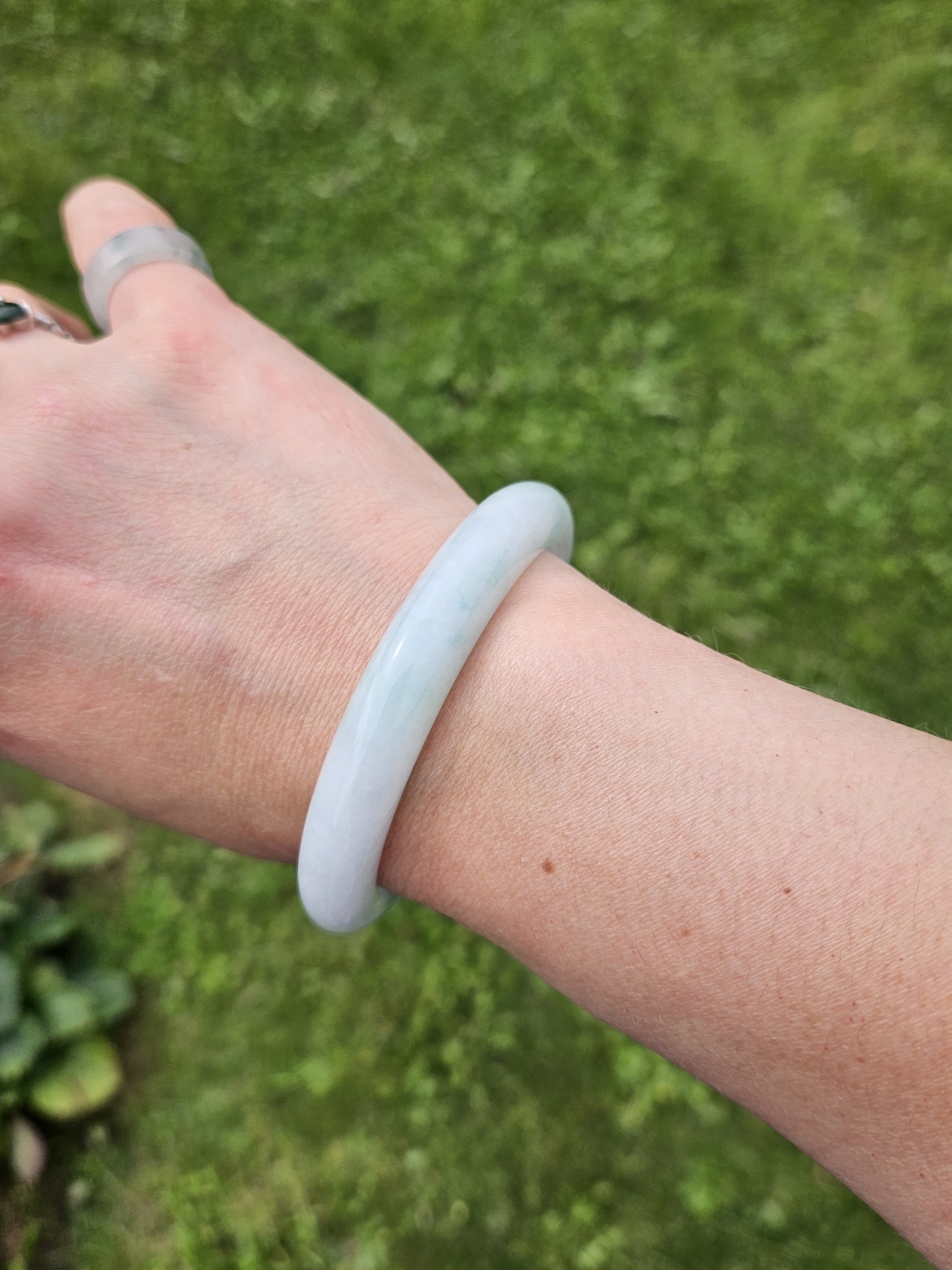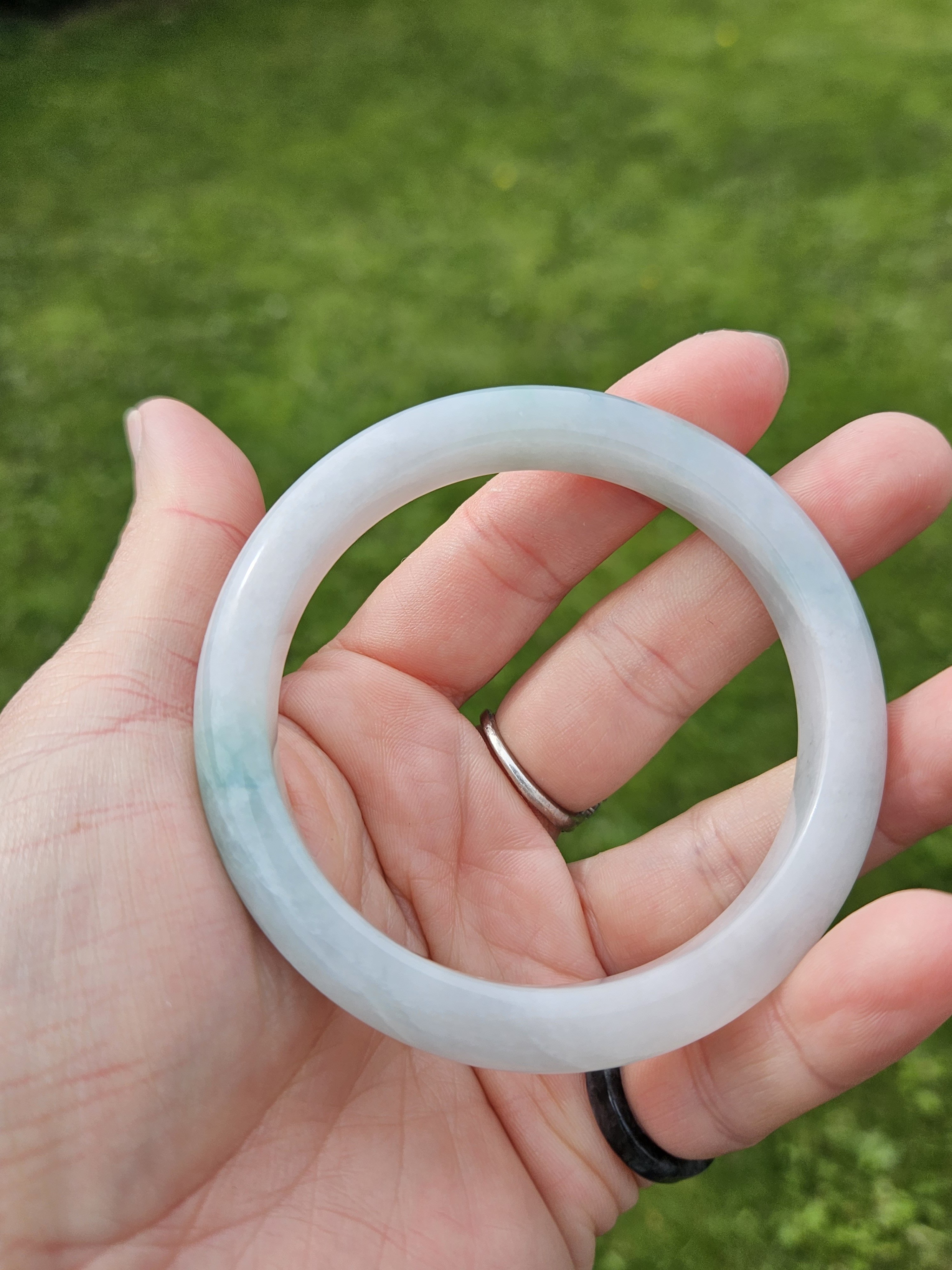 Good quality icy jadeite bangle green blooms, it has multiple internal cracks but do not affect usage. Measures 57 x 10.4 x 7.9mm, weighs 48.53g, comes with a certificate of authenticity £188