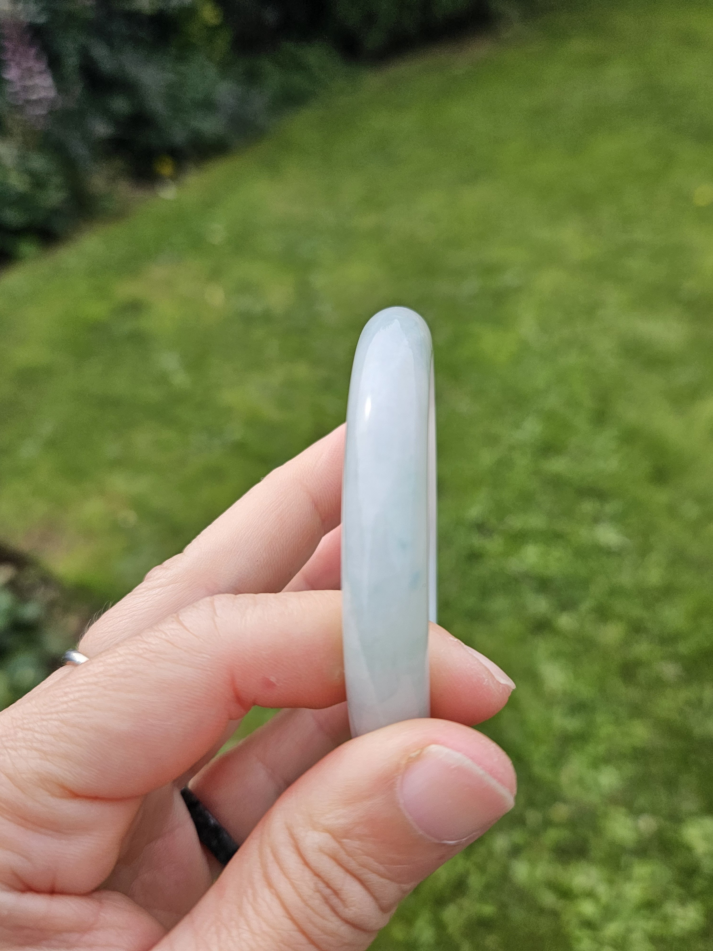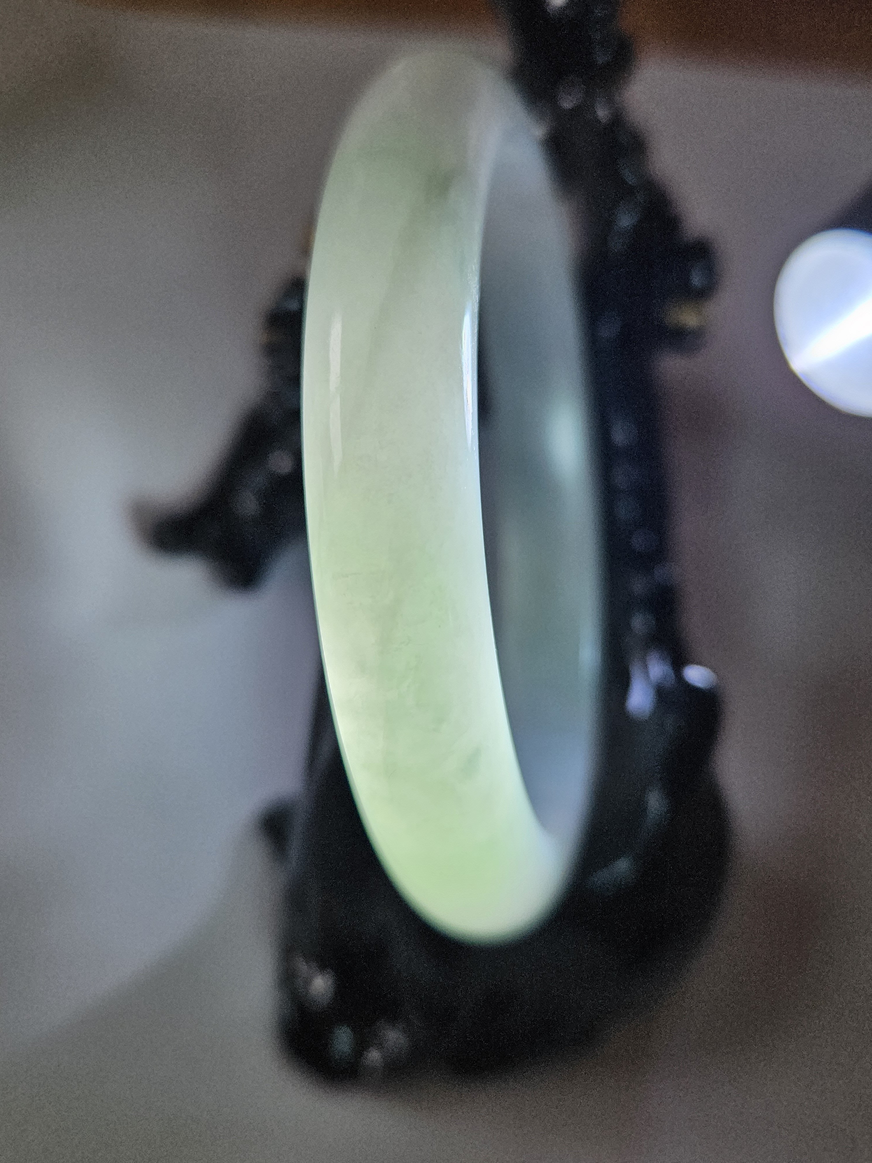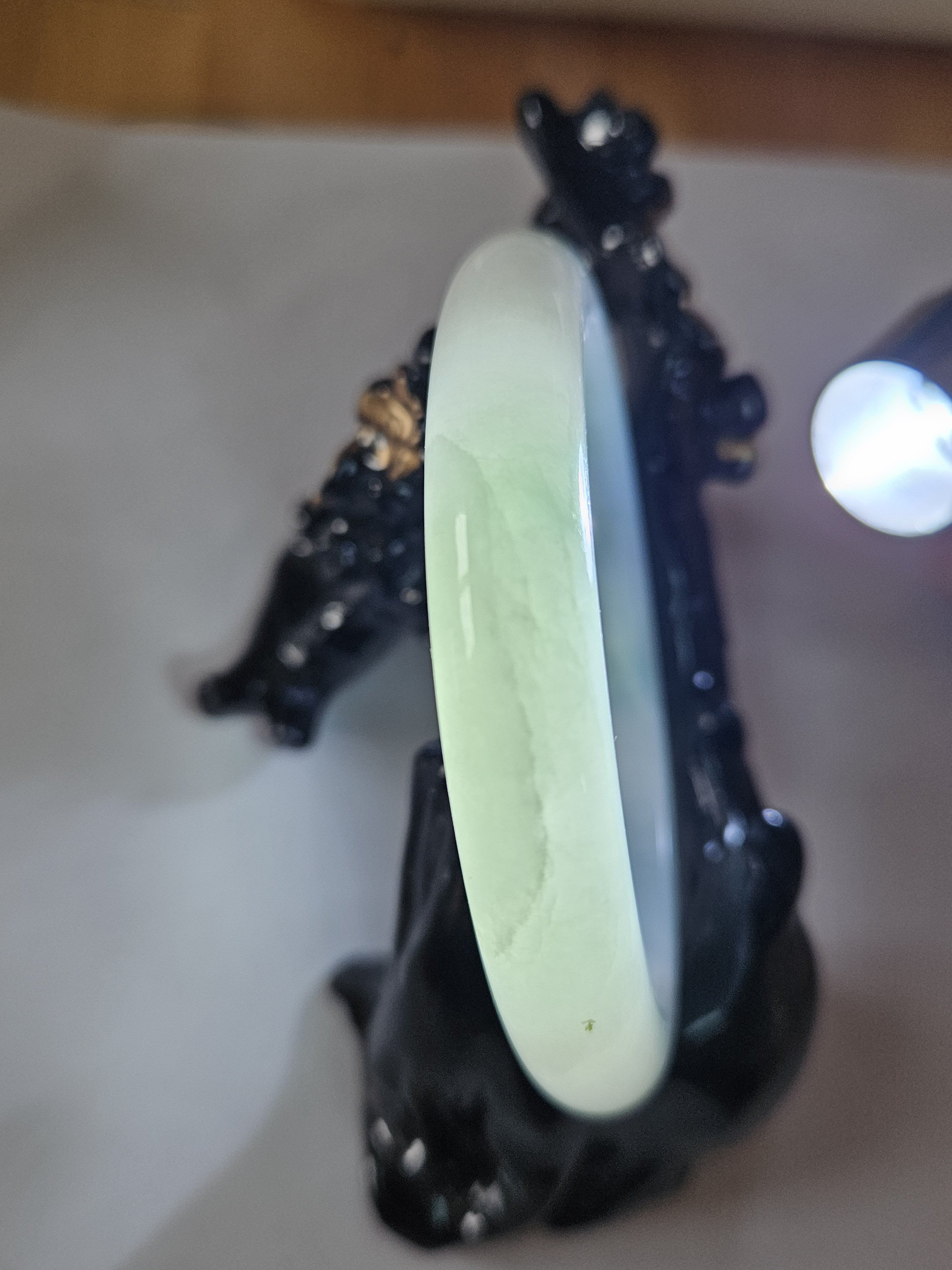 Good quality icy jadeite bangle green blooms, it has multiple internal cracks but do not affect usage. Measures 57 x 10.4 x 7.9mm, weighs 48.53g, comes with a certificate of authenticity £188
