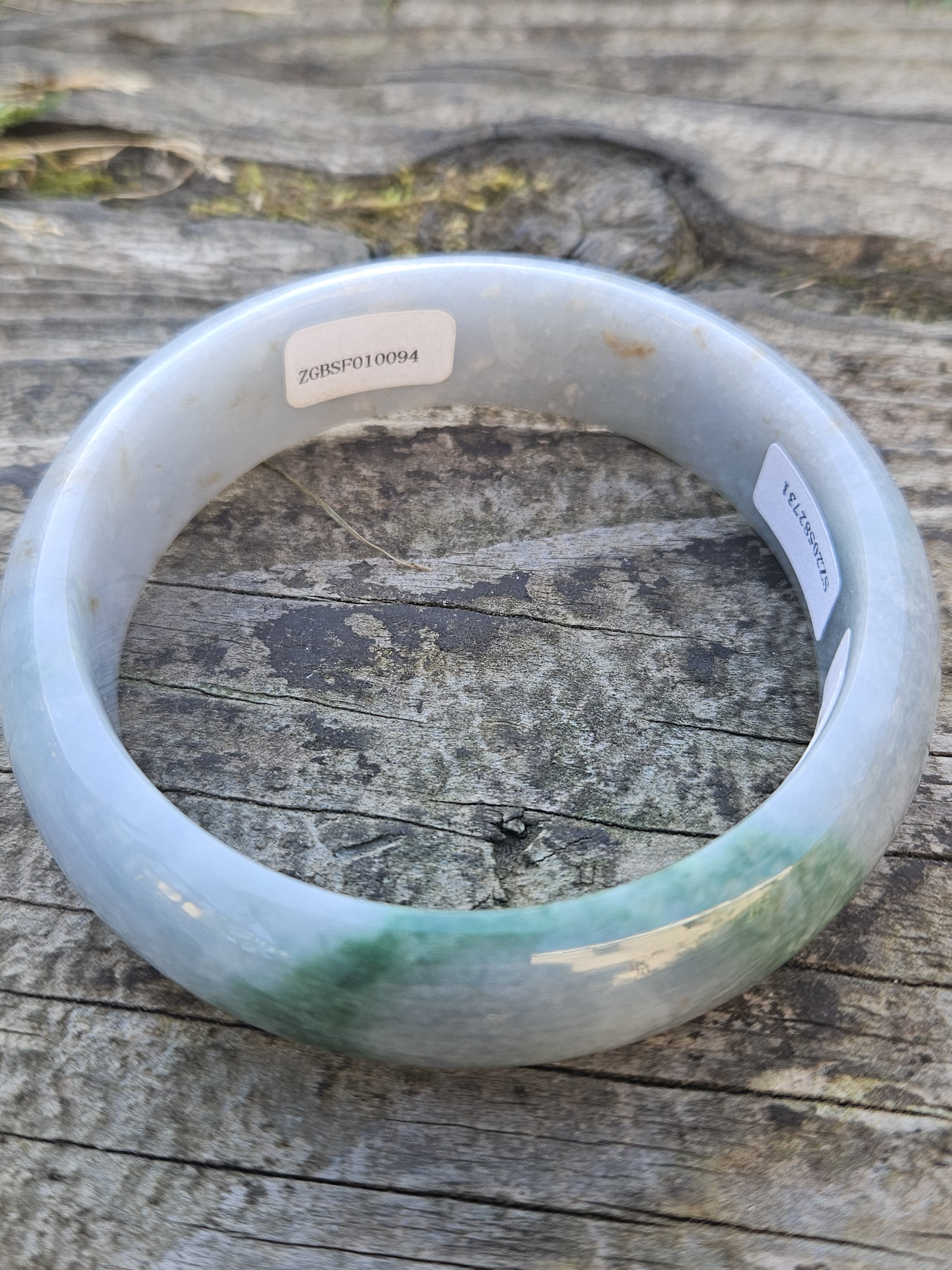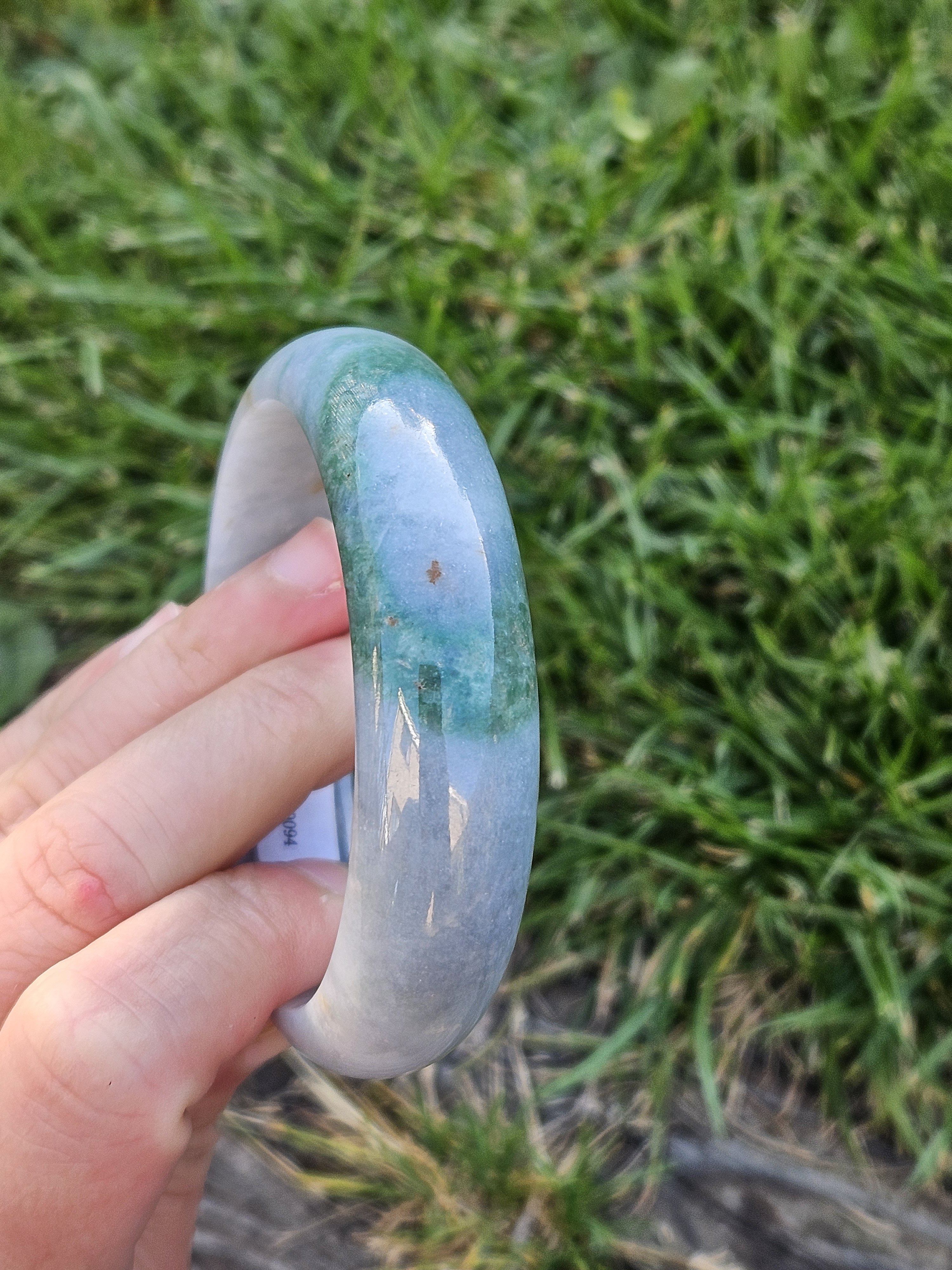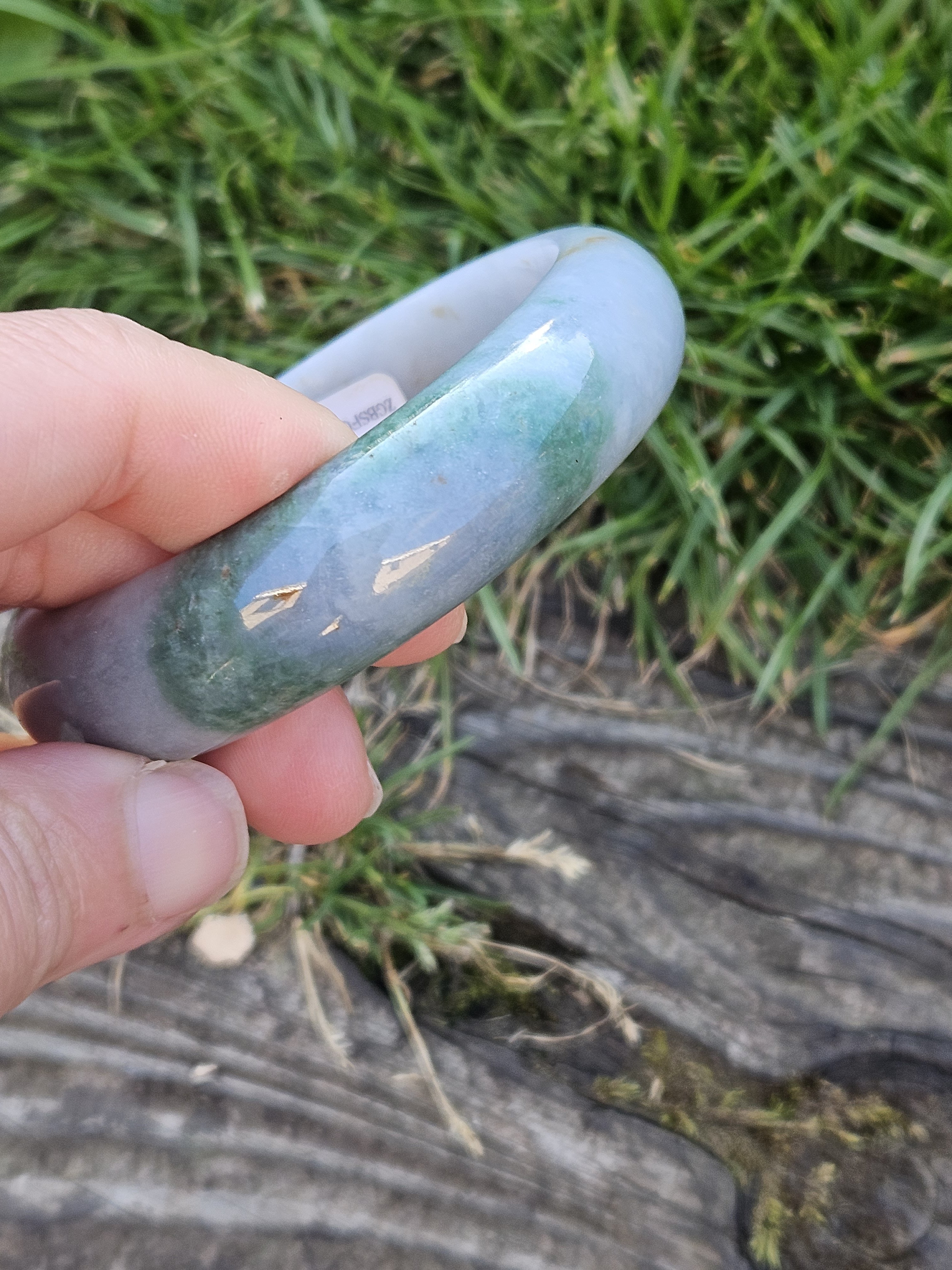 Lovely modern looking wide light green Burmese jadeite bangle with a patch of dark green measures 57.3 x 16.3 x 8.3mm, weighs 87.15g. Comes with a certificate of authenticity. £109