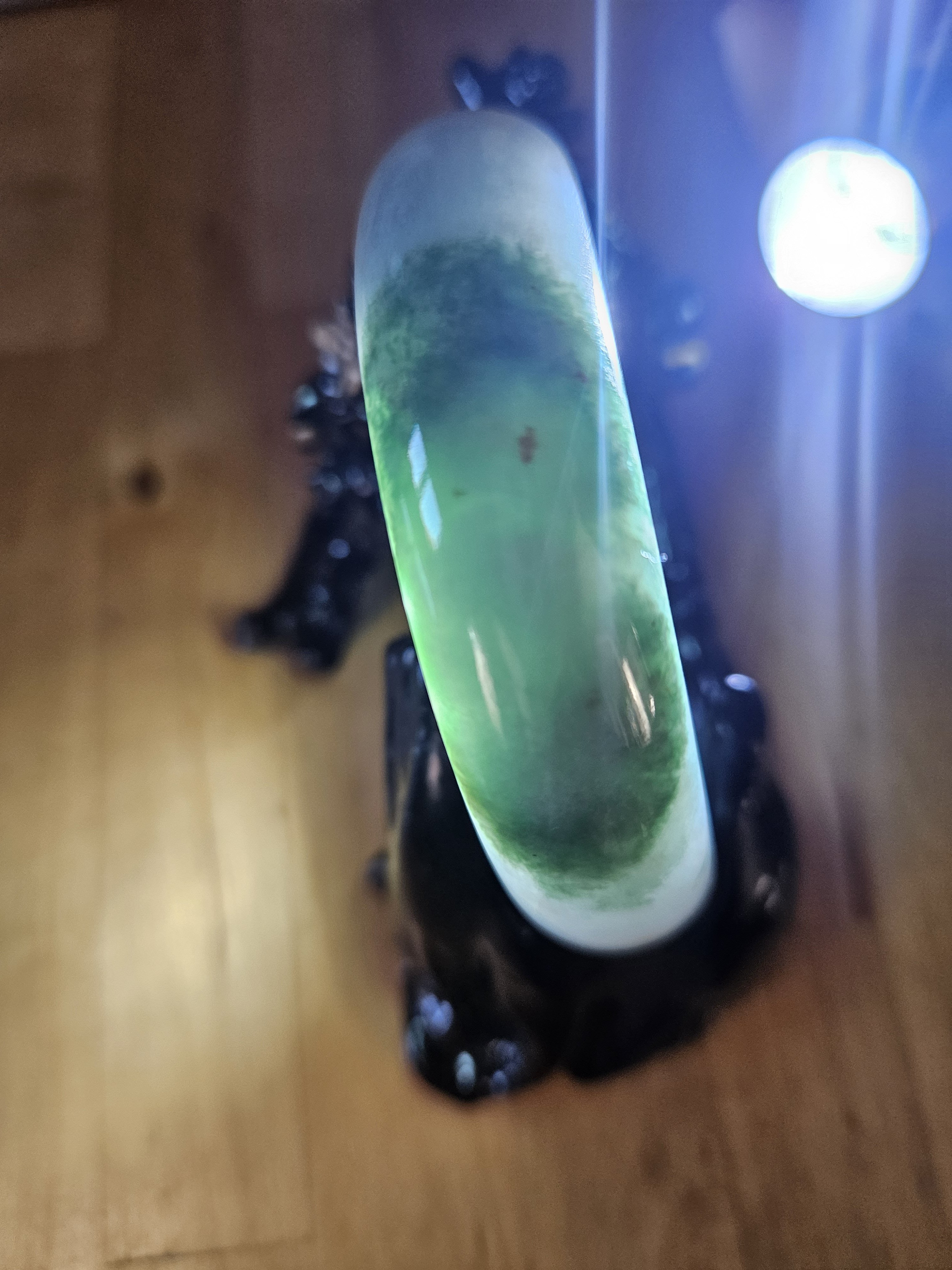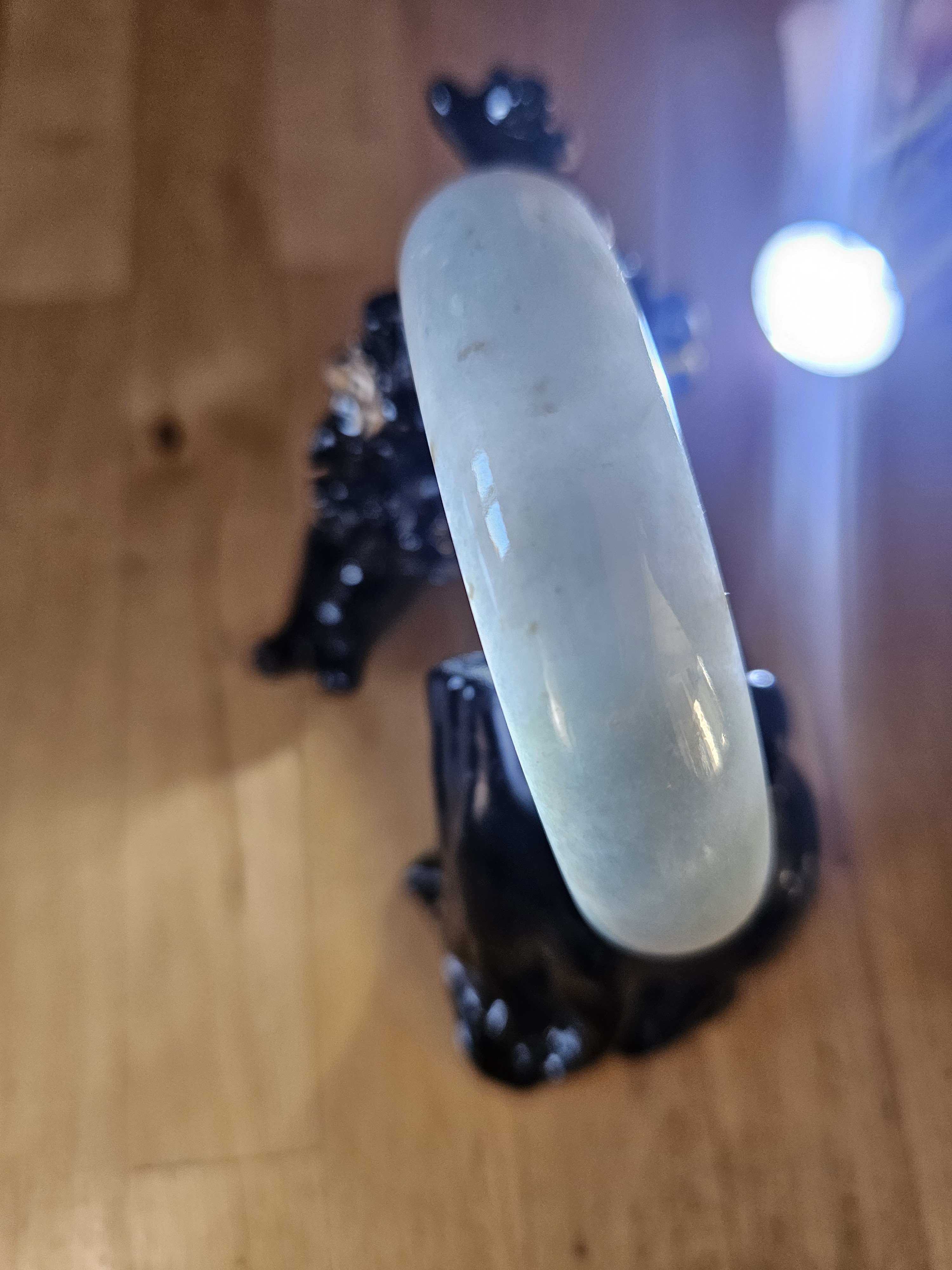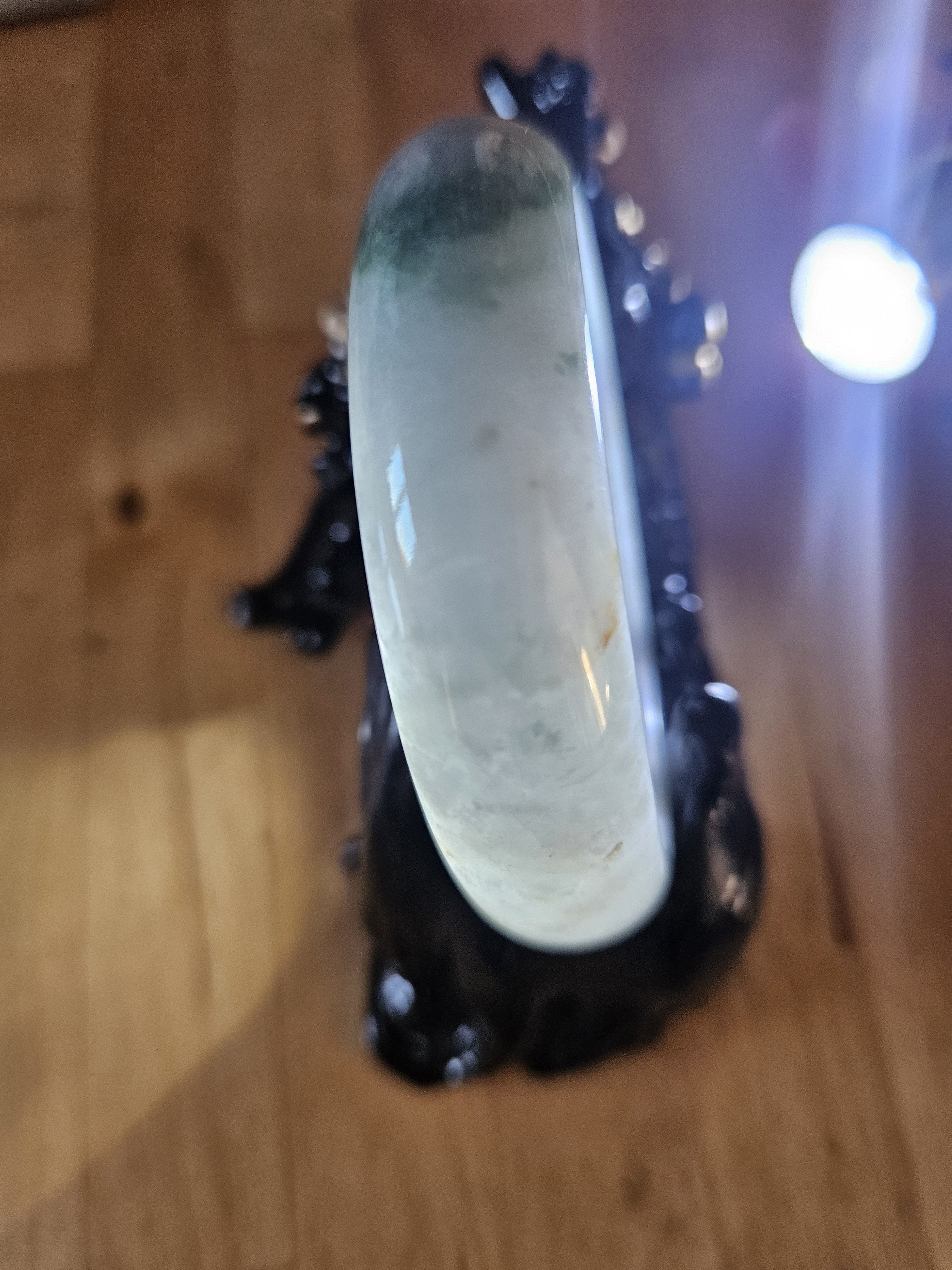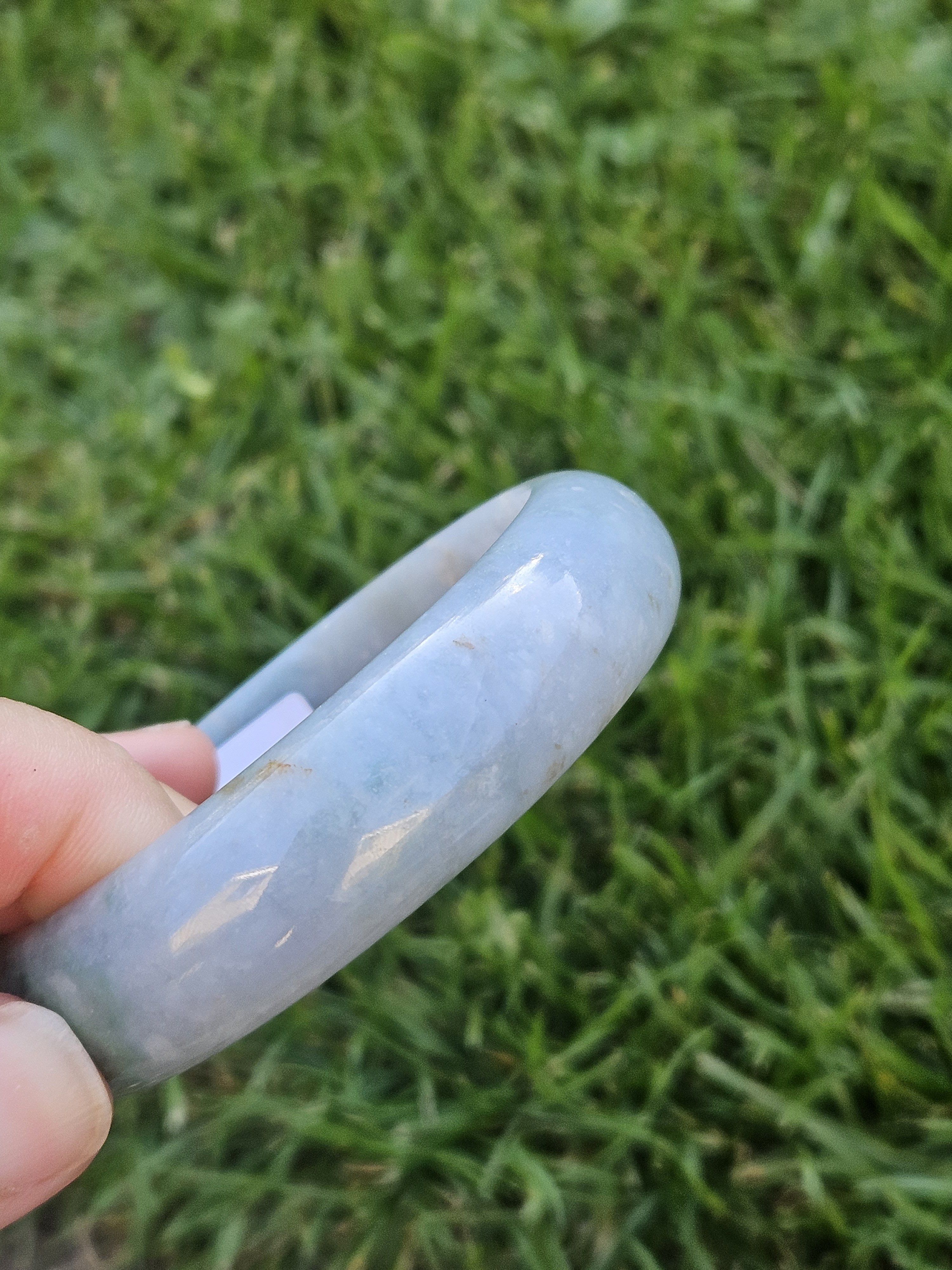 Lovely modern looking wide light green Burmese jadeite bangle with a patch of dark green measures 57.3 x 16.3 x 8.3mm, weighs 87.15g. Comes with a certificate of authenticity. £109