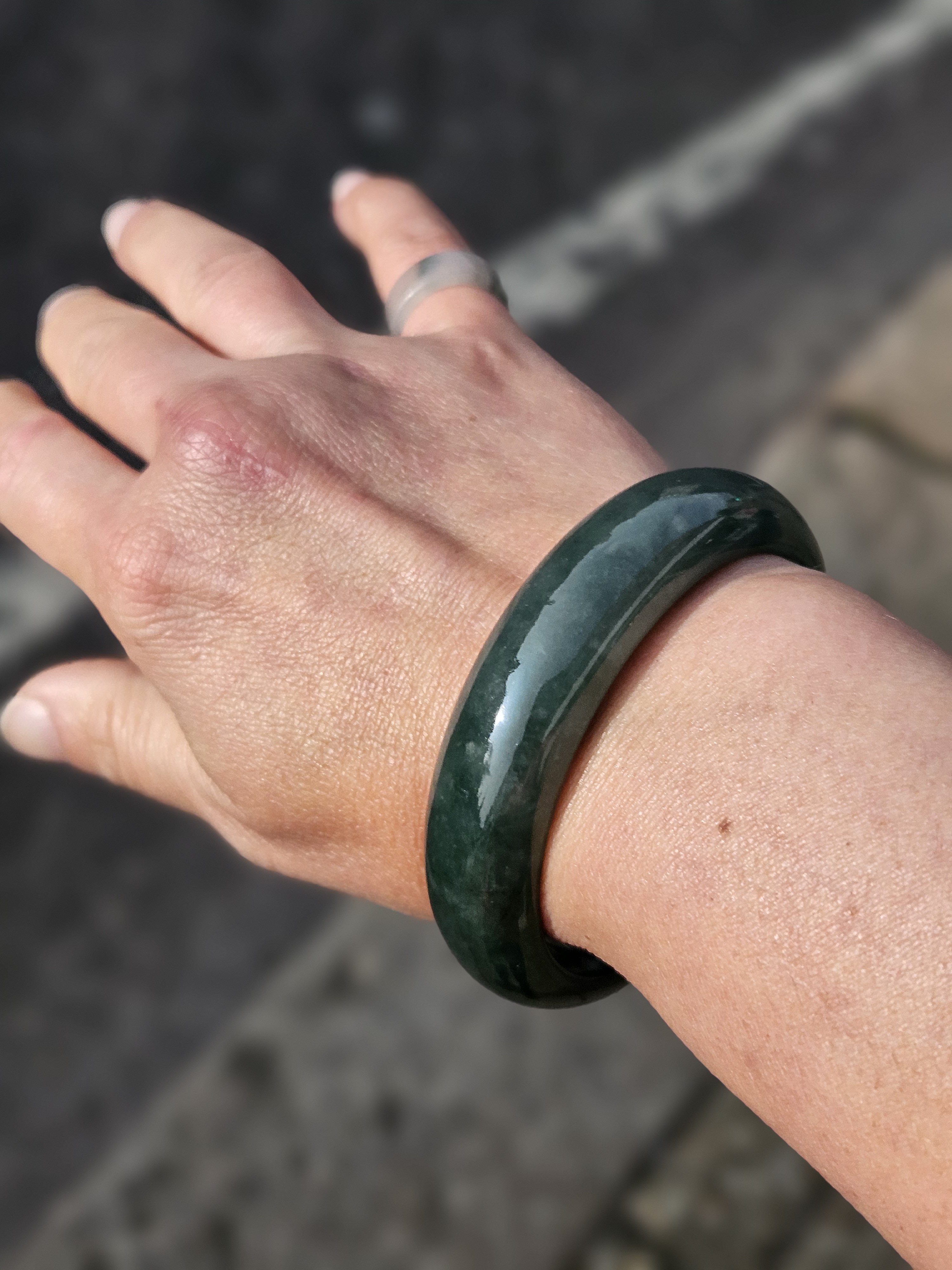 Beautiful modern looking full green bangle measures 56.7 x 17.5 x 8.8mm, weighs 78.12g, comes with a certificate of authenticity.