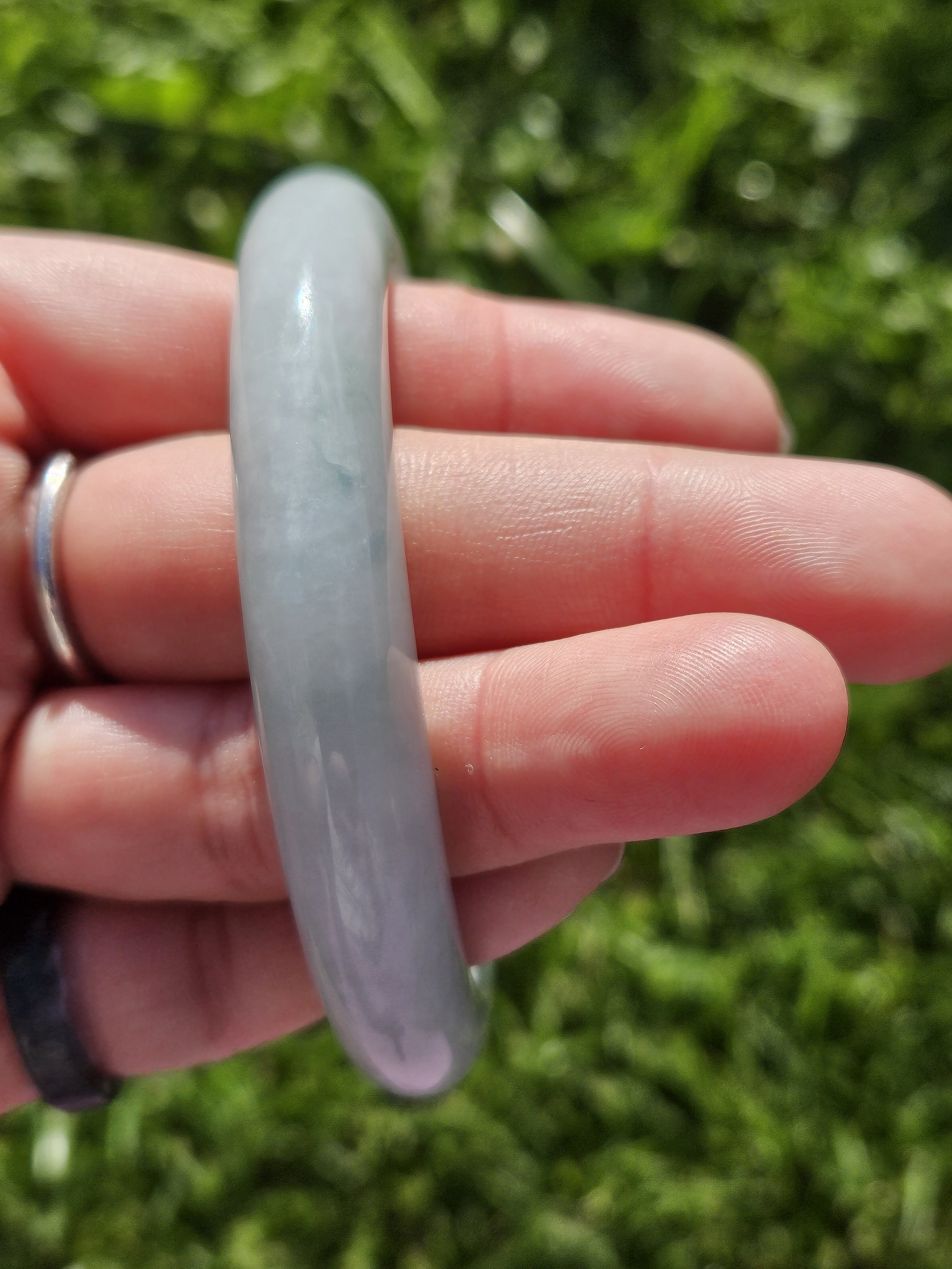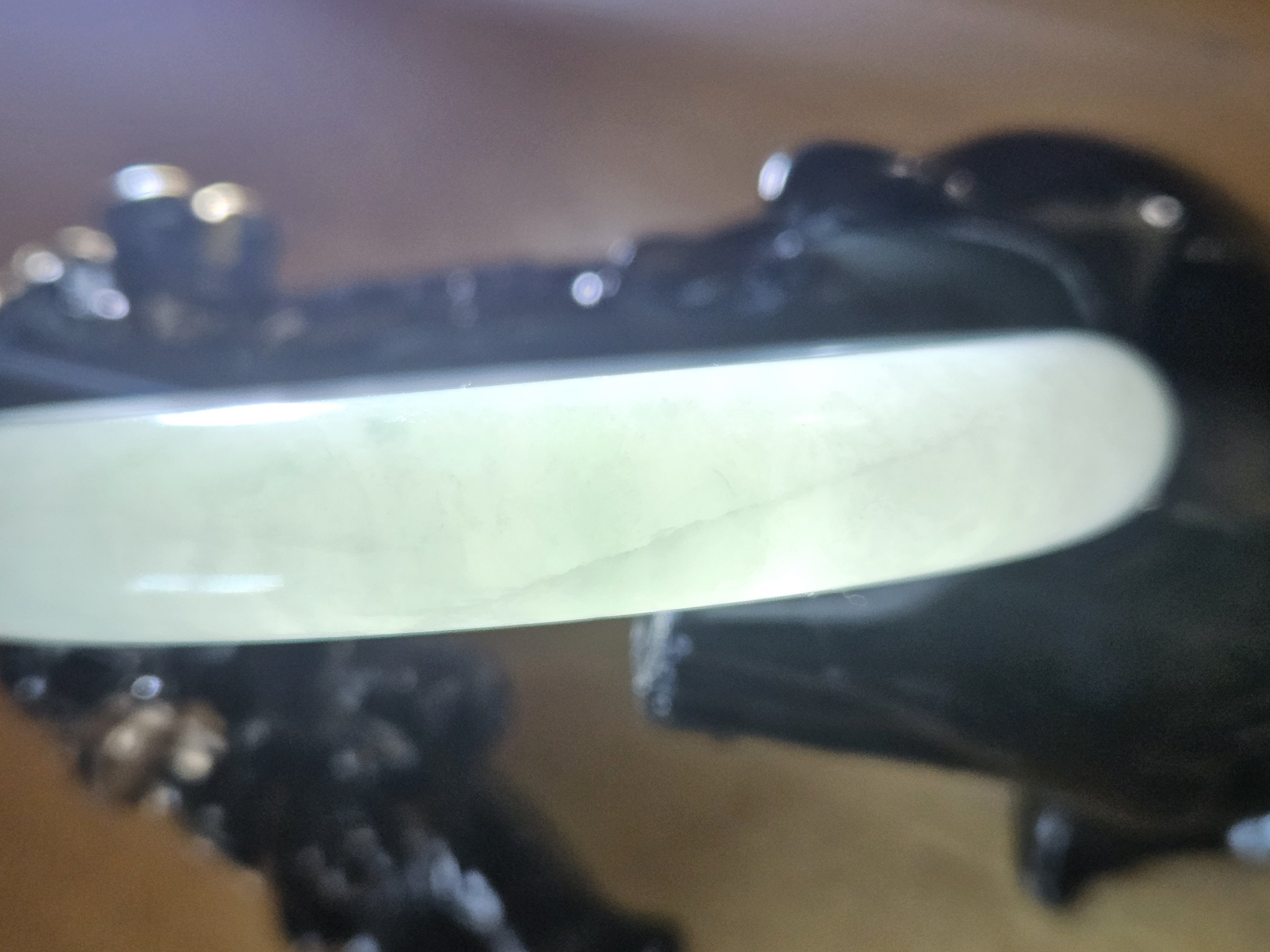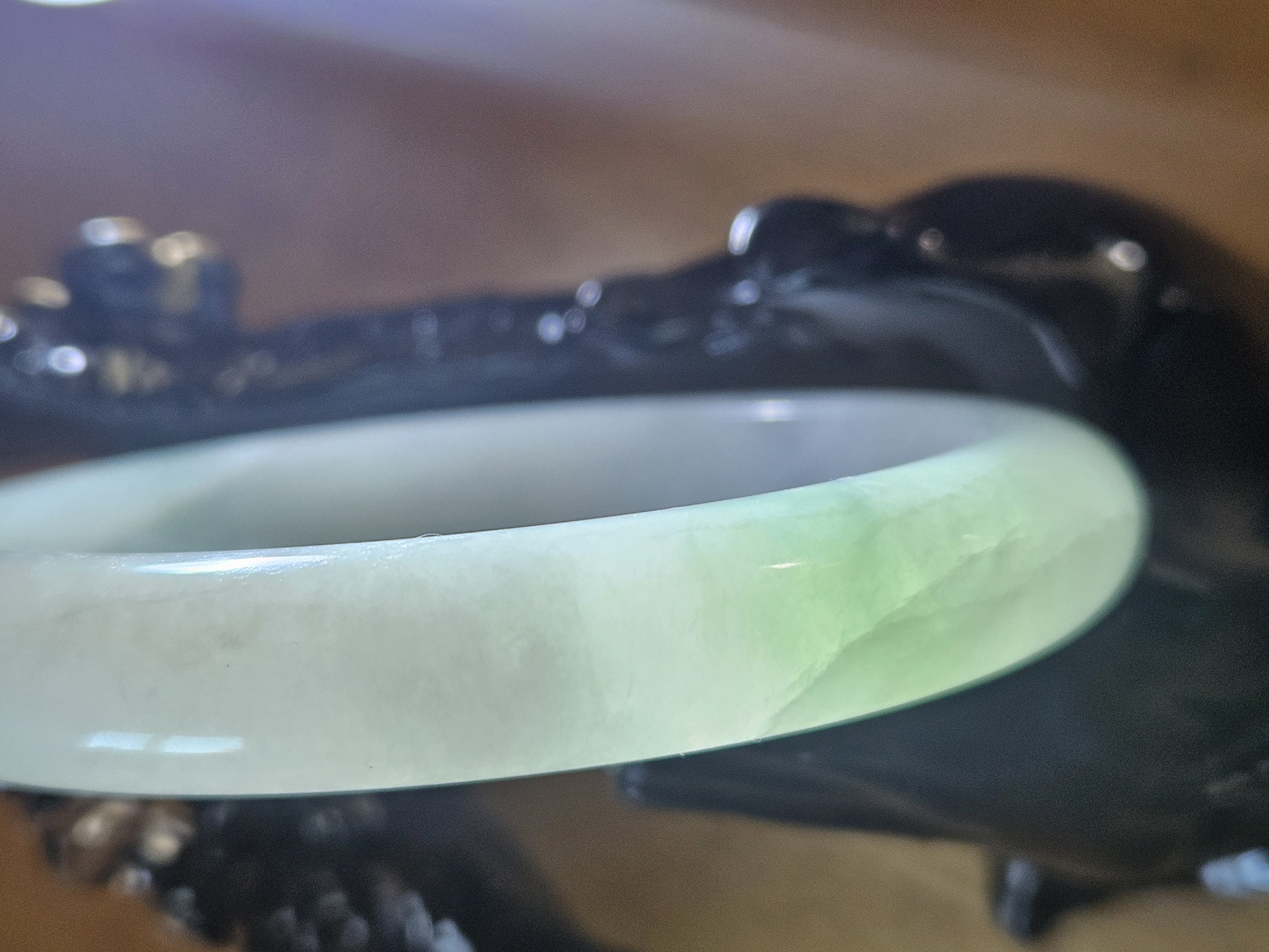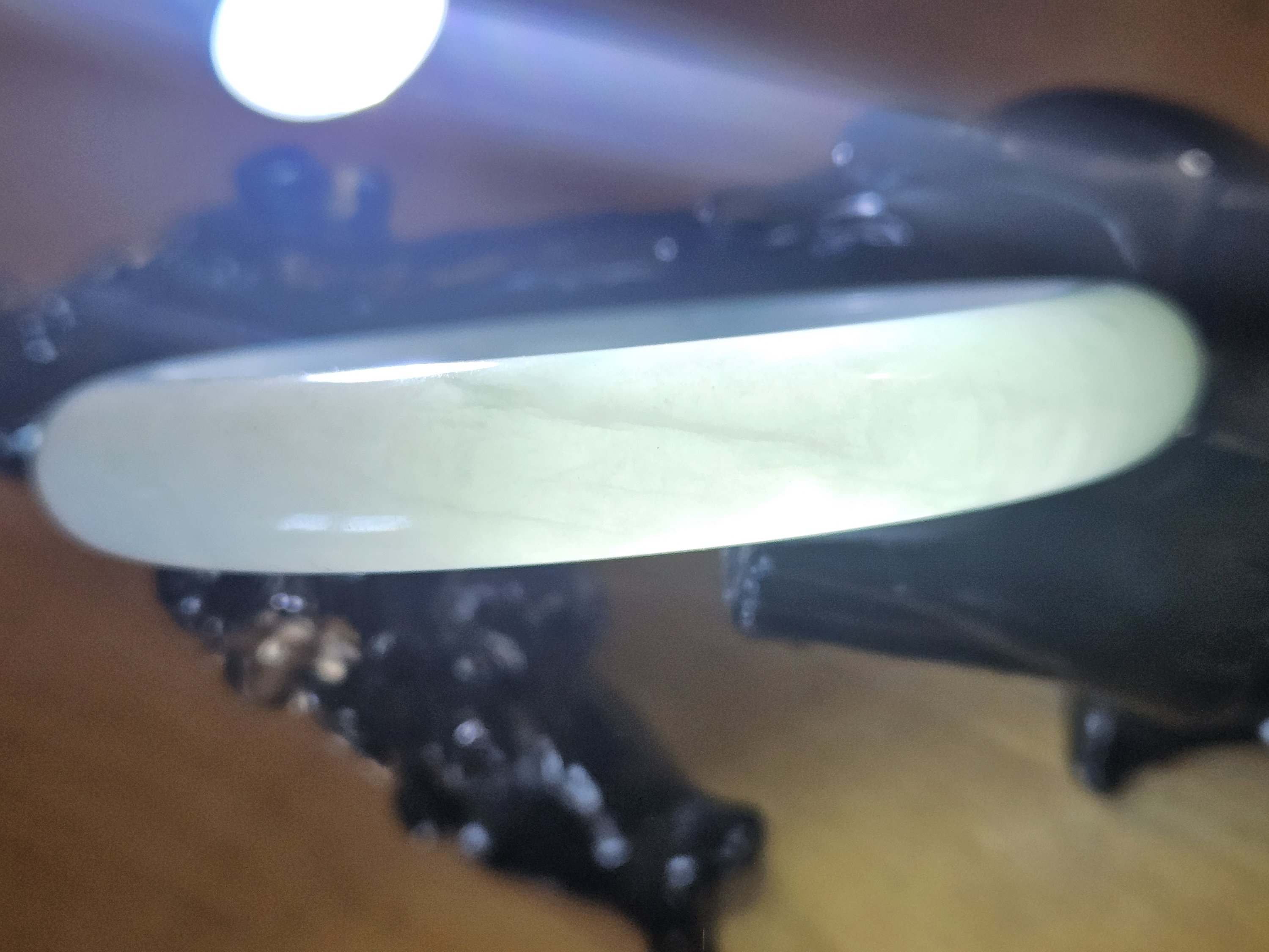 A very sought-after colour if you like opaque and light green with apple green blooms. This kind of colour and quality are usually 4 figures, but as this has multiple internal cracks, it is only £218.