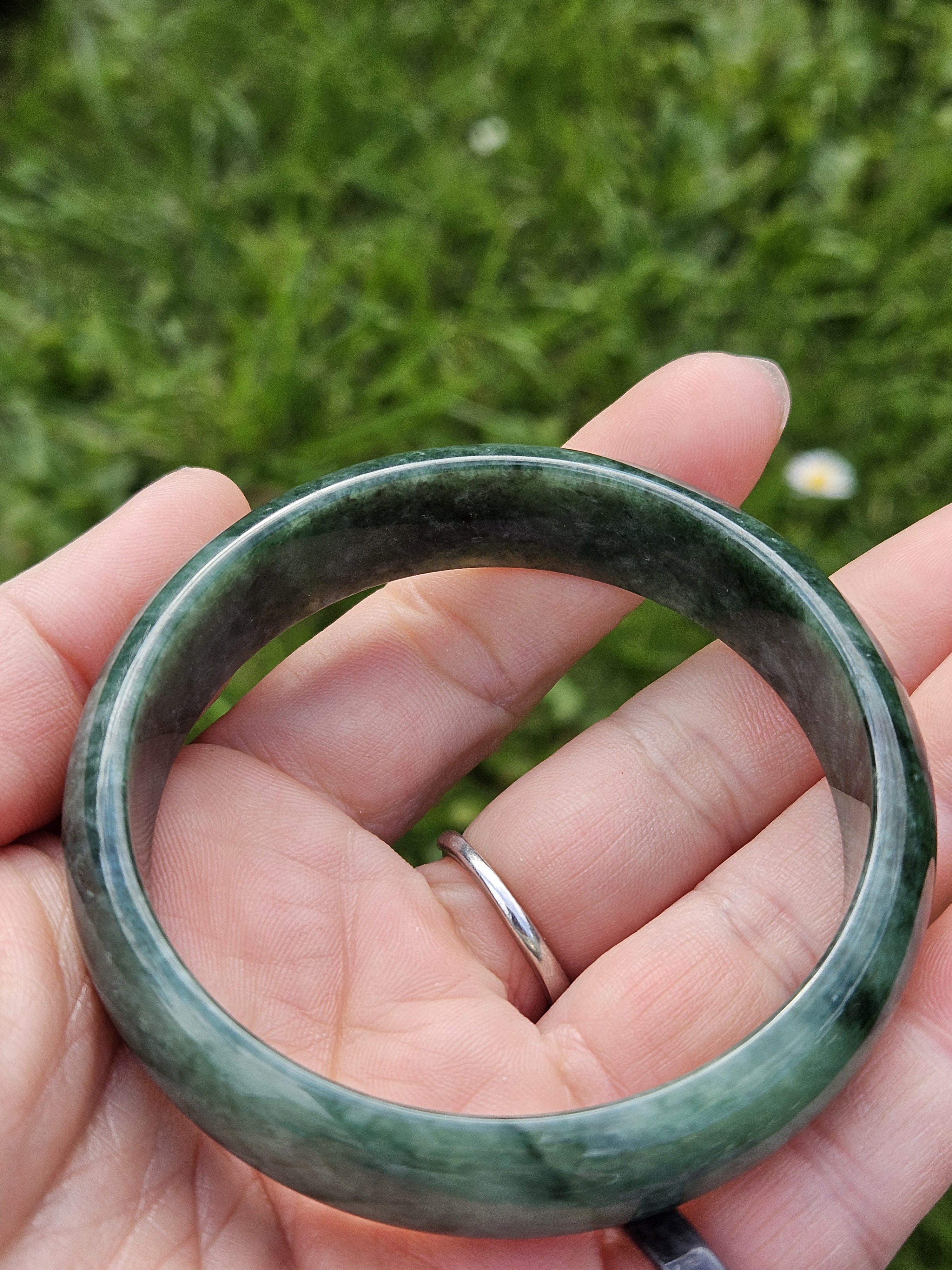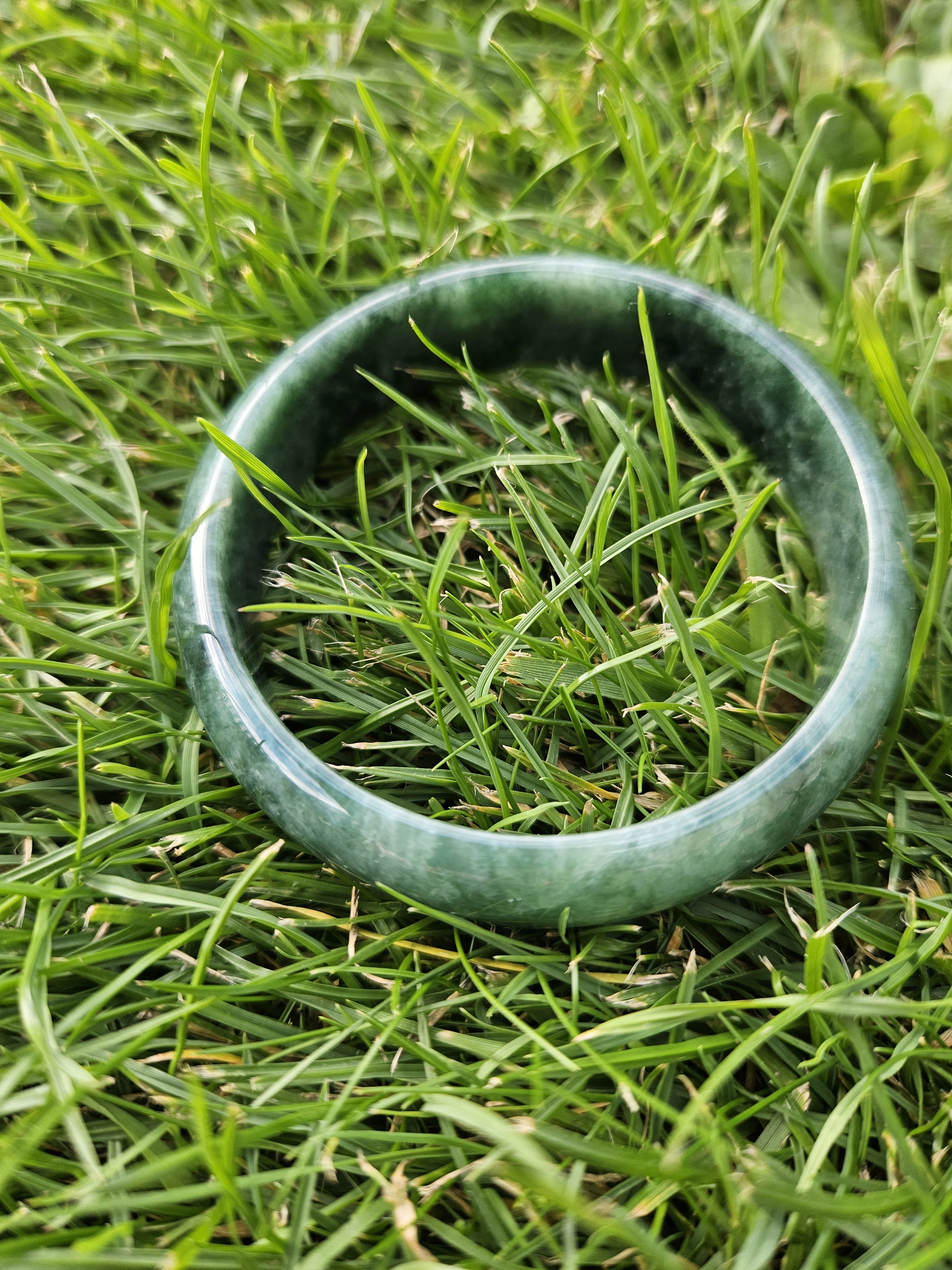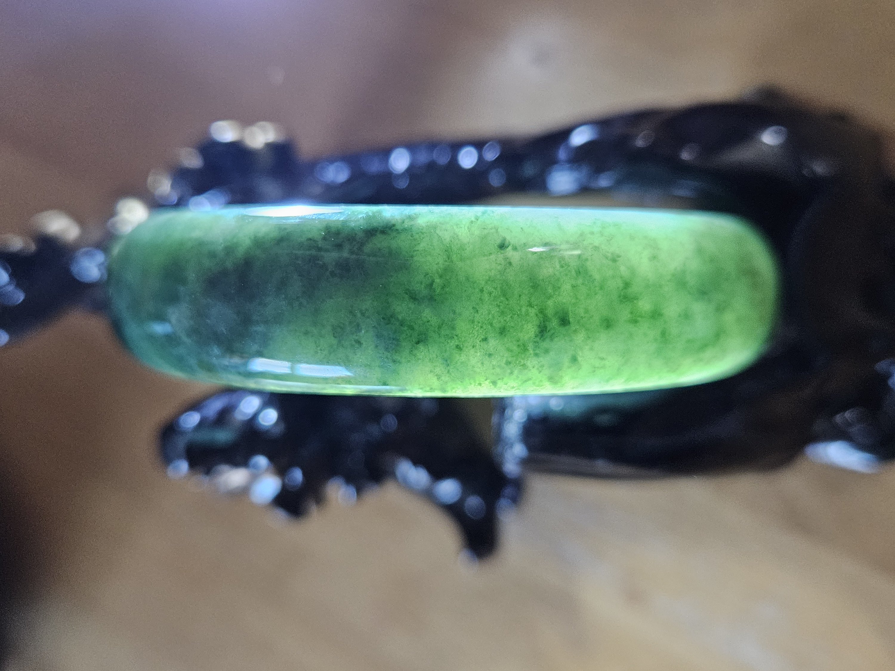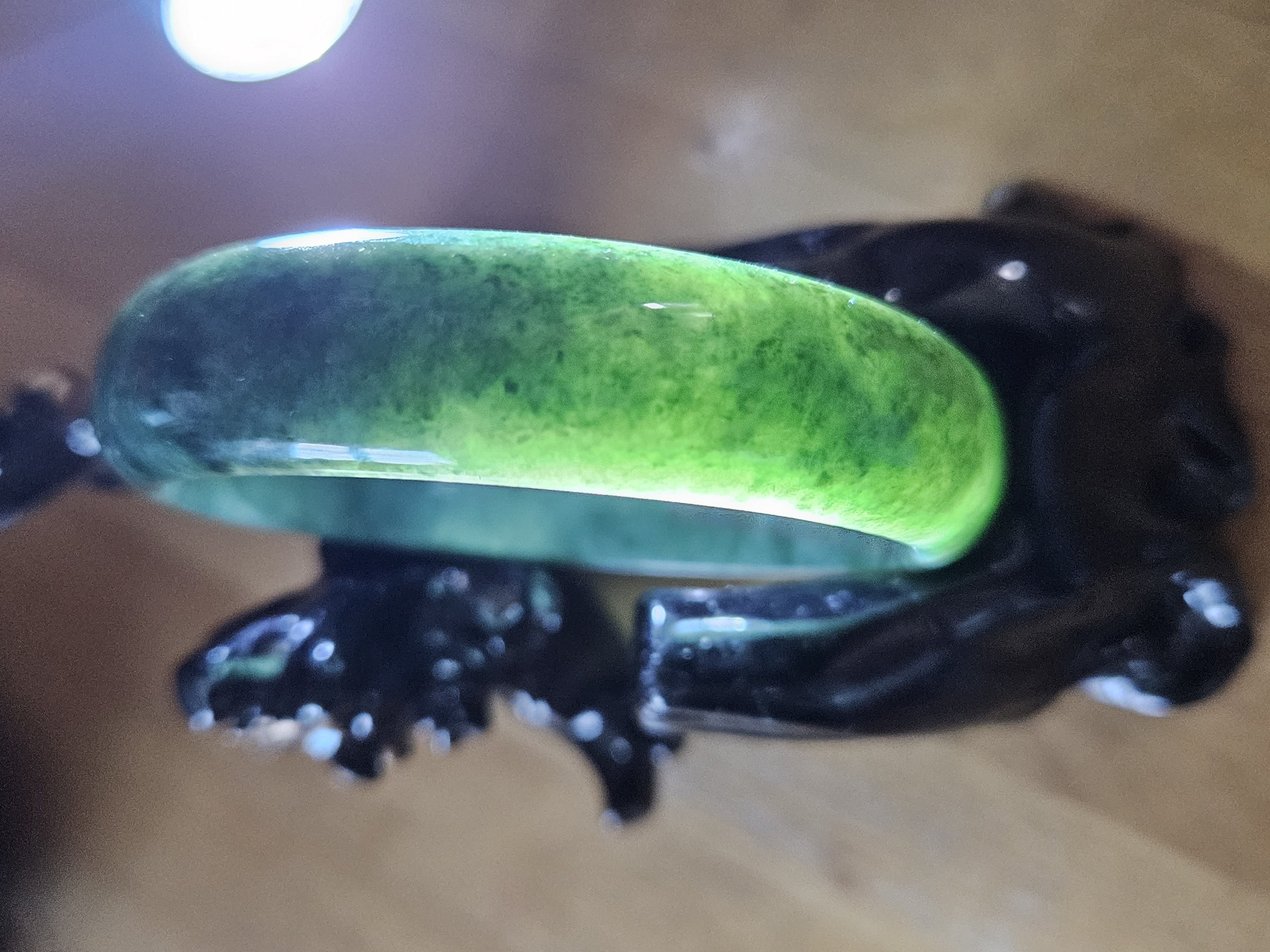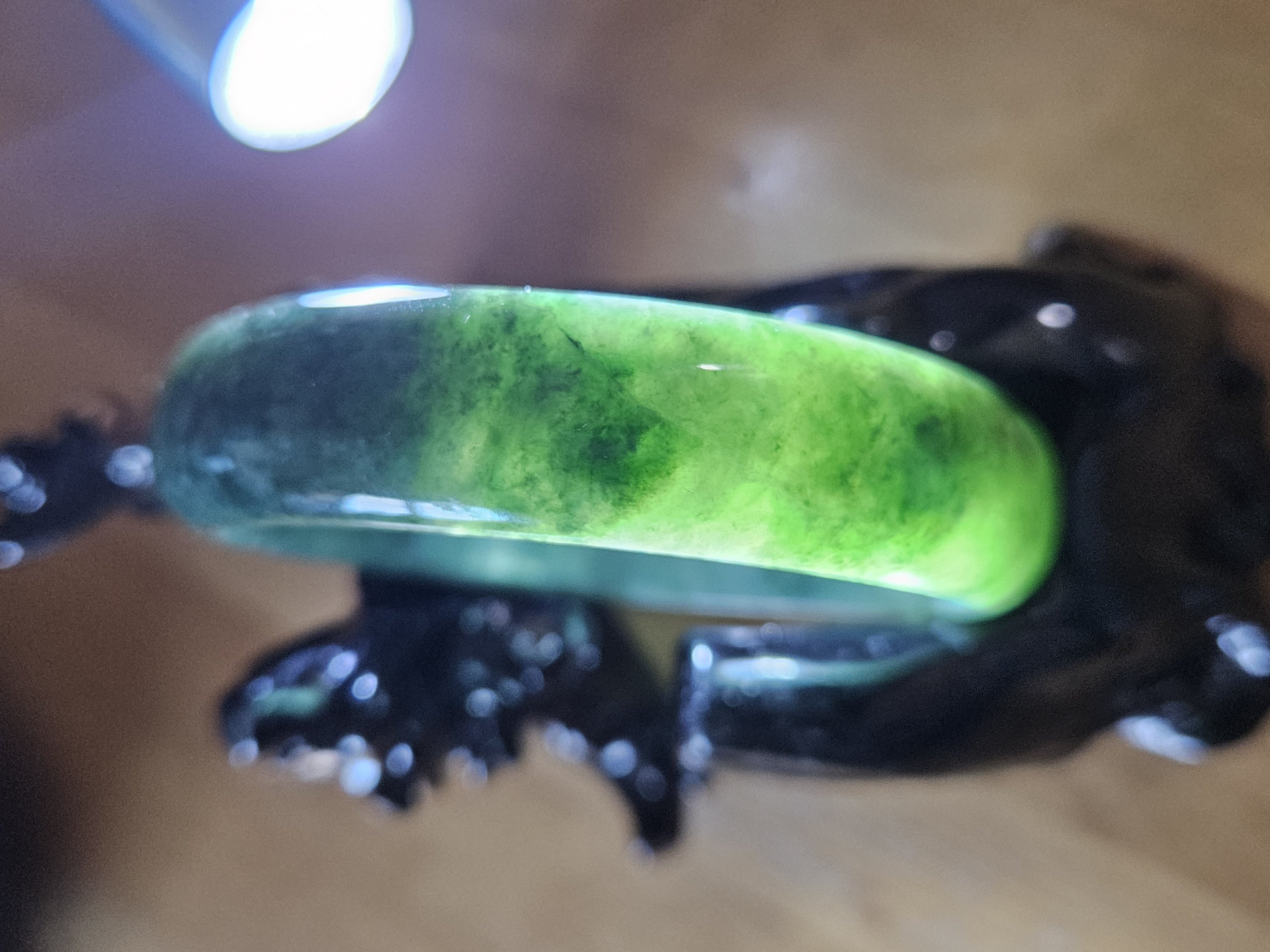 As far as I can see, there is no internal or external crack, the colour is gorgeous and vibrant under close examination. This lovely full green Burmeae jadeite bangle measures 55.8 x 14.4 x 5.8mm, weighs 45.04g, comes with a certificate of authenticity £218