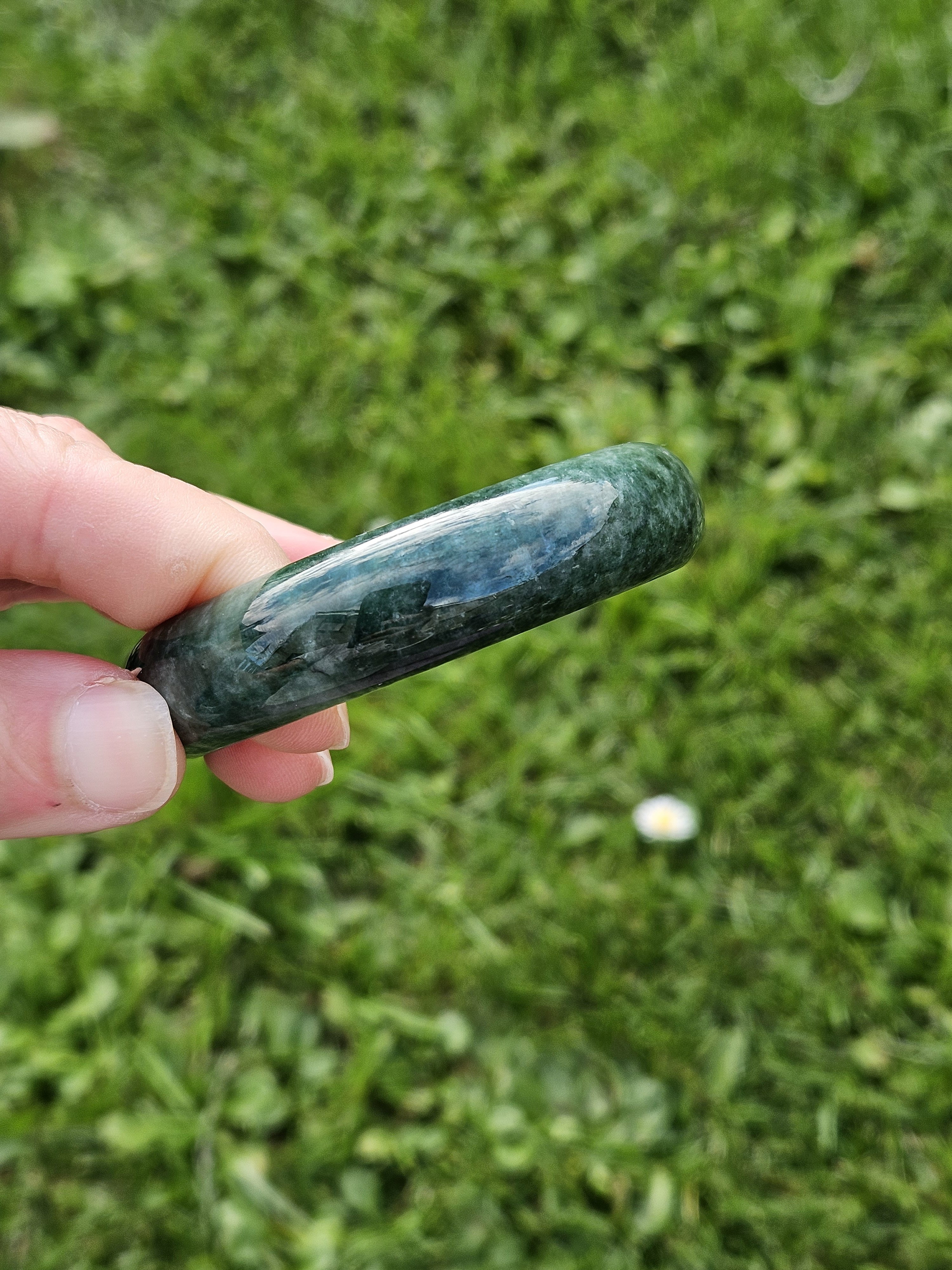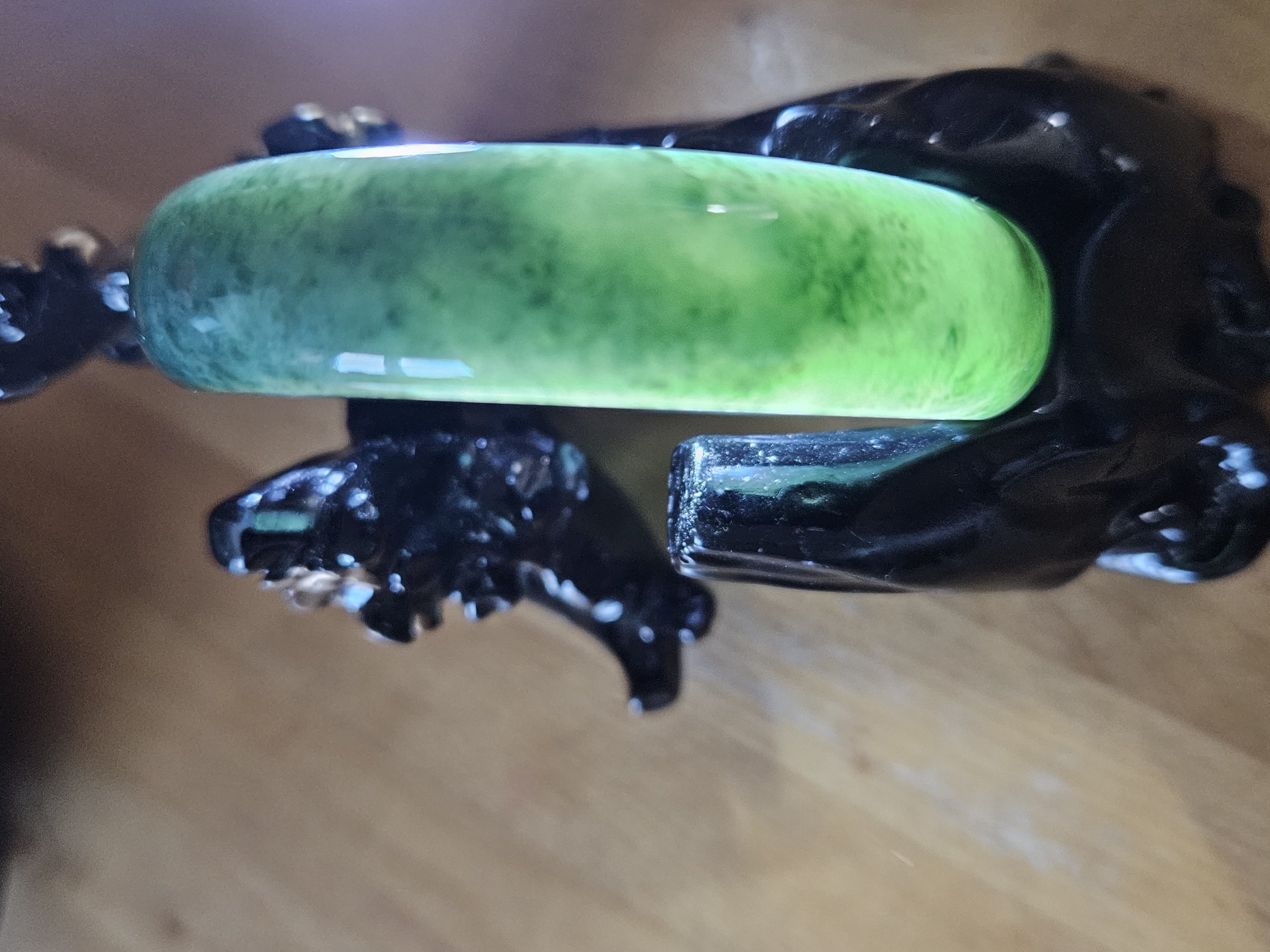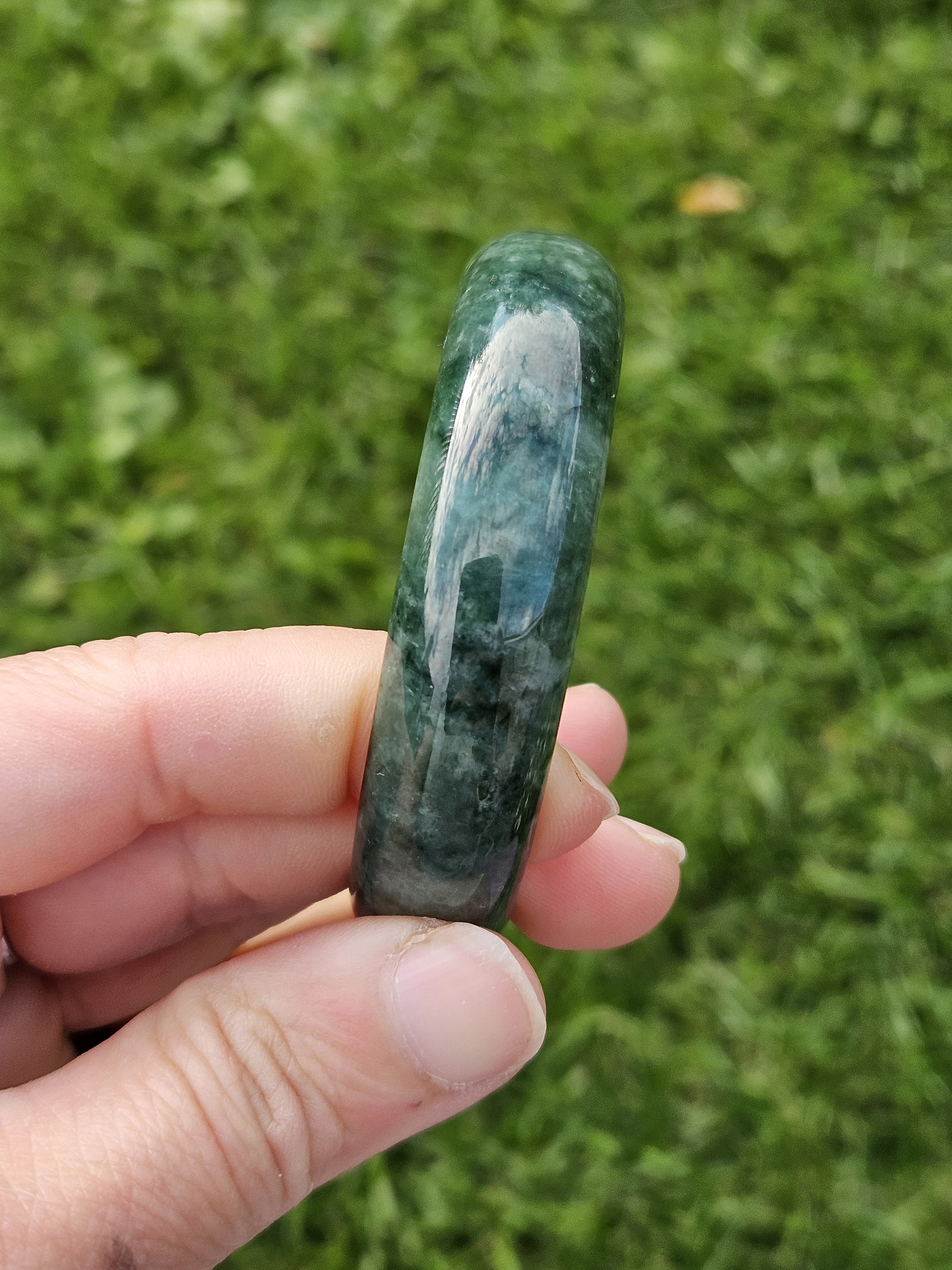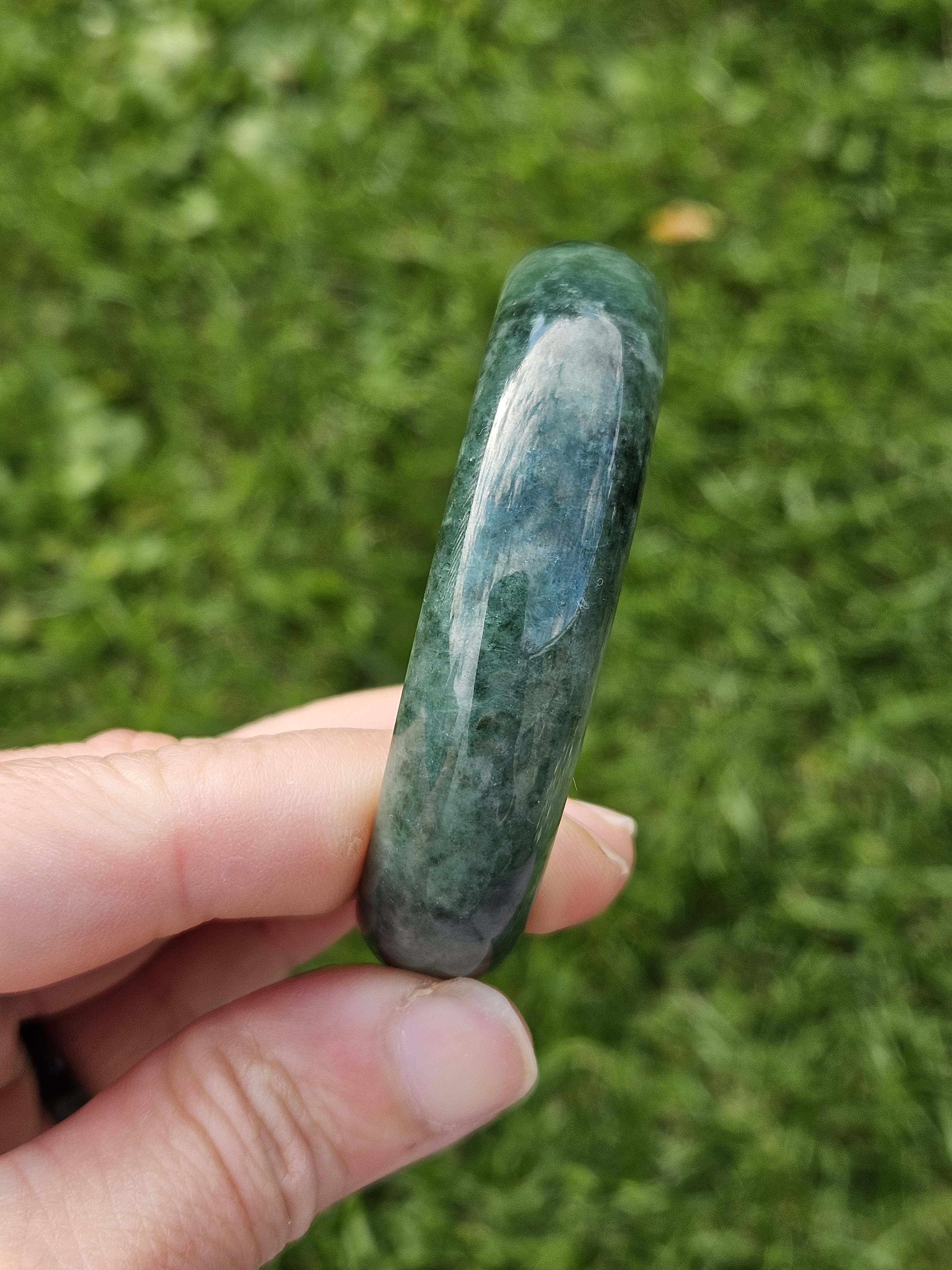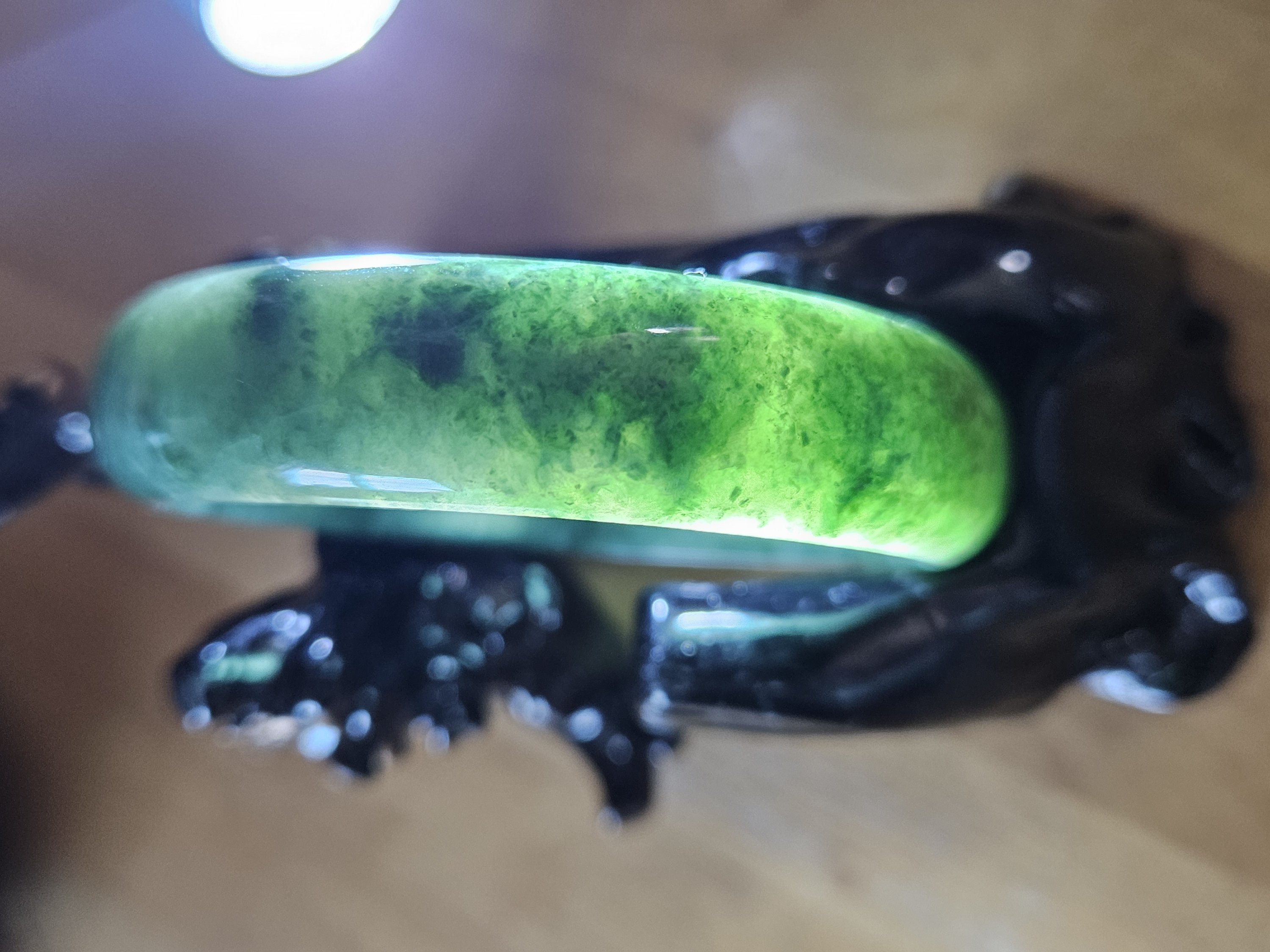 As far as I can see, there is no internal or external crack, the colour is gorgeous and vibrant under close examination. This lovely full green Burmeae jadeite bangle measures 55.8 x 14.4 x 5.8mm, weighs 45.04g, comes with a certificate of authenticity £218
